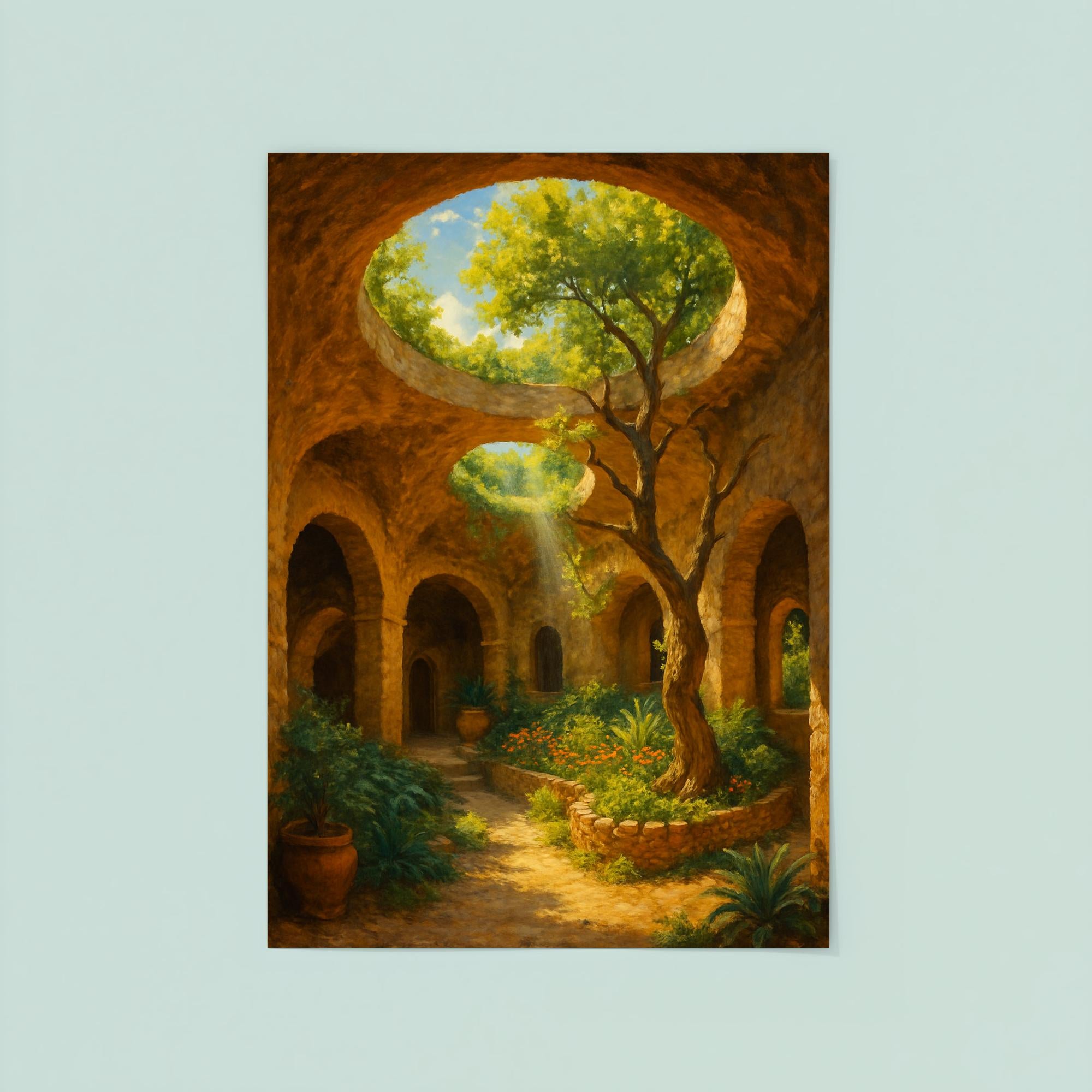 Discover the enchanting allure of the Forestiere Underground Gardens with this captivating poster, showcasing the unique underground oasis nestled in California. Perfect for dreamers and nature lovers alike, this striking image invites you to explore an extraordinary garden carved by hand, where artistry and nature intertwine beneath the earth. Bring home a piece of this hidden wonder and let its timeless charm inspire your walls.