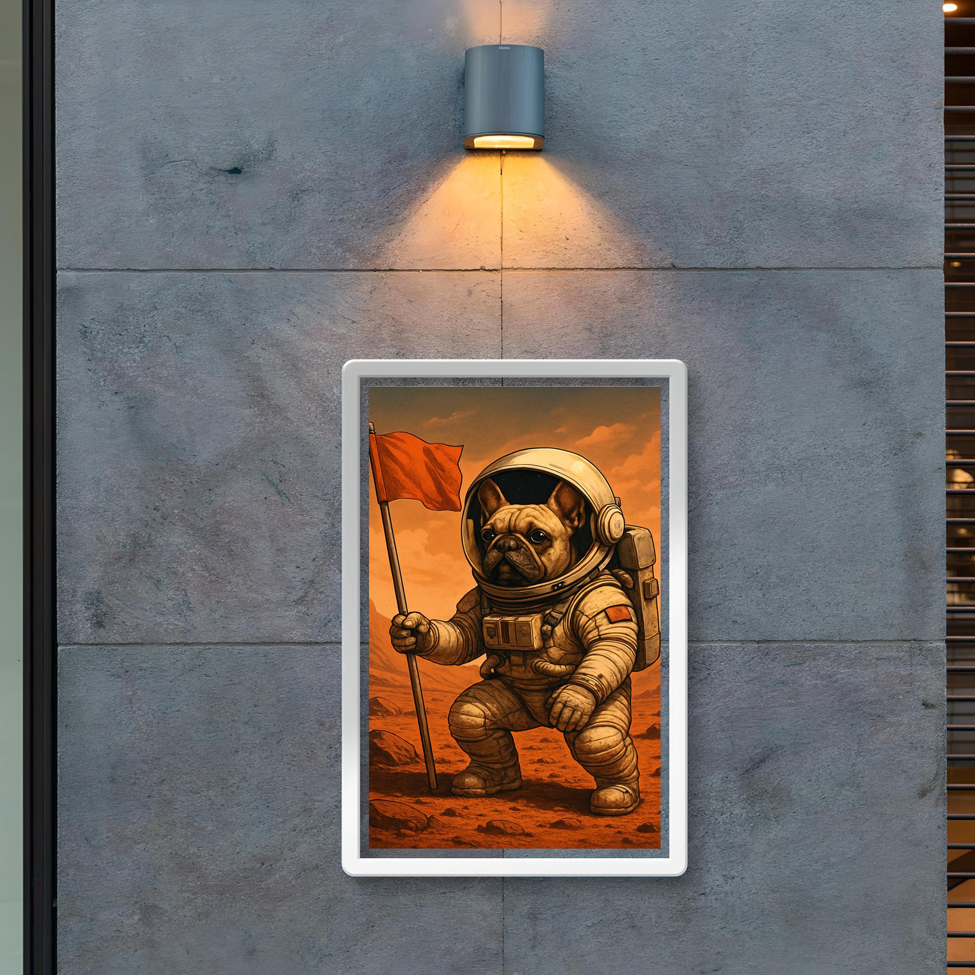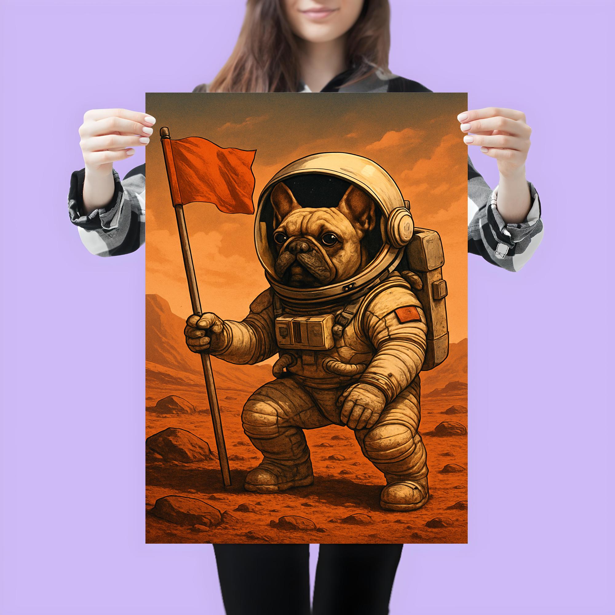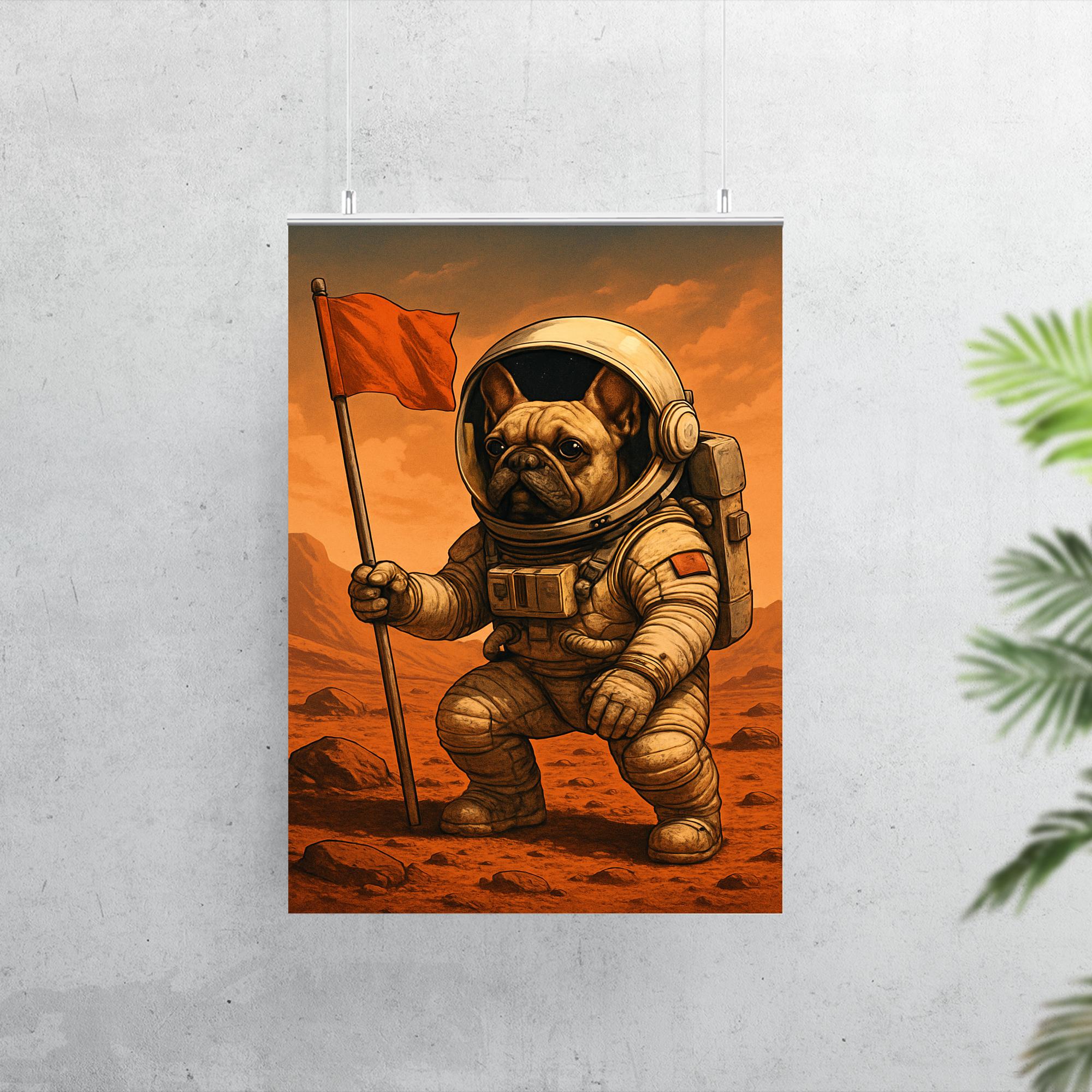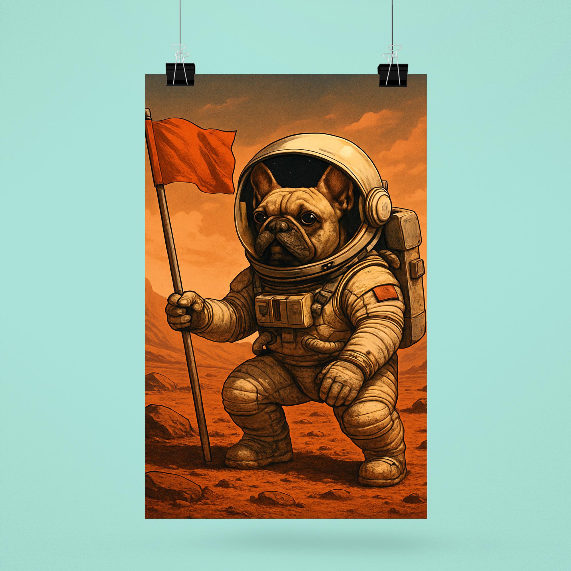 Blast off into whimsy with this striking poster of a French Bulldog astronaut planting a flag on Mars. Perfect for dreamers and dog lovers alike, it captures the adventurous spirit with playful charm and cosmic flair. Let this unique piece ignite your imagination and bring a stellar touch to any space.