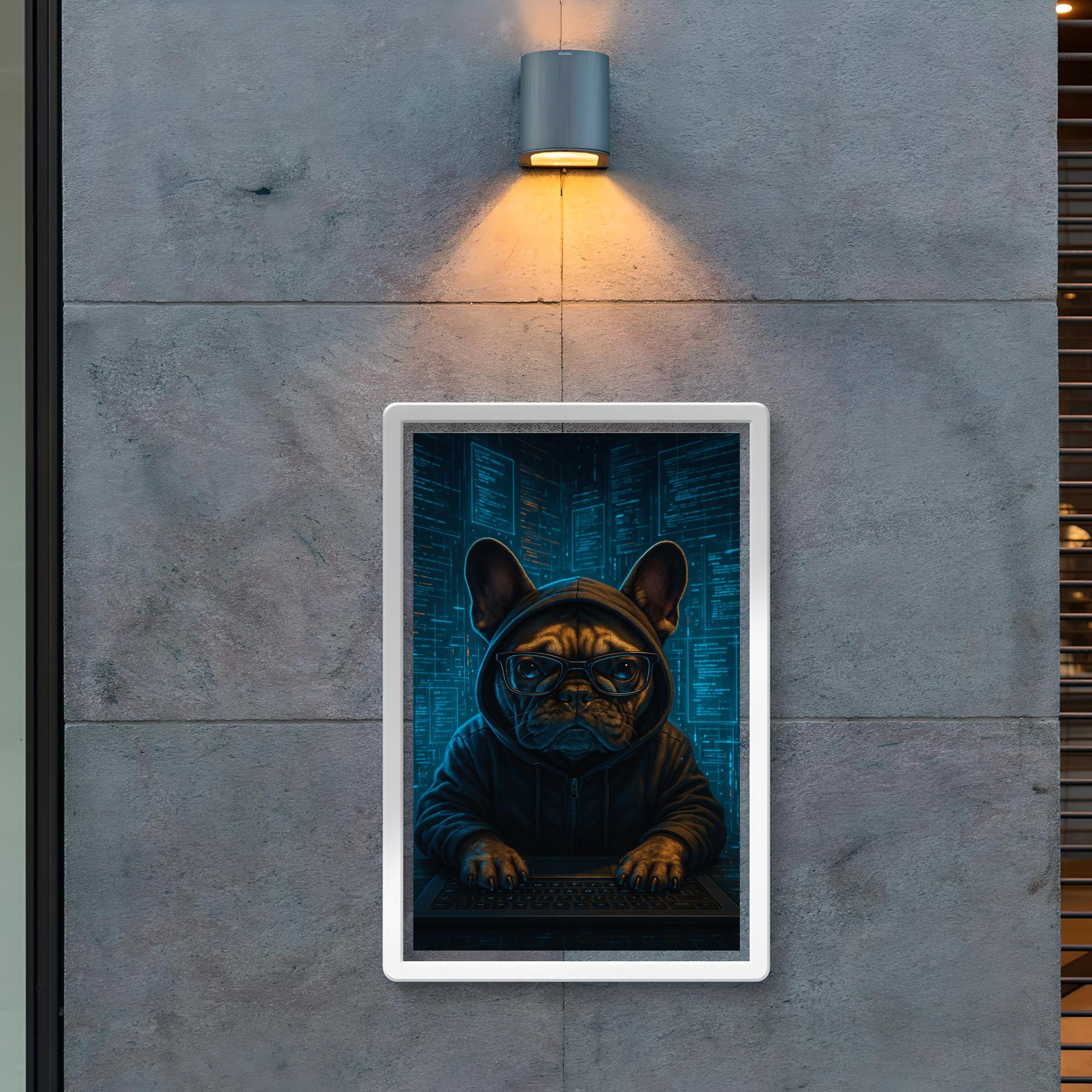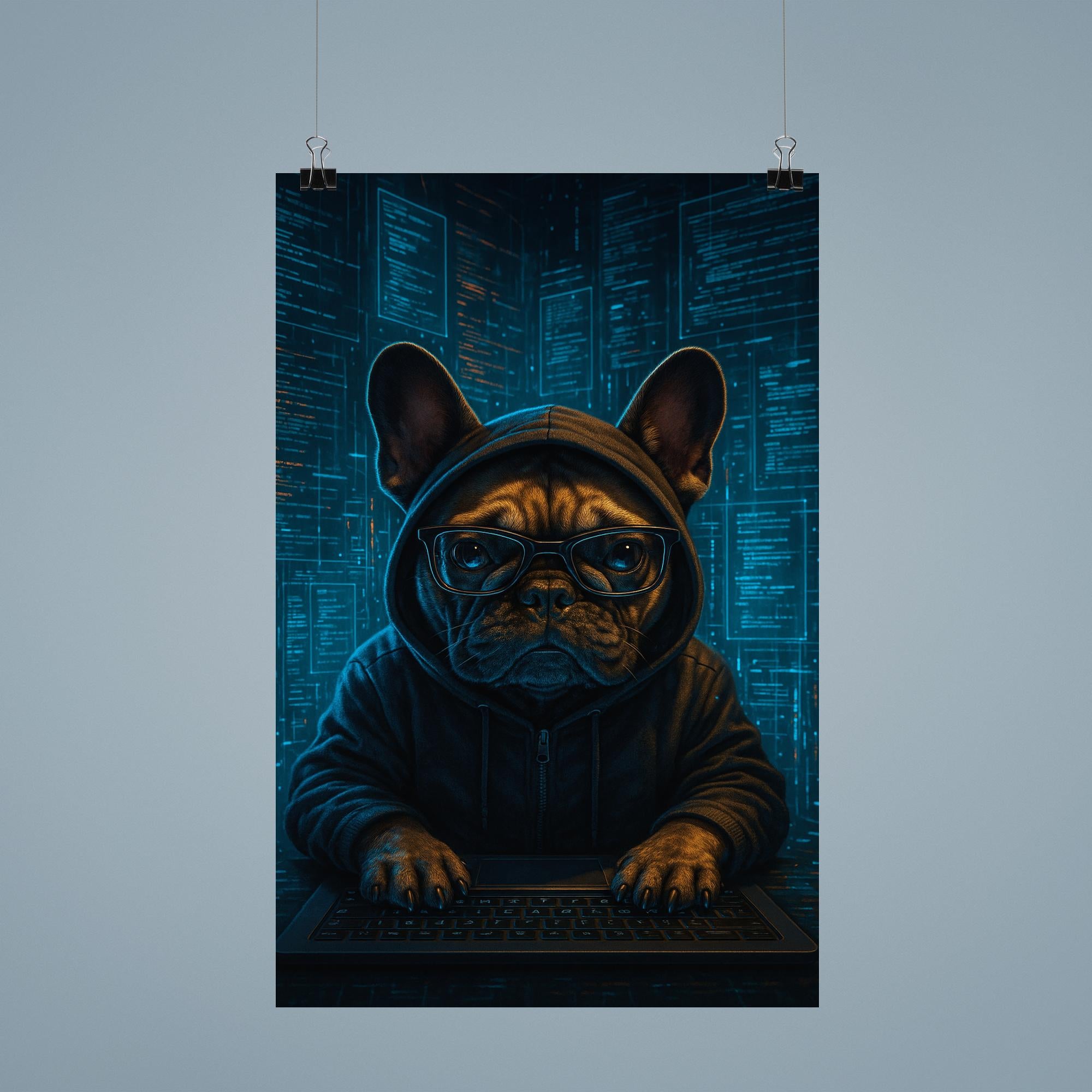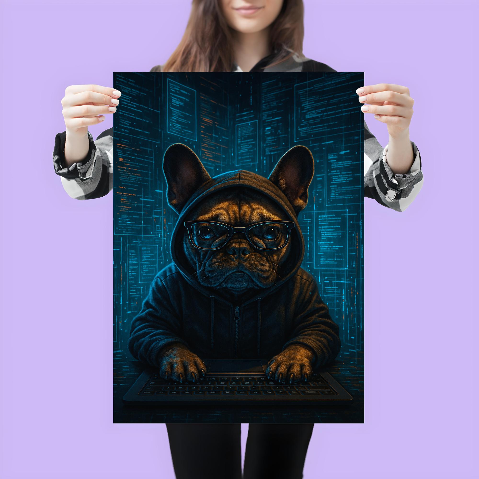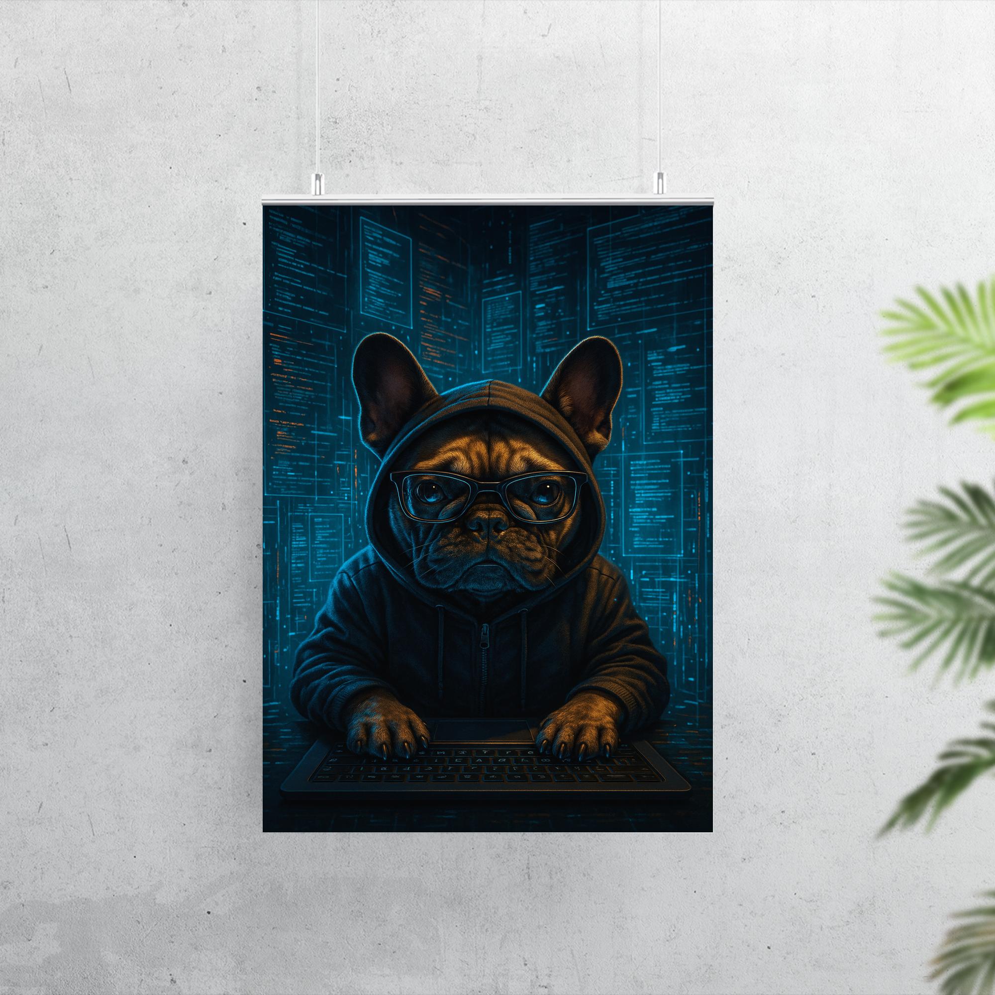 Unleash your inner tech rebel with this striking poster featuring a French bulldog hacker immersed in glowing streams of holographic code. Perfect for adding a bold, futuristic edge to any space, this artwork blends clever charm with cutting-edge digital vibes. Elevate your walls with a playful yet powerful nod to the world of cyber intrigue.