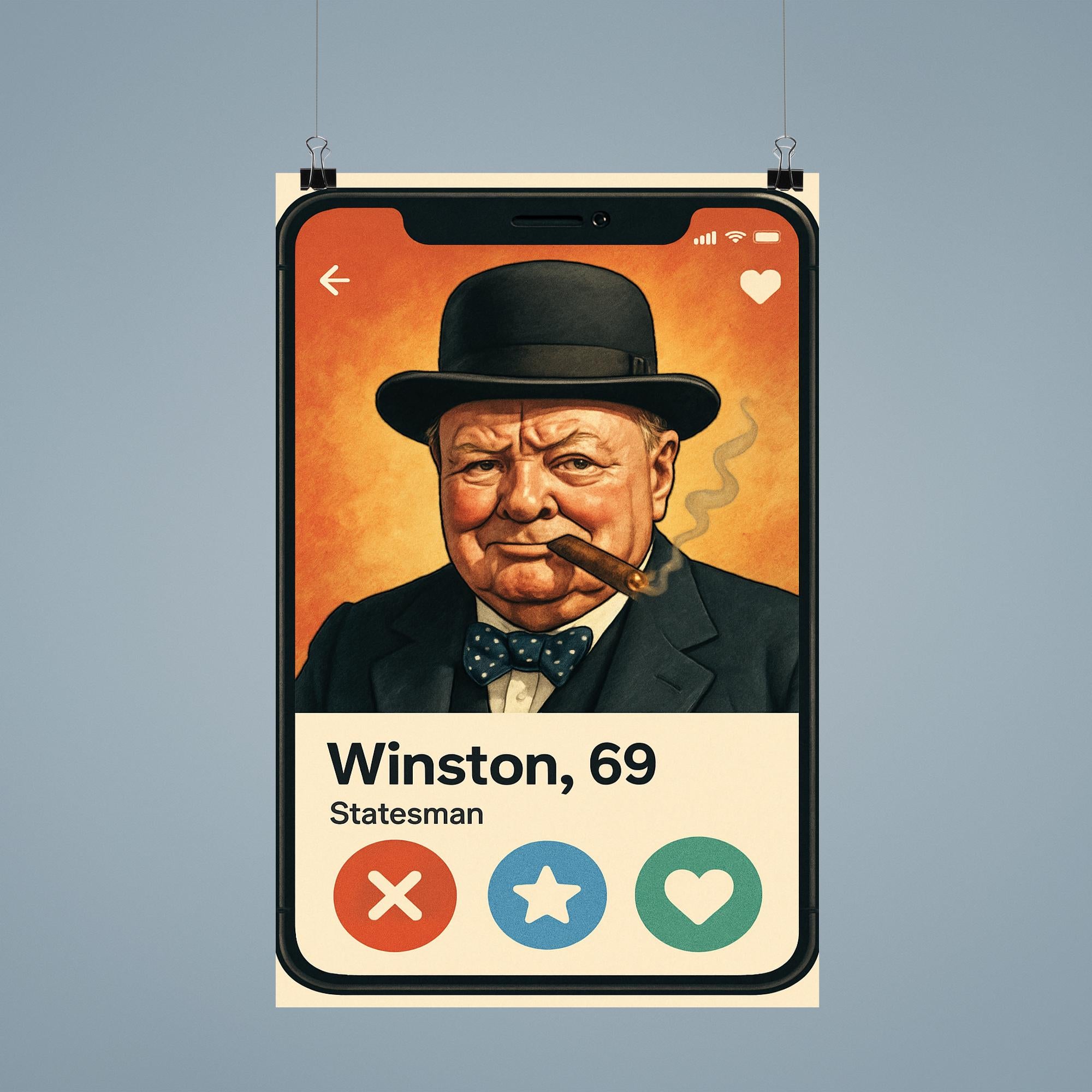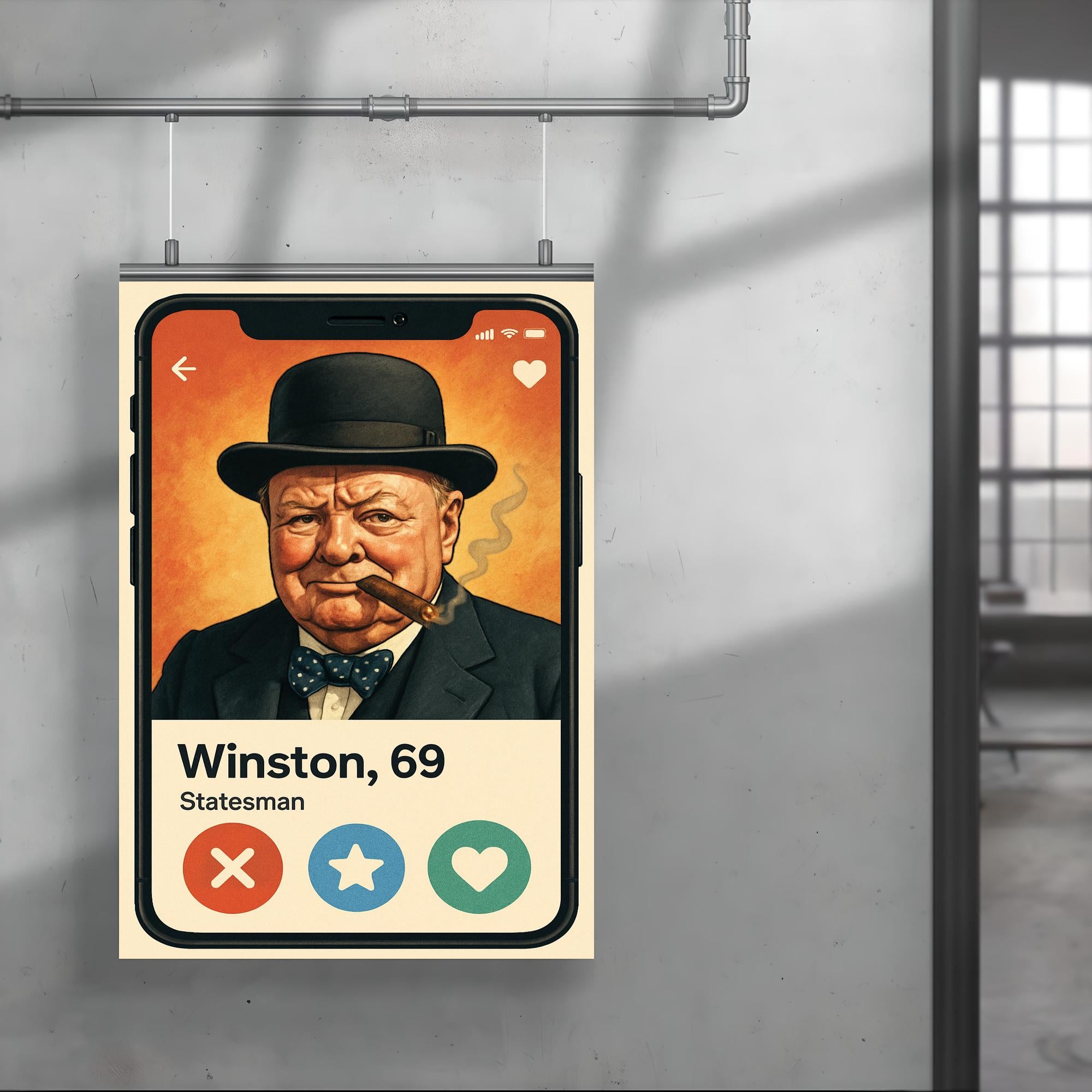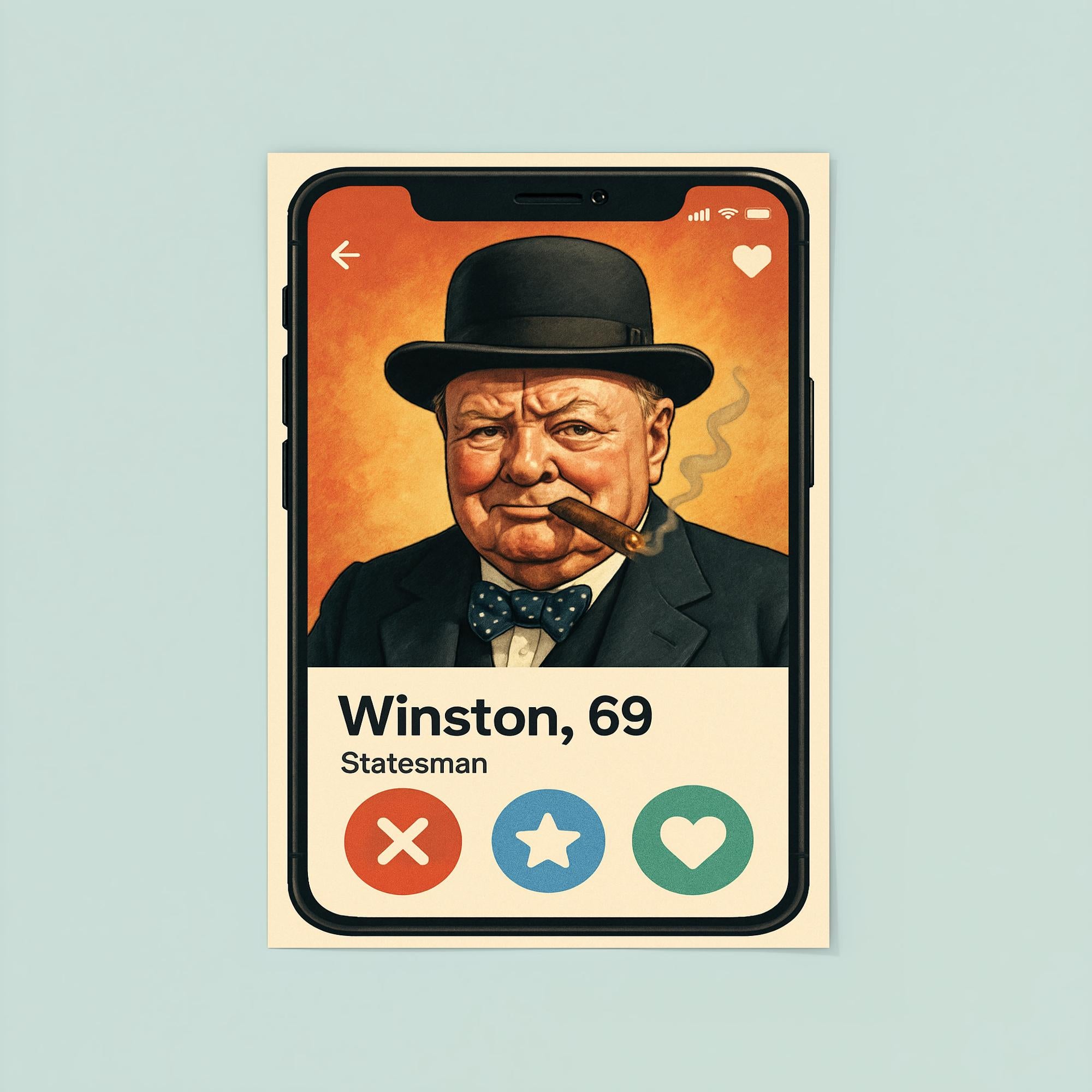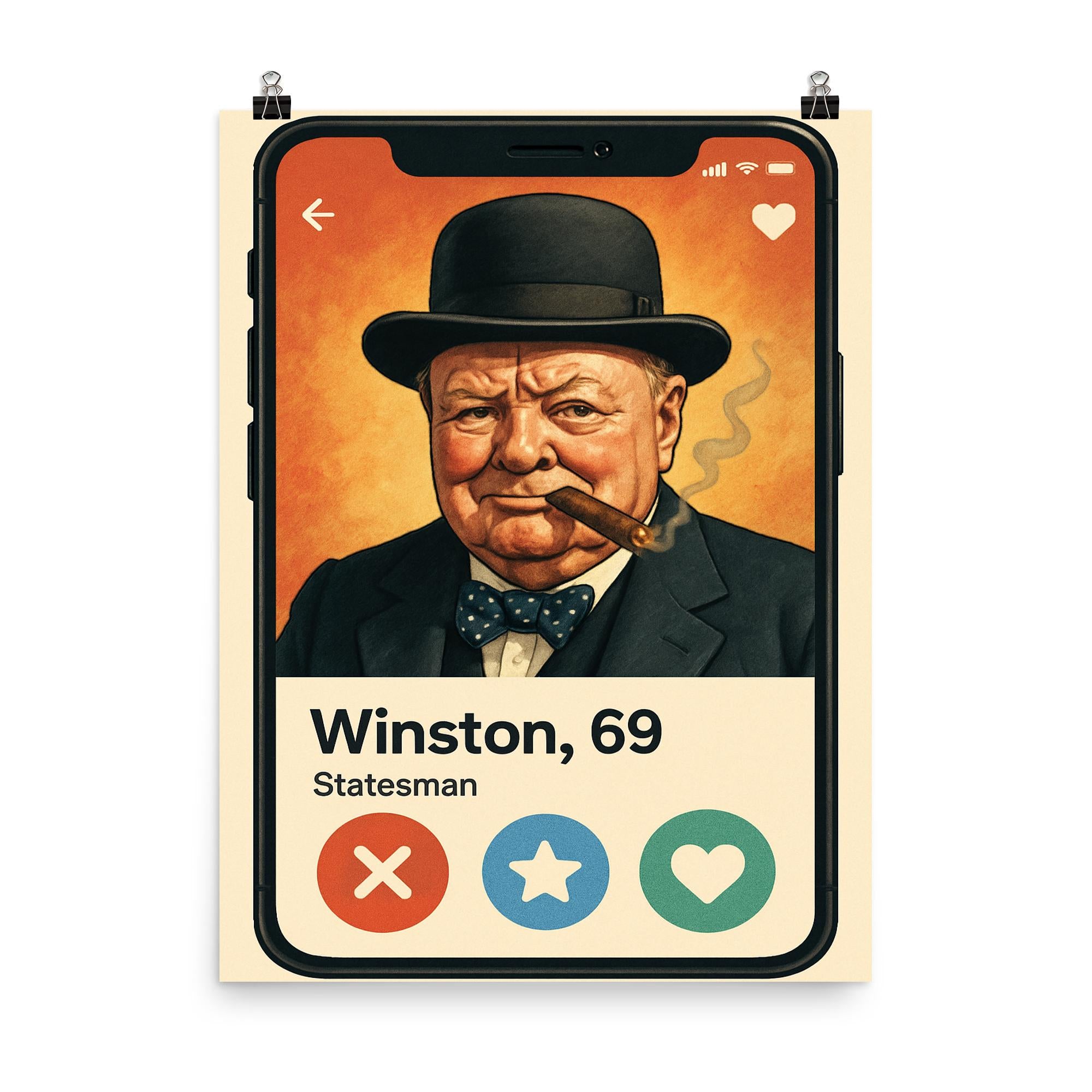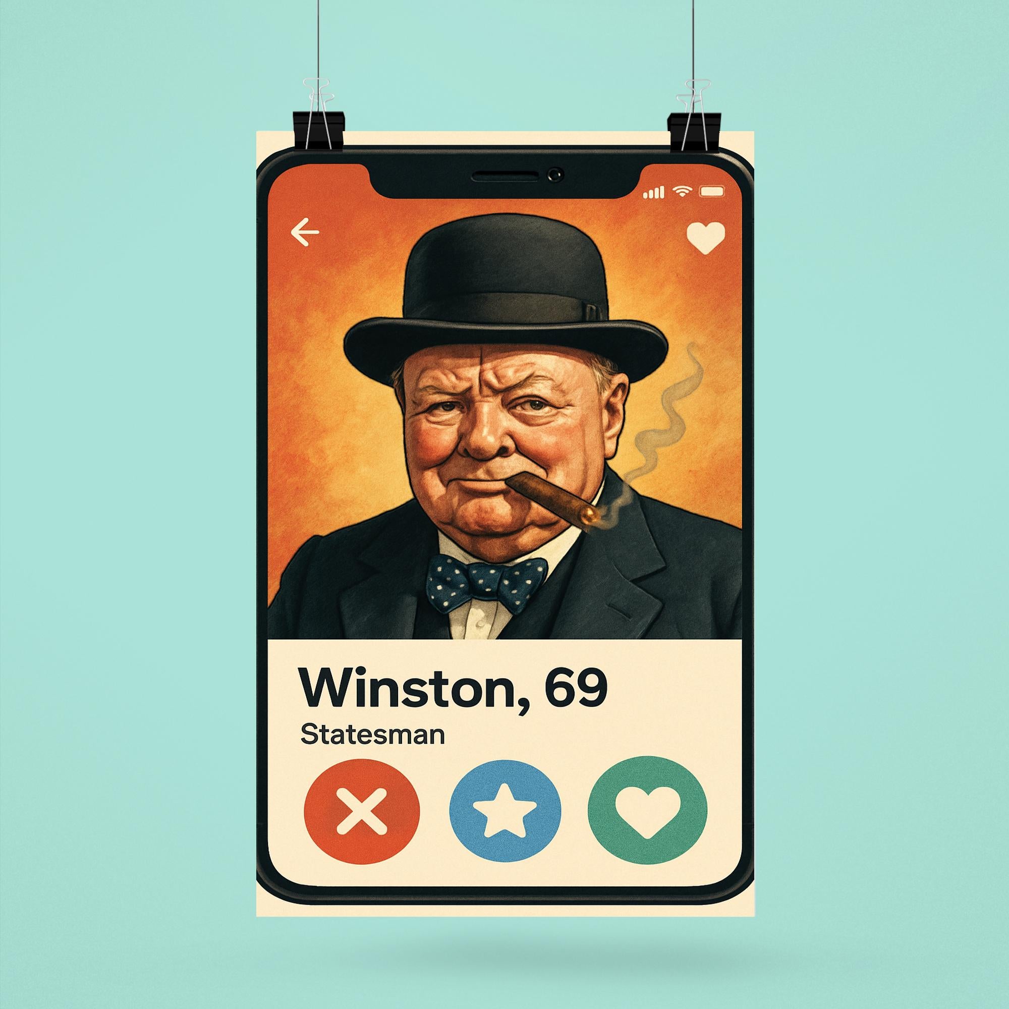 Step into history with a twist of humor! This poster featuring Winston Churchill’s hilarious dating app profile brings the legendary leader’s wit into the modern world, blending iconic charm with clever fun. Perfect for lovers of history and laughter alike, it’s a conversation starter that brightens any room.