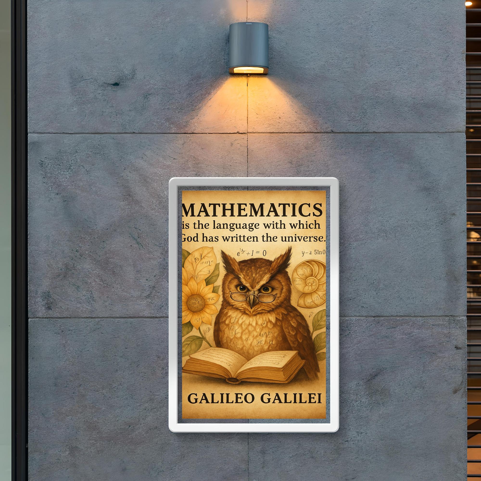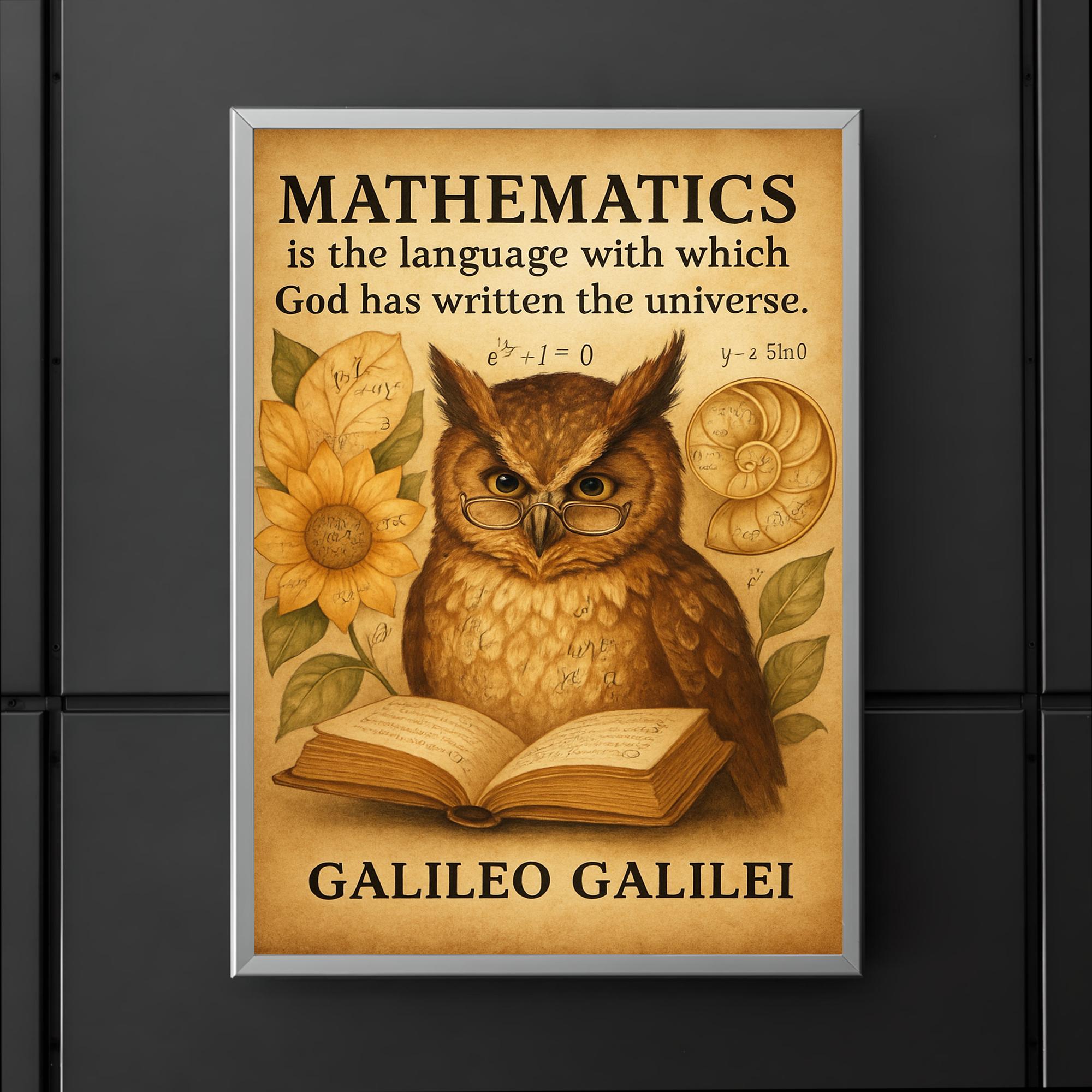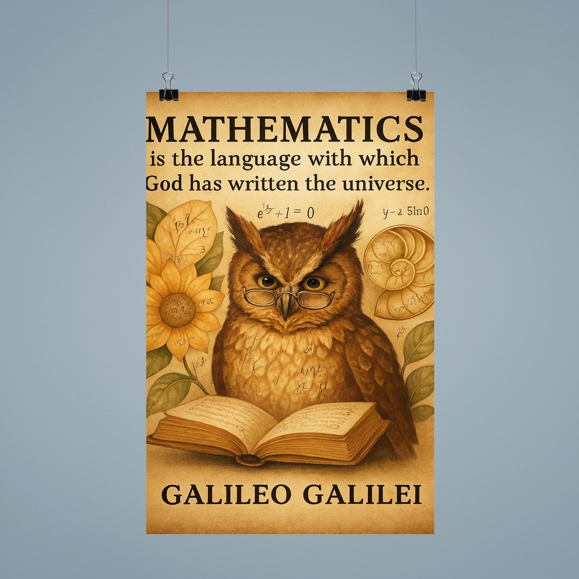 Unlock the wisdom of the cosmos with this inspiring poster featuring Galileo’s timeless quote about mathematics as the language of the universe. Perfect for thinkers and dreamers alike, it pairs profound insight with the charm of a wise owl immersed in reading—reminding us all that knowledge is the key to understanding the world around us. Elevate your space with a daily dose of curiosity and inspiration.