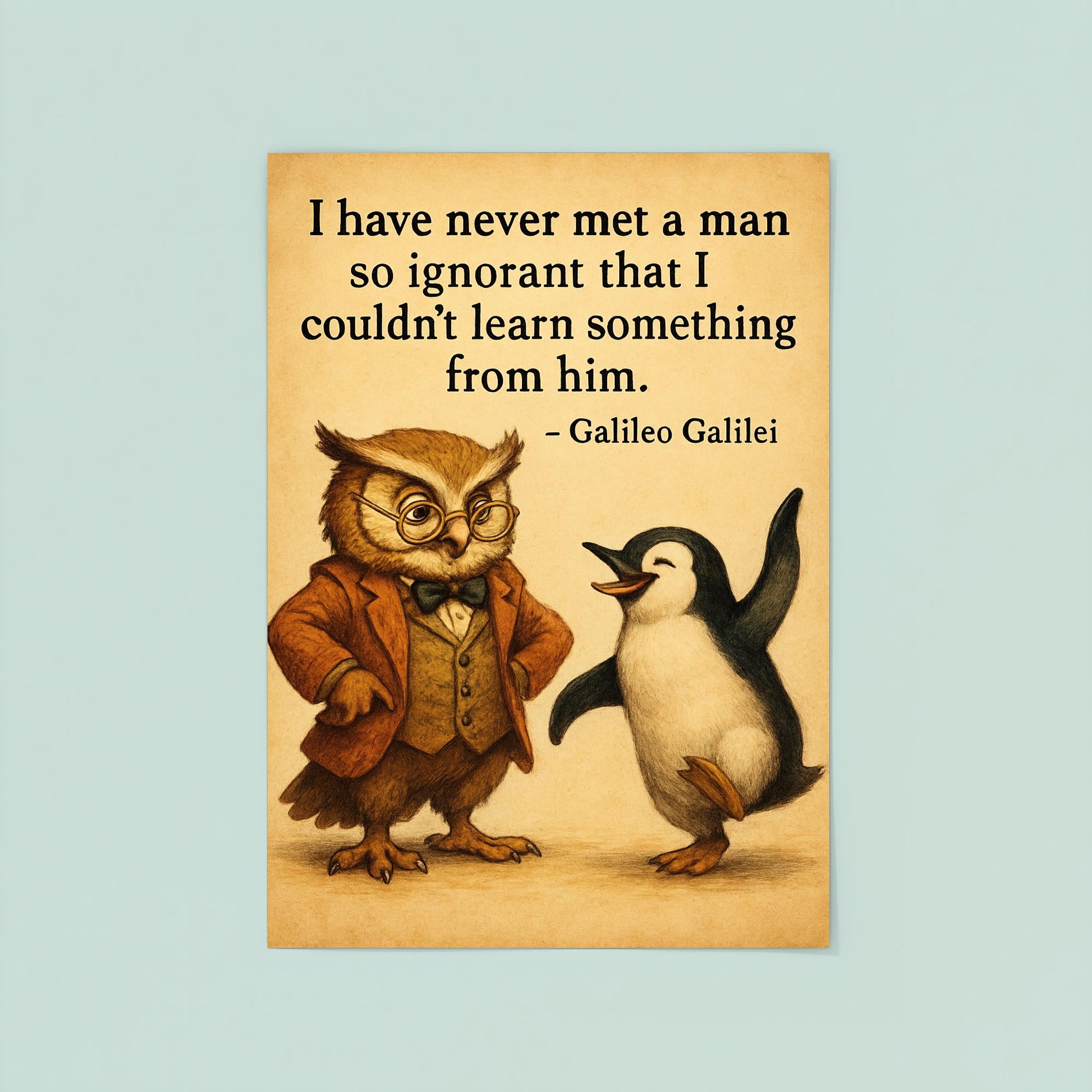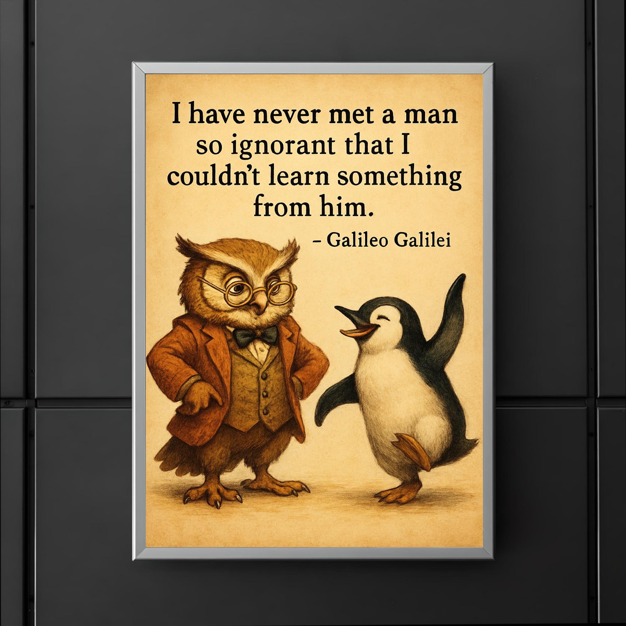Inspire endless curiosity with this powerful Galileo quote: "Never met a man so ignorant I couldn’t learn something from him." Perfect for thinkers, learners, and seekers of wisdom, this poster serves as a daily reminder to embrace knowledge from every encounter and challenge assumptions with open-mindedness. Elevate your space with a message that celebrates the value of learning and humility.