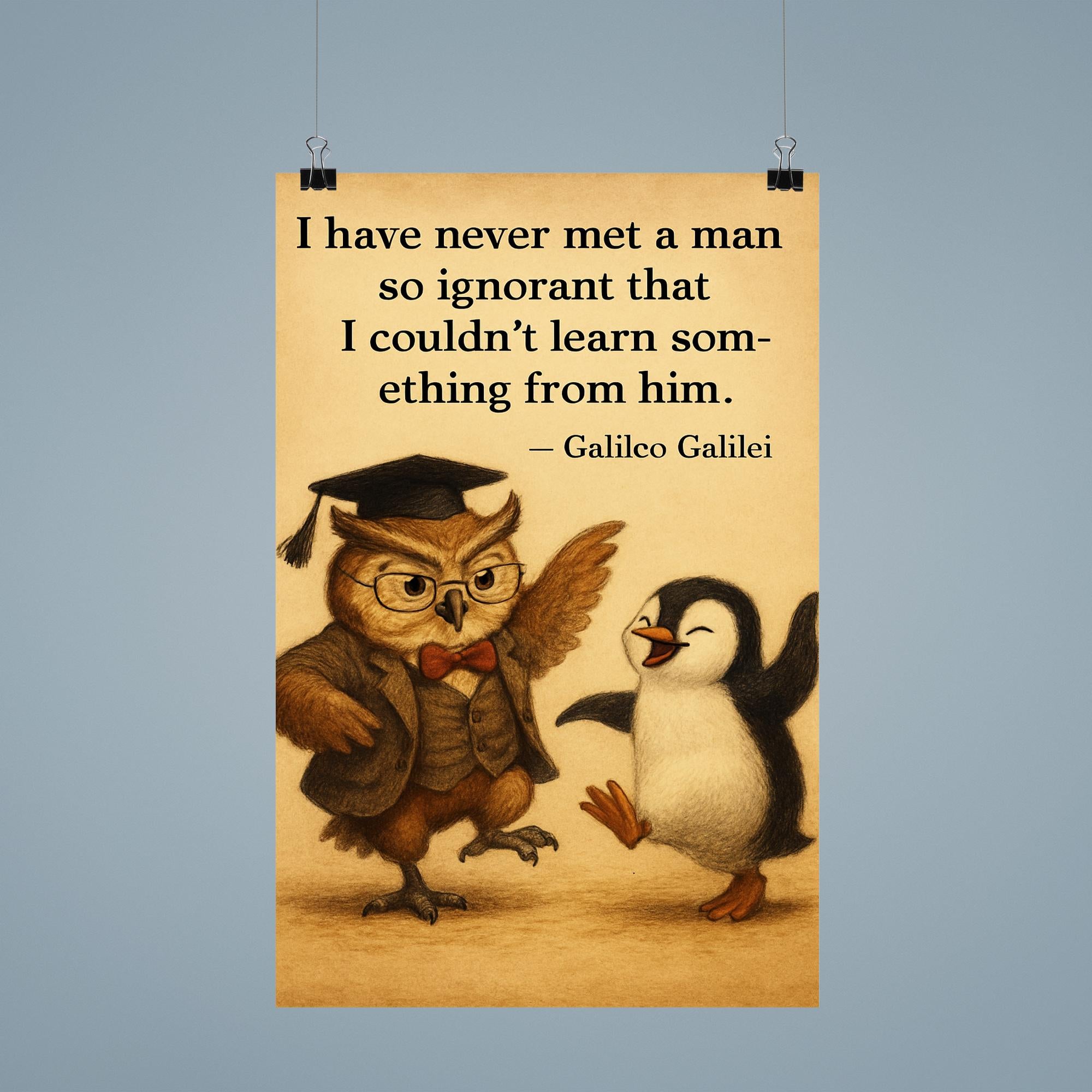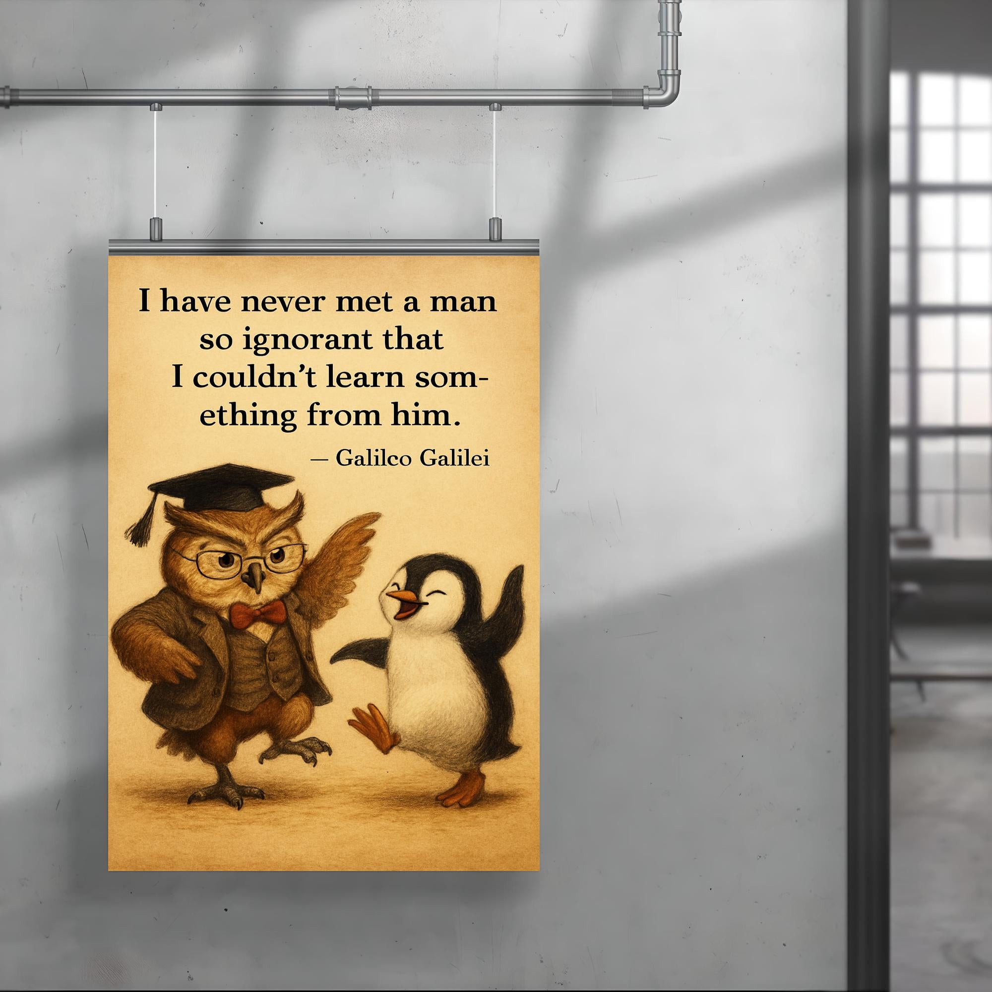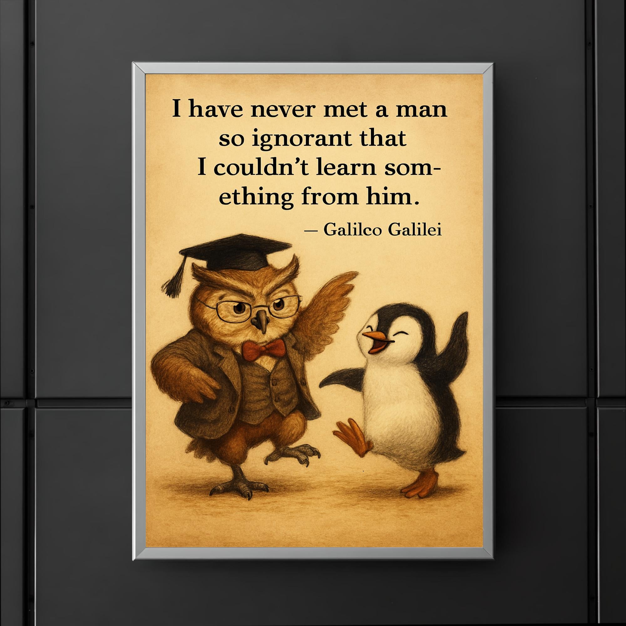 Inspire curiosity and humility with this striking poster featuring Galileo’s timeless wisdom: “Never have I met a man so ignorant that I couldn’t learn something from him.” Perfect for classrooms, offices, or study spaces, it serves as a powerful reminder that knowledge is everywhere, and every person holds a lesson worth discovering. Elevate your space with a message that champions open-mindedness and lifelong learning.