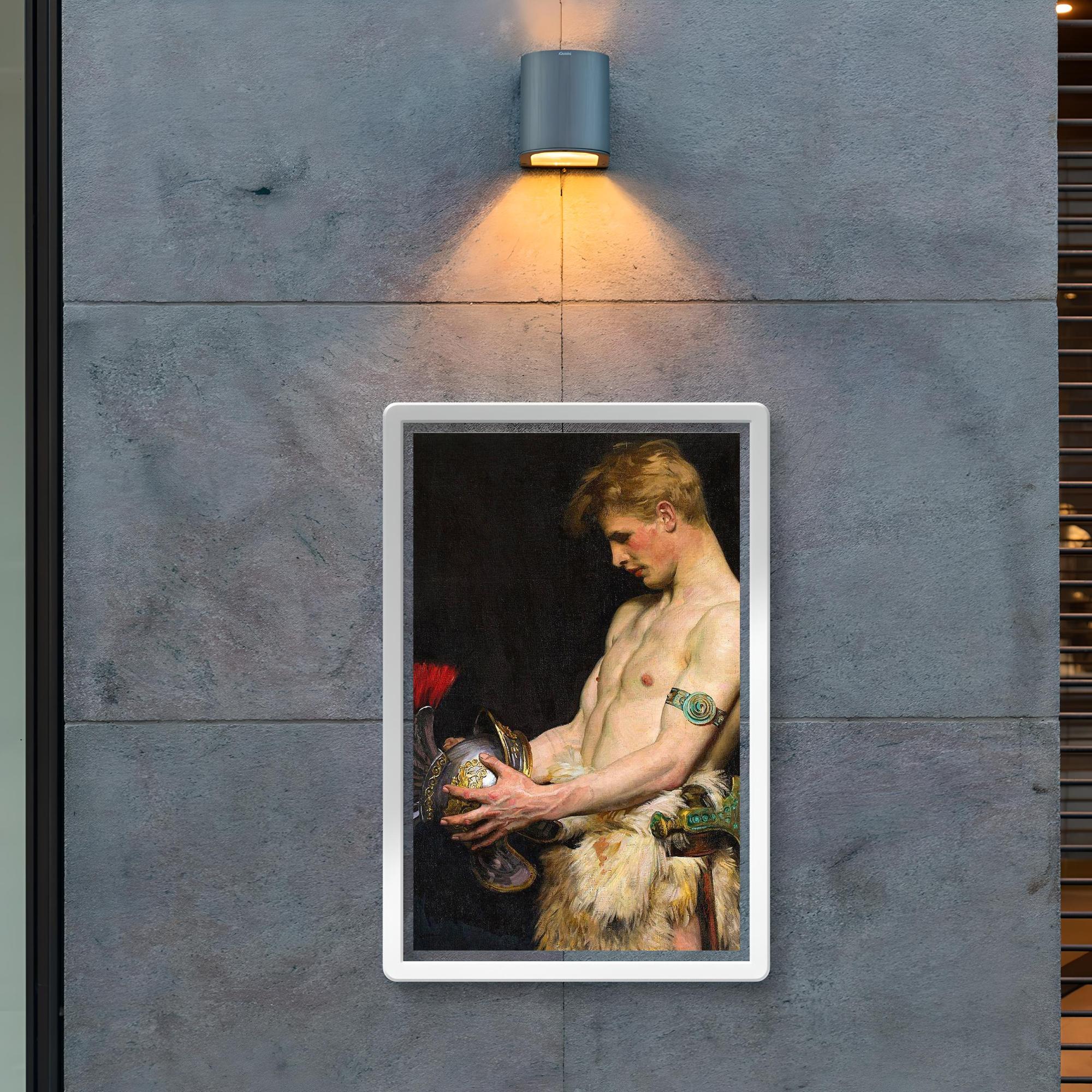 Step into a moment of history with this striking 1902 poster by Osmar Schindler, capturing a Germanic warrior’s contemplative gaze upon a Roman helmet. The artwork evokes a powerful sense of reflection and confrontation between two ancient worlds, inviting you to explore themes of strength, heritage, and identity. Perfect for history enthusiasts and art lovers alike, this poster transforms any space into a window to the past.