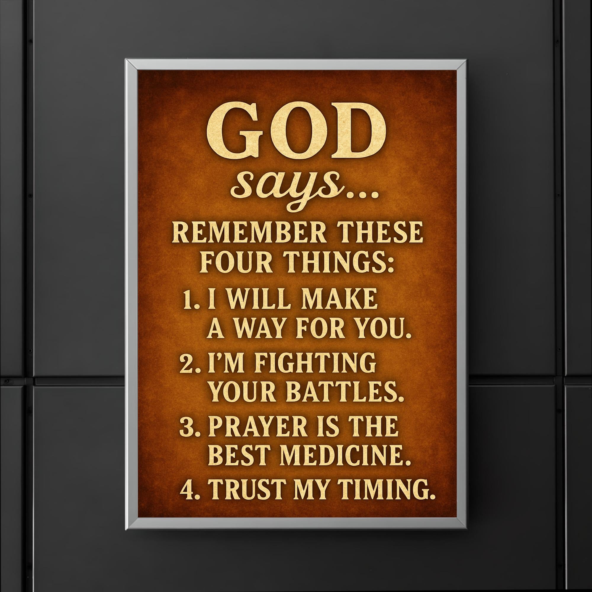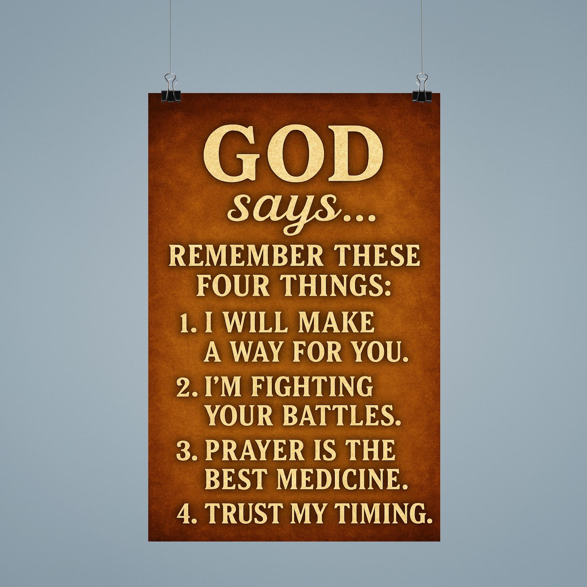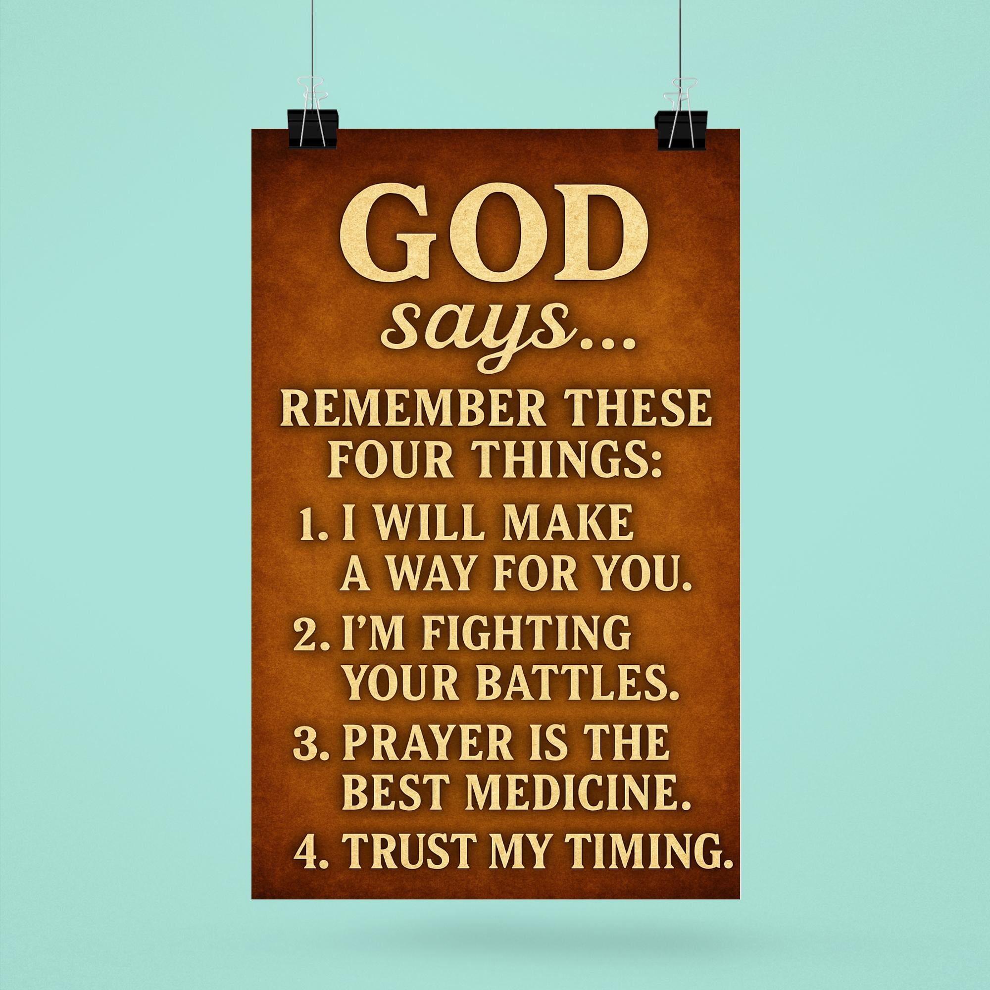 Let God’s timeless wisdom guide your every day with this powerful poster featuring four essential reminders for a faith-filled life. Perfect for inspiring strength, hope, and clarity, it’s a daily encouragement to live boldly and trust in His plan. Bring this uplifting message into your home or workspace and stay grounded in faith no matter the challenges you face.
