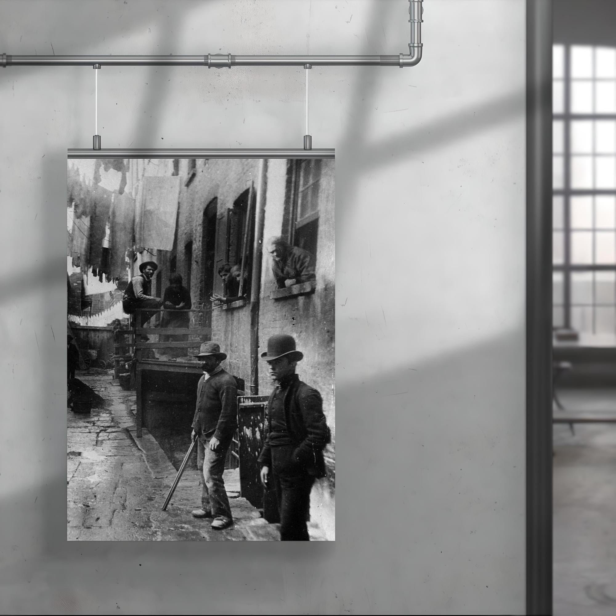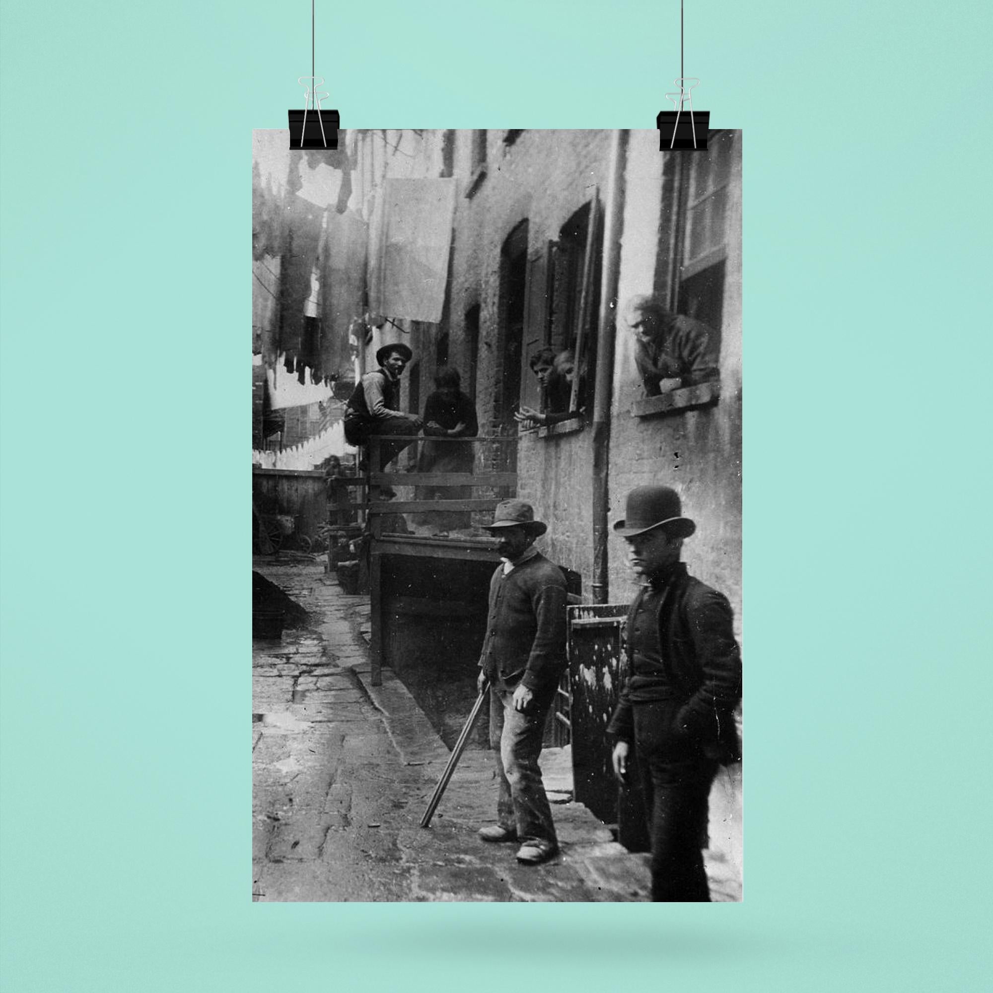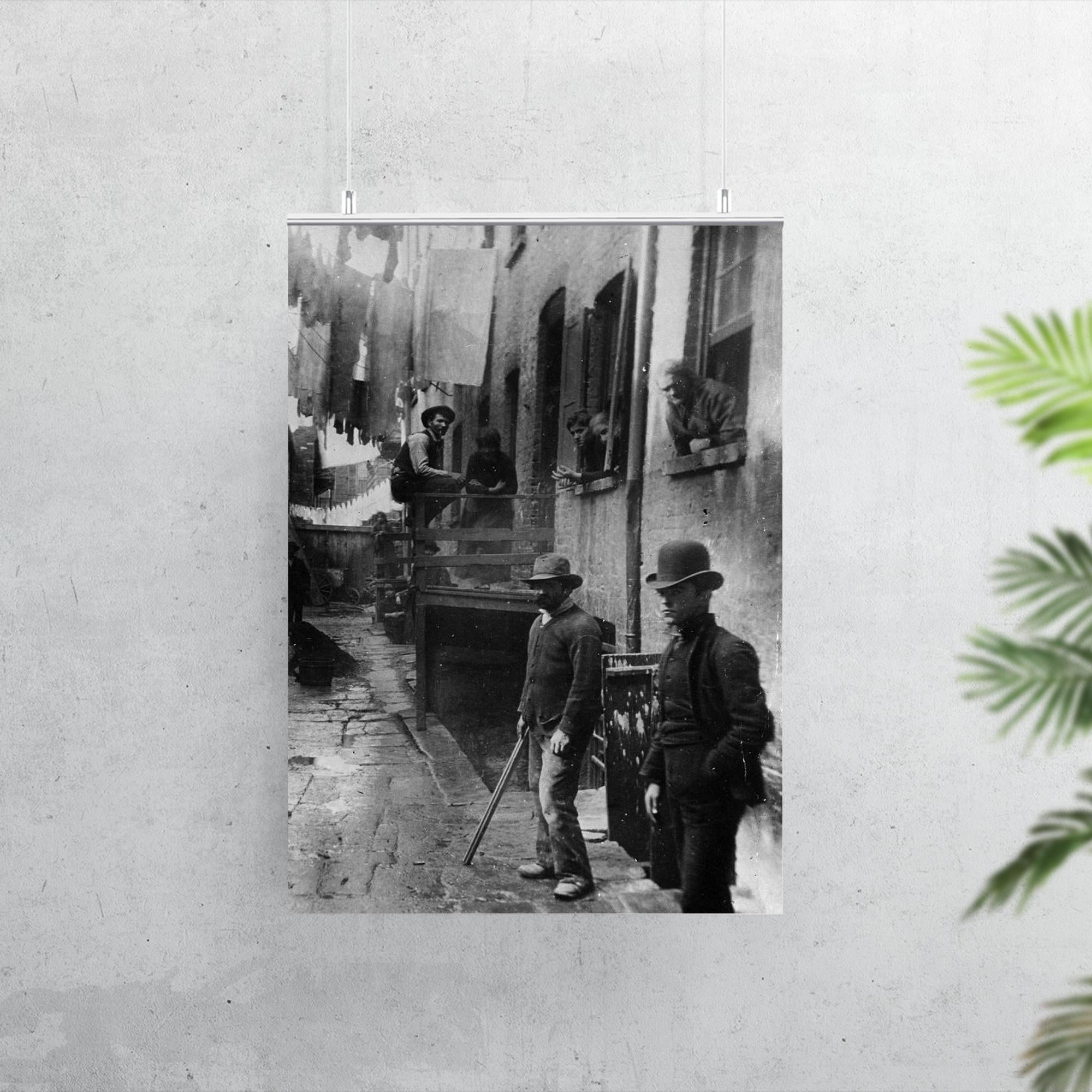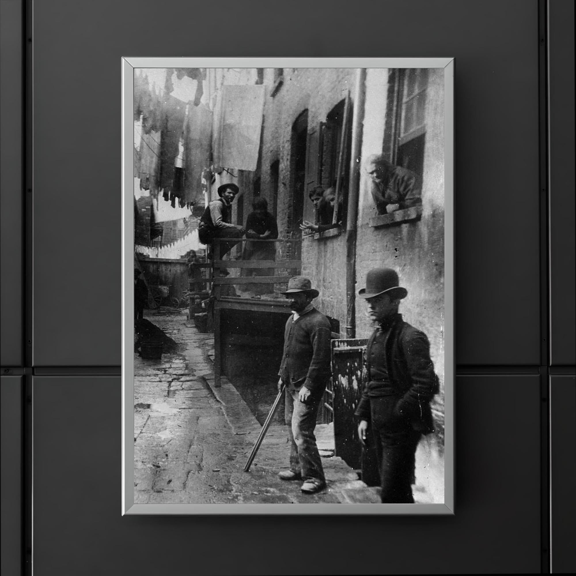 Step back into the gritty streets of 1887 New York with this striking poster of "Group of Men Loitering in Bandit's Roost Alley, Mulberry Street." Capturing a raw slice of urban life from a bygone era, this compelling image invites you to explore the stories etched into the shadows of the city’s historic alleyways. Perfect for lovers of vintage photography and timeless cityscapes, it transforms any space into a window to the past.