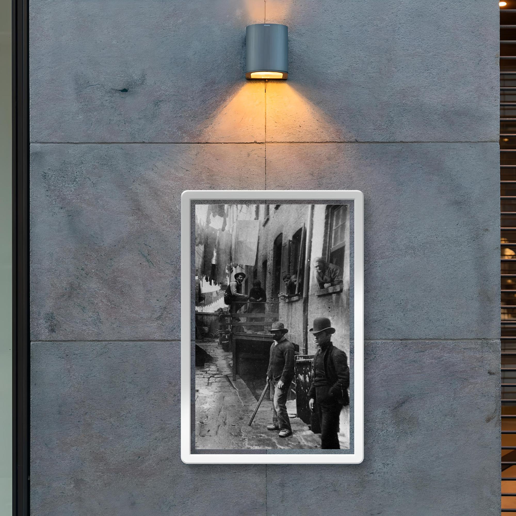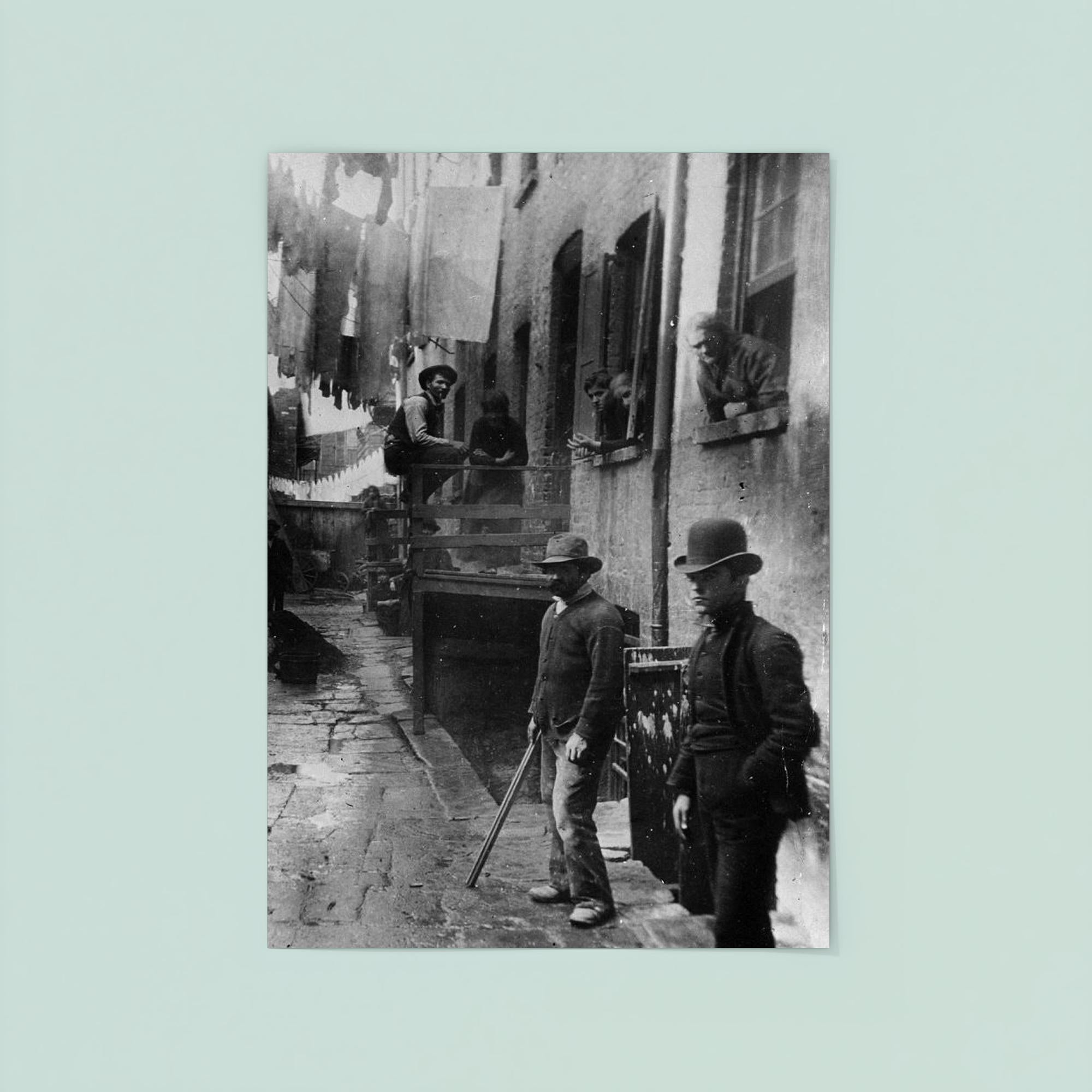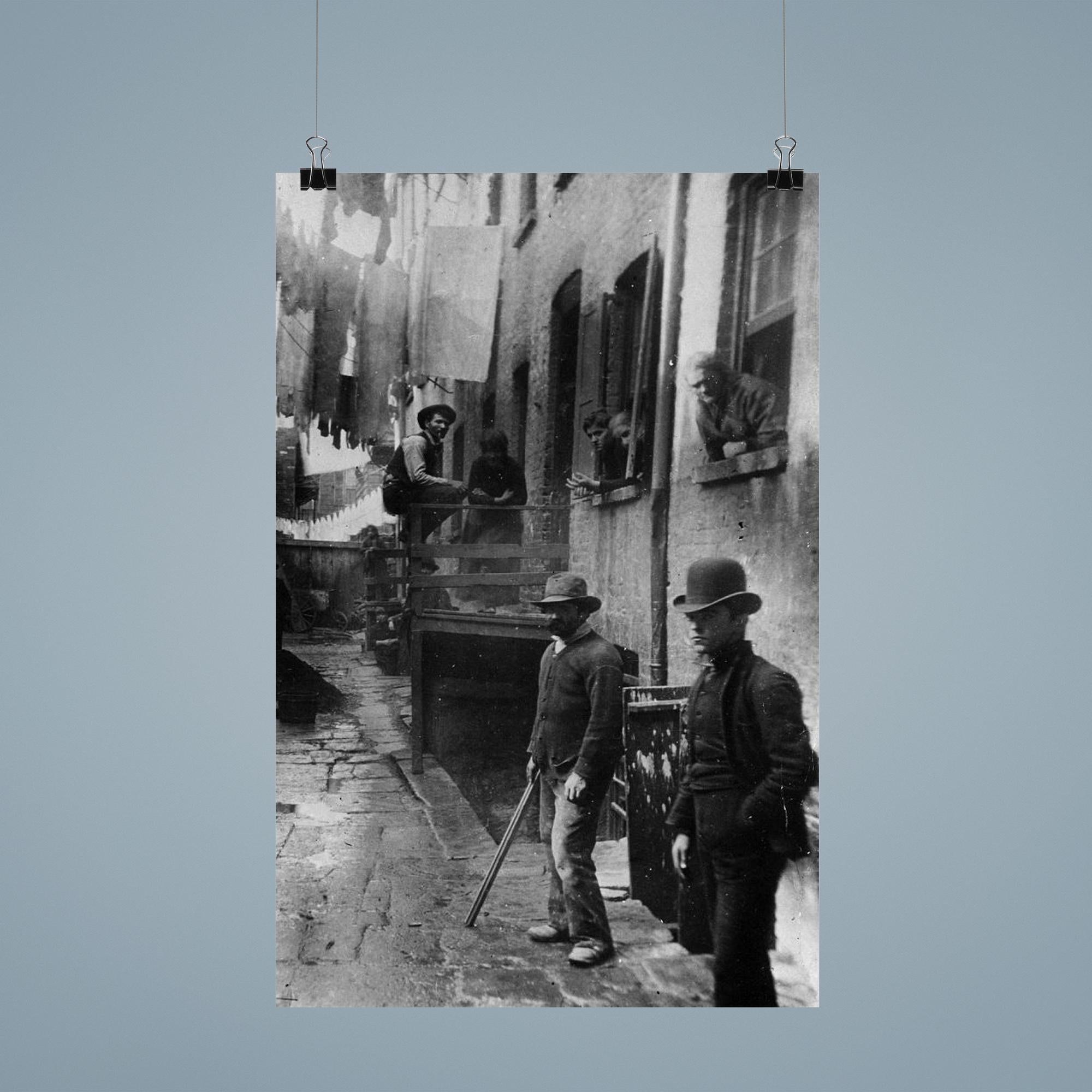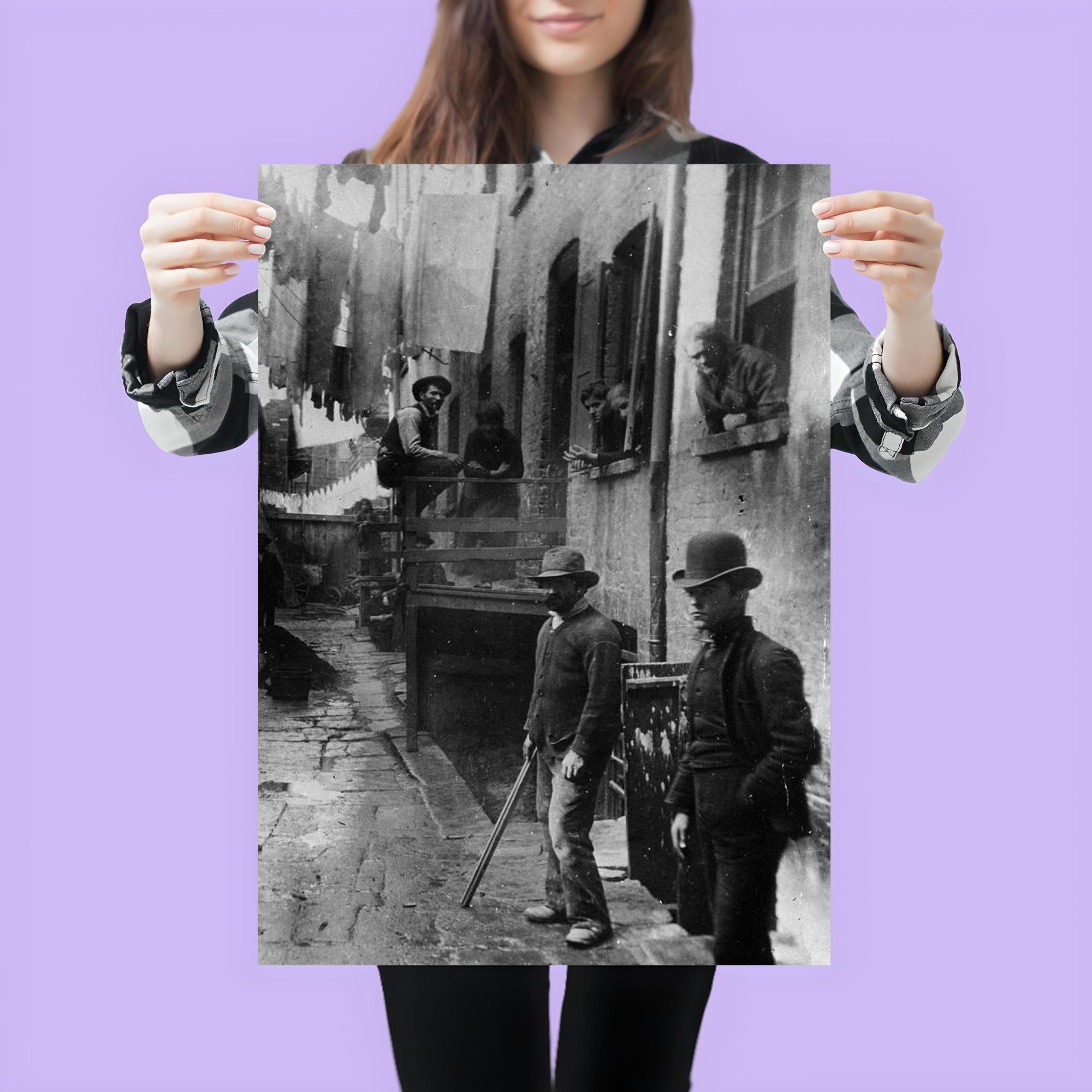 Step back into the gritty streets of 1887 New York with this striking poster of "Group of Men Loitering in Bandit's Roost Alley, Mulberry Street." Capturing a raw slice of urban life from a bygone era, this compelling image invites you to explore the stories etched into the shadows of the city’s historic alleyways. Perfect for lovers of vintage photography and timeless cityscapes, it transforms any space into a window to the past.