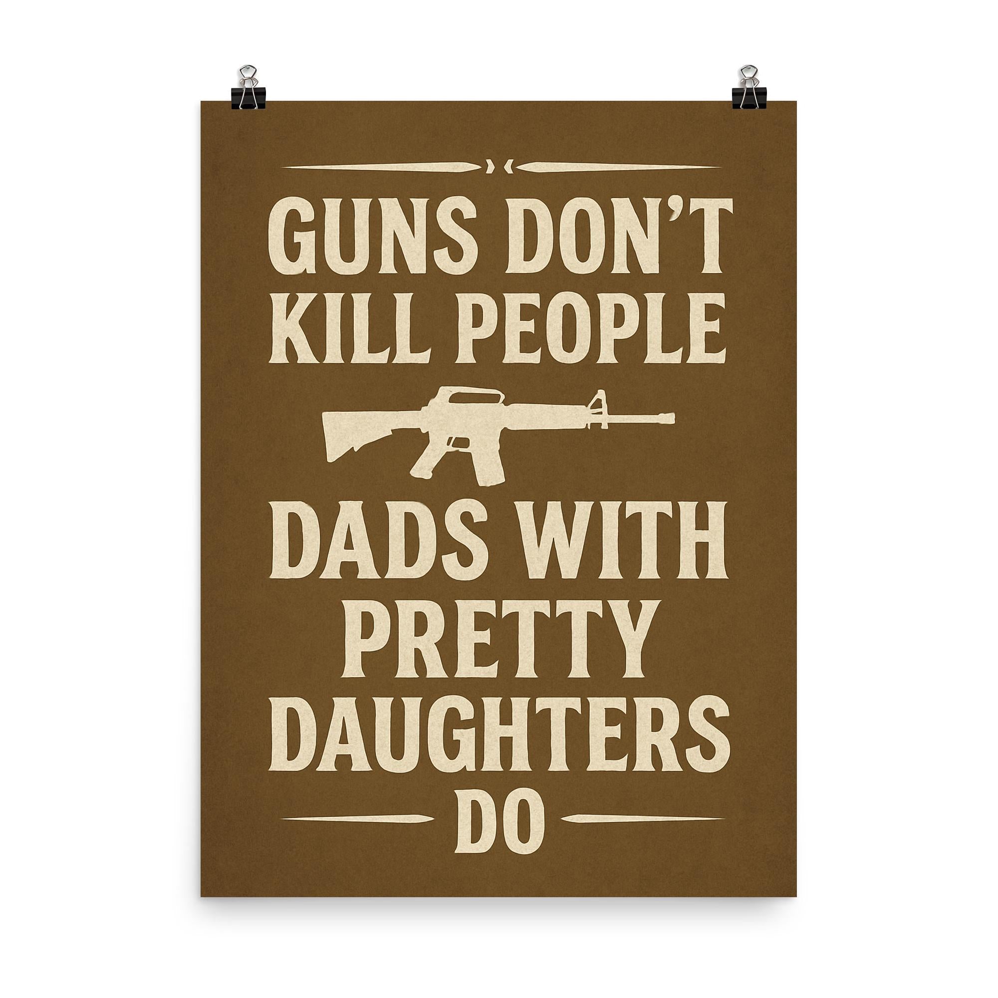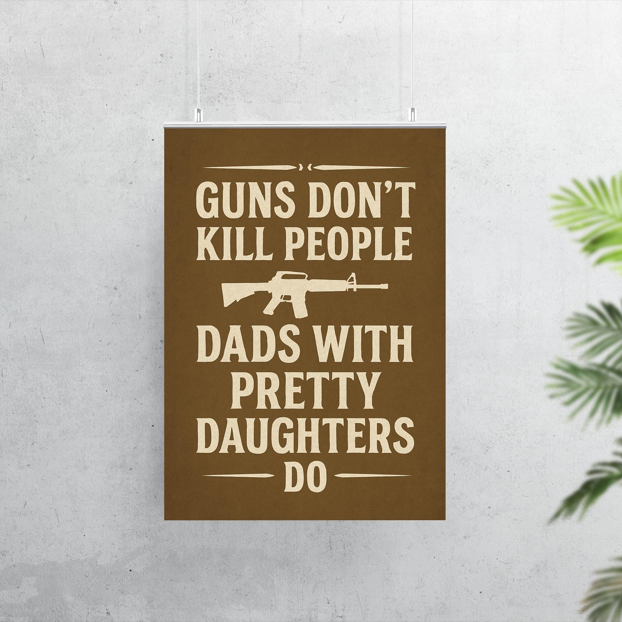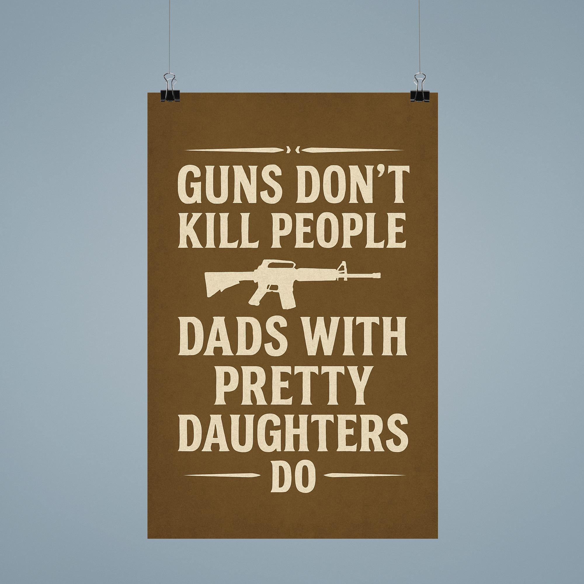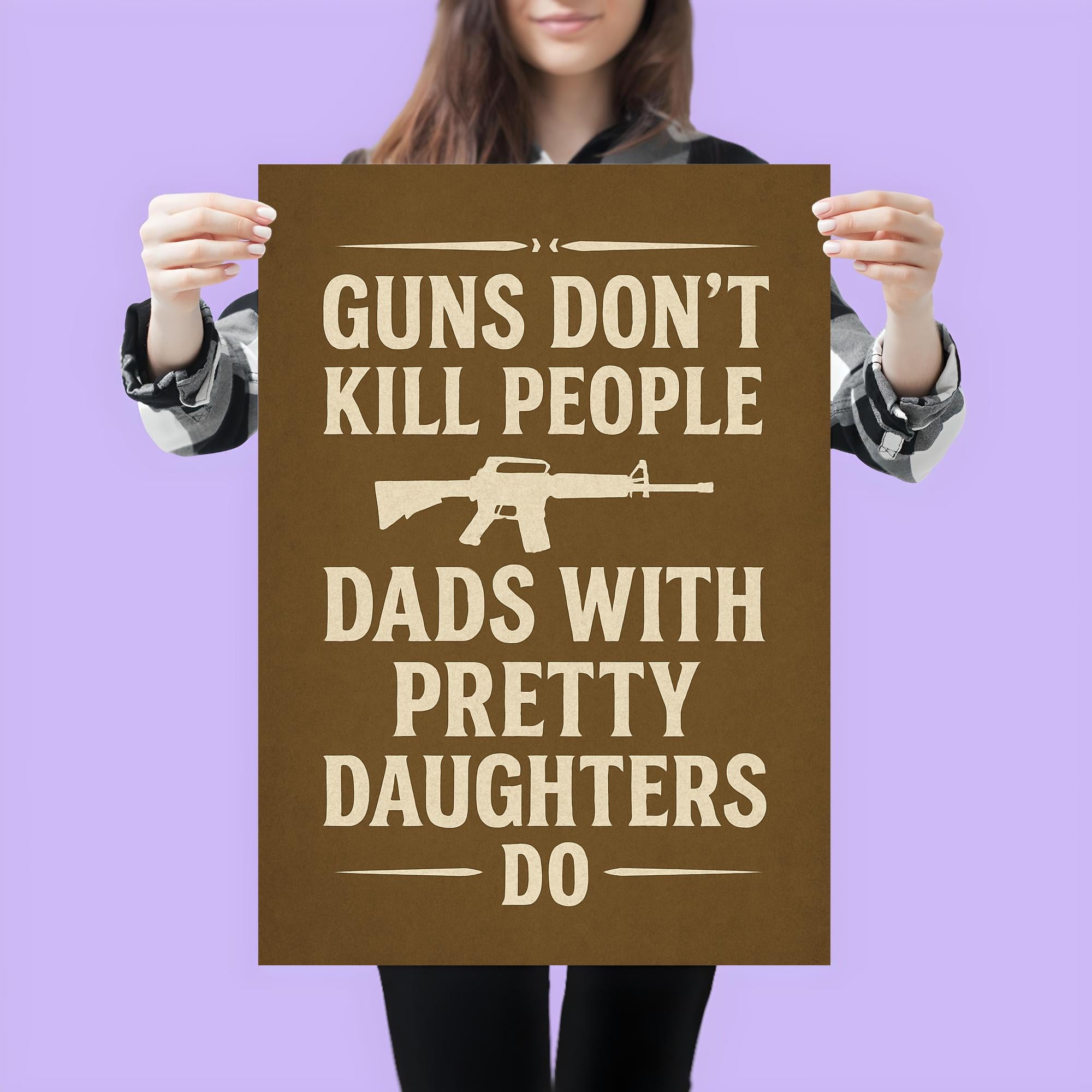 Make your stance clear and your sense of humor clearer with our "Guns Don’t Kill People, Dads With Pretty Daughters Do" poster. Perfect for any protective dad with a witty edge, this statement piece is a conversation starter that gets your message across with bold confidence. Add a touch of attitude to your space—or the perfect gift for the dad who’s always on guard.