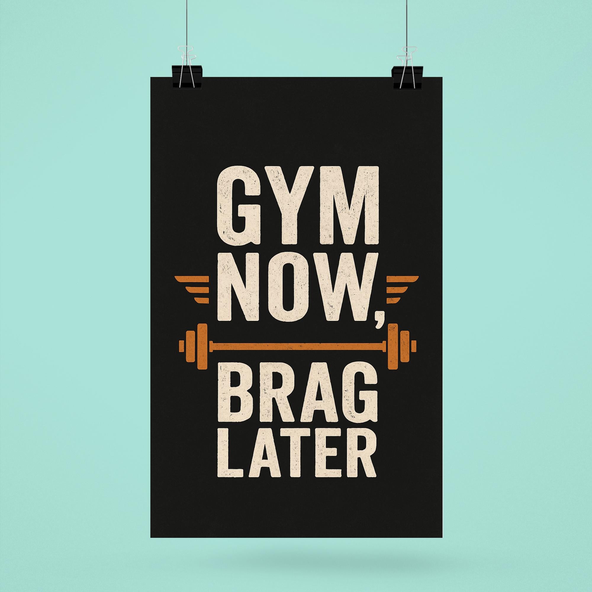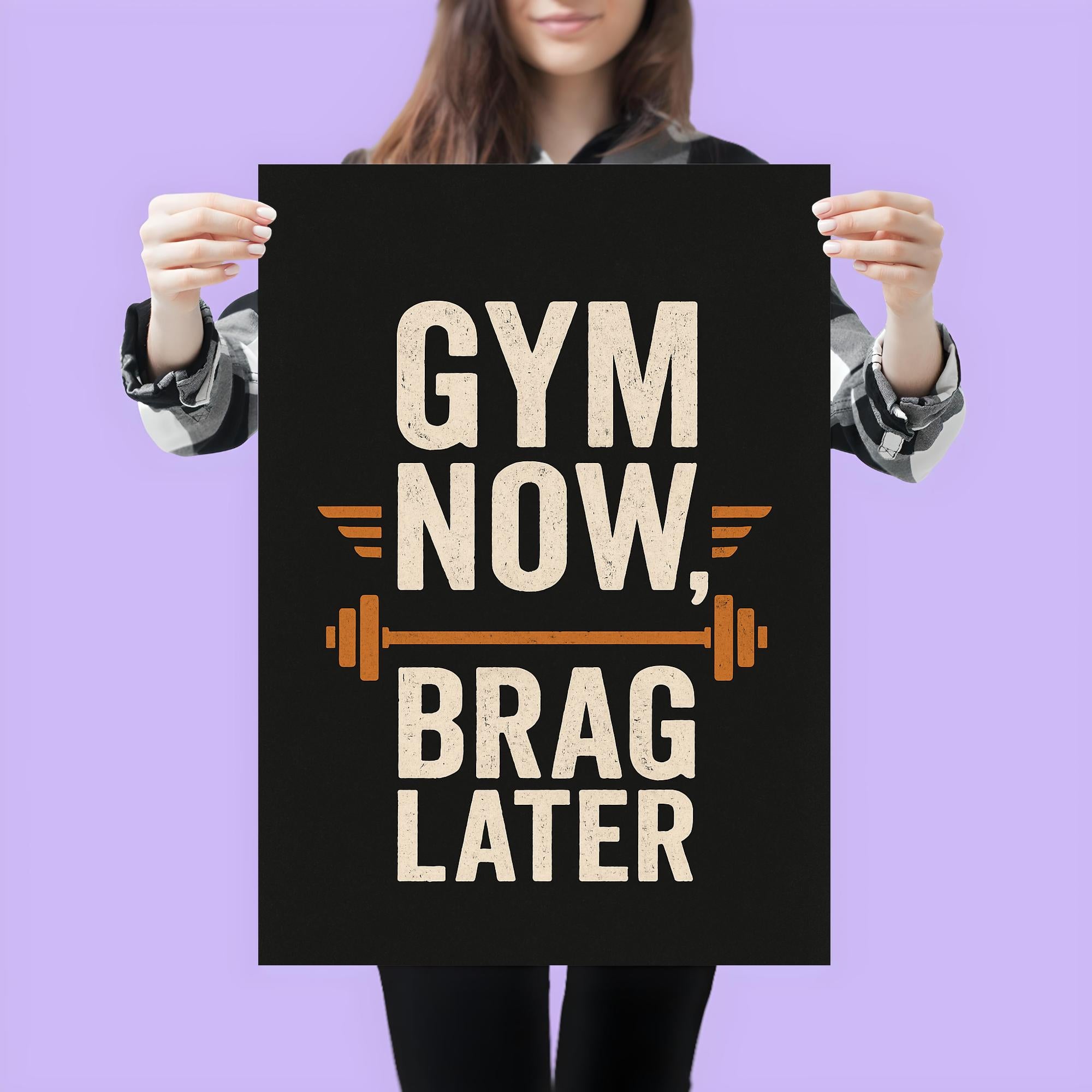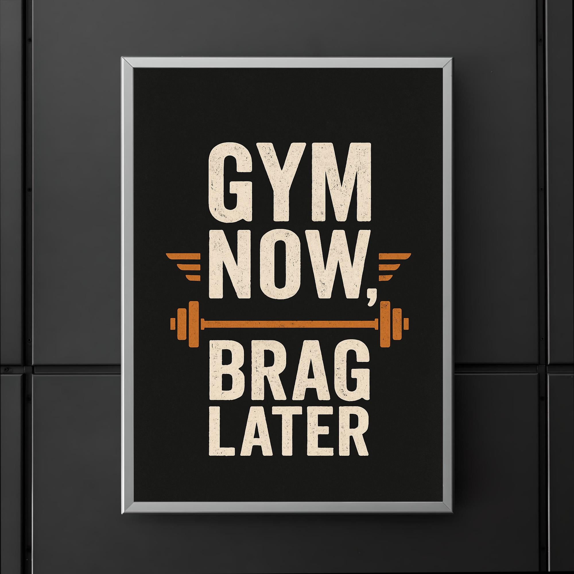 Stay focused and fuel your drive with this bold "Gym Now, Brag Later" poster. Let it remind you every day that hard work in the gym pays off—and the results speak for themselves. Perfect for anyone who values progress over excuses and is ready to turn sweat into pride.
