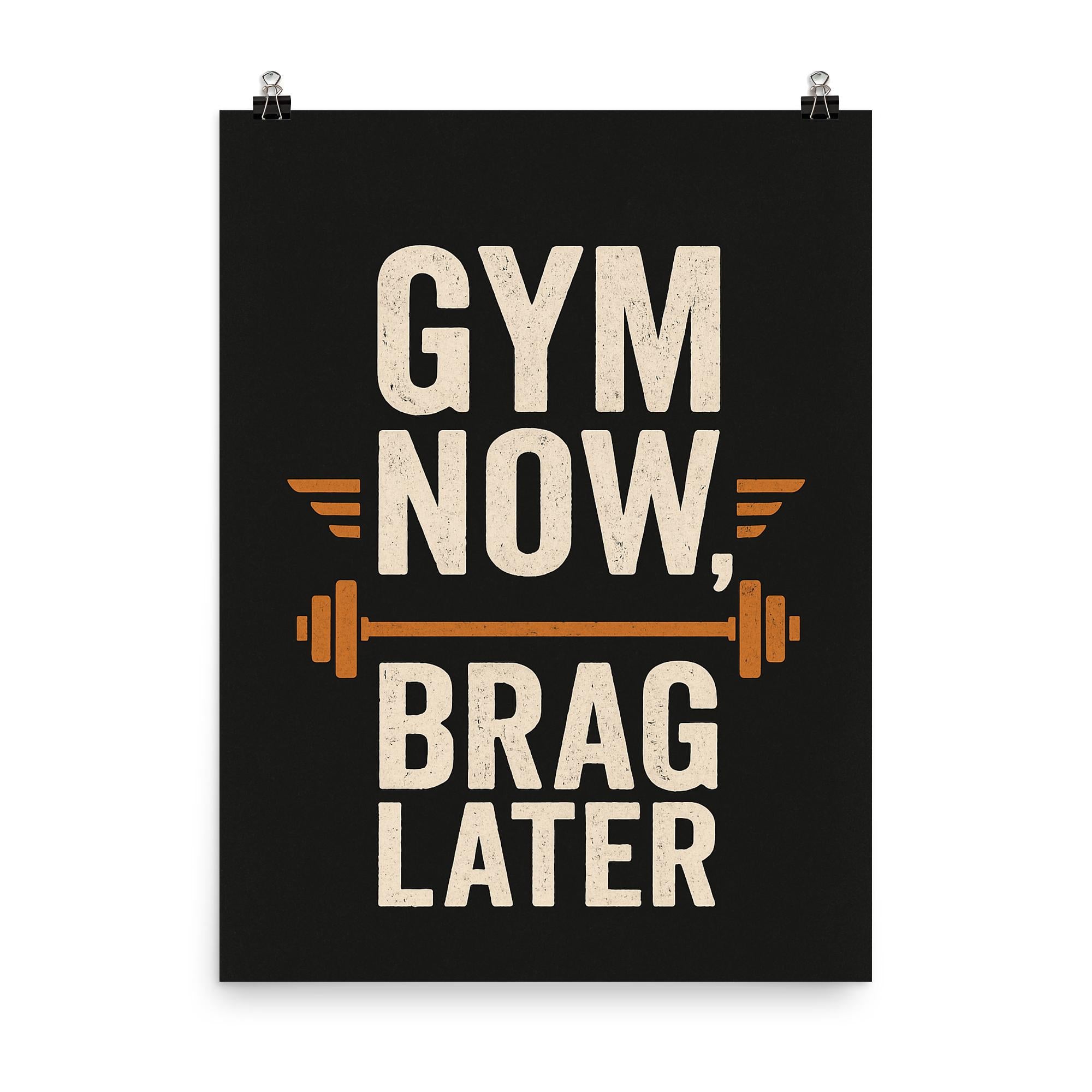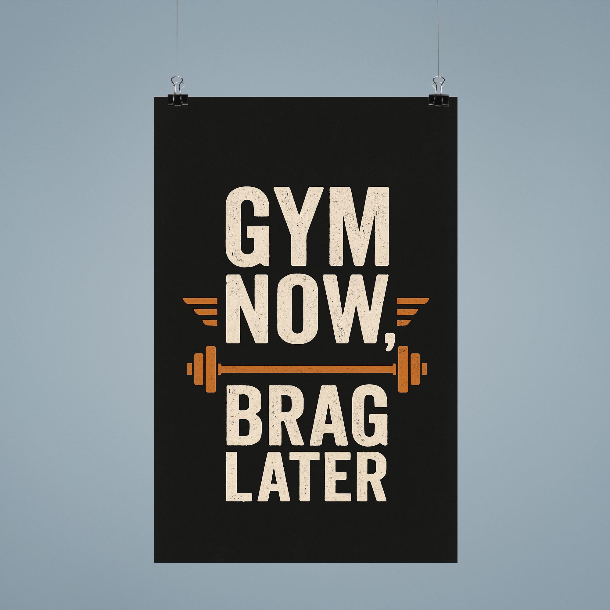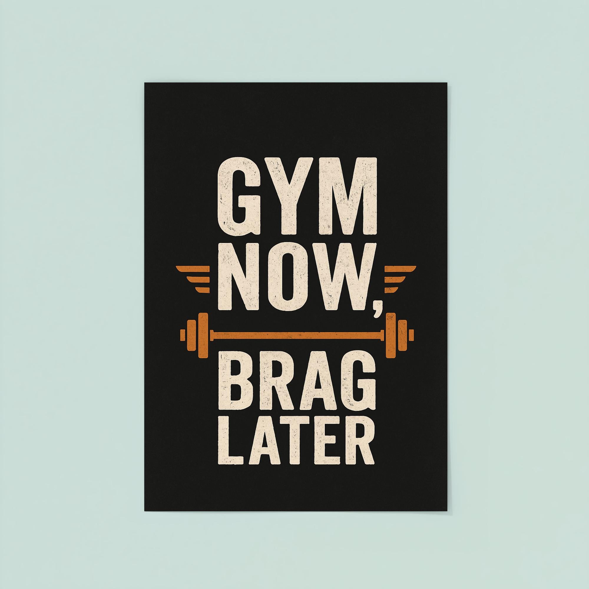 Stay focused and fuel your drive with this bold "Gym Now, Brag Later" poster. Let it remind you every day that hard work in the gym pays off—and the results speak for themselves. Perfect for anyone who values progress over excuses and is ready to turn sweat into pride.