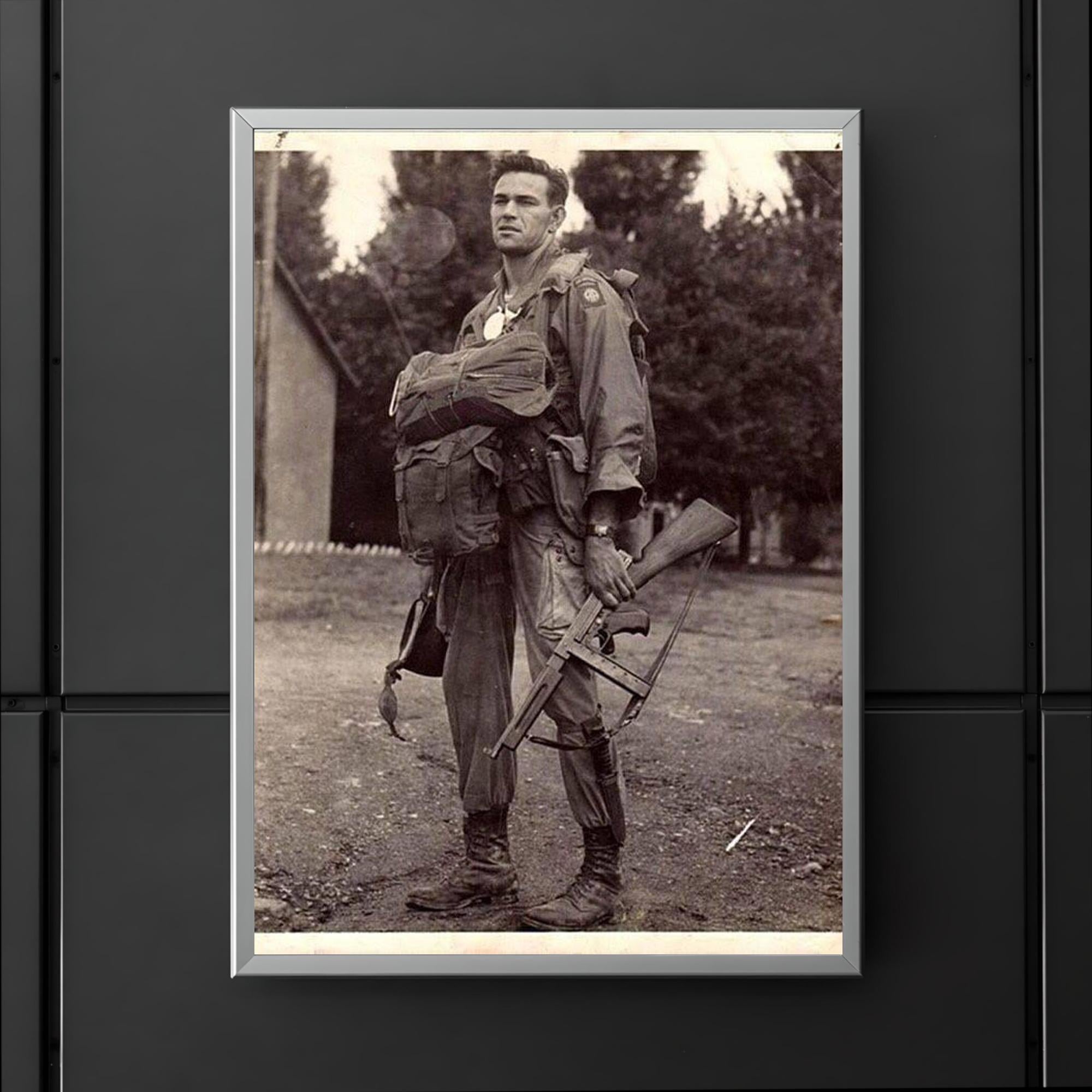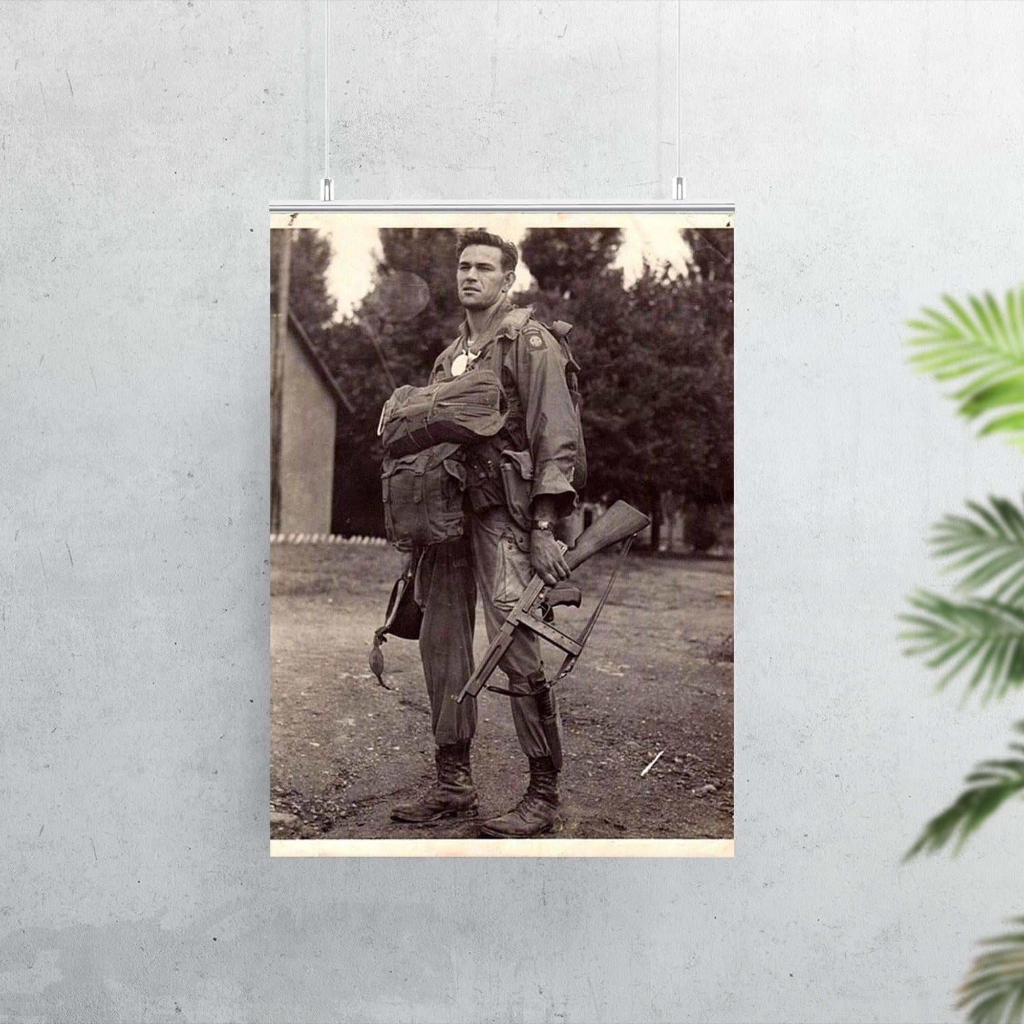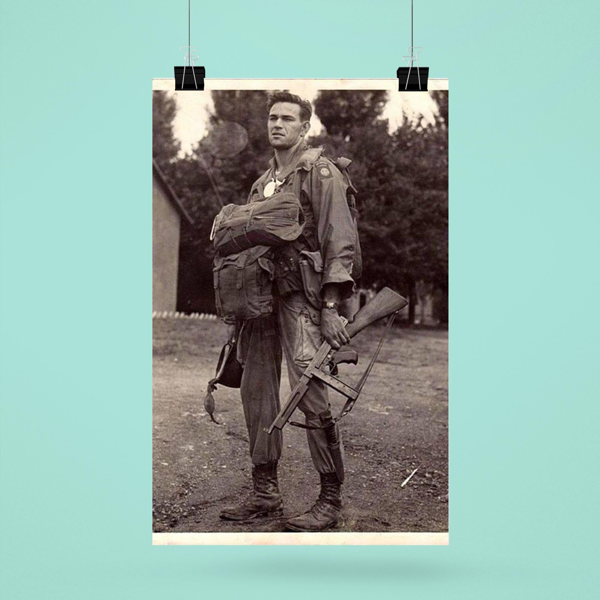 Capture a powerful moment in history with this striking poster featuring Harry Hudec of the 82nd Airborne, ready for his 1944 combat jump. The image embodies courage and determination, serving as a tribute to the bravery of those who faced the unknown with unwavering resolve. Perfect for history enthusiasts and collectors alike, this poster brings a timeless story of valor into your space.