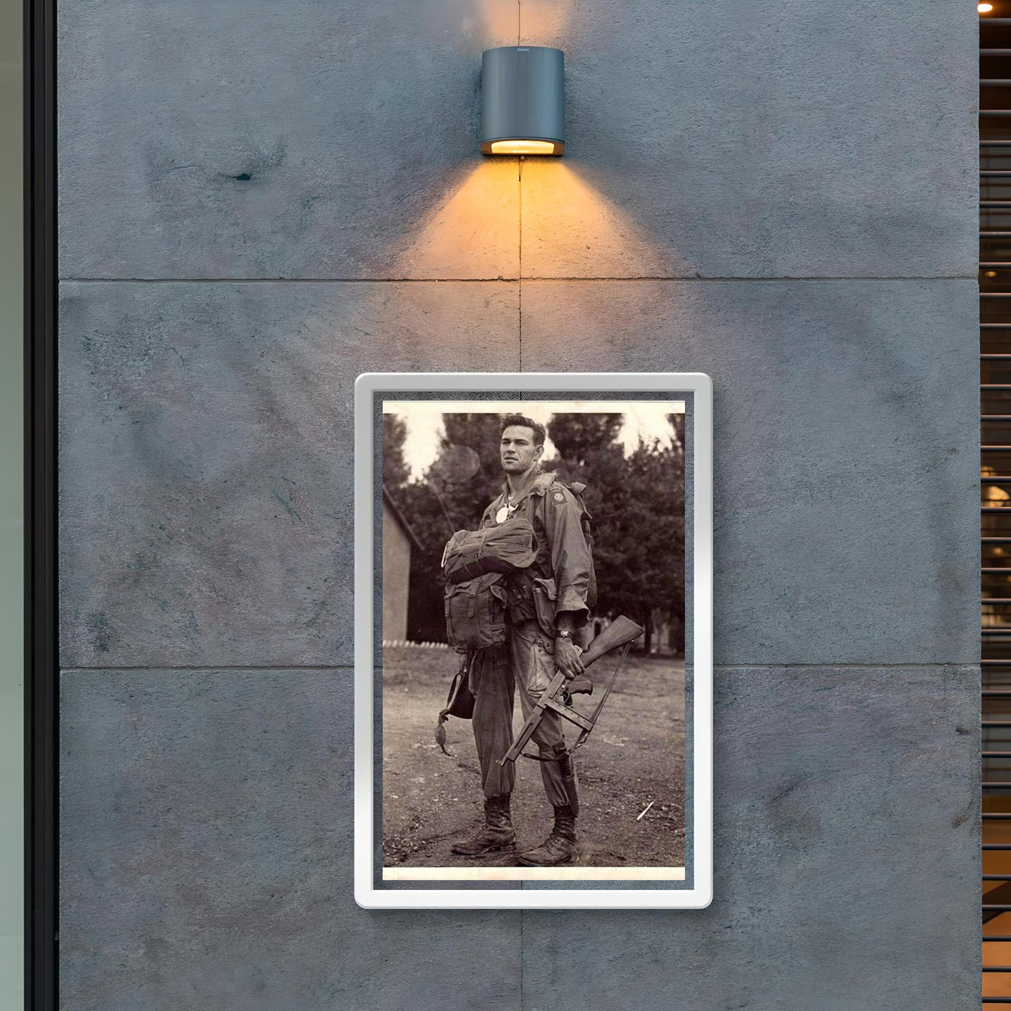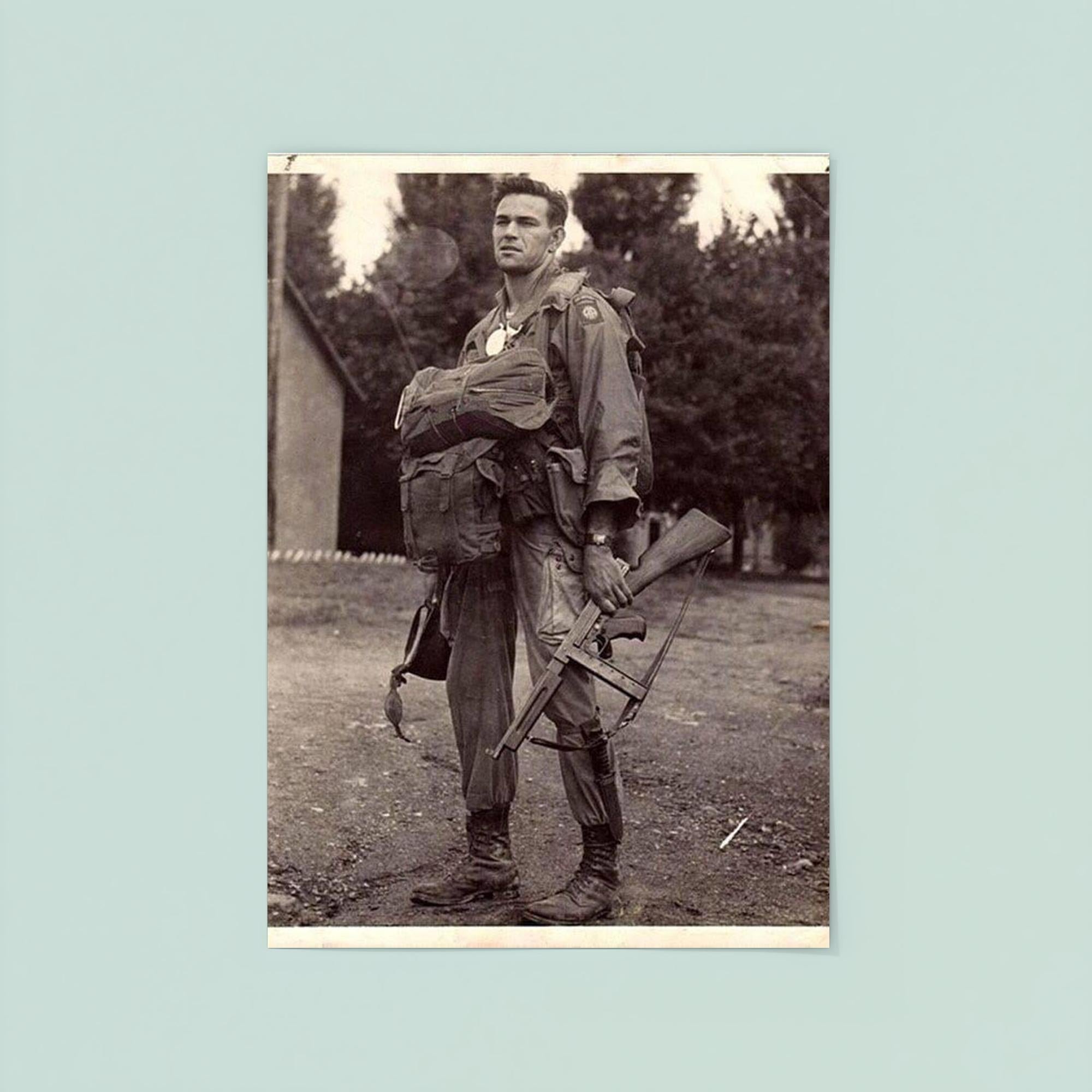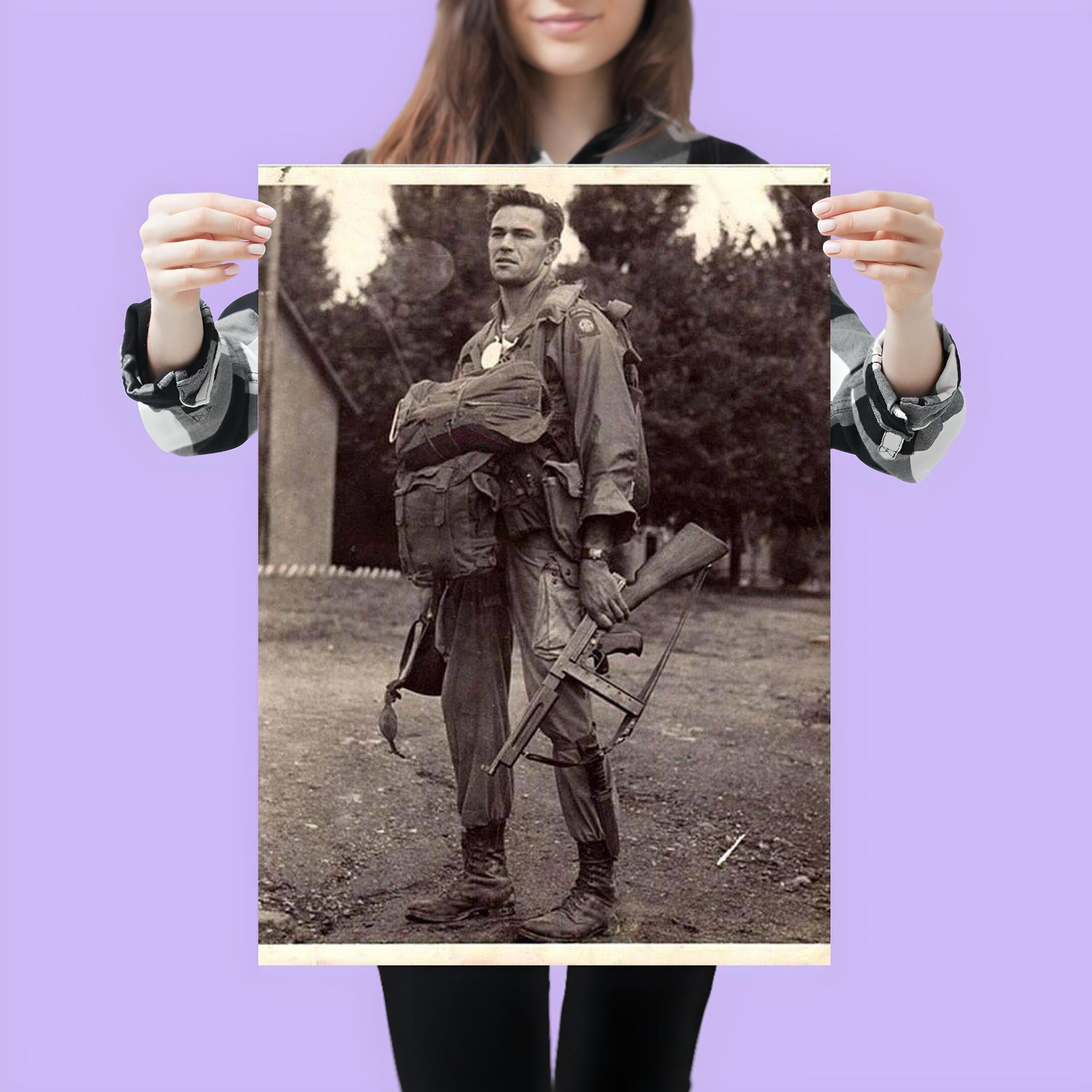 Capture a powerful moment in history with this striking poster featuring Harry Hudec of the 82nd Airborne, ready for his 1944 combat jump. The image embodies courage and determination, serving as a tribute to the bravery of those who faced the unknown with unwavering resolve. Perfect for history enthusiasts and collectors alike, this poster brings a timeless story of valor into your space.