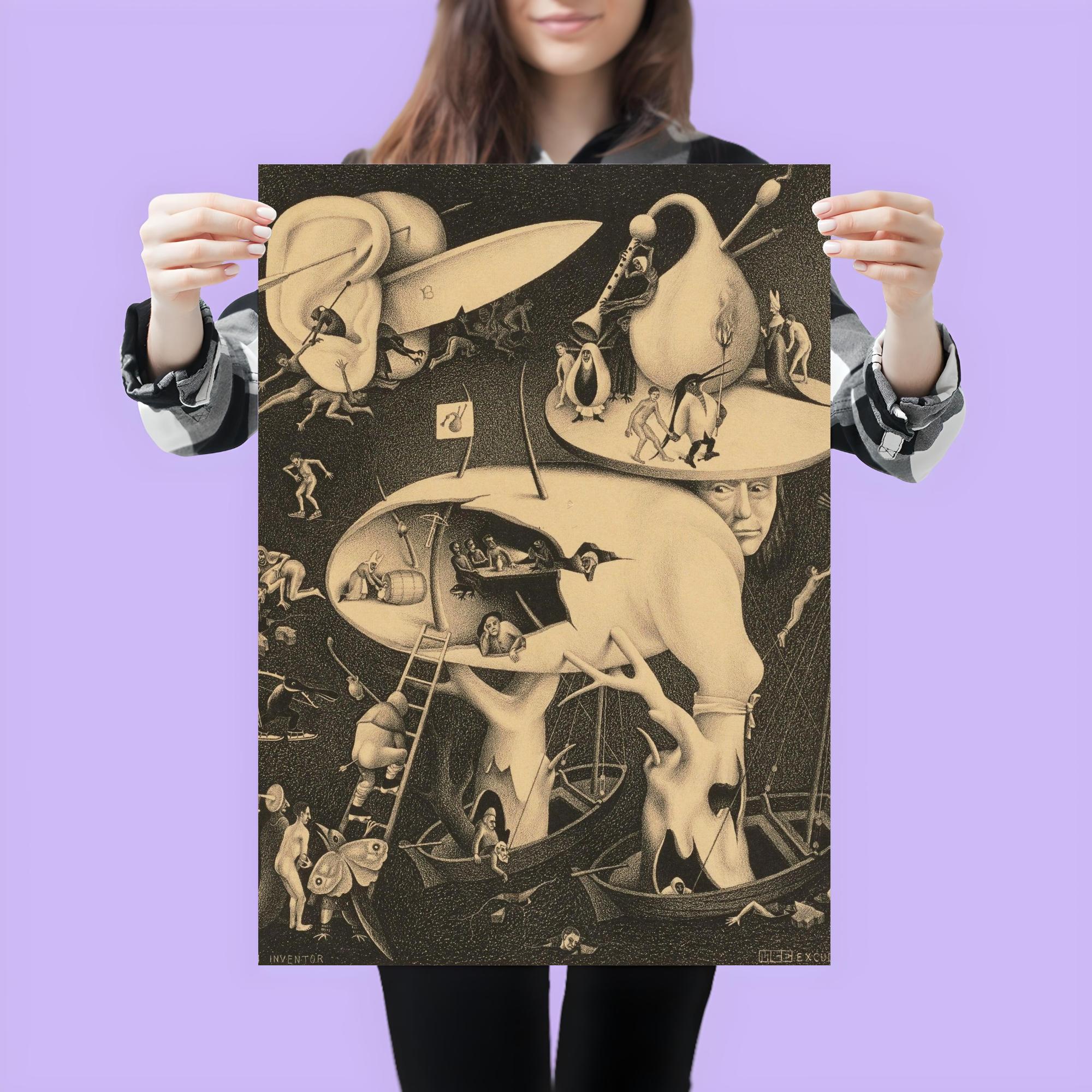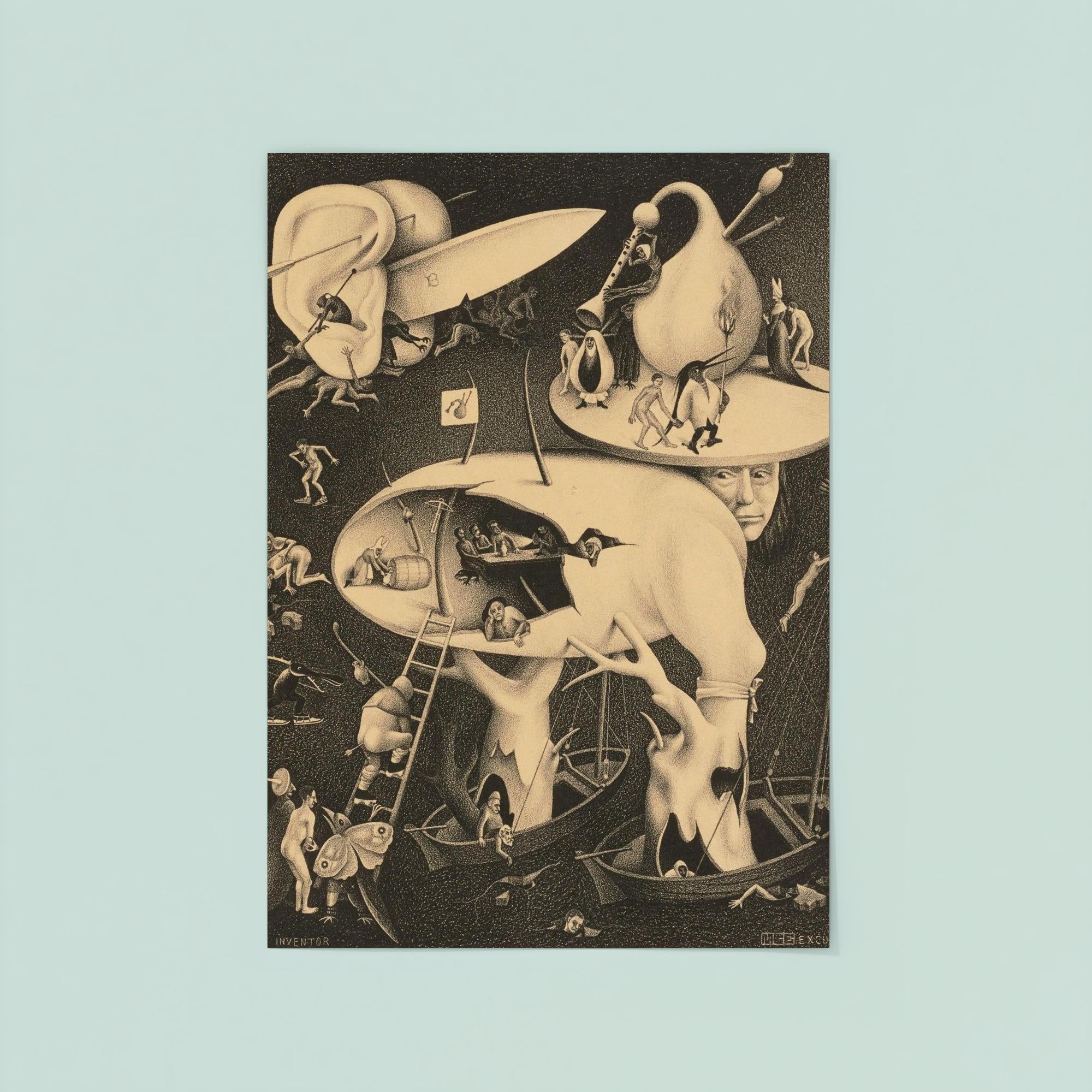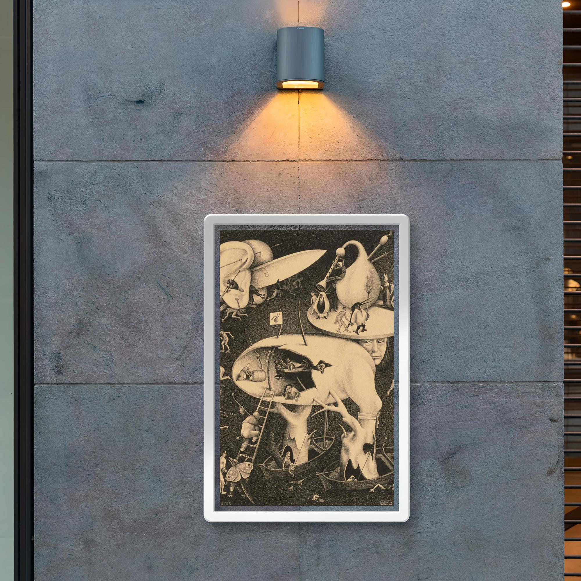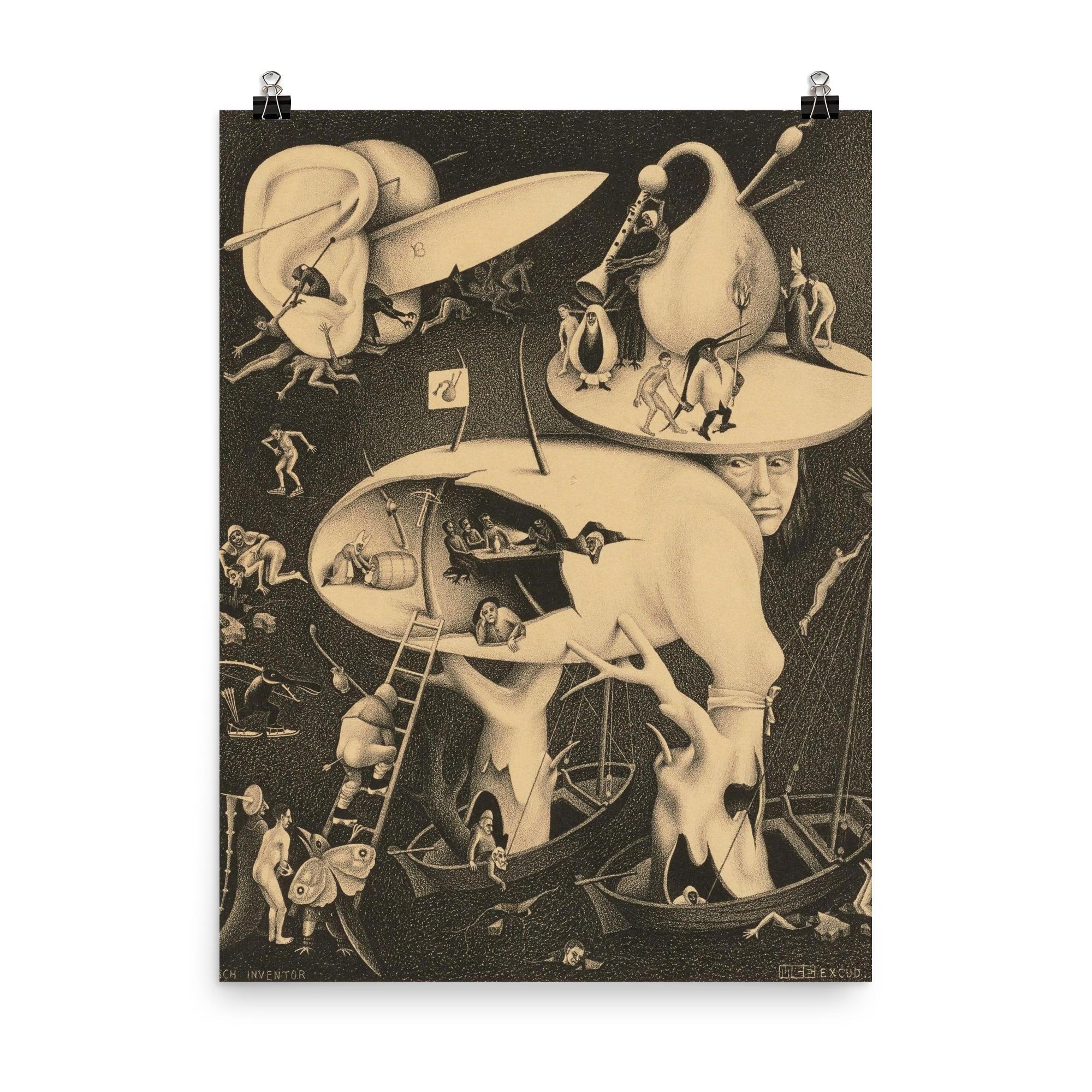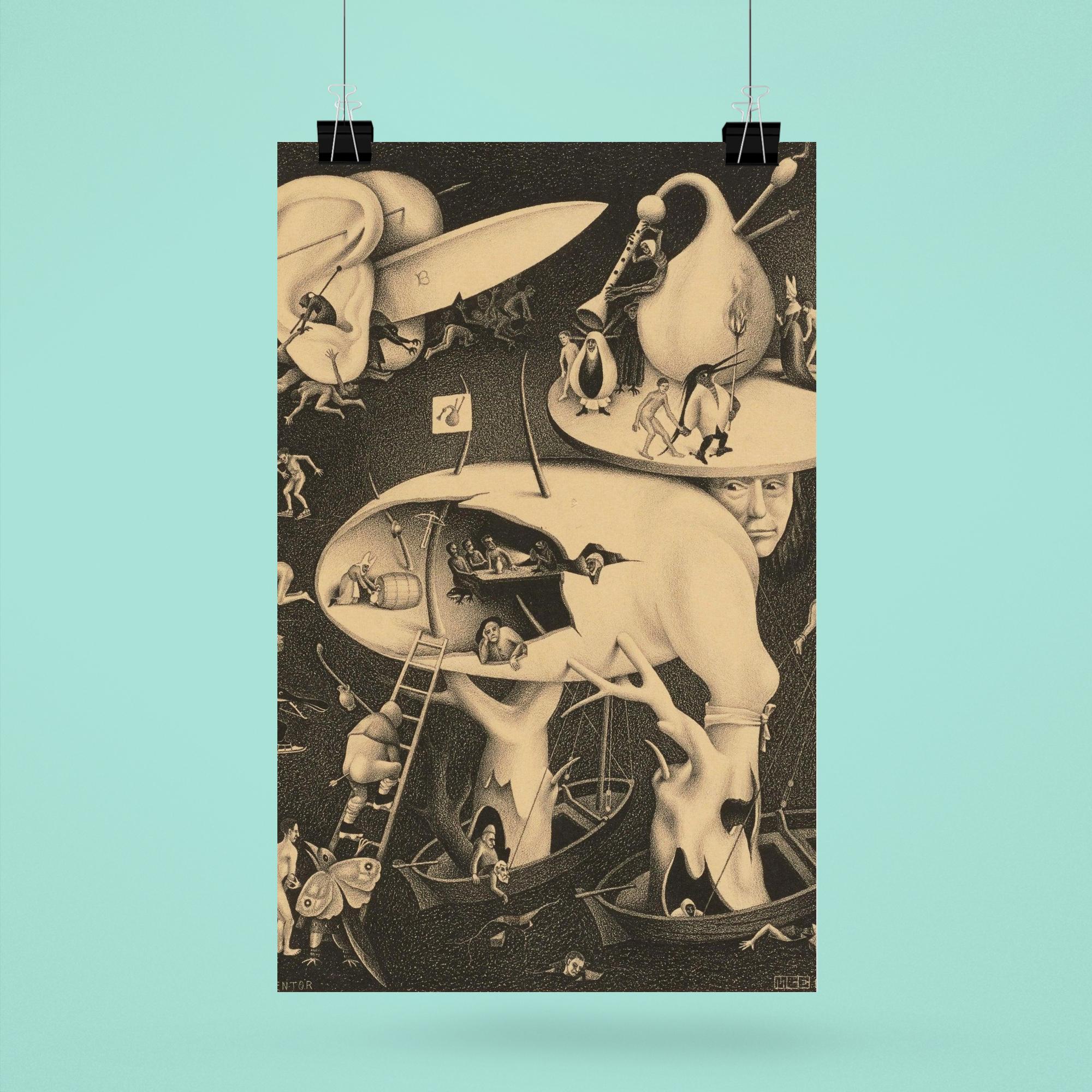 Dive into the enigmatic depths of M.C. Escher’s 1935 masterpiece, *Hell*. This striking lithograph captures a labyrinthine vision both haunting and mesmerizing, where intricate forms and shadowy figures intertwine in Escher’s signature style. Perfect for admirers of surreal art or those who seek a thought-provoking centerpiece, this poster transforms any space into a realm of endless fascination.