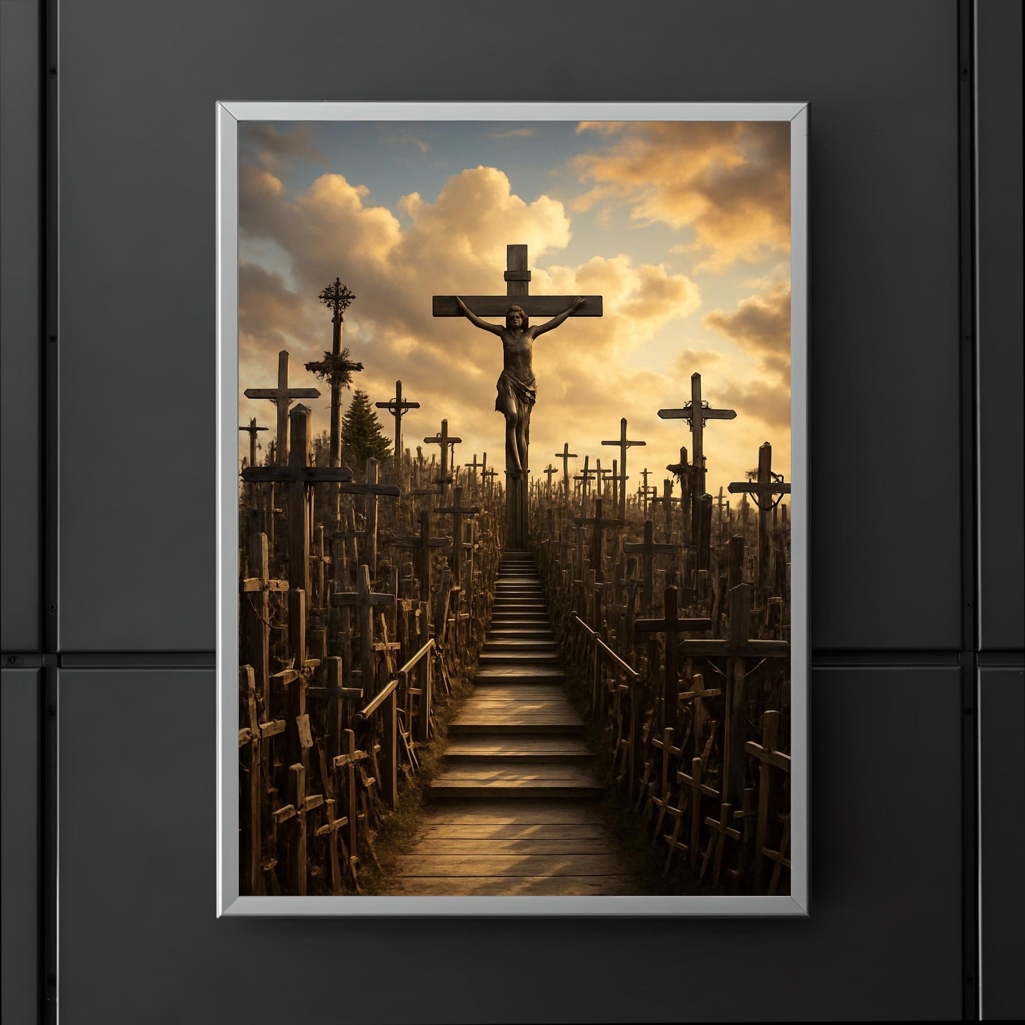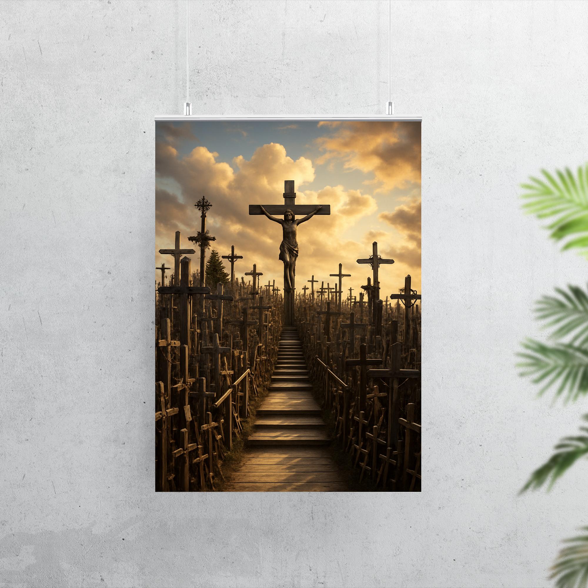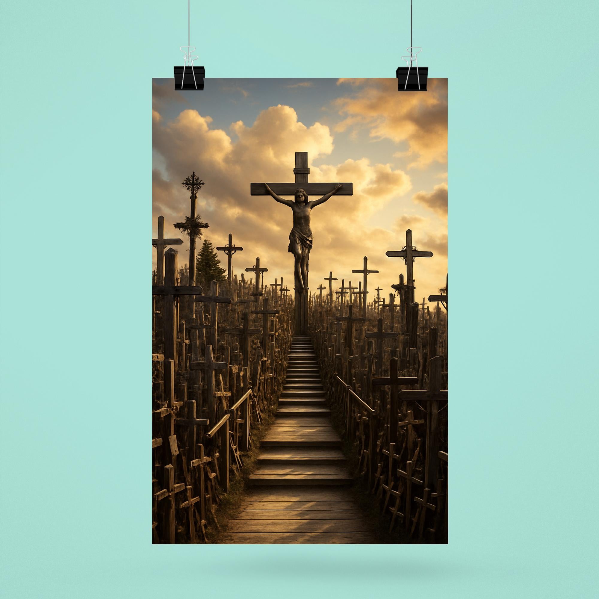 Bring a piece of profound history and quiet resilience into your space with this stunning poster of the Hill of Crosses in Lithuania. Each cross tells a story of faith and hope, creating a powerful, moving tableau that invites reflection and admiration. Perfect for adding a touch of spiritual depth and cultural heritage to any room.