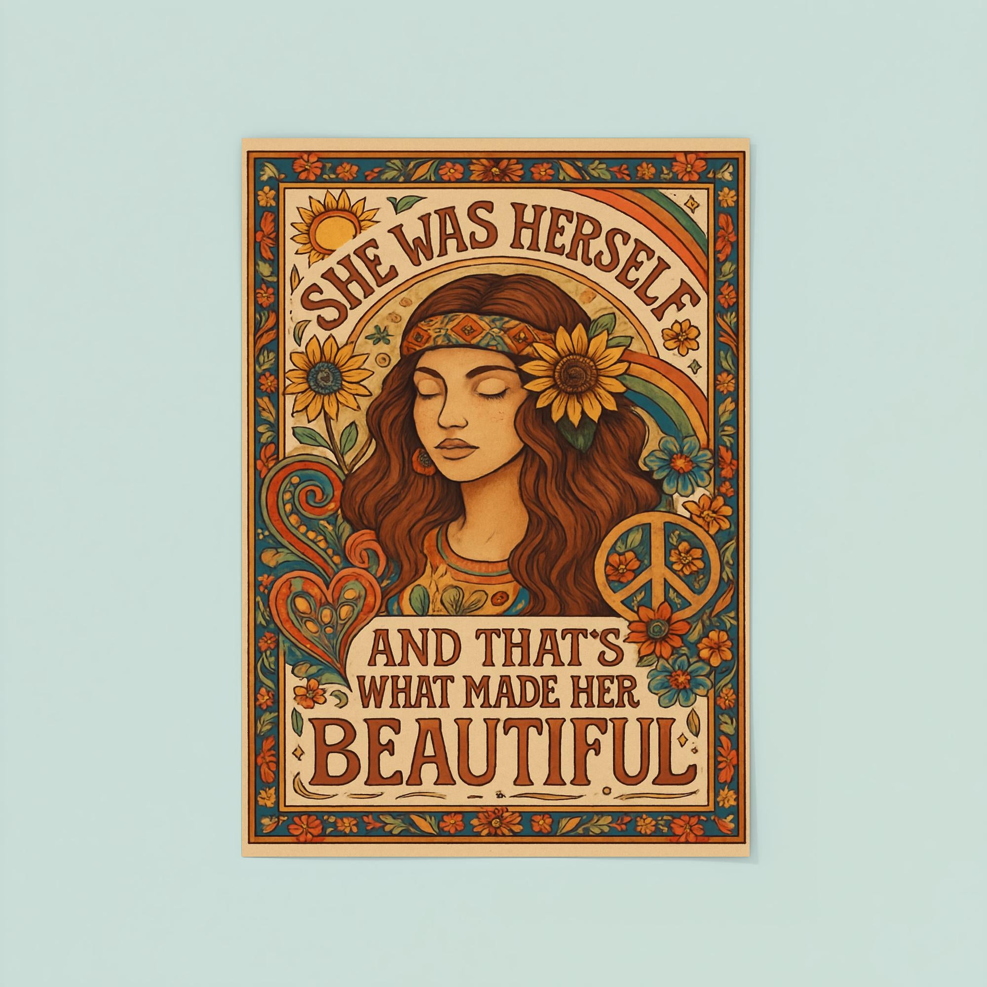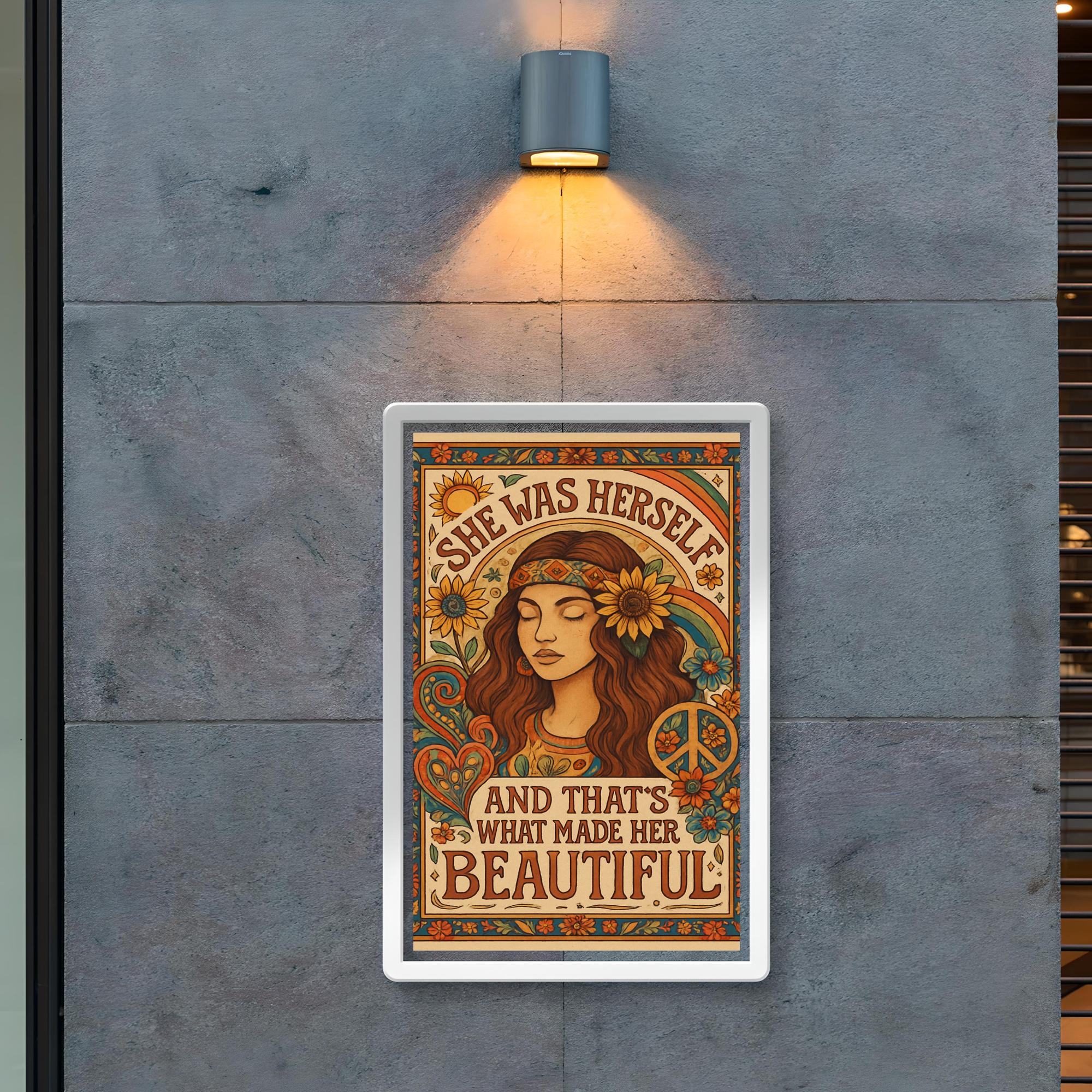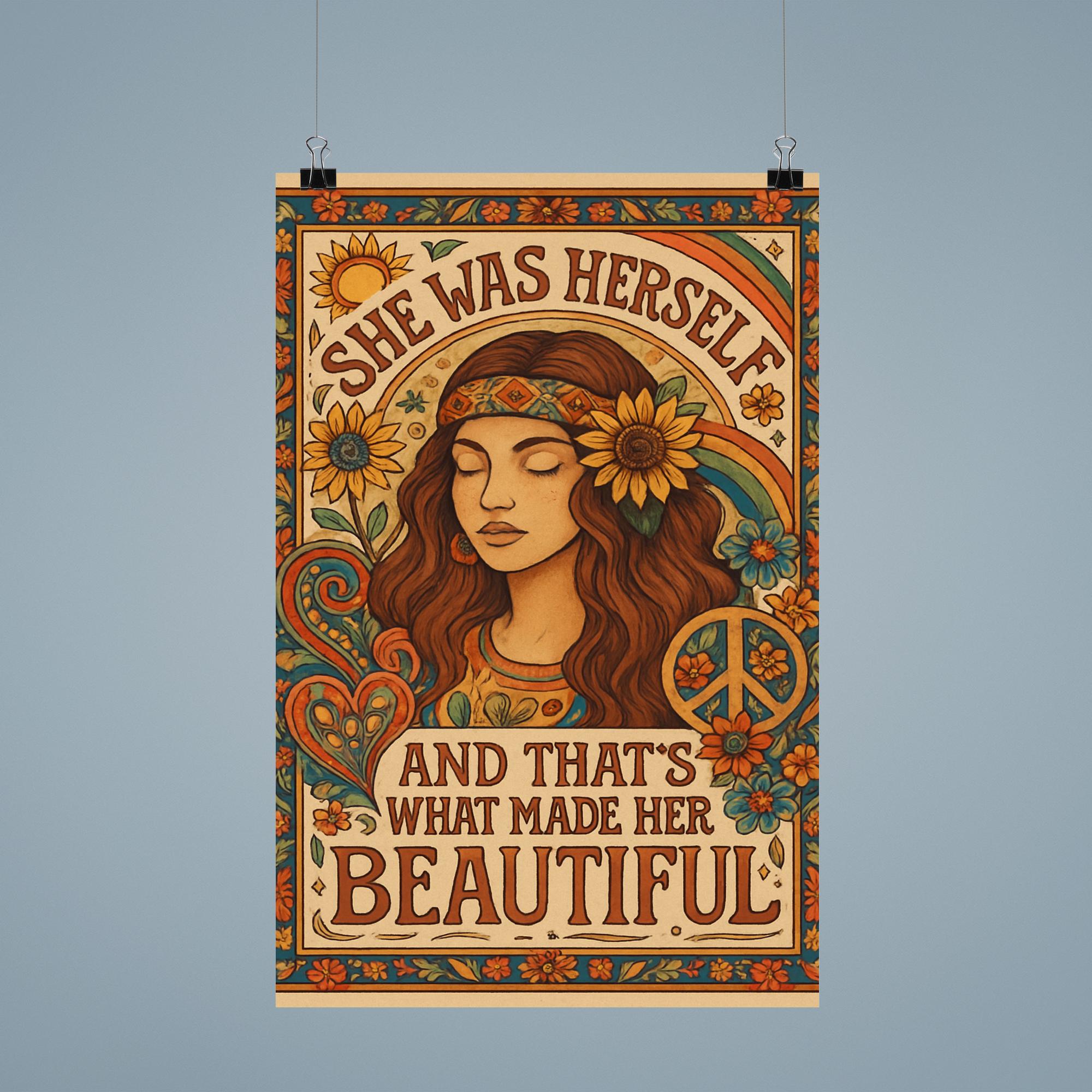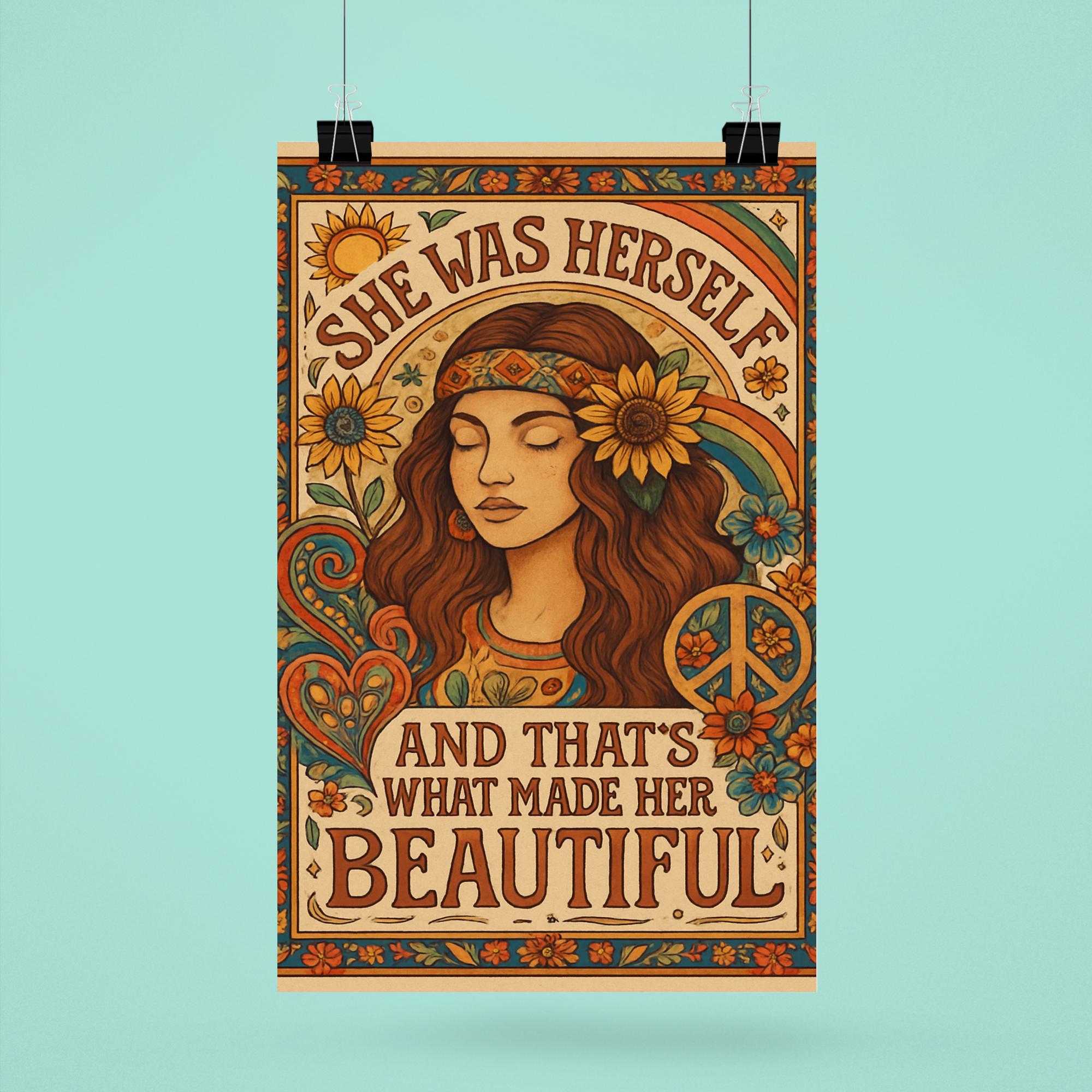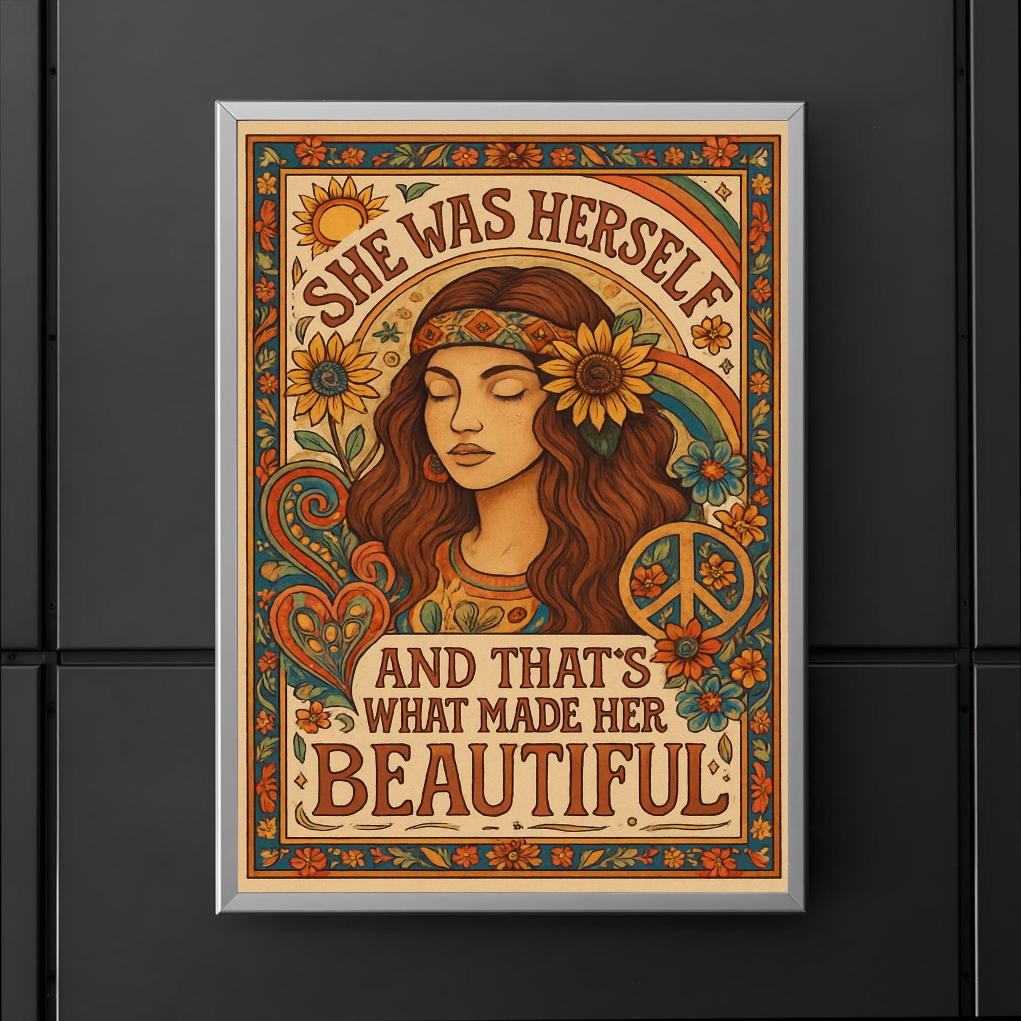 Celebrate the power of authenticity with this inspiring Hippie Boho Chic poster. Featuring the heartfelt phrase, "She was herself and that's what made her beautiful," it’s a perfect reminder to embrace your true self with confidence and grace. Add a touch of meaningful charm to any space and let your walls speak your story.