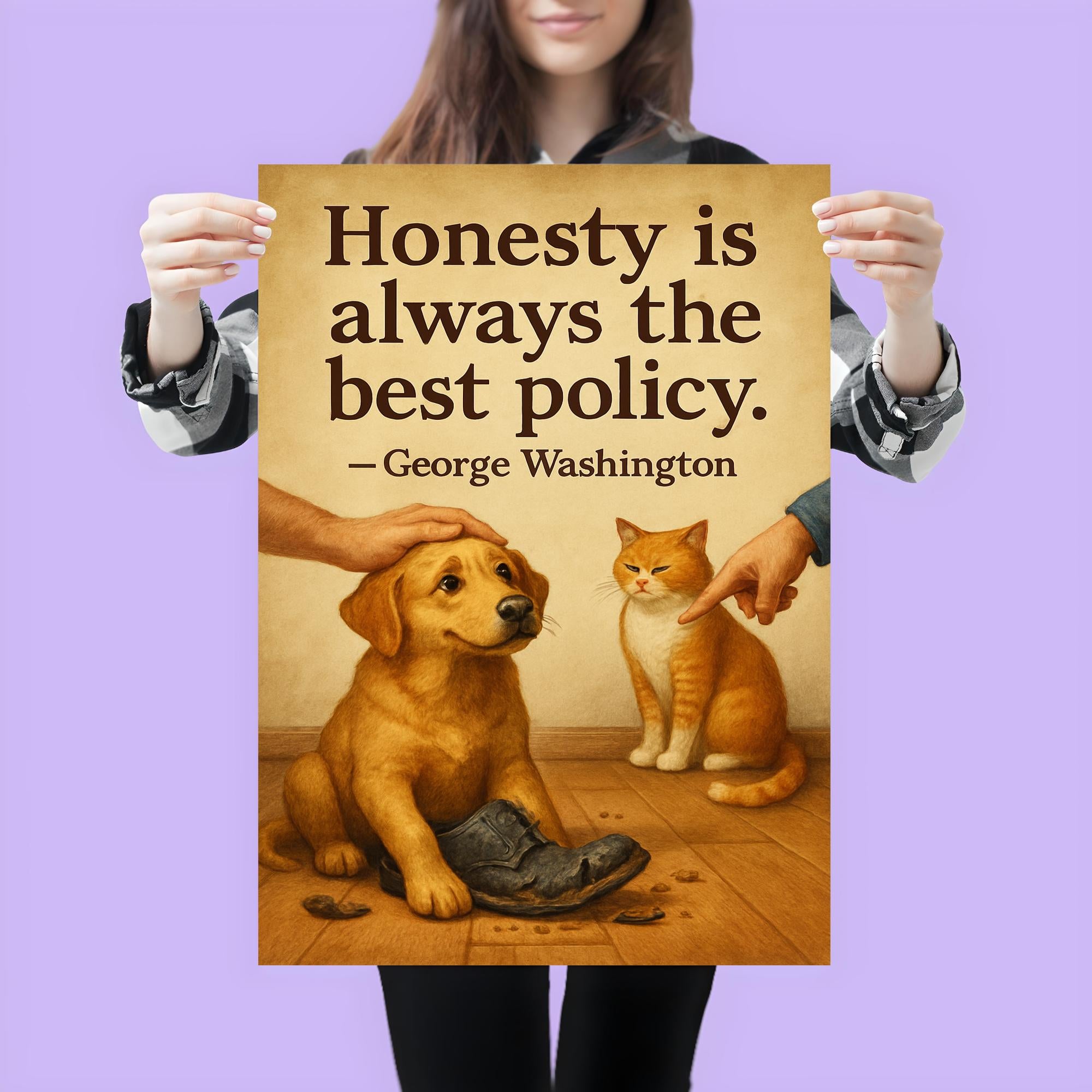 Celebrate timeless wisdom with this charming poster featuring George Washington's famous "Honesty is the best policy" message, playfully paired with a dog forgiven for chewing shoes. Perfect for reminding everyone that truth and forgiveness go hand in hand, this unique artwork adds a warm, uplifting touch to any space.