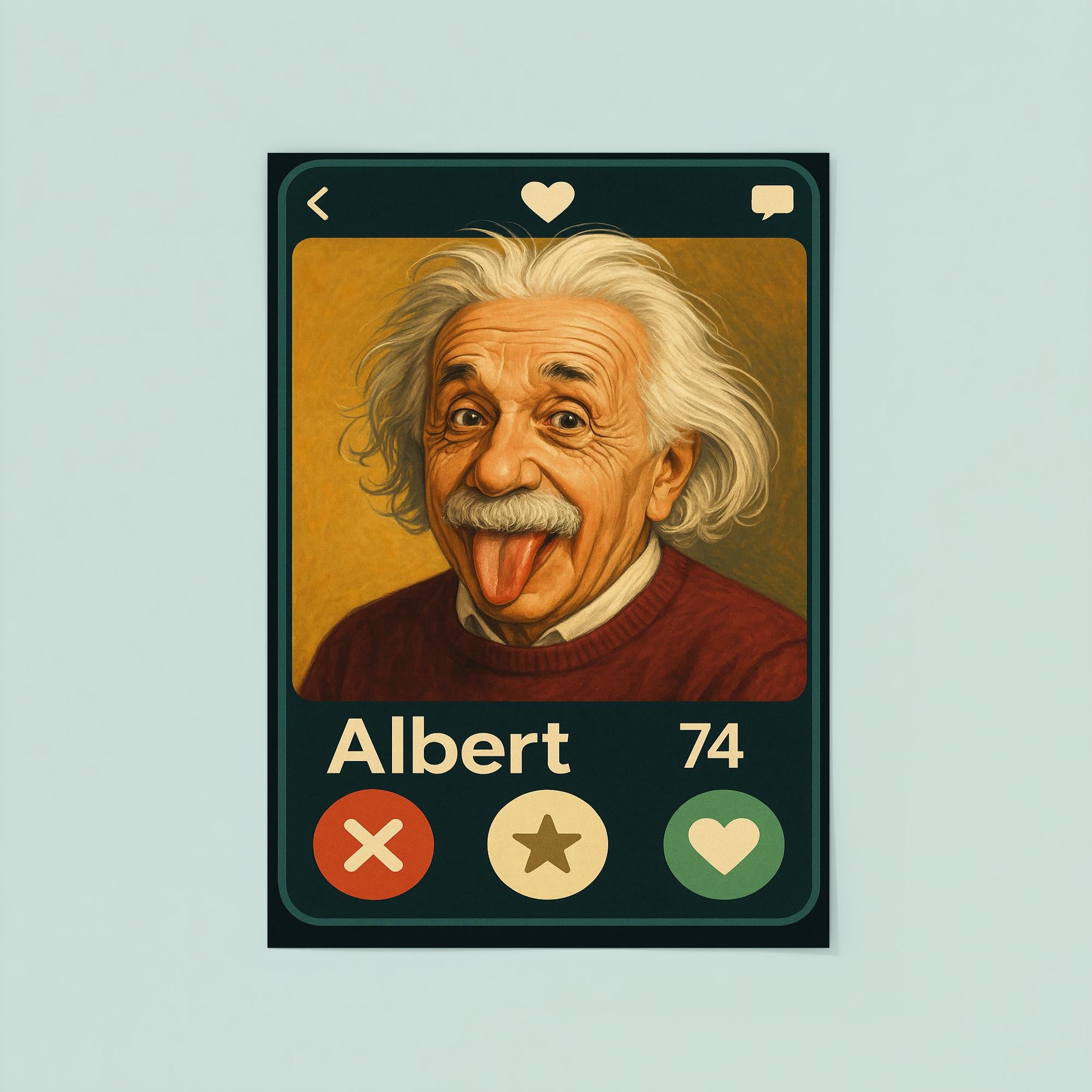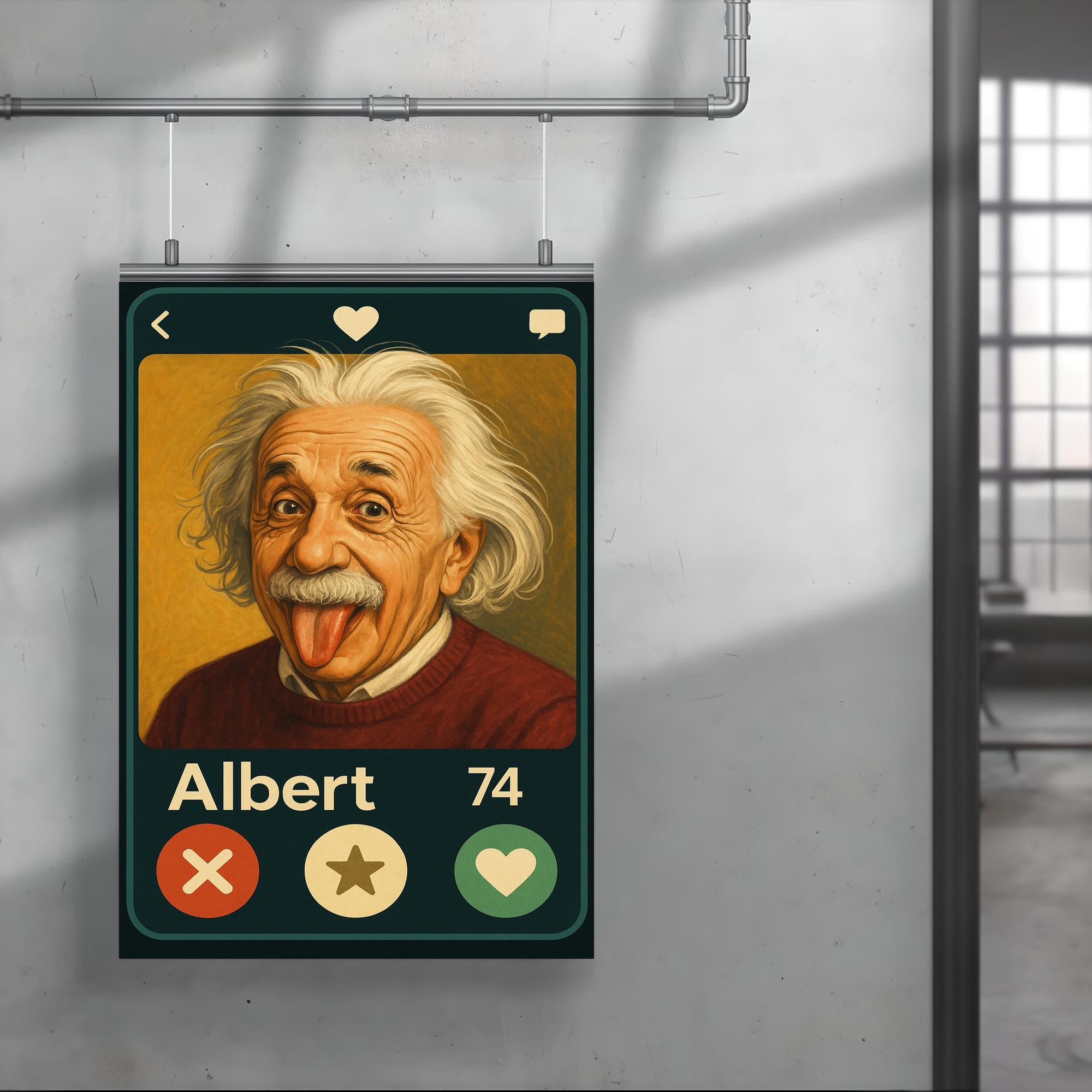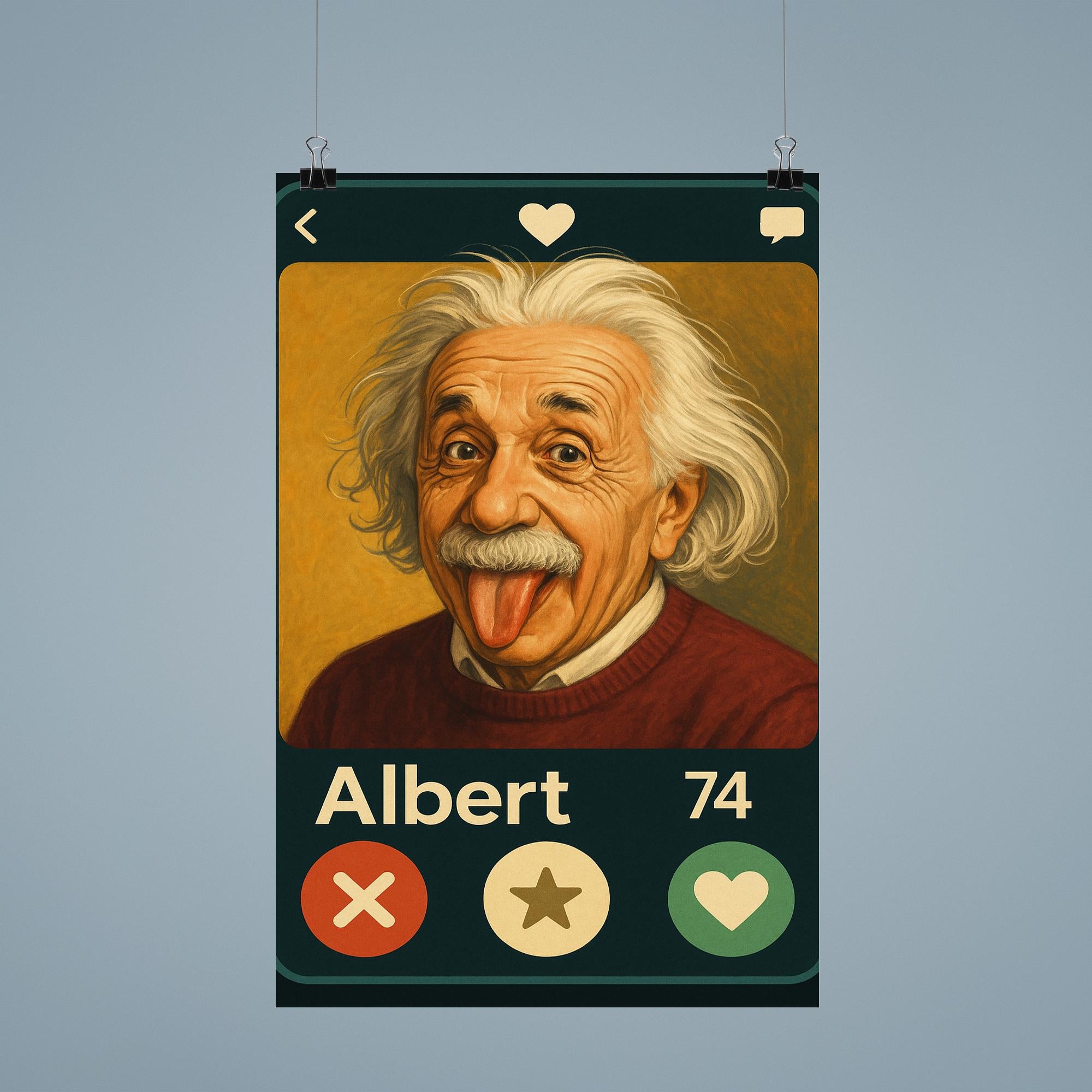 Add a spark of genius and humor to any space with this witty poster showcasing Albert Einstein’s playful take on a dating app profile. It’s the perfect blend of intellect and charm, offering a clever twist that’s sure to amuse science lovers and romantics alike. A conversation starter that celebrates curiosity, wit, and timeless appeal.