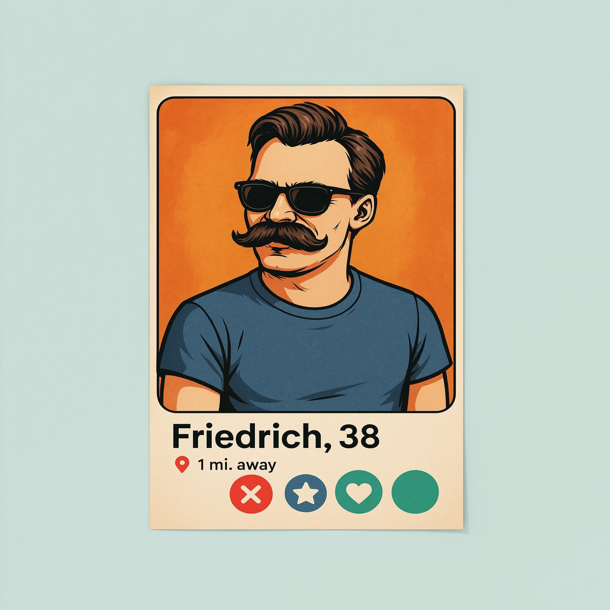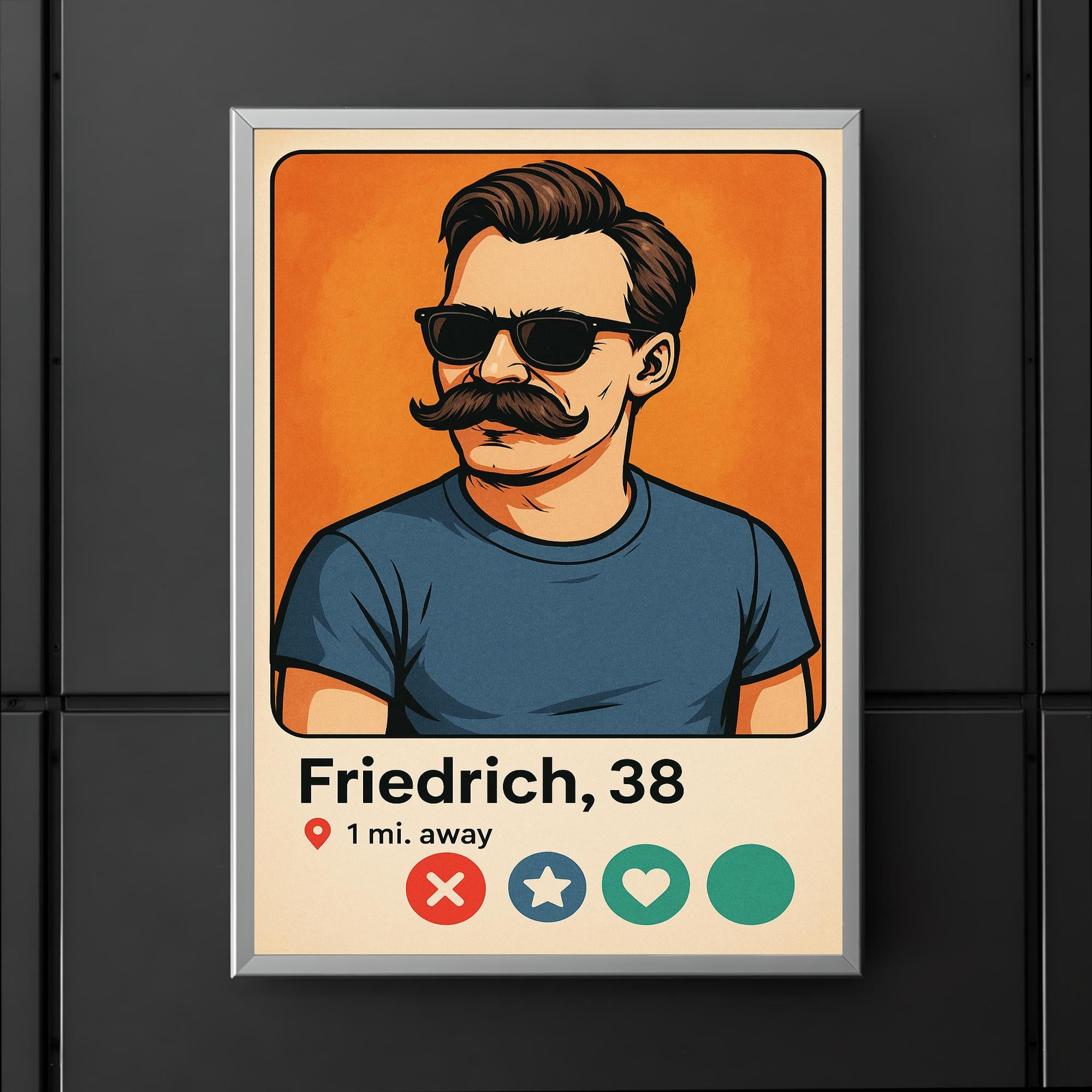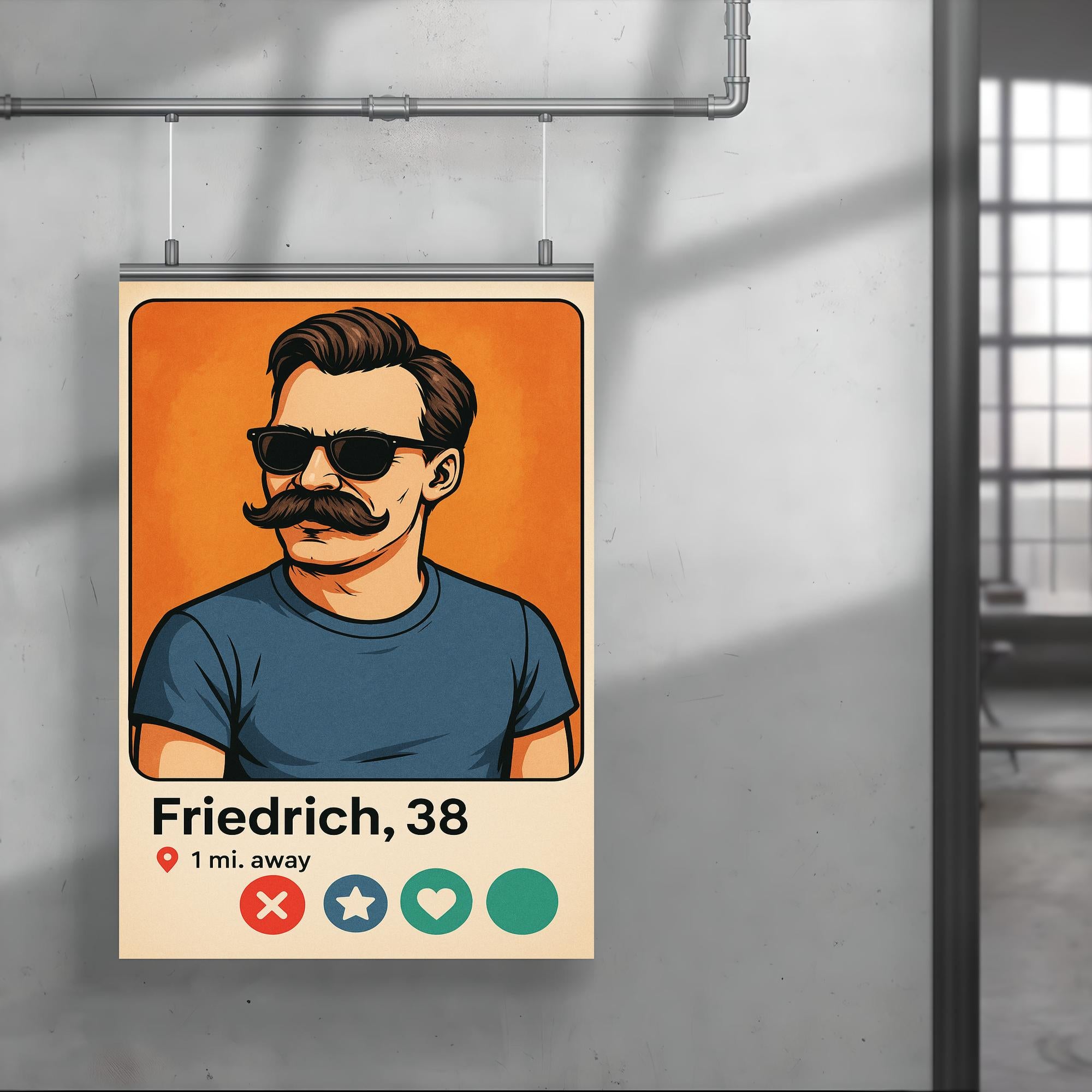 Bring a touch of wit and philosophy to your space with this hilarious poster featuring Friedrich Nietzsche's humorous dating app profile. Perfect for lovers of deep thought and clever humor alike, it’s a playful reminder that even the most profound minds can appreciate a good laugh. Add a unique conversation starter to your wall that blends intellect with irony.