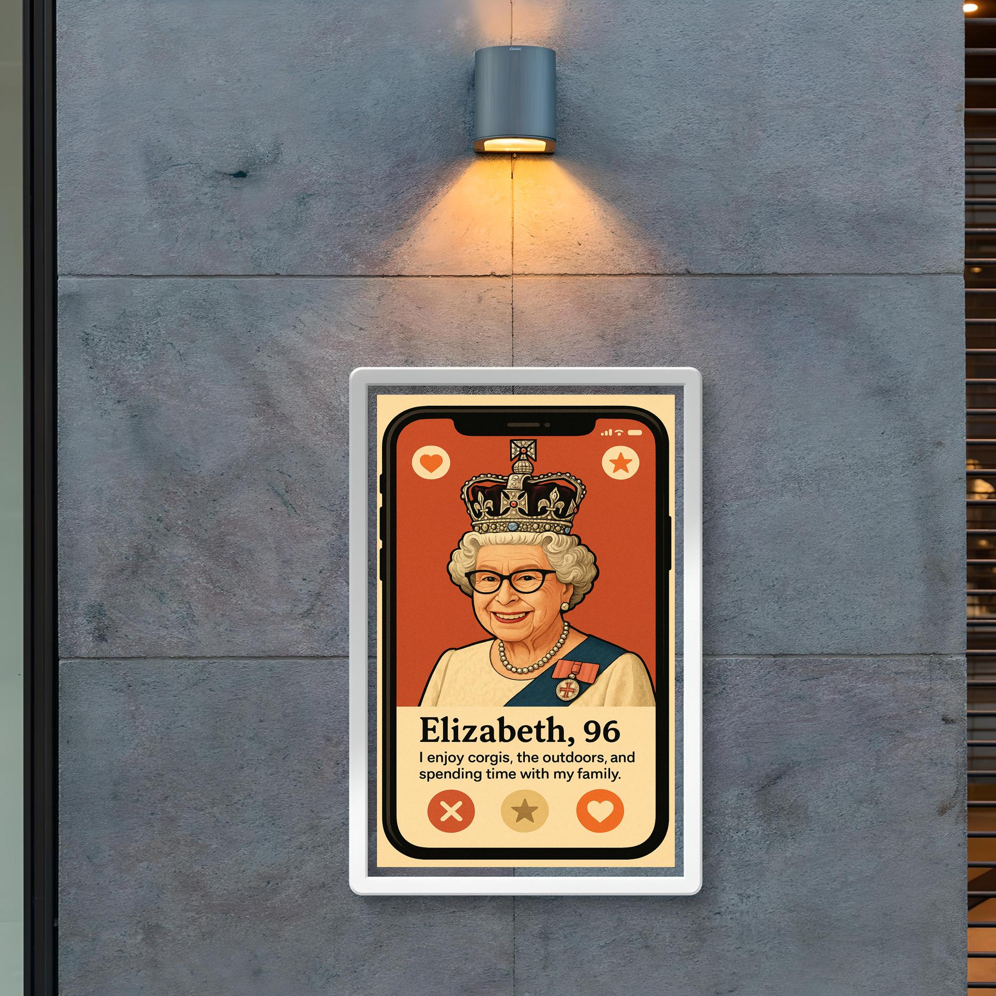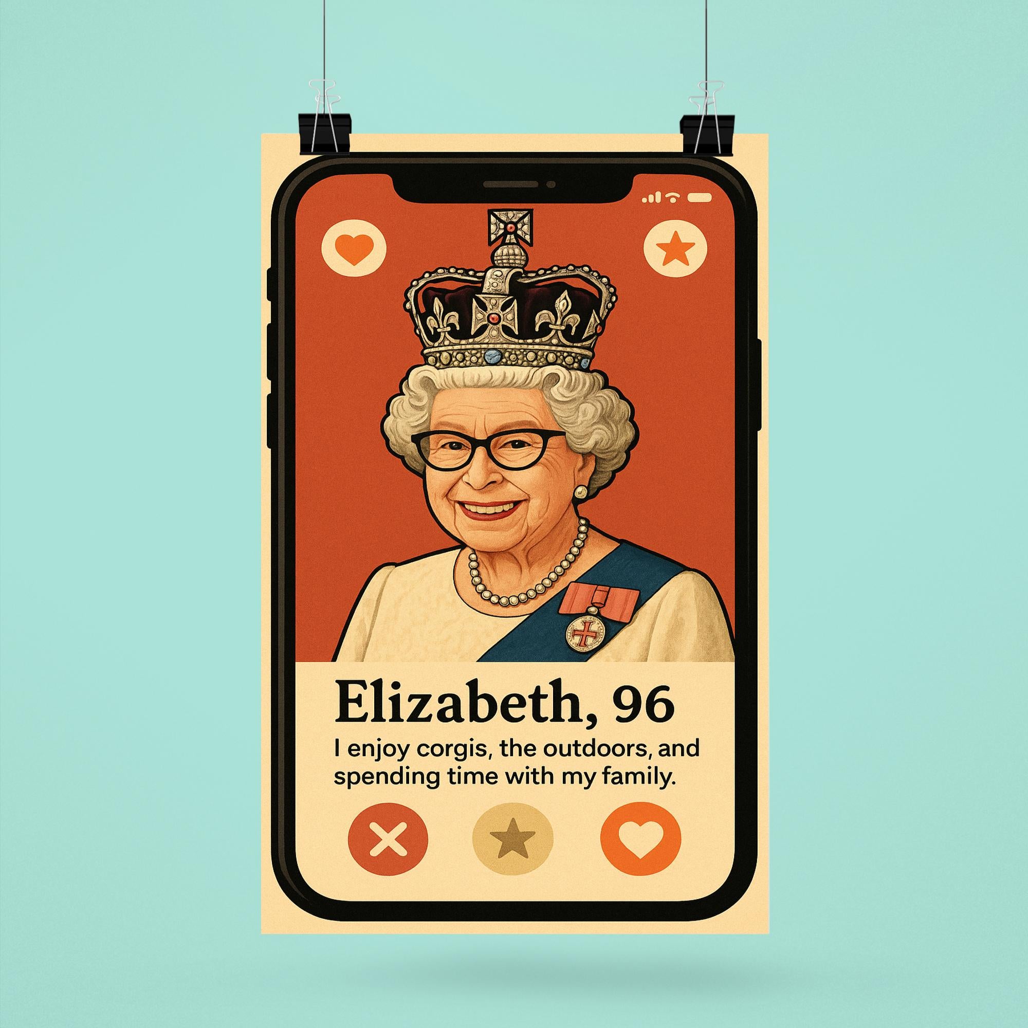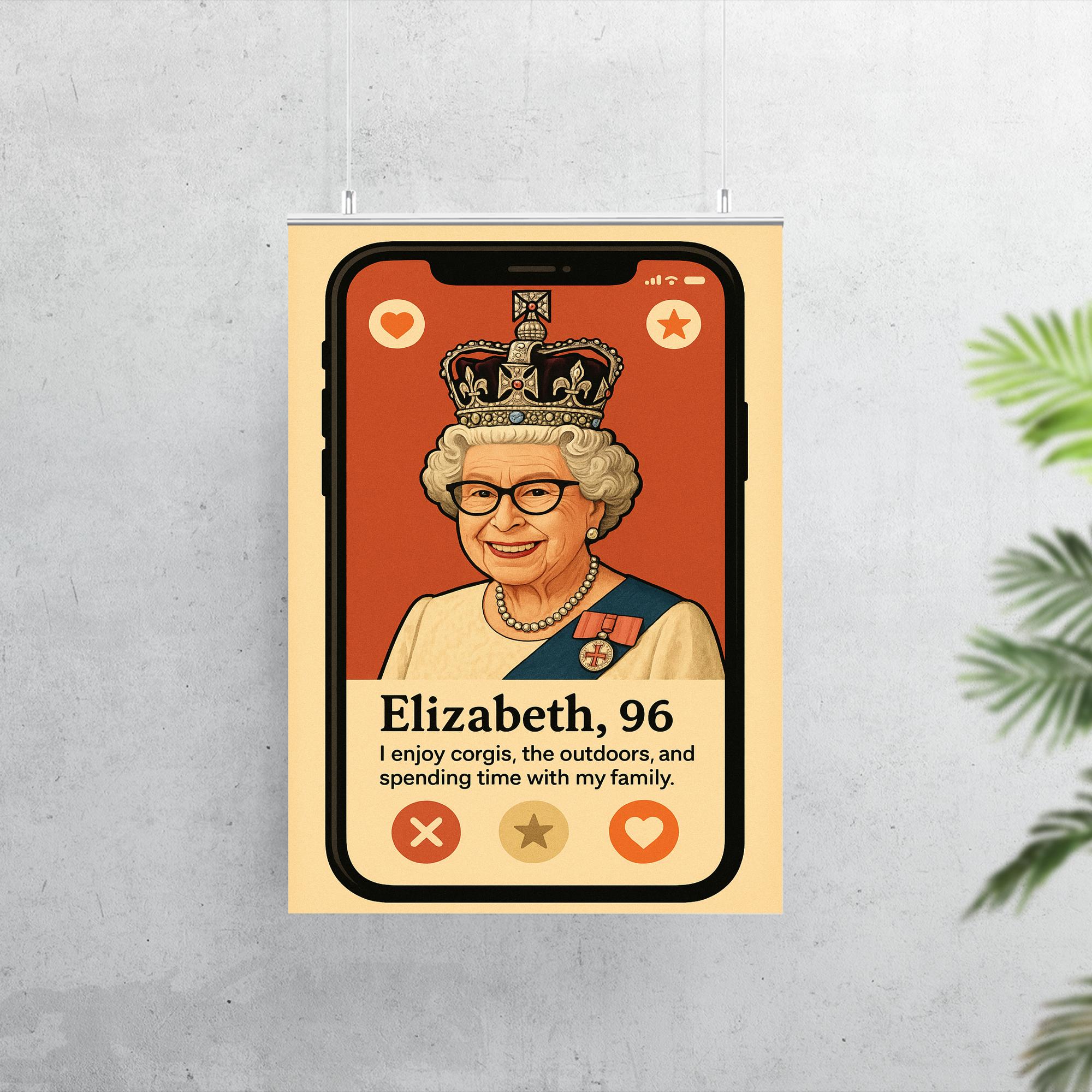Add a playful twist to your space with this hilarious poster featuring Queen Elizabeth’s dating app profile—an unexpected blend of regal charm and modern wit. Perfect for sparking smiles and starting conversations, it’s a clever homage to one of history’s most iconic figures in the most delightfully cheeky way.
