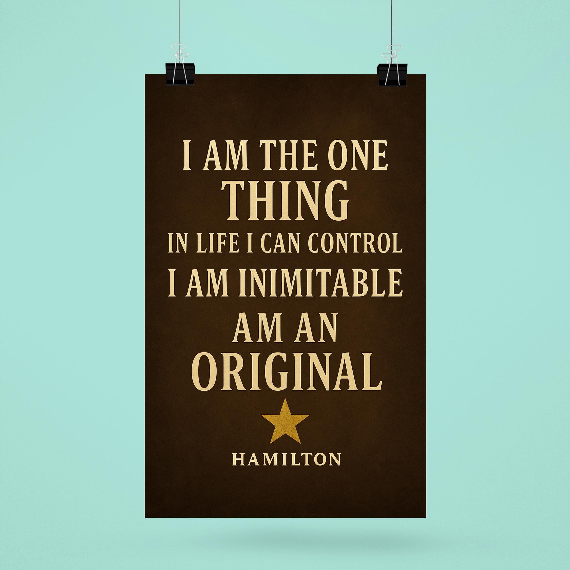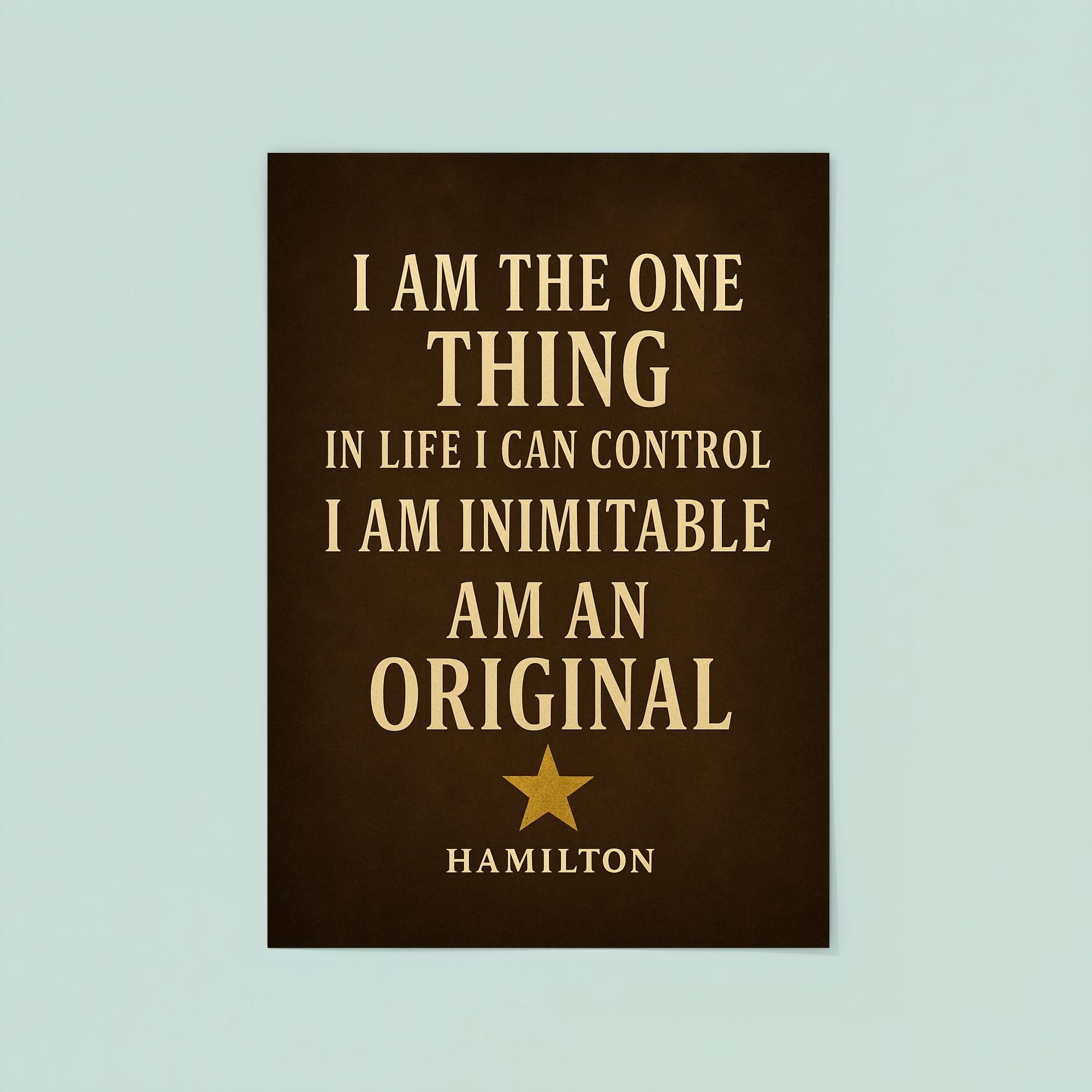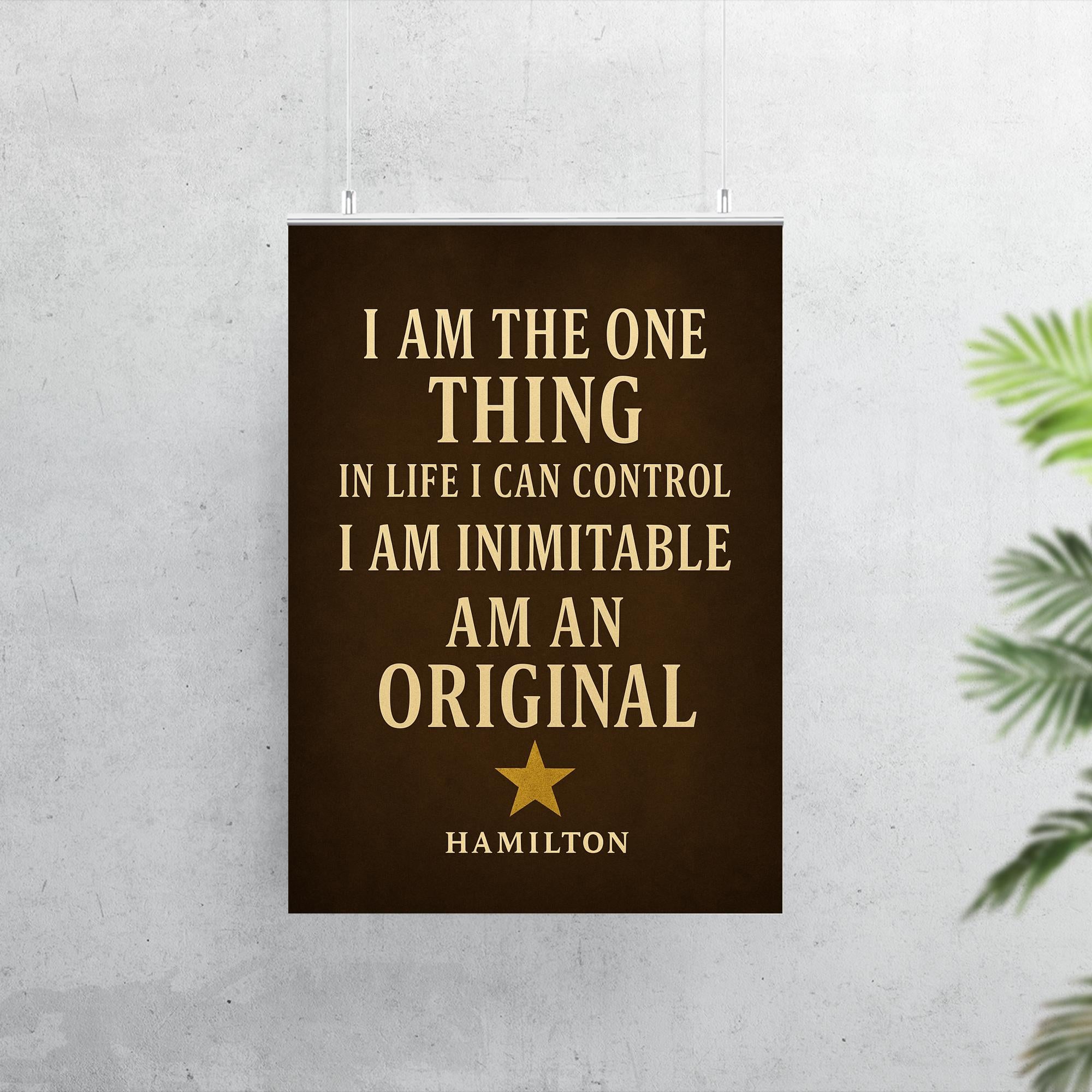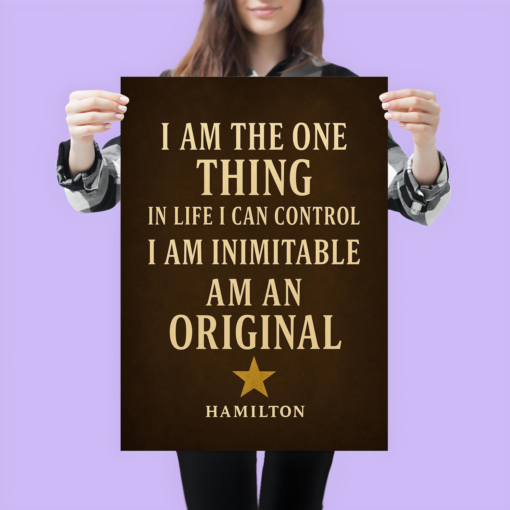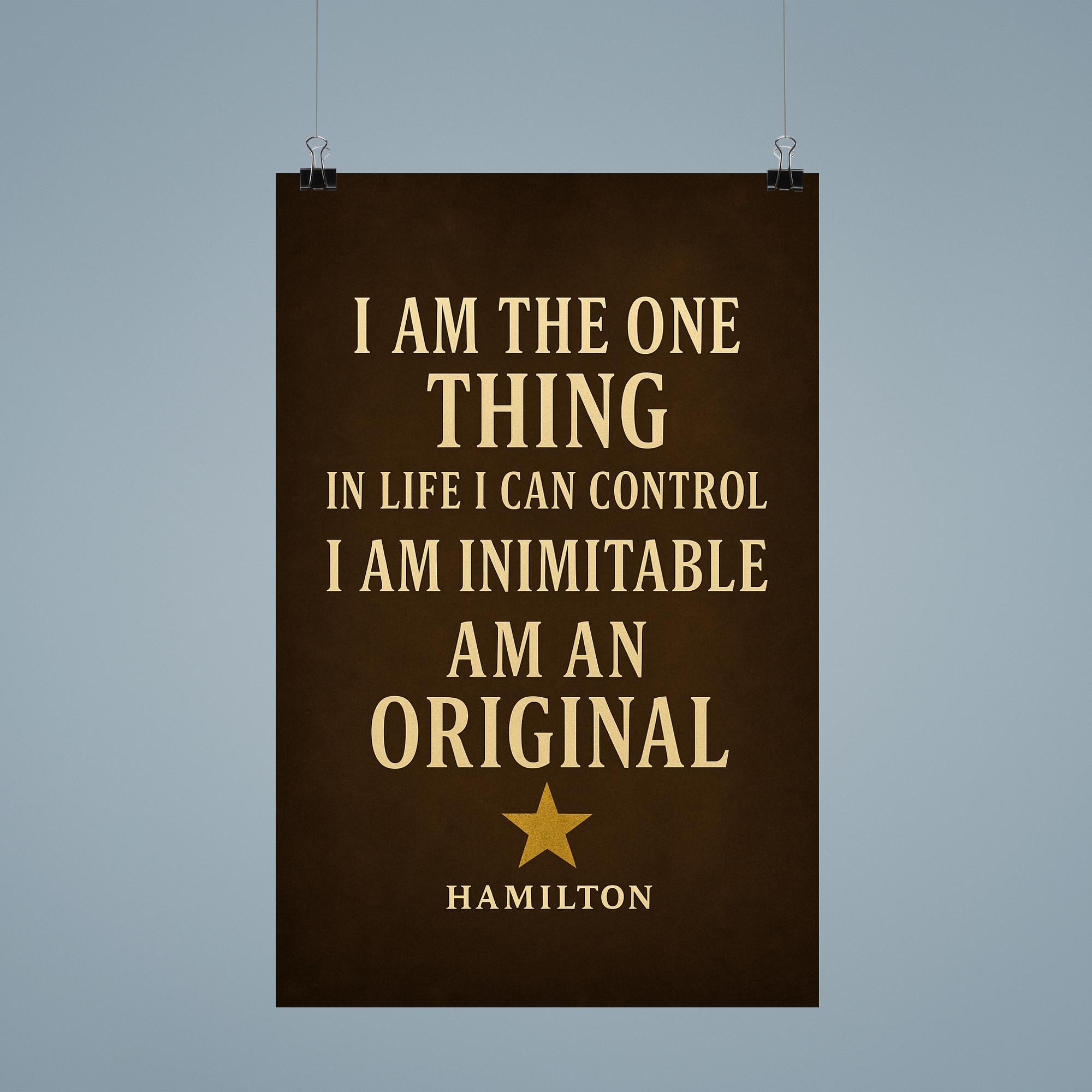 Empower your space with the bold declaration of self-mastery and originality from Hamilton: "I am the one thing in life I can control. I am inimitable. I am an original." This striking poster captures the spirit of confidence and individuality, inspiring you every day to own your uniqueness and take charge of your destiny. Perfect for anyone ready to embrace their power and stand apart from the crowd.