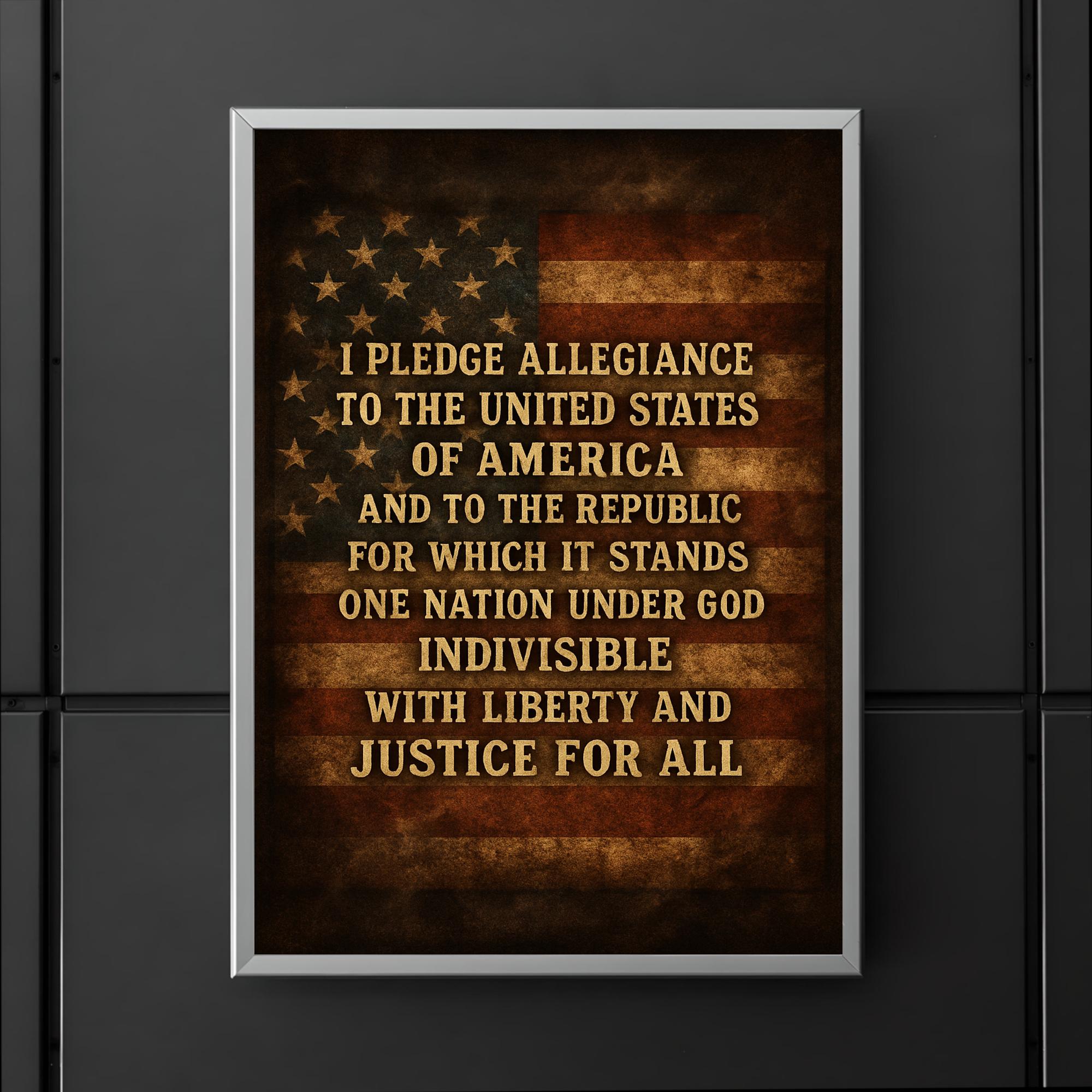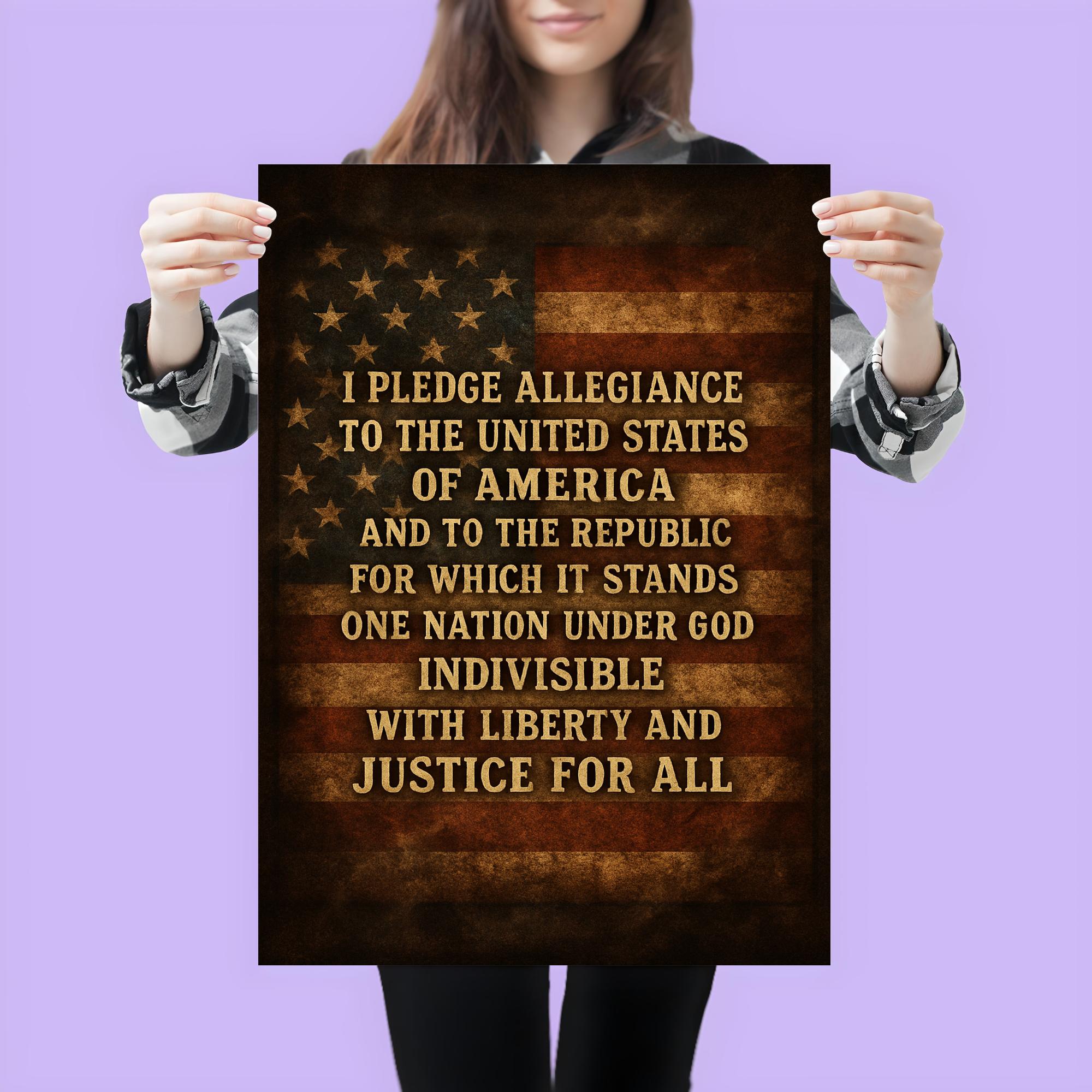 Declare your devotion with this powerful "I Pledge Allegiance to the United States of America" poster. Perfect for classrooms, offices, or patriotic spaces, it serves as a daily reminder of unity, pride, and commitment to the values that bind a nation together. Elevate your space with a timeless declaration that speaks straight to the heart.