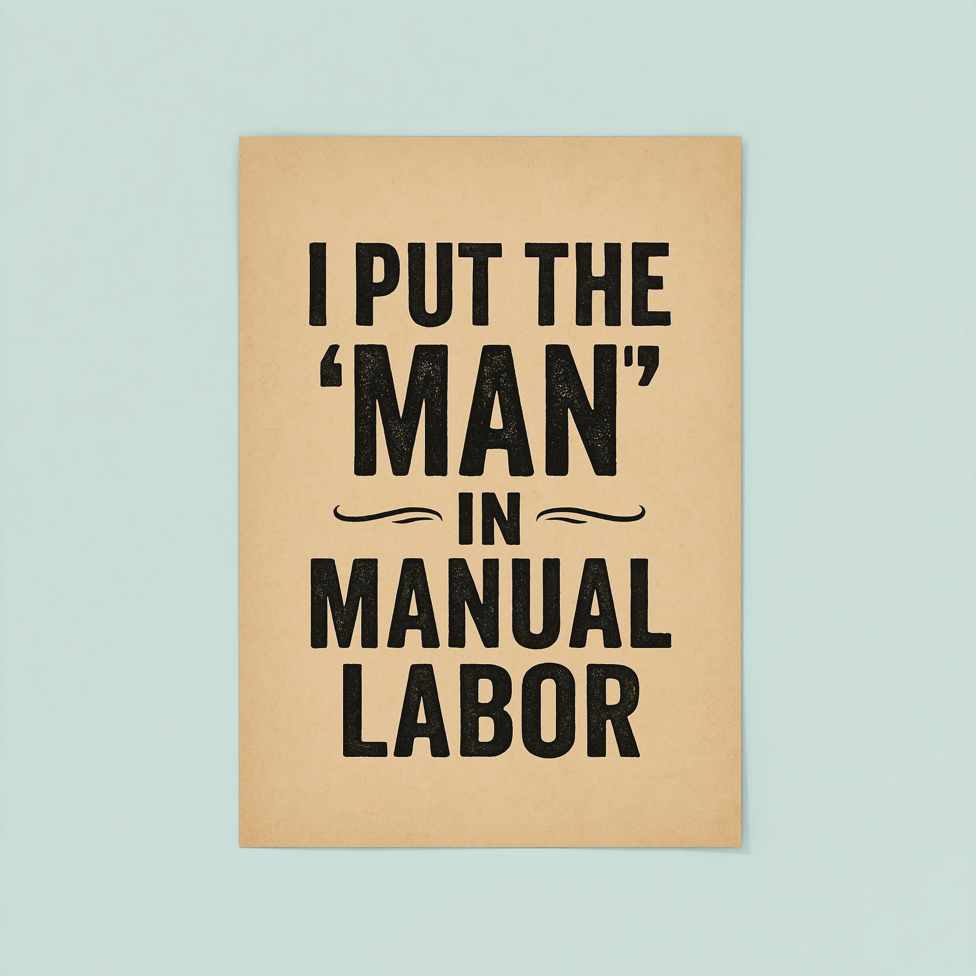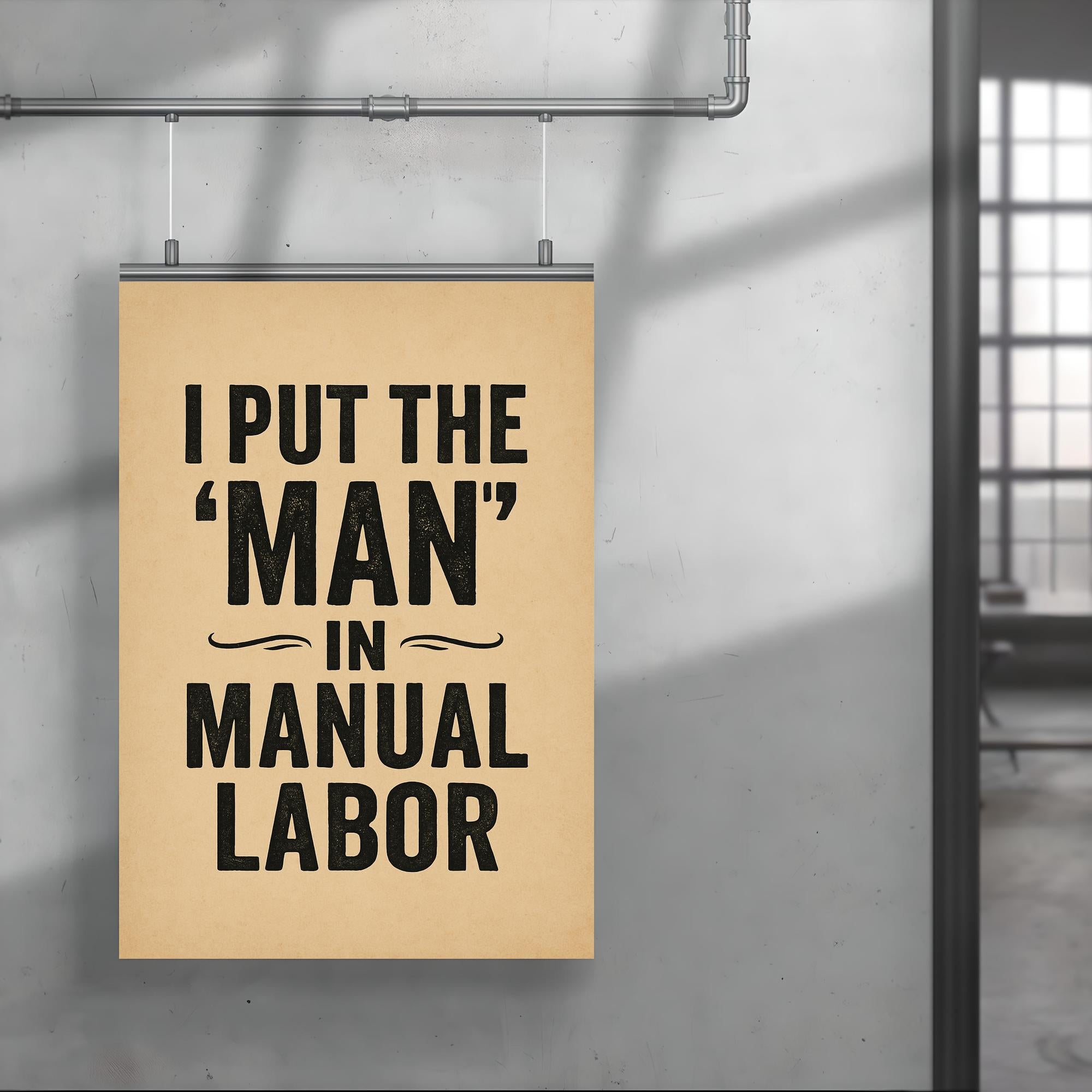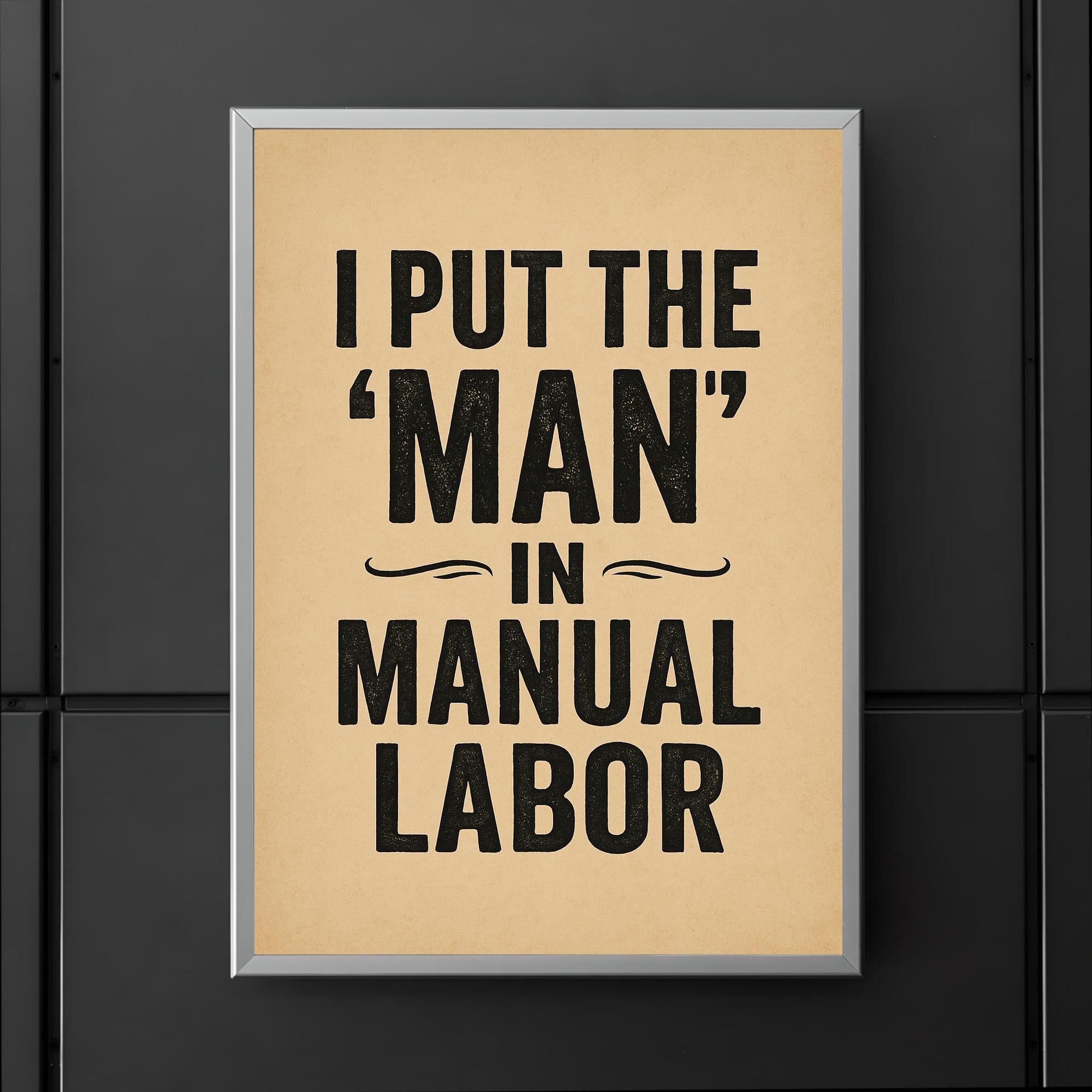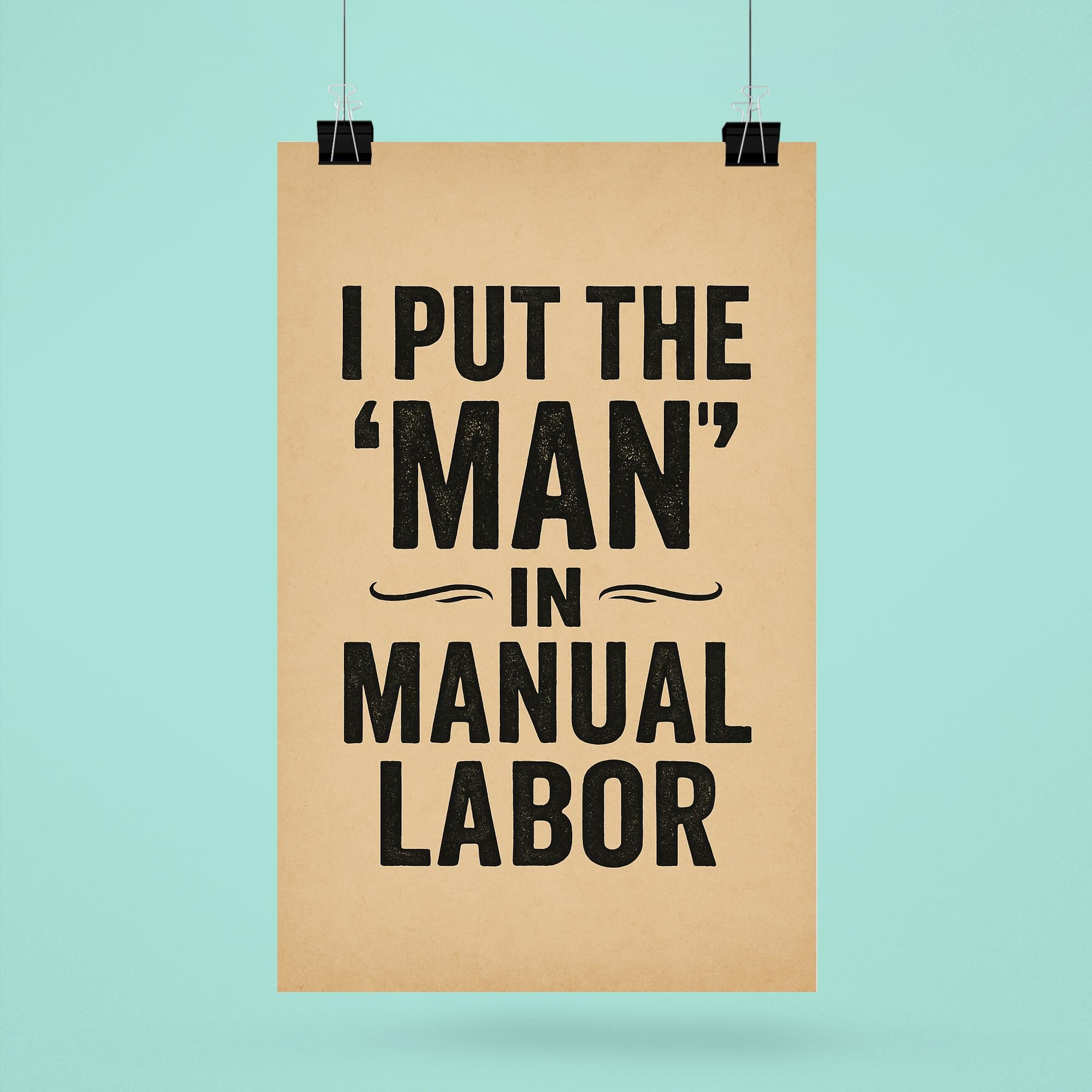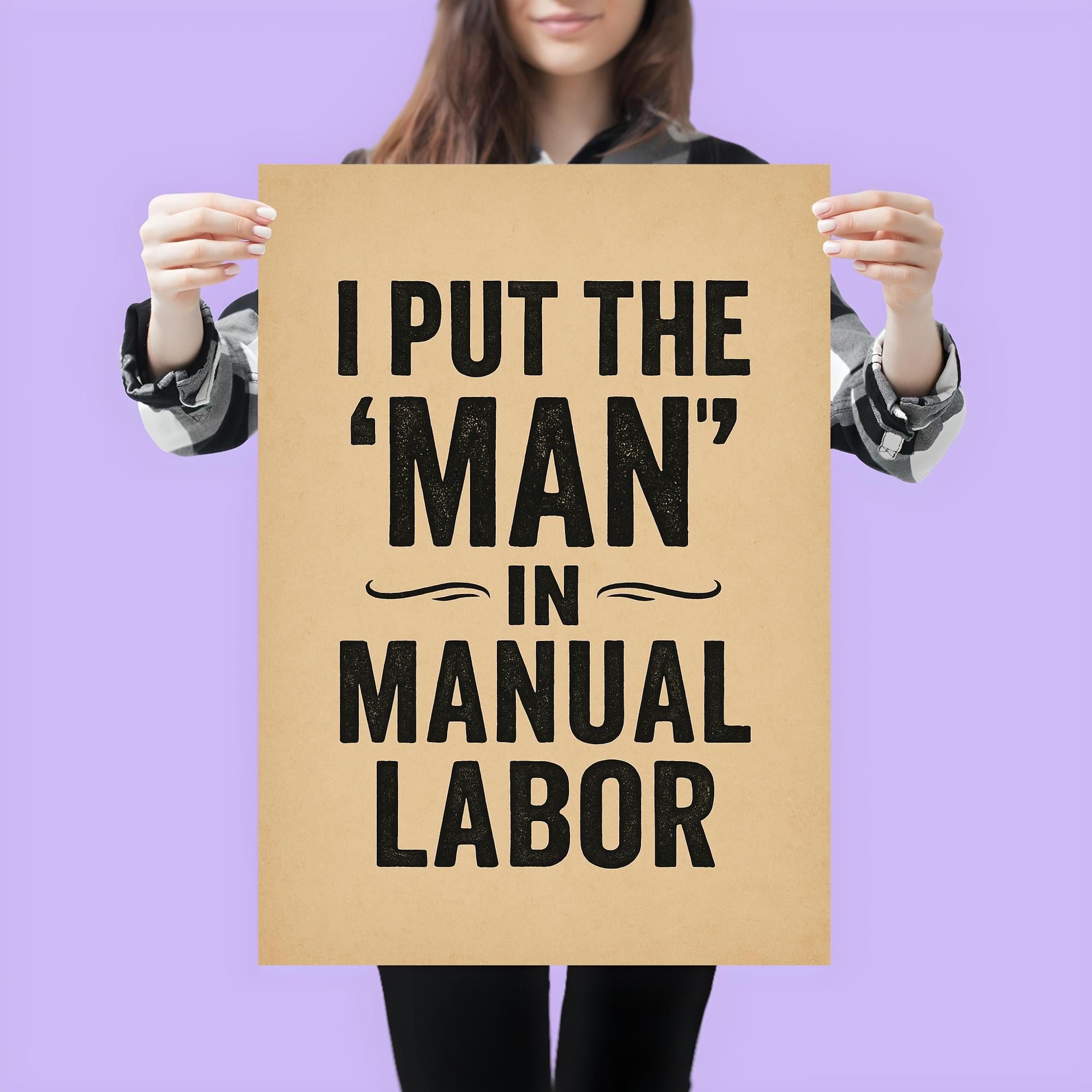 Make a statement with attitude: This "I put the man in manual labor" poster celebrates hard work, grit, and undeniable confidence. Perfect for anyone who takes pride in rolling up their sleeves and getting the job done, it’s a bold reminder that real results come from real effort. Hang it wherever determination and drive deserve to be noticed.