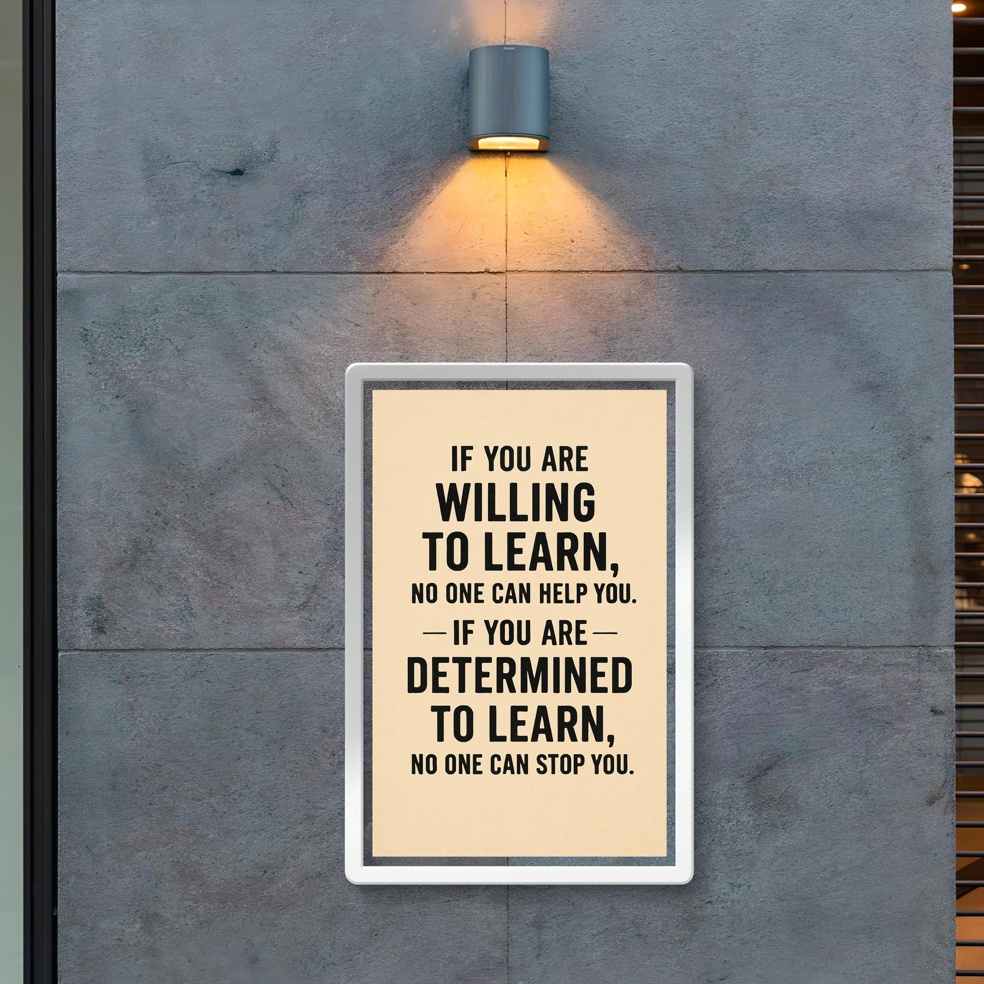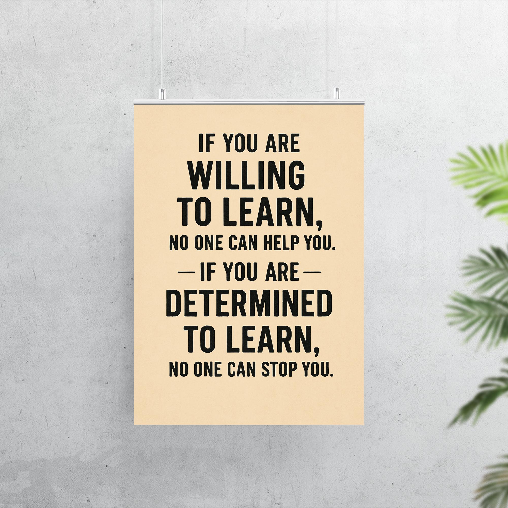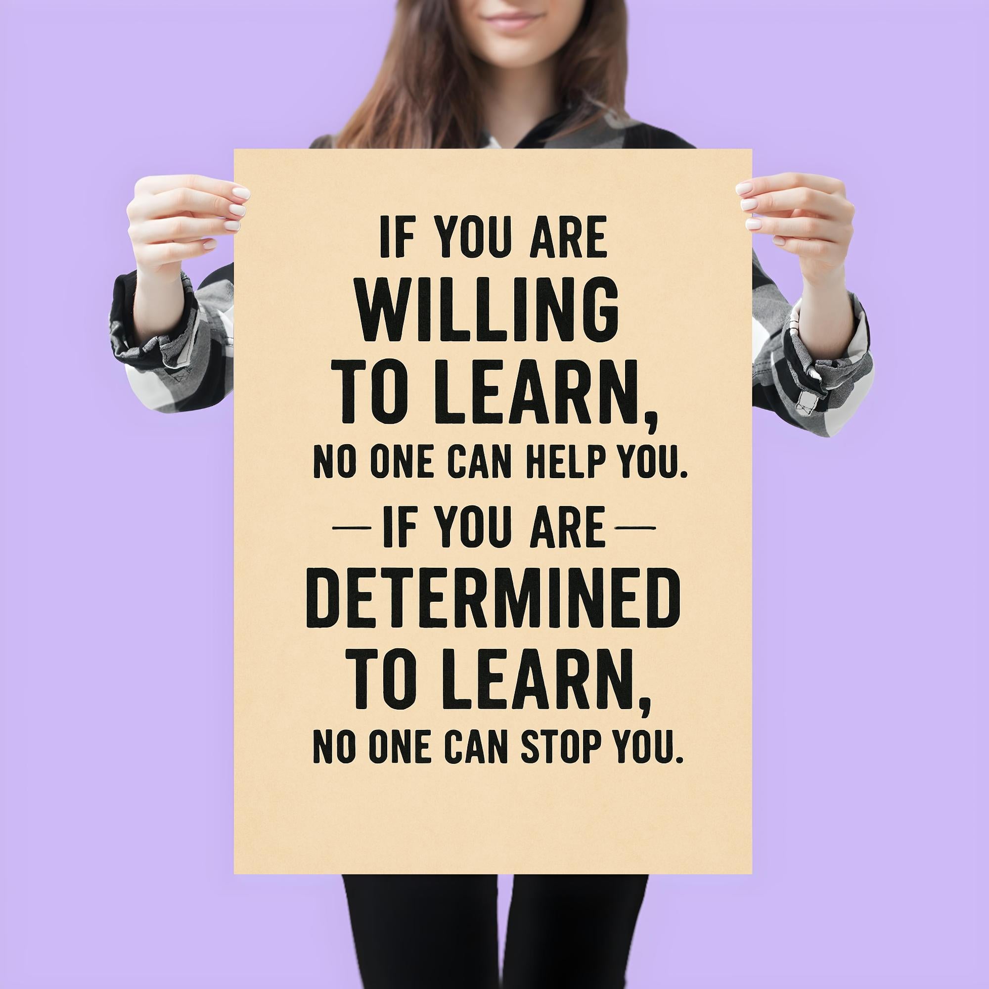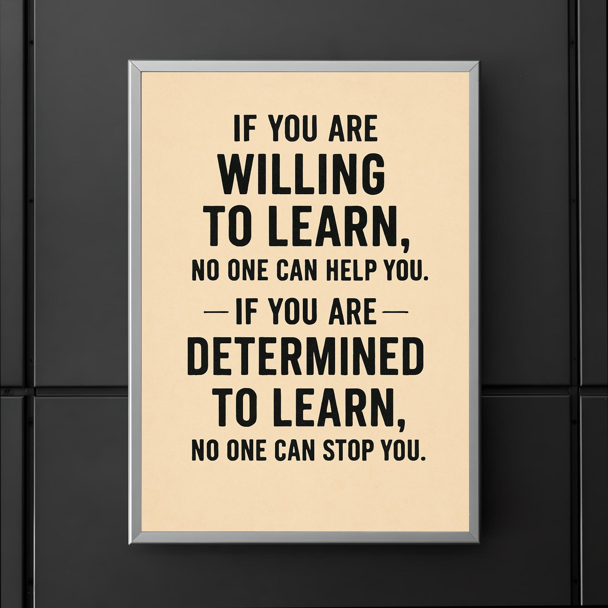 Fuel your ambition every day with this powerful reminder: "If you are not willing to learn, no one can help you. If you are determined to learn, no one can stop you." Perfect for inspiring focus and perseverance, this poster transforms any space into a motivational hub where growth and determination take center stage.