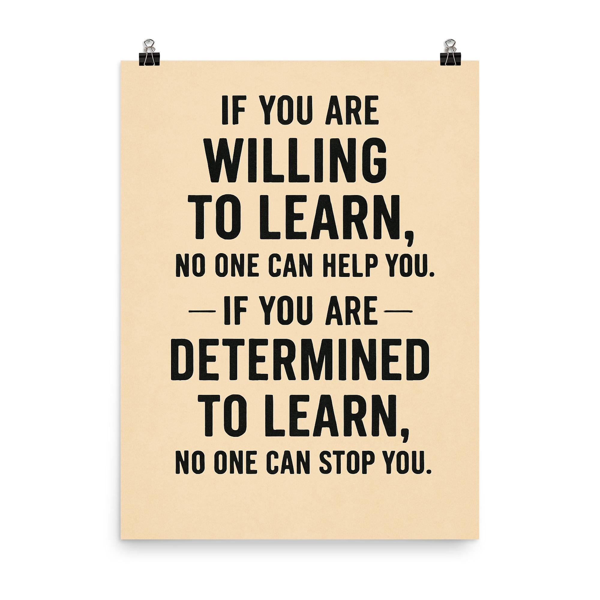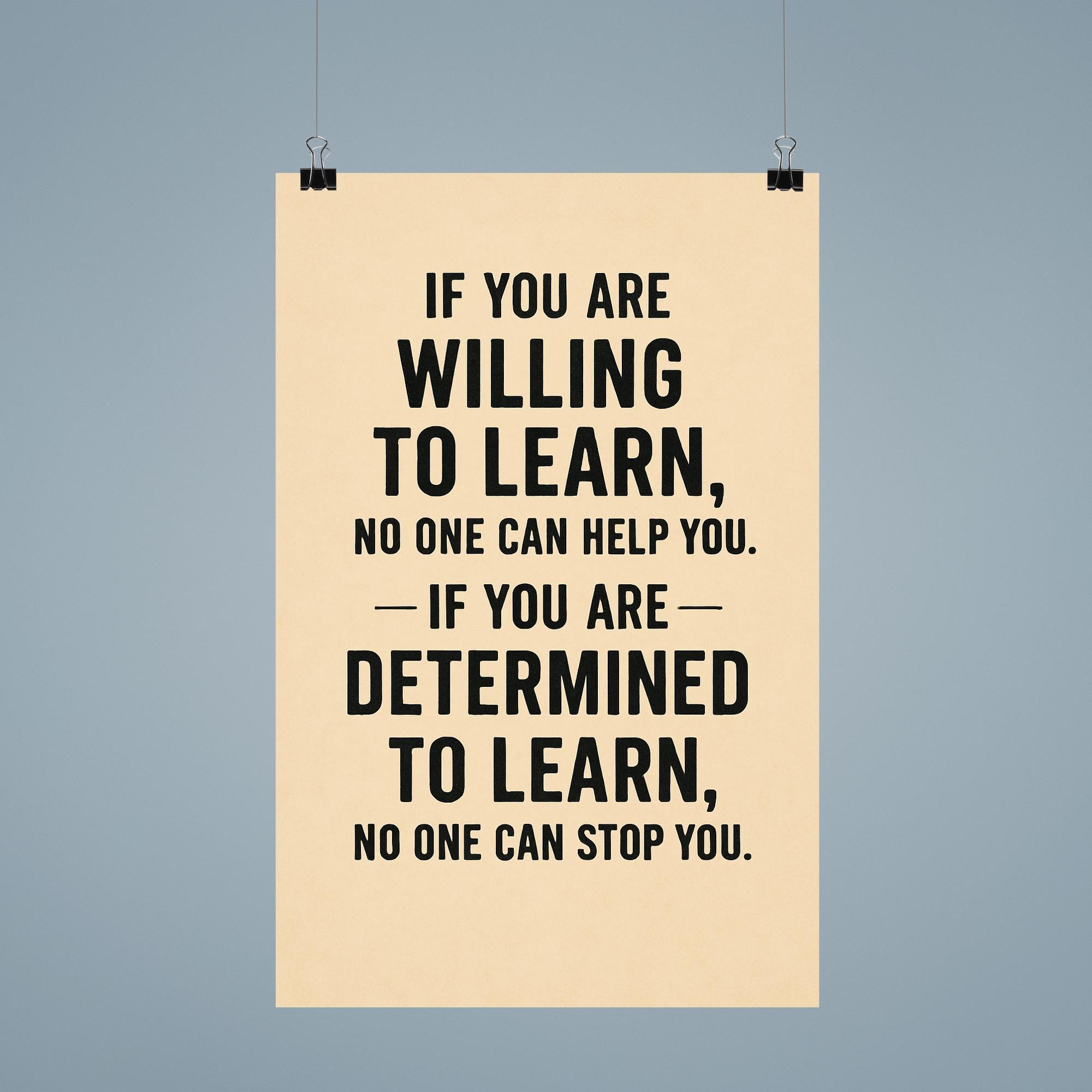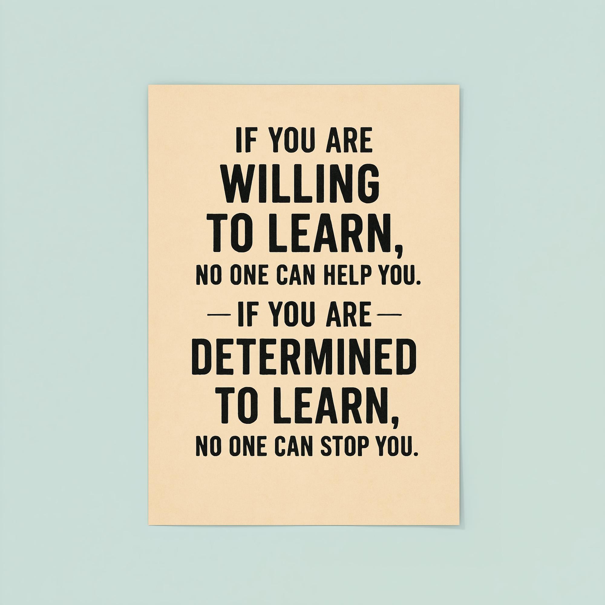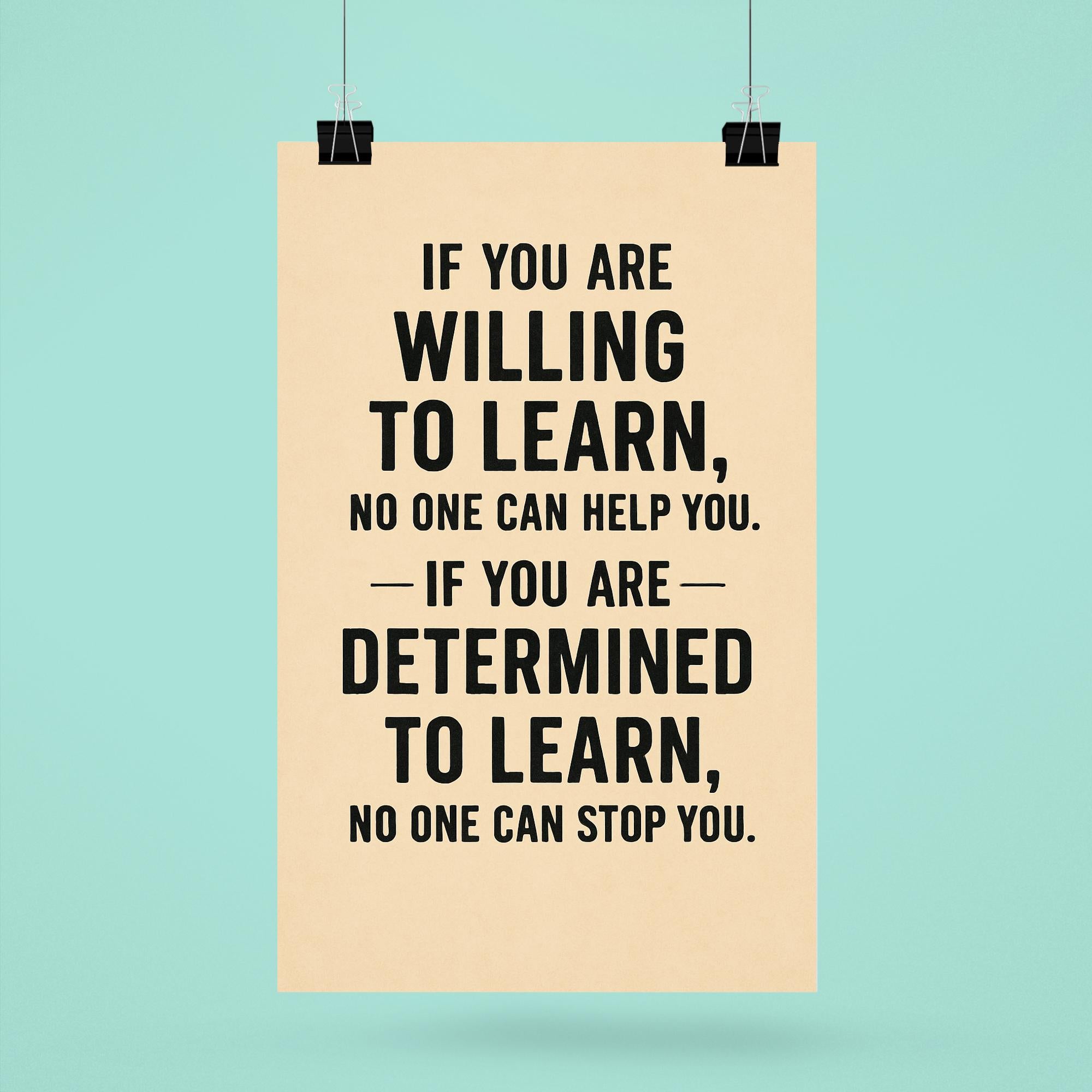 Fuel your ambition every day with this powerful reminder: "If you are not willing to learn, no one can help you. If you are determined to learn, no one can stop you." Perfect for inspiring focus and perseverance, this poster transforms any space into a motivational hub where growth and determination take center stage.