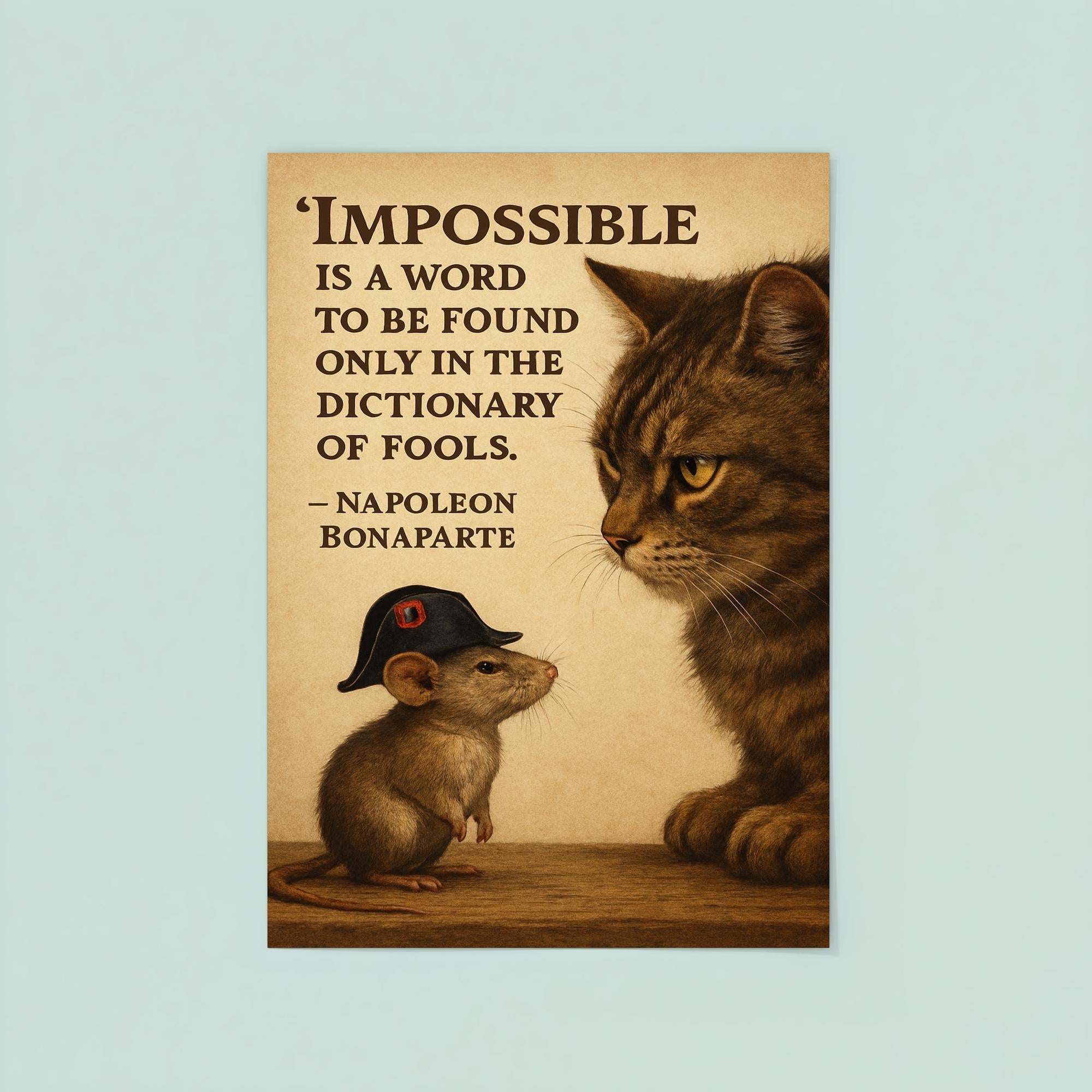 Ignite your motivation with this charming poster featuring the timeless Napoleon Bonaparte quote, "Impossible is a word." Perfectly paired with a clever mouse donning a tiny Napoleon hat, it’s a playful reminder that determination knows no limits. Ideal for any space that needs a boost of inspiration and a touch of whimsy.