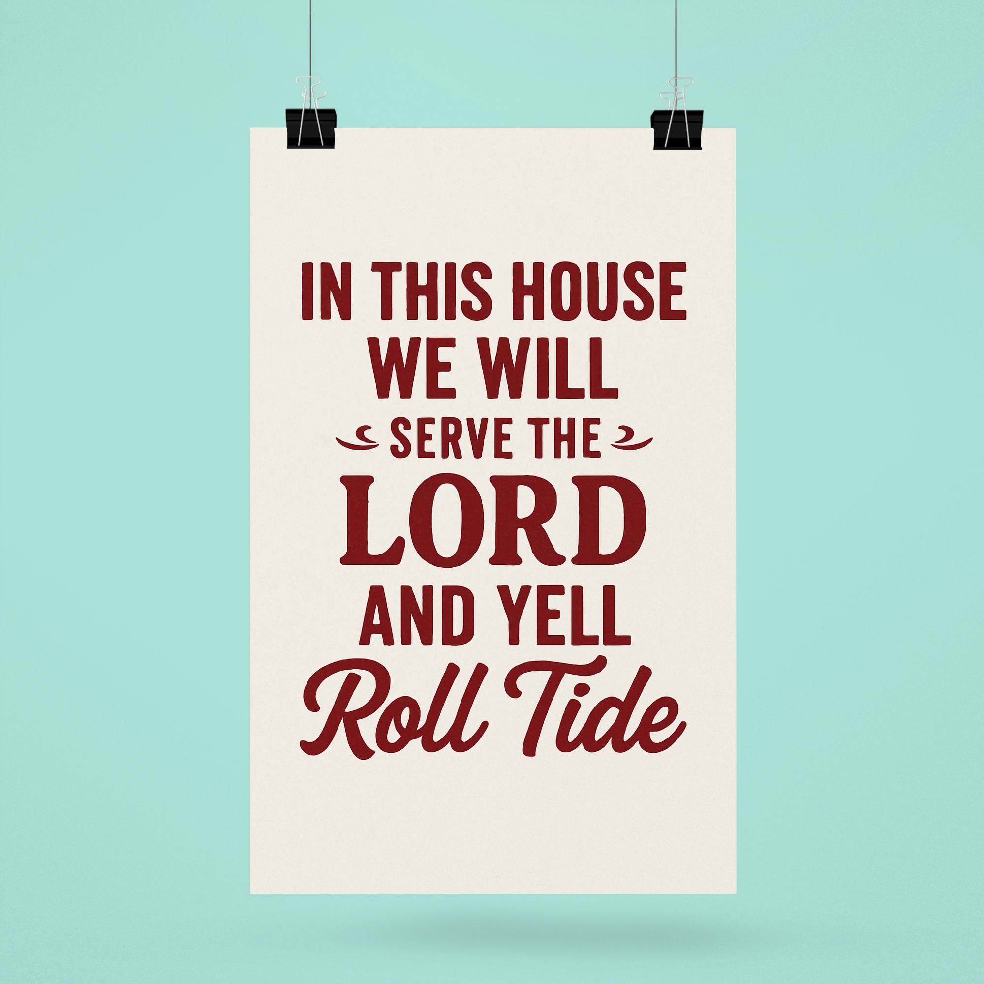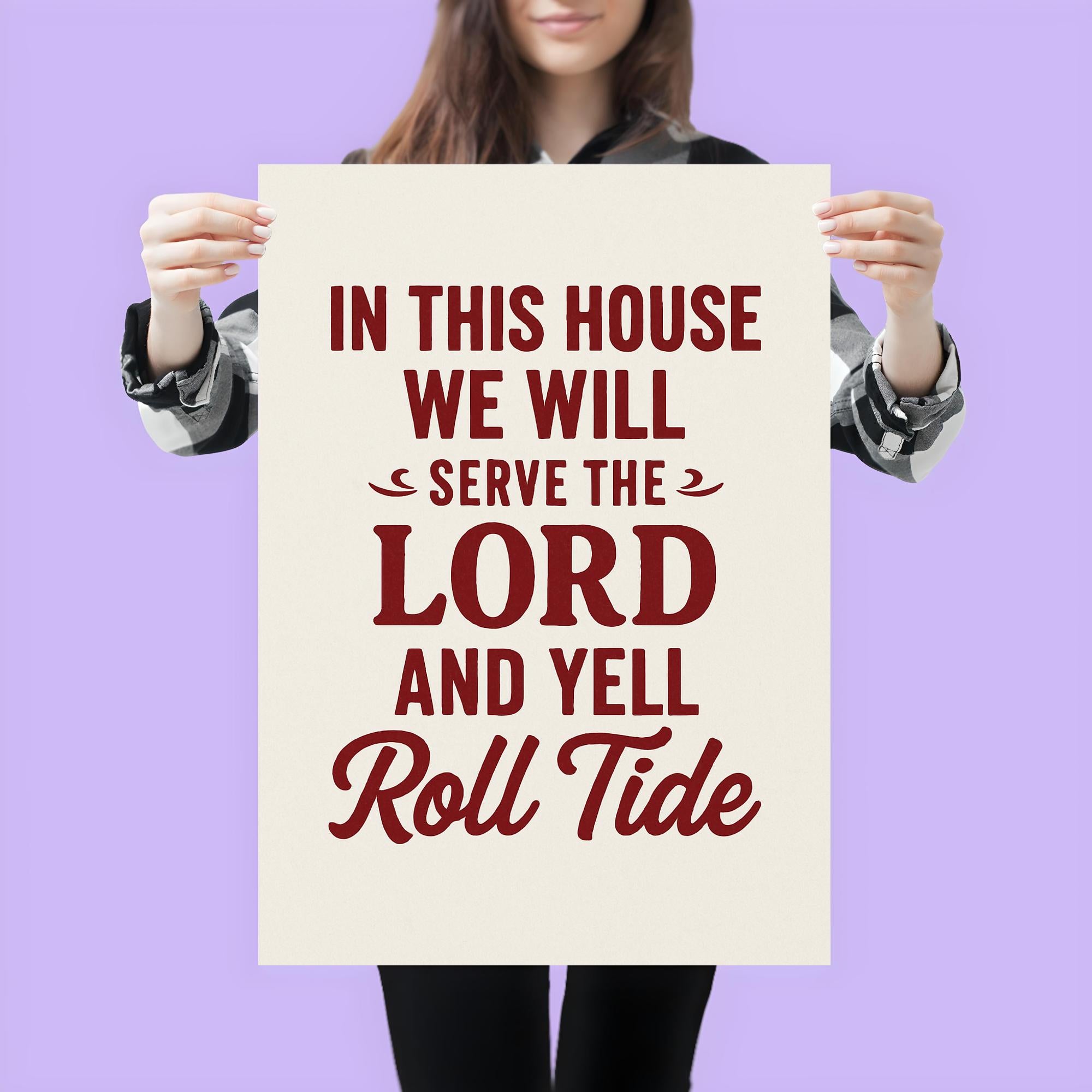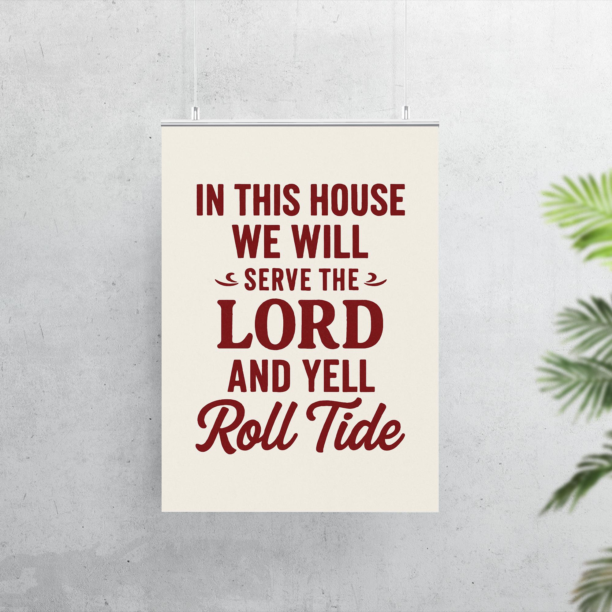 Celebrate faith and fierce fandom with this inspiring poster that proudly declares, "In this house we will serve the Lord and yell Roll Tide." Perfect for any devoted home, it’s a bold way to showcase your commitment to both your beliefs and your beloved team. Let your walls speak volumes about what truly matters to you every day.