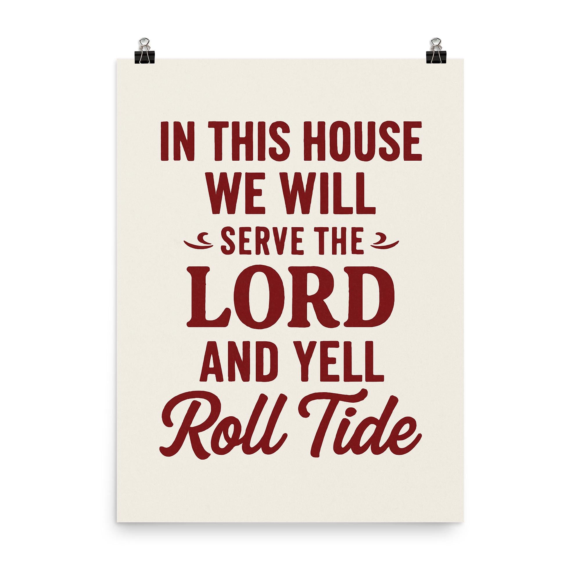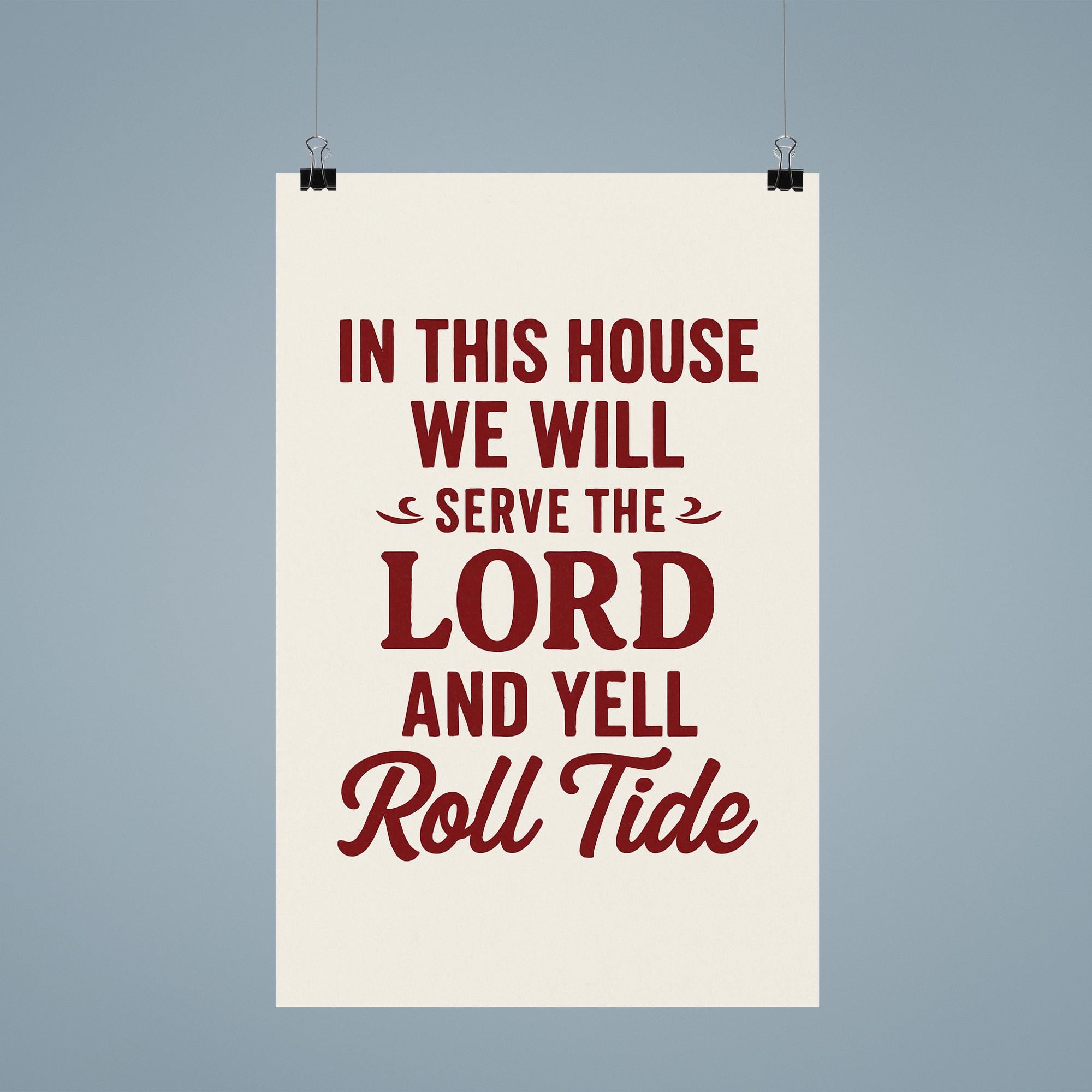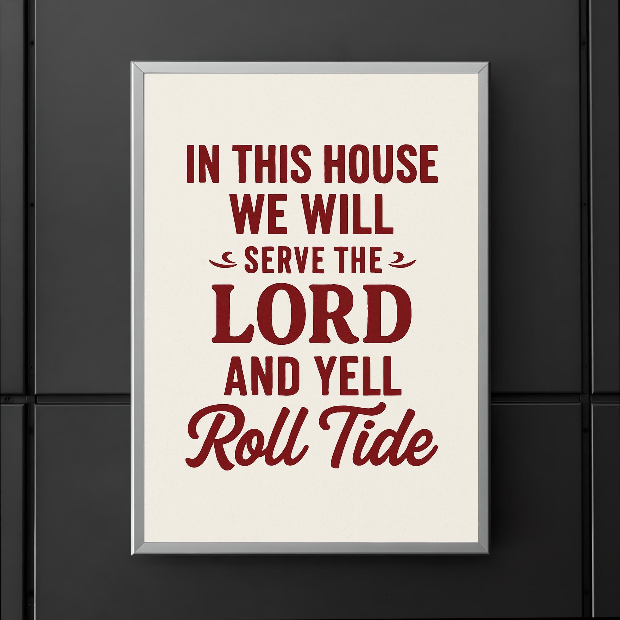 Celebrate faith and fierce fandom with this inspiring poster that proudly declares, "In this house we will serve the Lord and yell Roll Tide." Perfect for any devoted home, it’s a bold way to showcase your commitment to both your beliefs and your beloved team. Let your walls speak volumes about what truly matters to you every day.