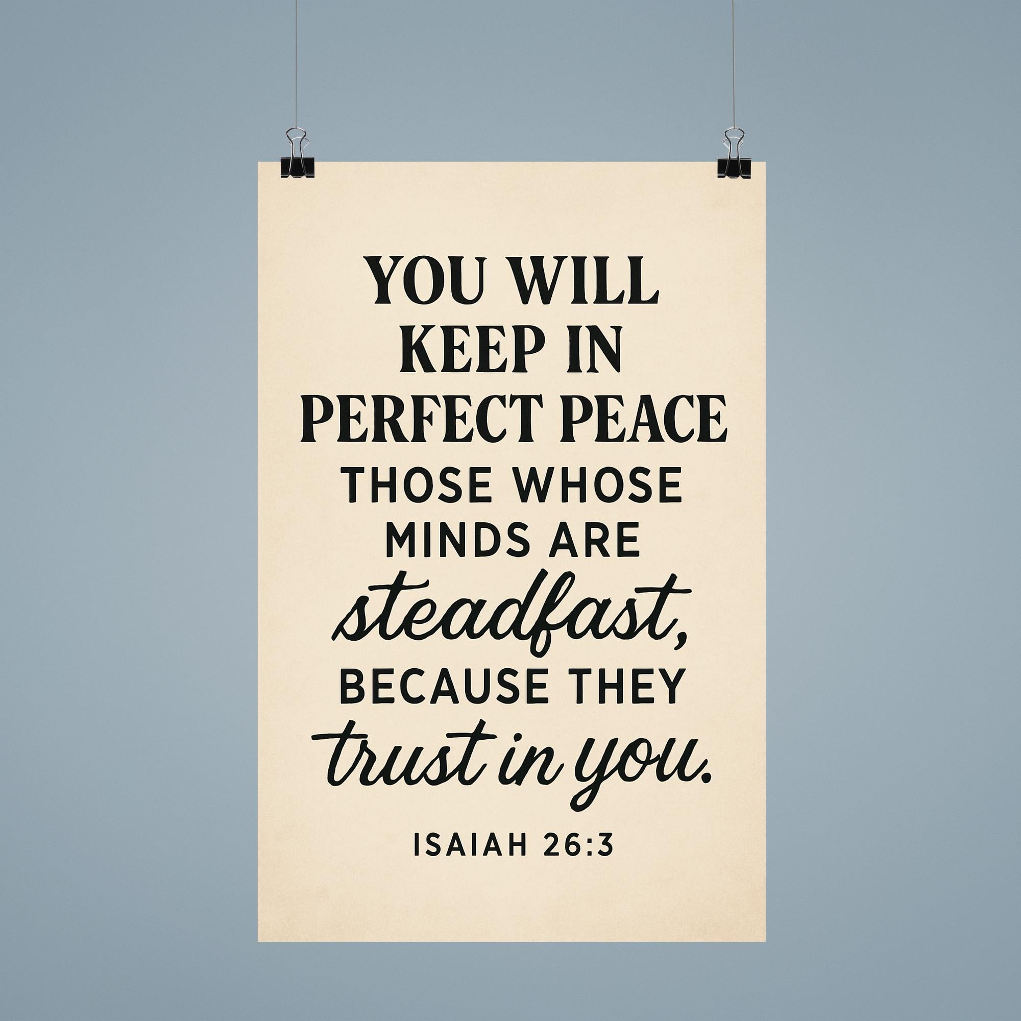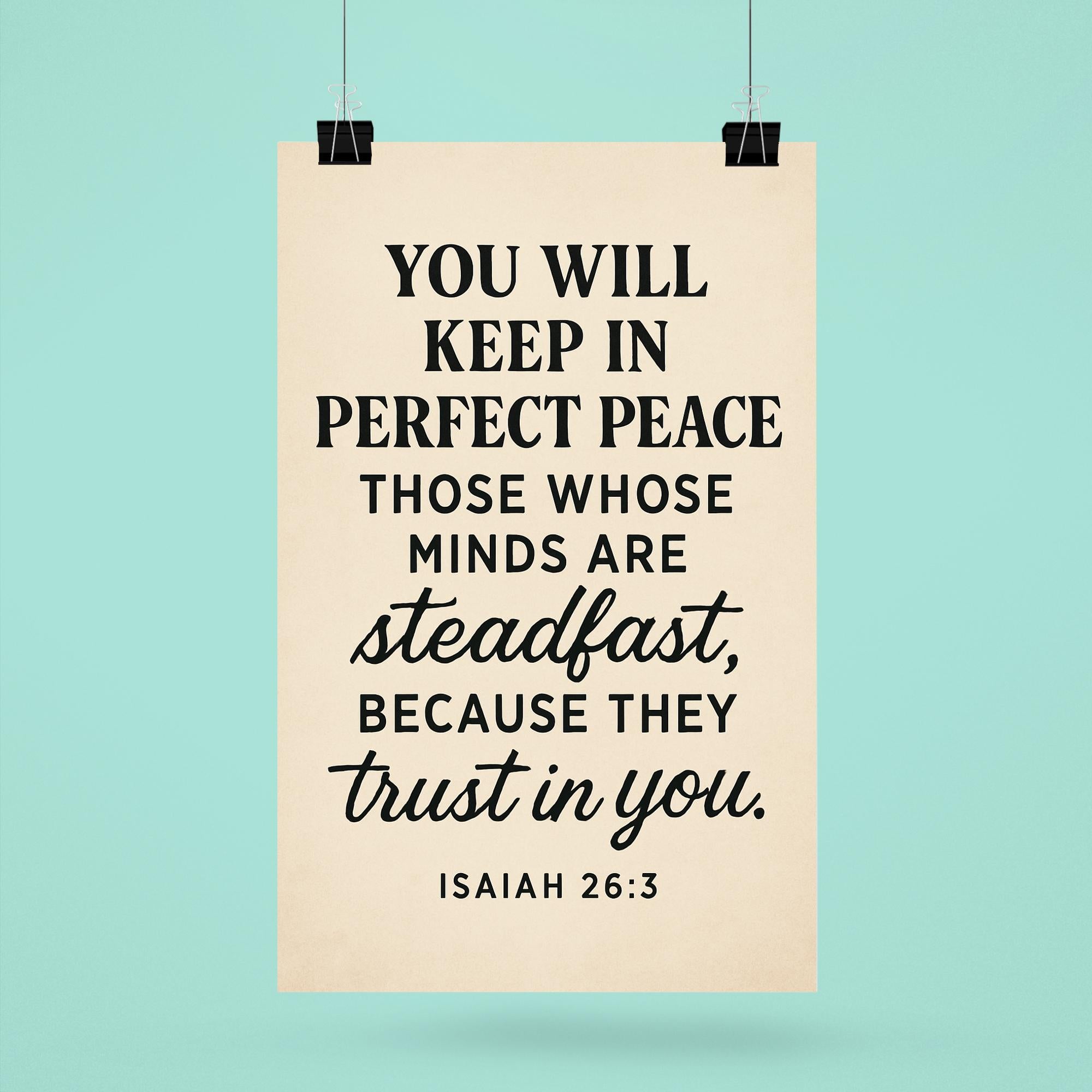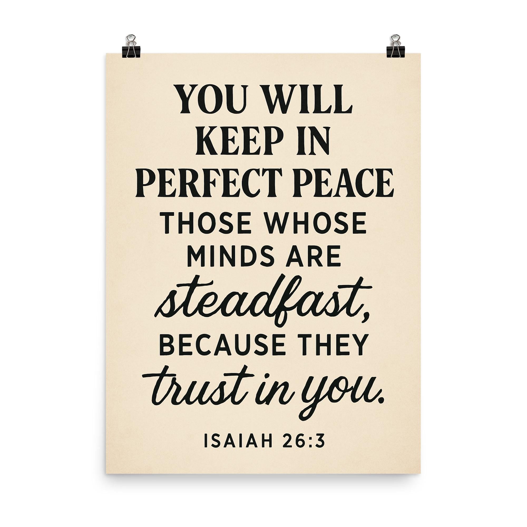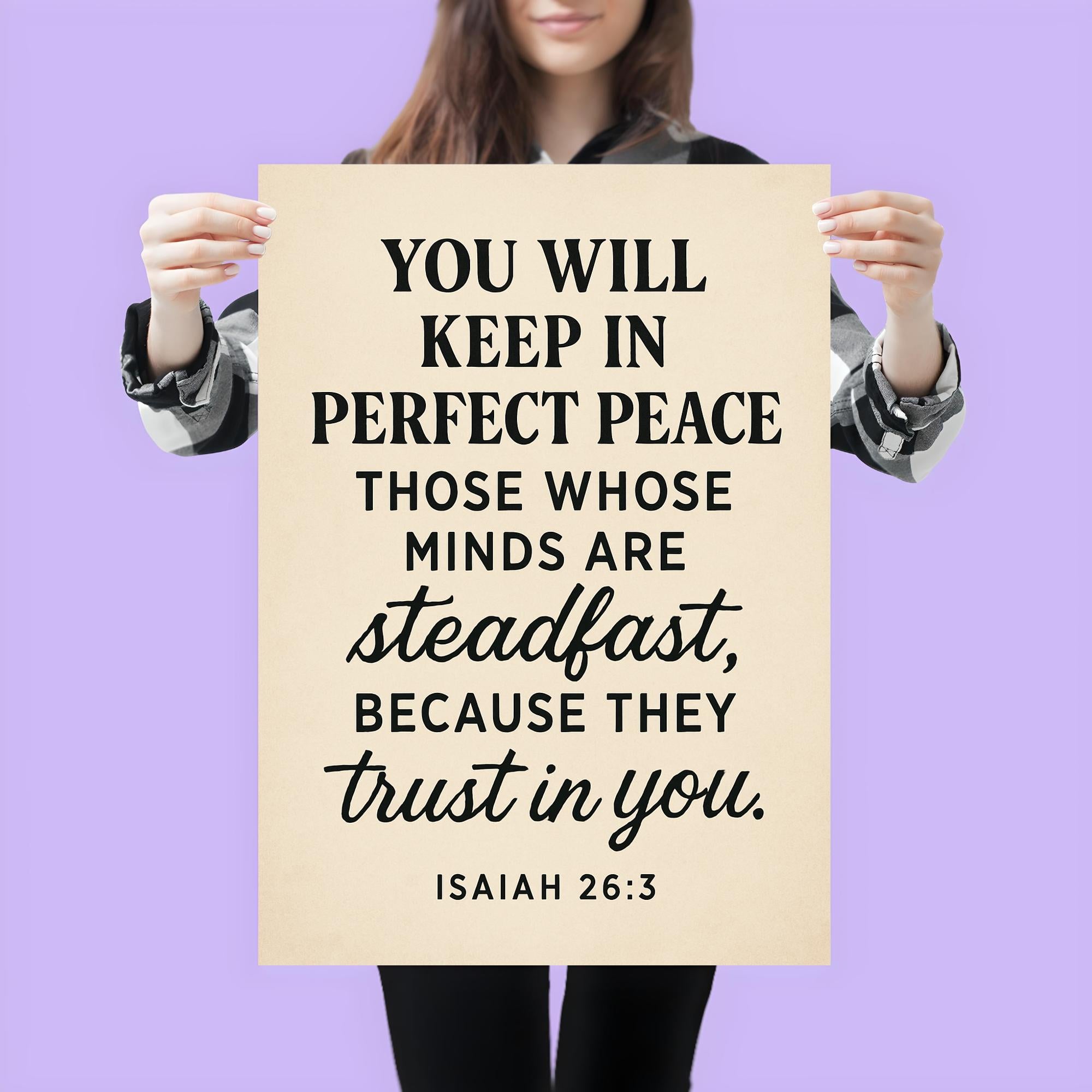 Embrace tranquility every day with this inspiring Isaiah 26:3 poster. A powerful reminder that perfect peace comes to those who keep their minds steadfast and trust deeply. Let these words uplift your spirit and center your heart, making it a meaningful addition to any space.
