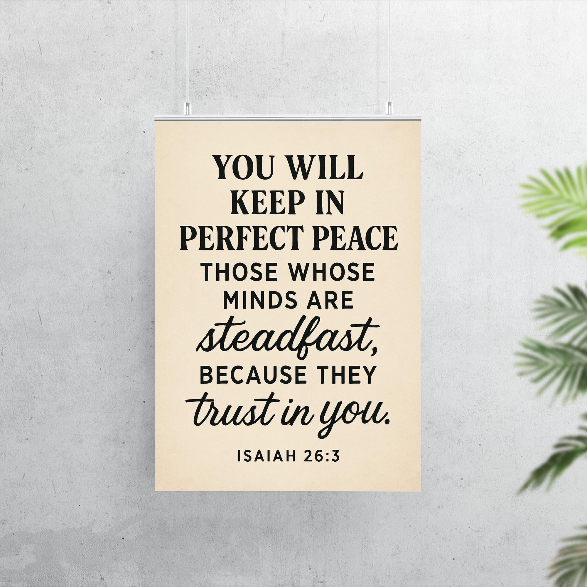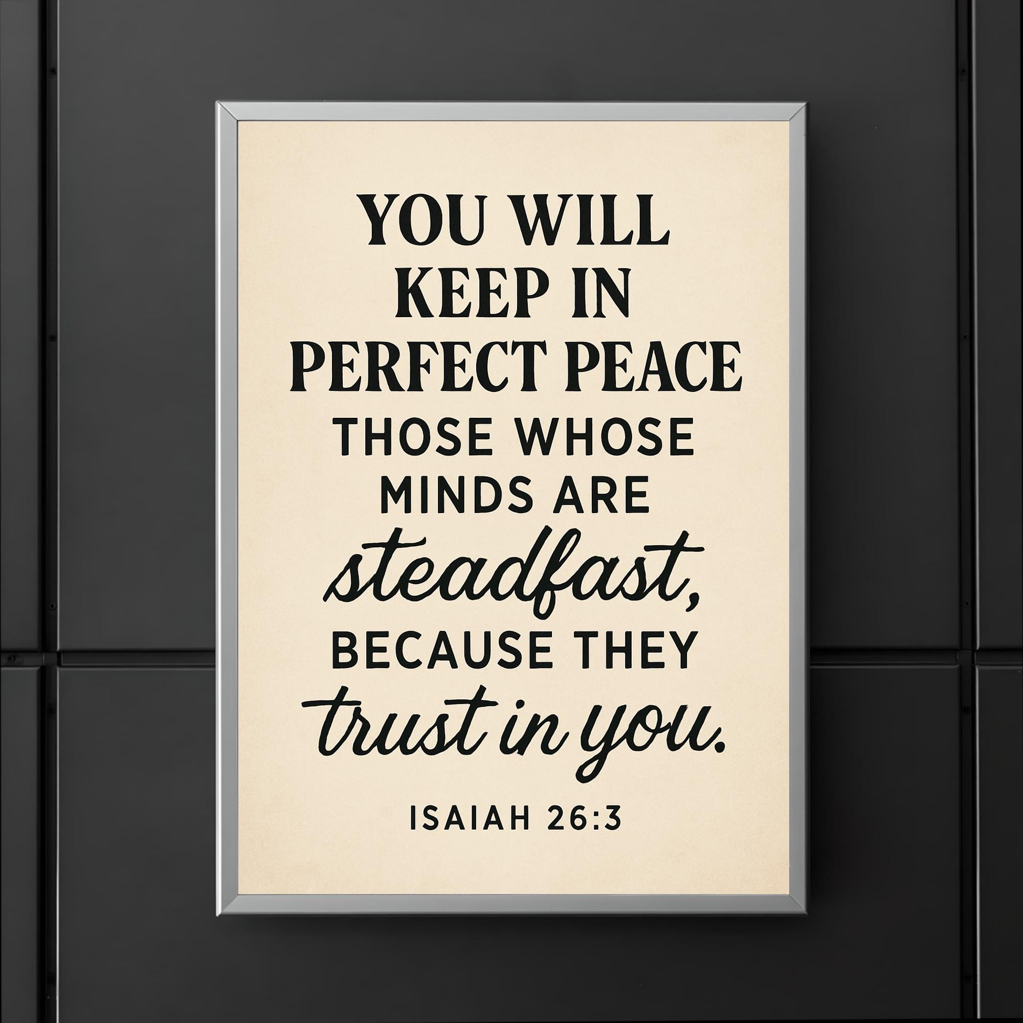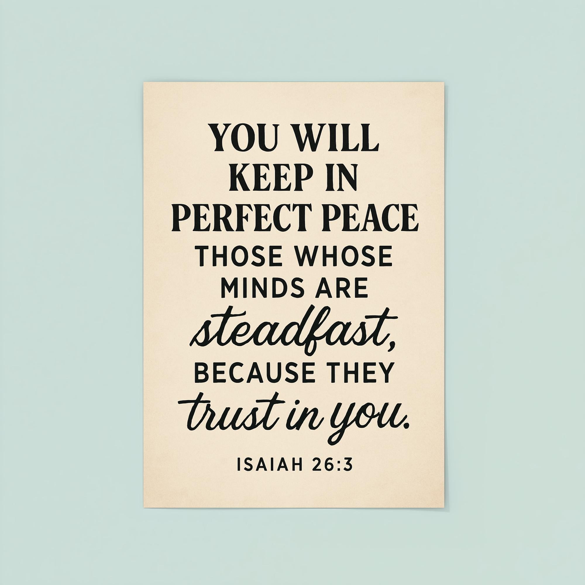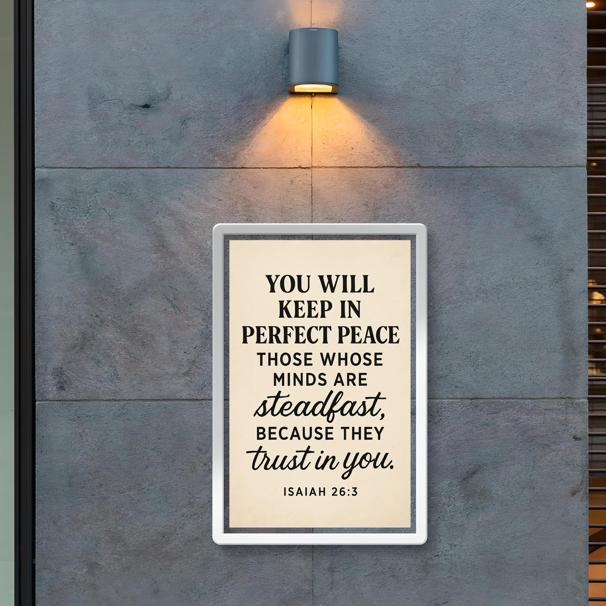 Embrace tranquility every day with this inspiring Isaiah 26:3 poster. A powerful reminder that perfect peace comes to those who keep their minds steadfast and trust deeply. Let these words uplift your spirit and center your heart, making it a meaningful addition to any space.