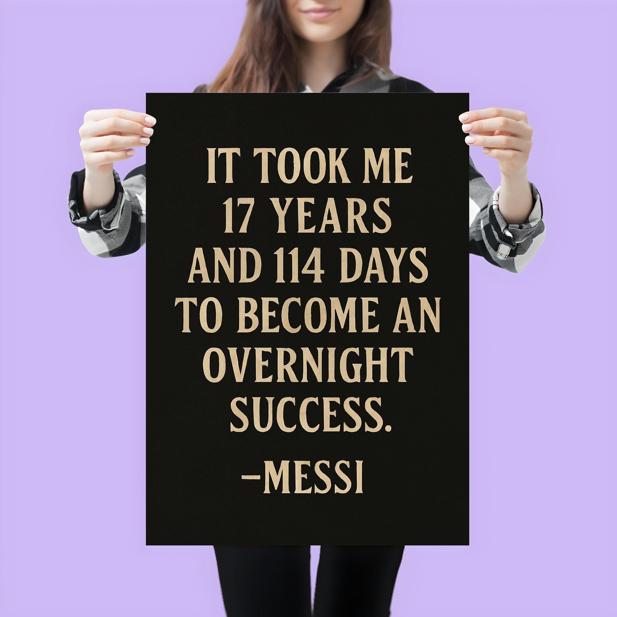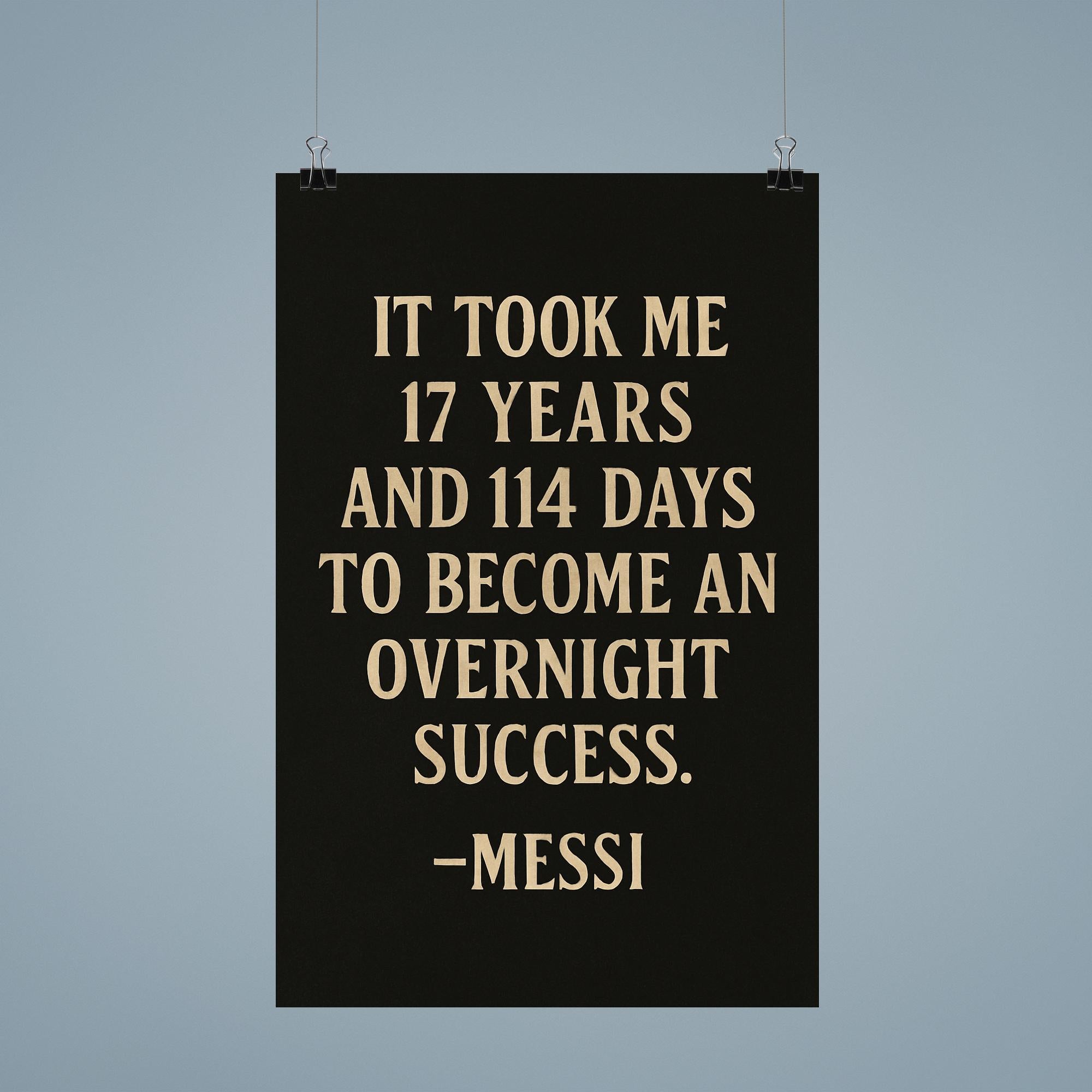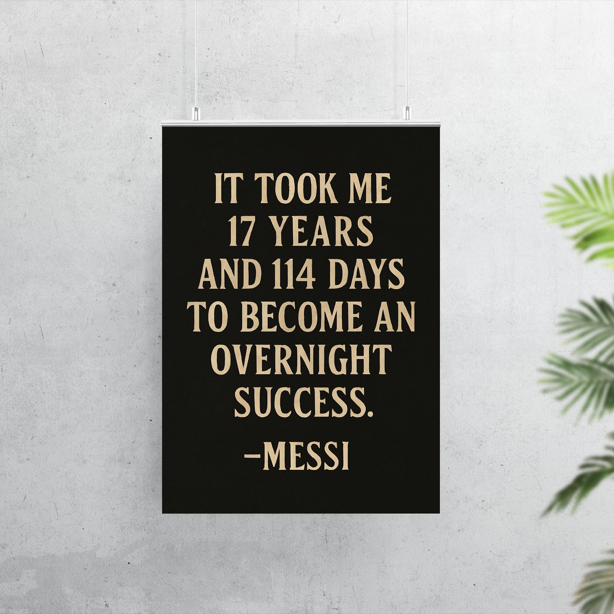Celebrate the relentless dedication behind a true legend with this powerful "It took me 17 years and 114 days to become an overnight success – Messi" poster. Perfect for inspiring athletes and dreamers alike, it’s a bold reminder that greatness is forged through years of hard work and perseverance. Elevate your space with a tribute that honors the journey, not just the destination.