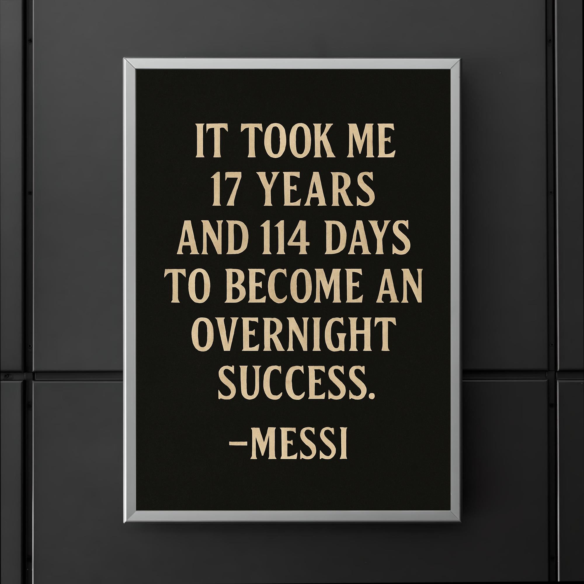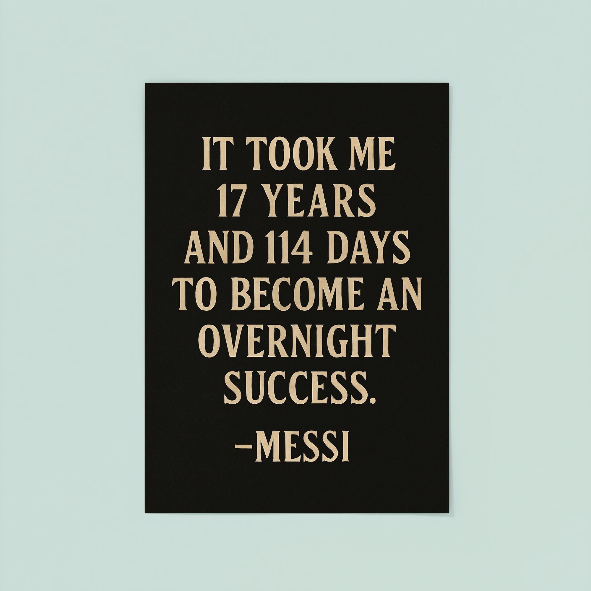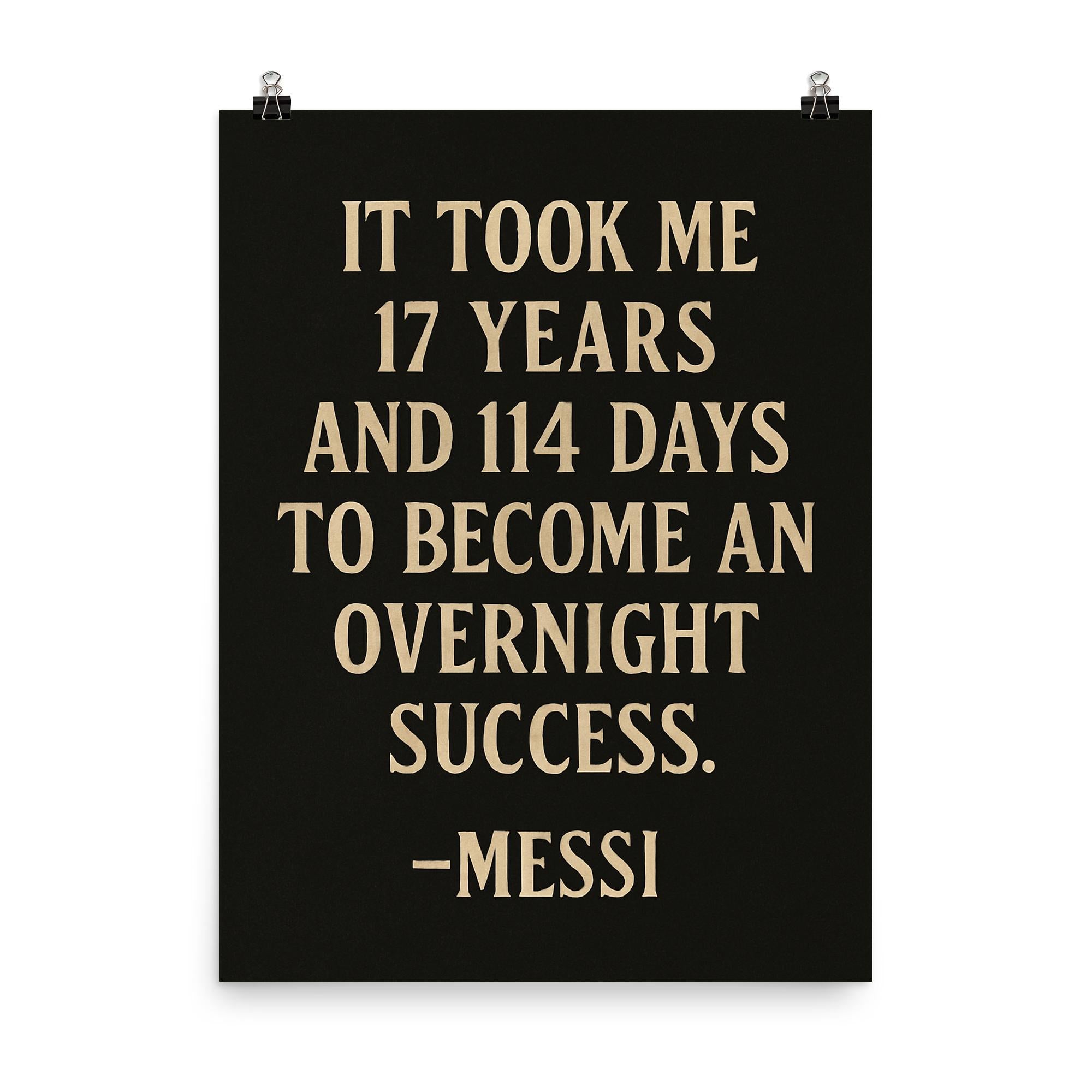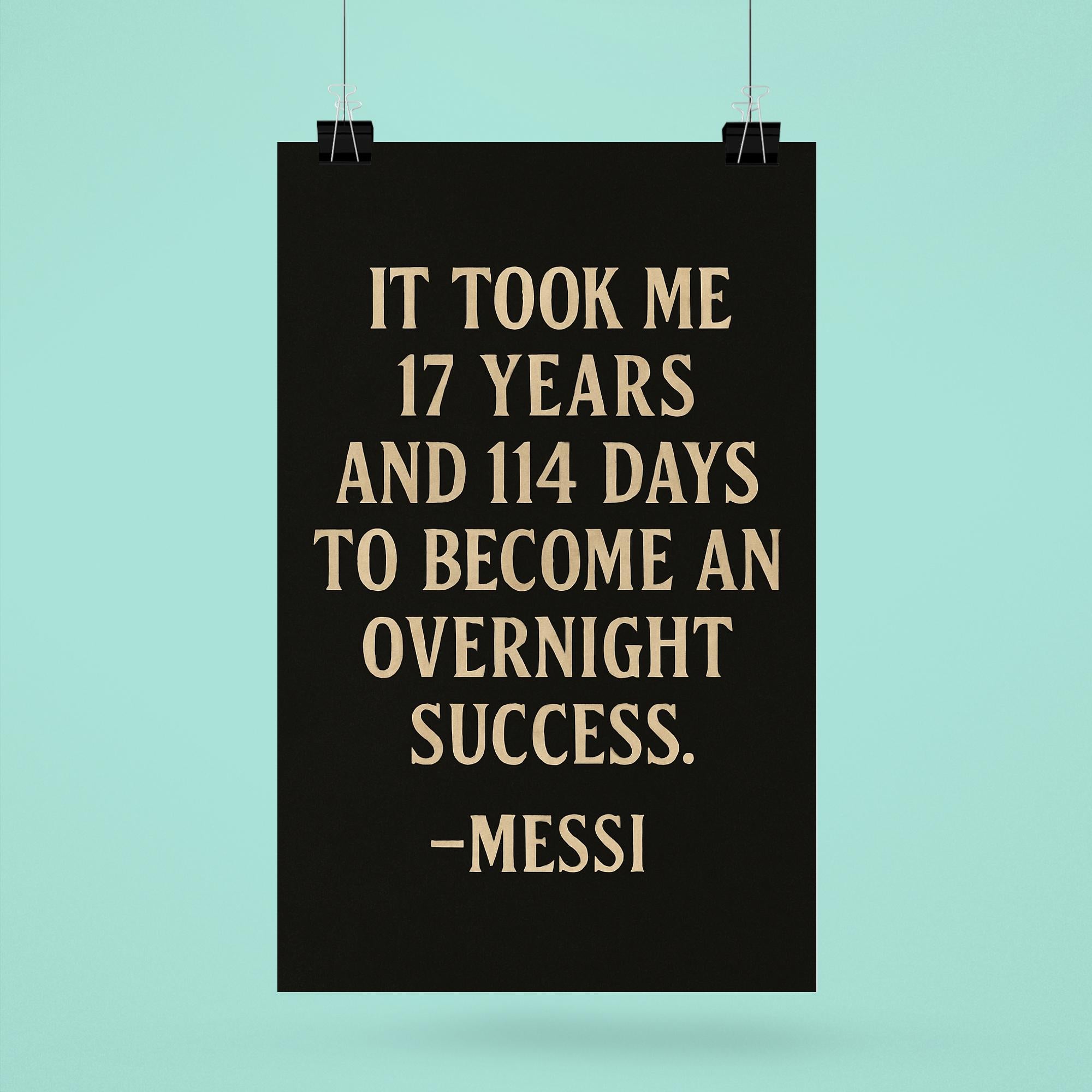 Celebrate the relentless dedication behind a true legend with this powerful "It took me 17 years and 114 days to become an overnight success – Messi" poster. Perfect for inspiring athletes and dreamers alike, it’s a bold reminder that greatness is forged through years of hard work and perseverance. Elevate your space with a tribute that honors the journey, not just the destination.