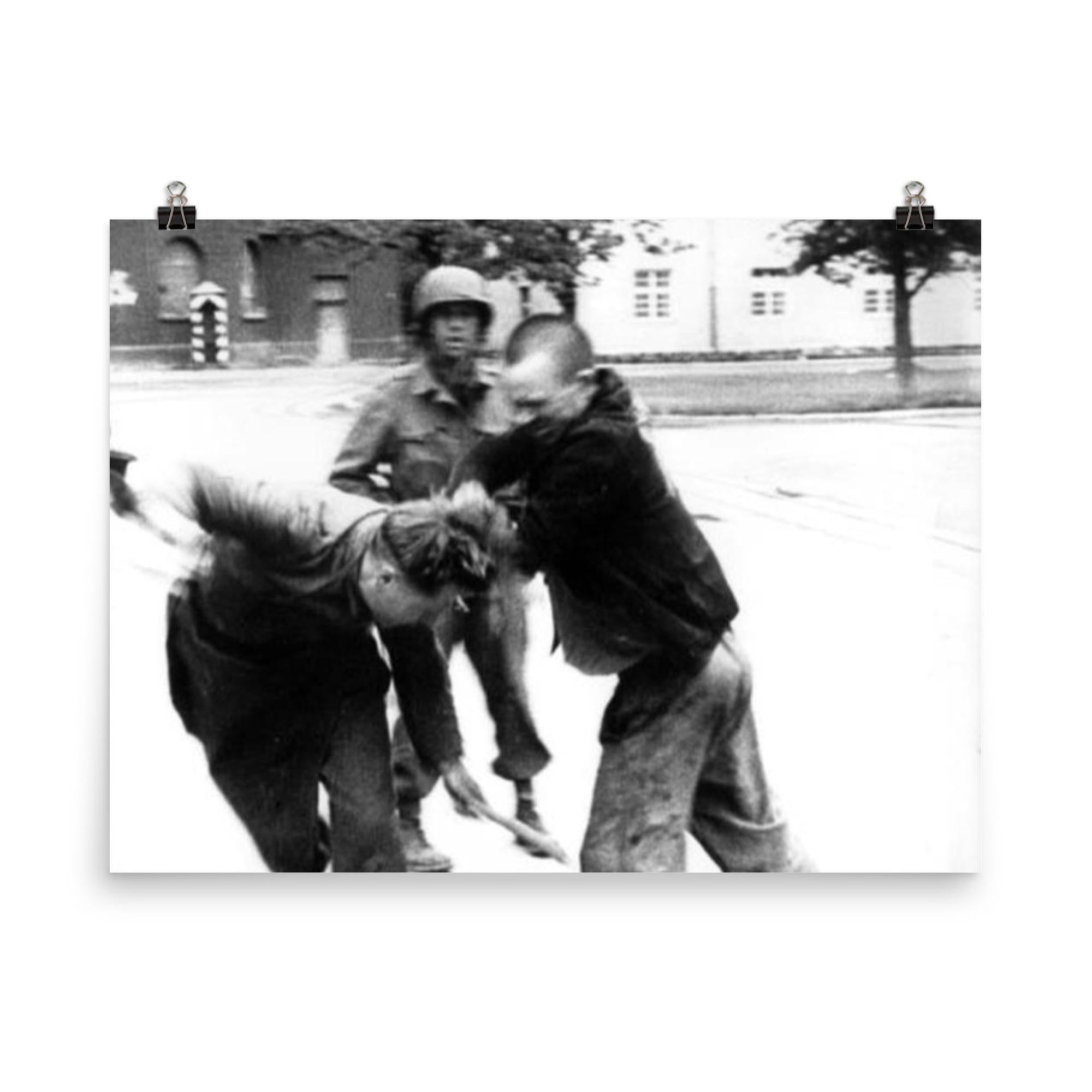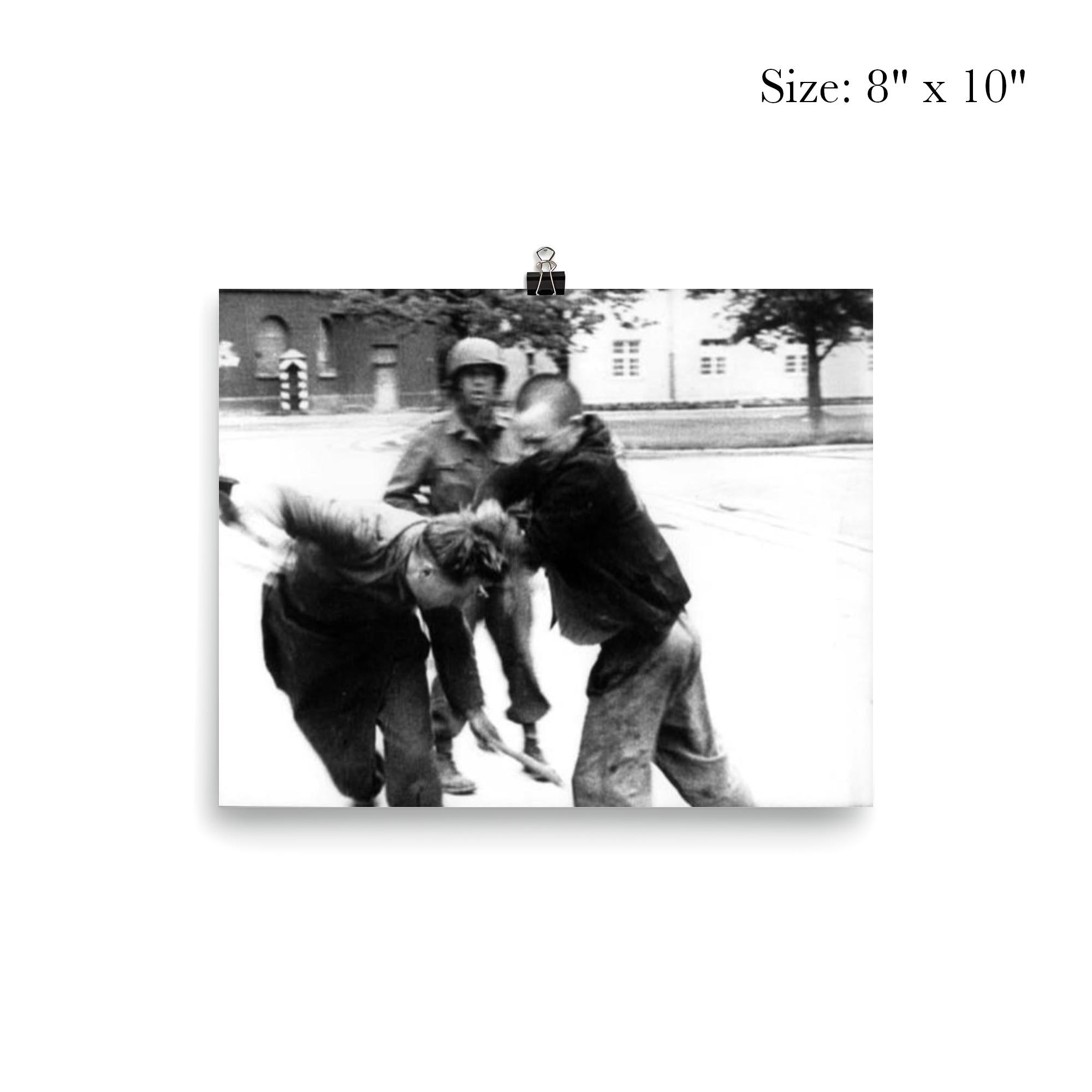 Capture a moment of fierce resistance and unyielding courage with this powerful poster depicting a Jewish prisoner’s bold act against a German guard in 1945. This striking image serves as a testament to the indomitable human spirit amid history’s darkest chapters, making it a profound addition to any collection dedicated to remembrance and resilience.