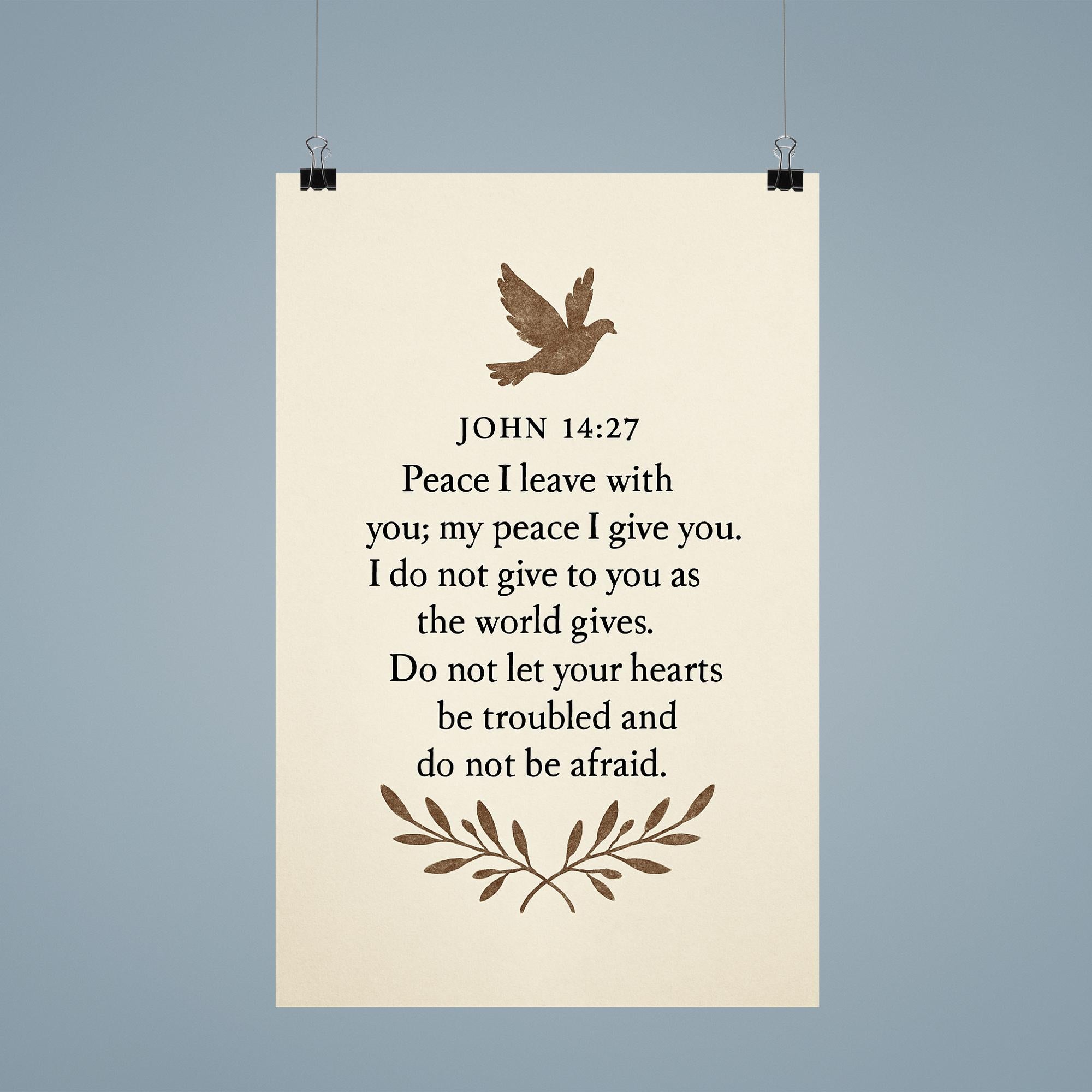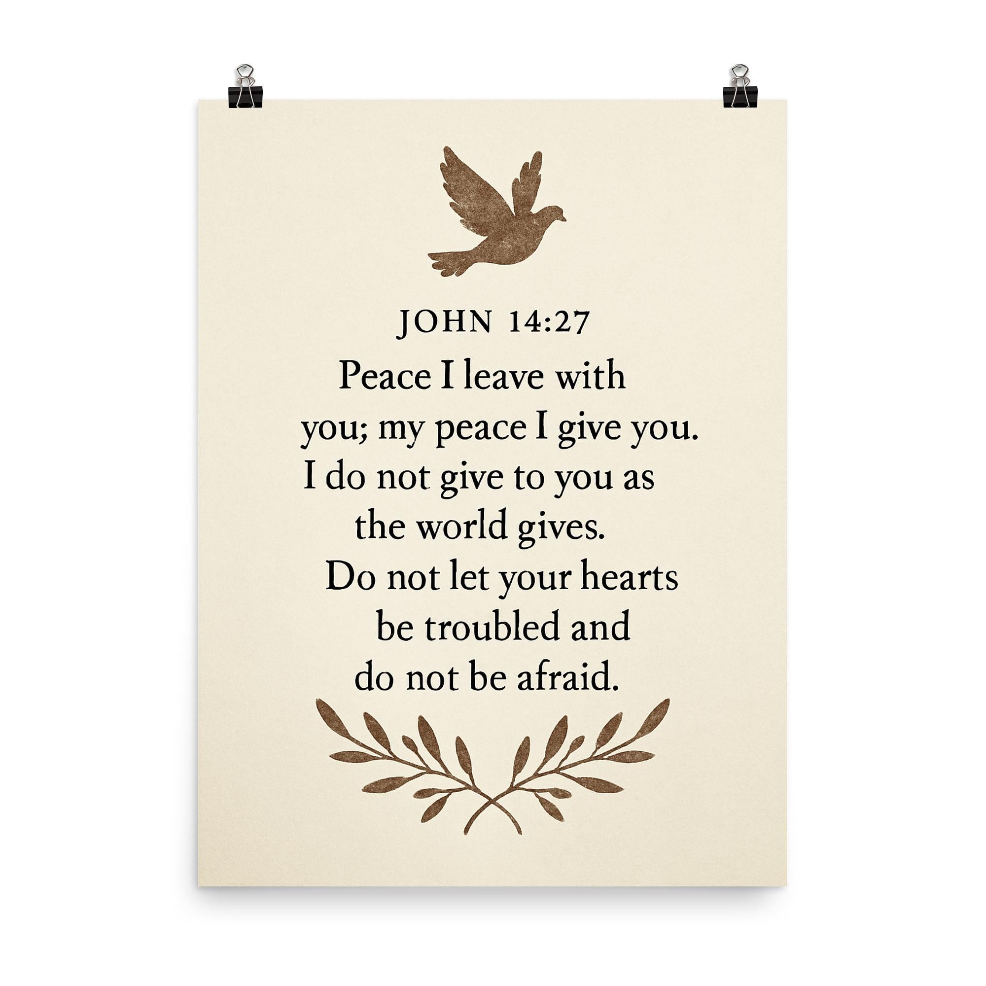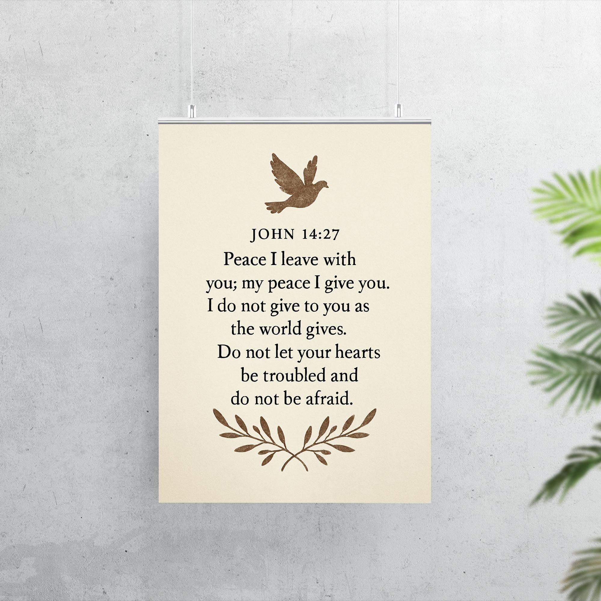 Embrace lasting calm with this powerful reminder from John 14:27: "Peace I leave with you; my peace I give you. I do not give to you as the world gives. Do not let your hearts be troubled and do not be afraid." Perfect for inspiring serenity and courage in any space, this poster brings a message of divine comfort straight to your room.