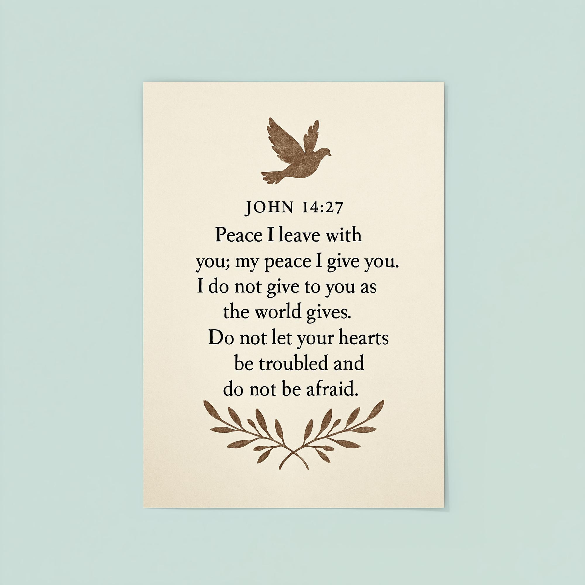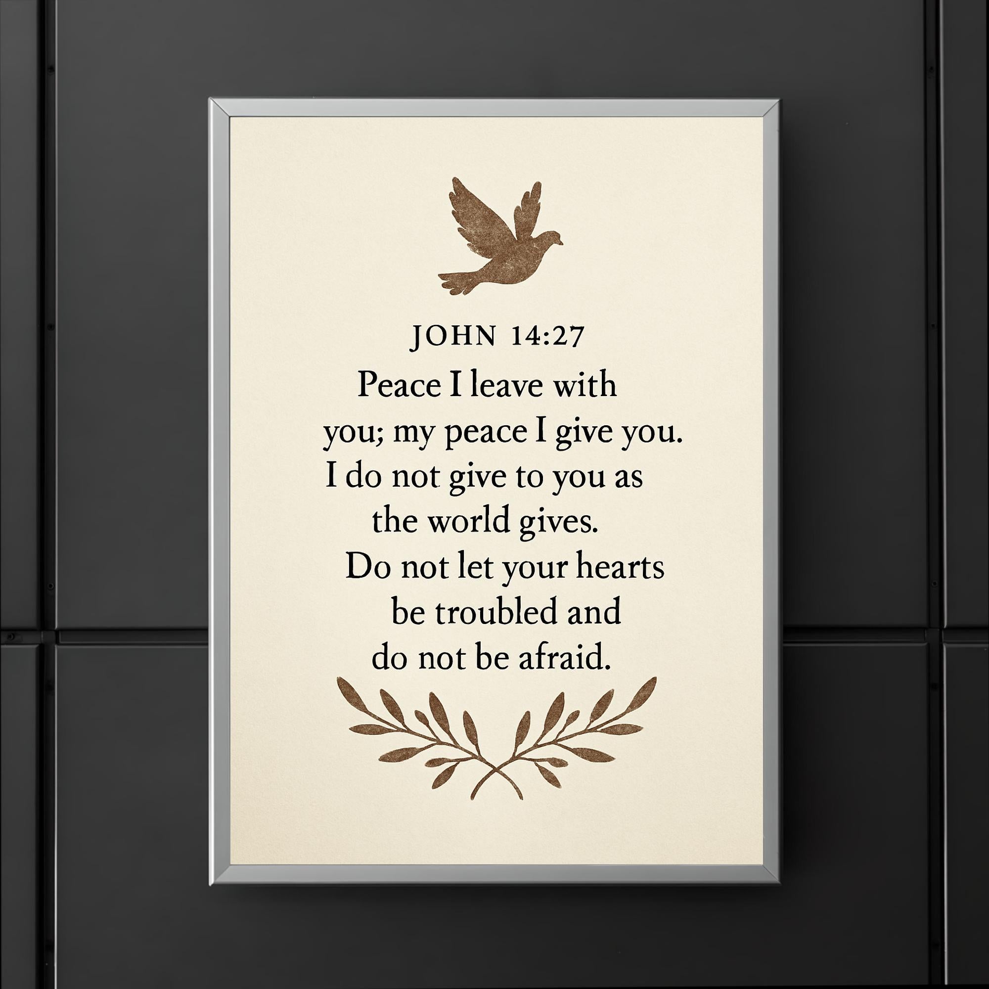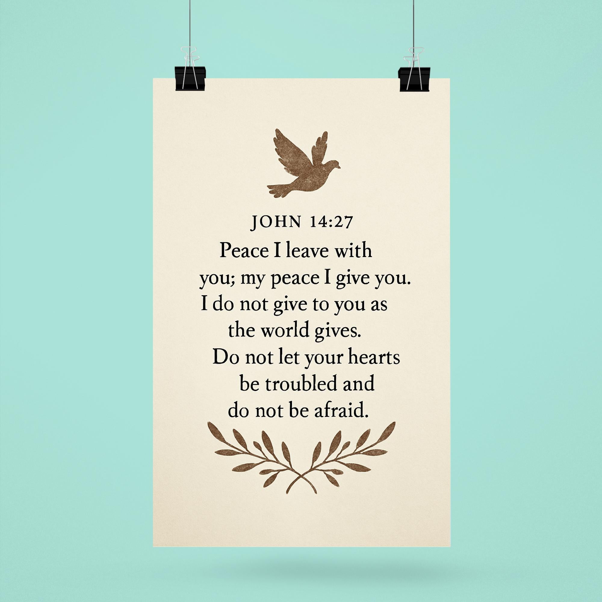 Embrace lasting calm with this powerful reminder from John 14:27: "Peace I leave with you; my peace I give you. I do not give to you as the world gives. Do not let your hearts be troubled and do not be afraid." Perfect for inspiring serenity and courage in any space, this poster brings a message of divine comfort straight to your room.