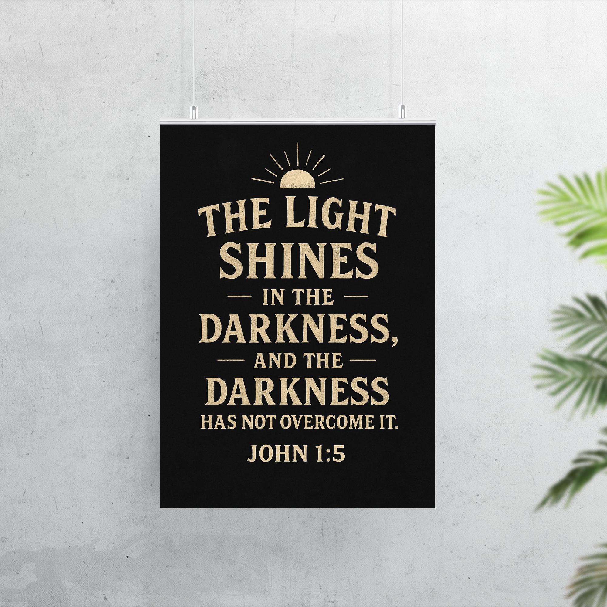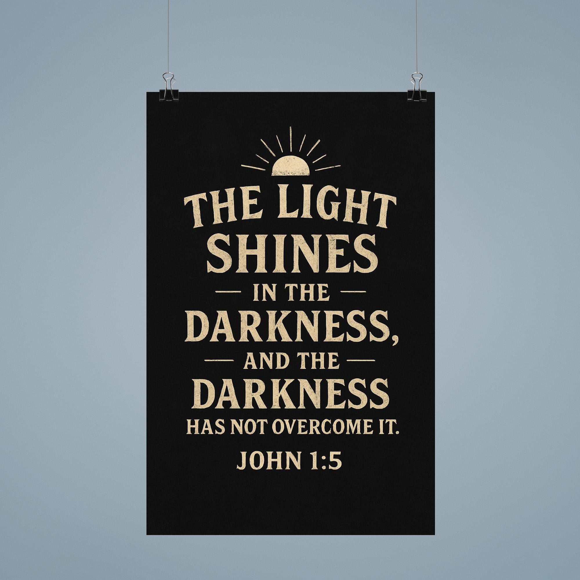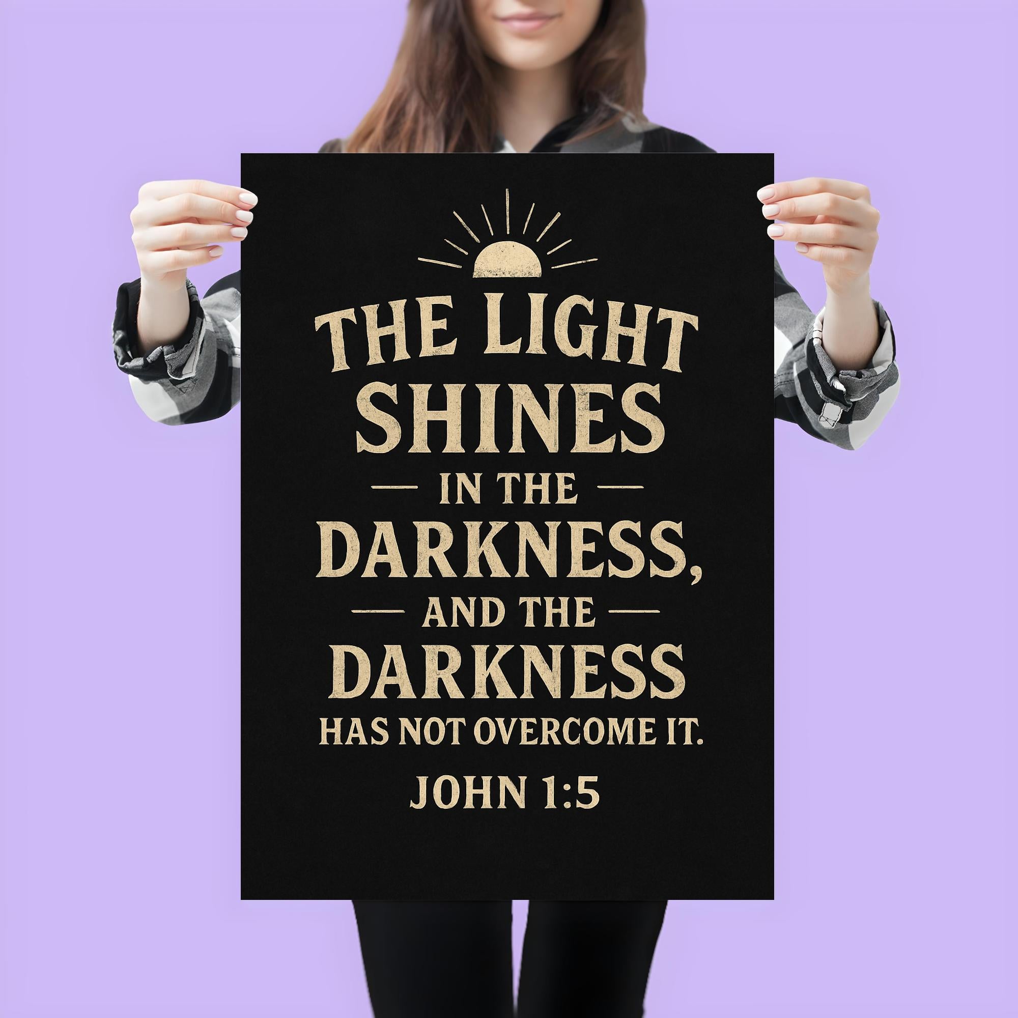 Illuminate your space with the powerful message of John 15: "The light shines in the darkness, and the darkness has not overcome it." This inspiring poster serves as a daily reminder of hope, faith, and resilience, bringing warmth and encouragement to any room. Let this timeless truth brighten your surroundings and uplift your spirit every day.