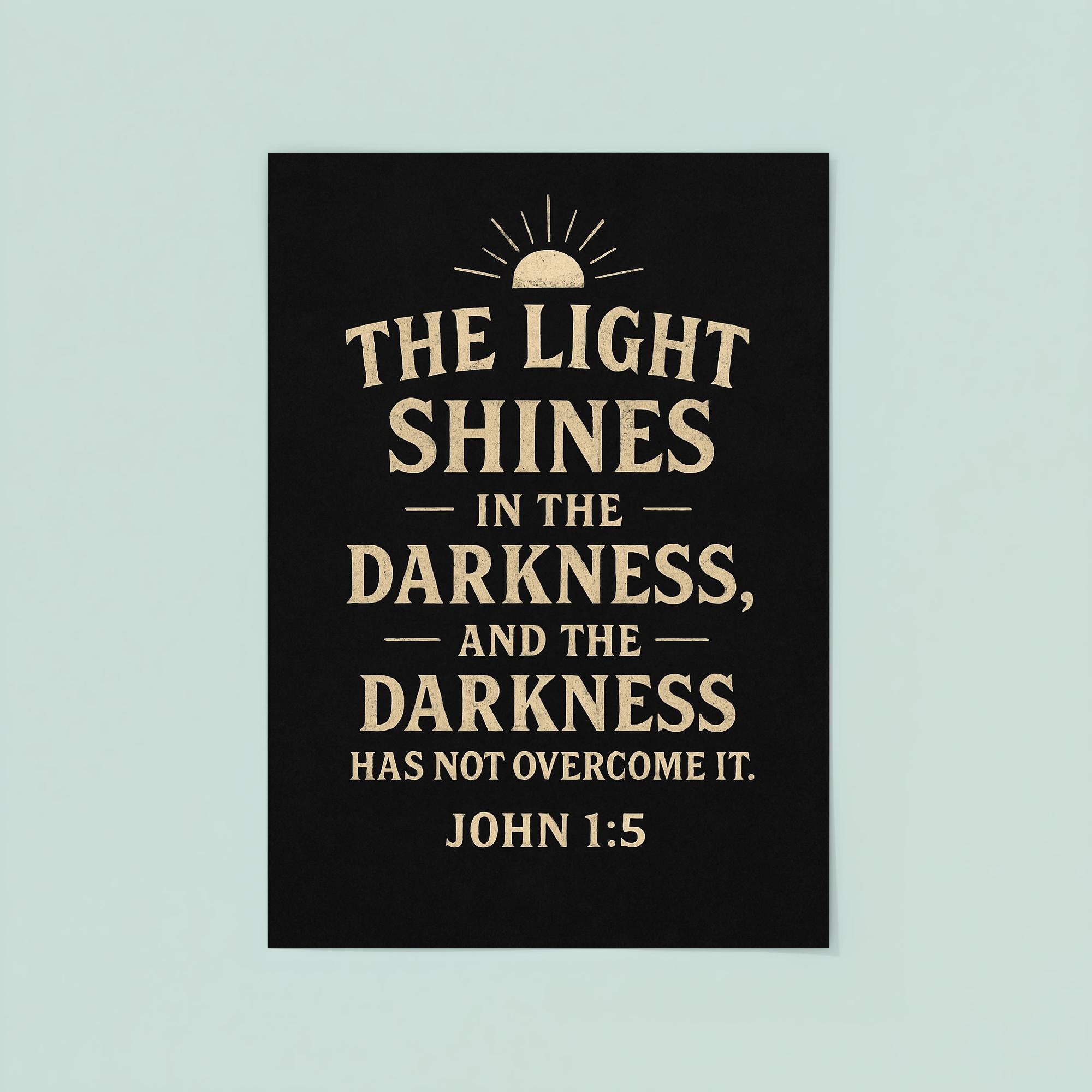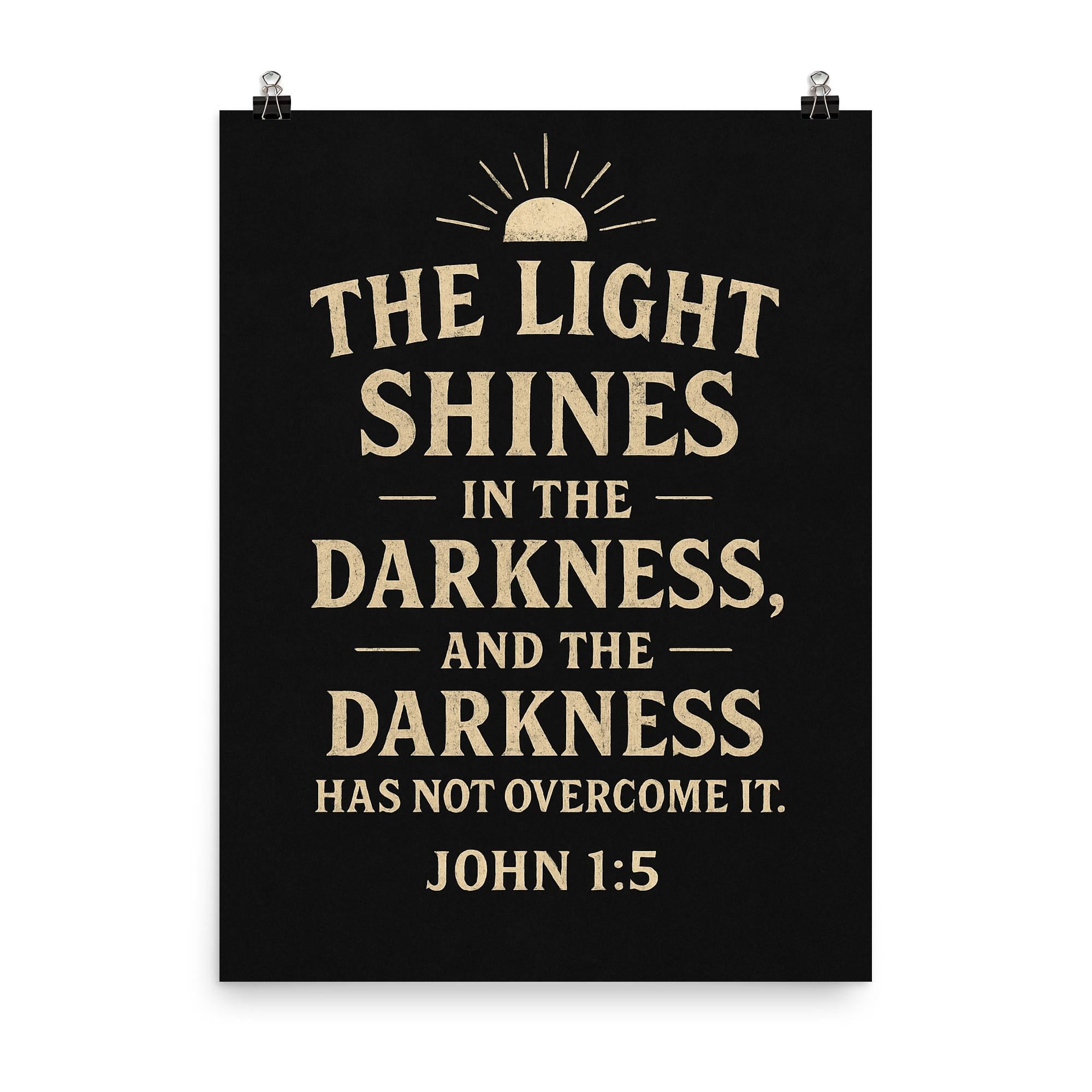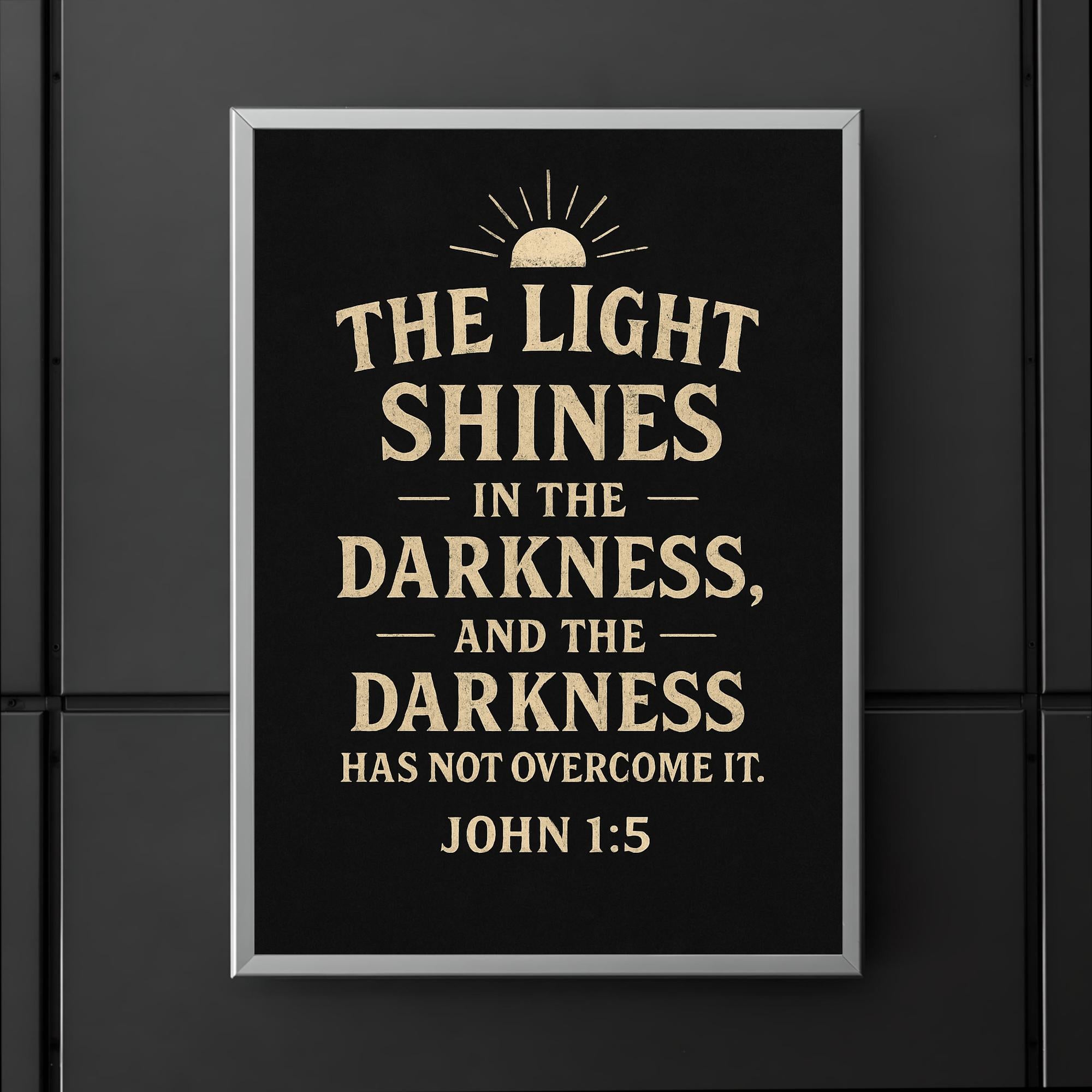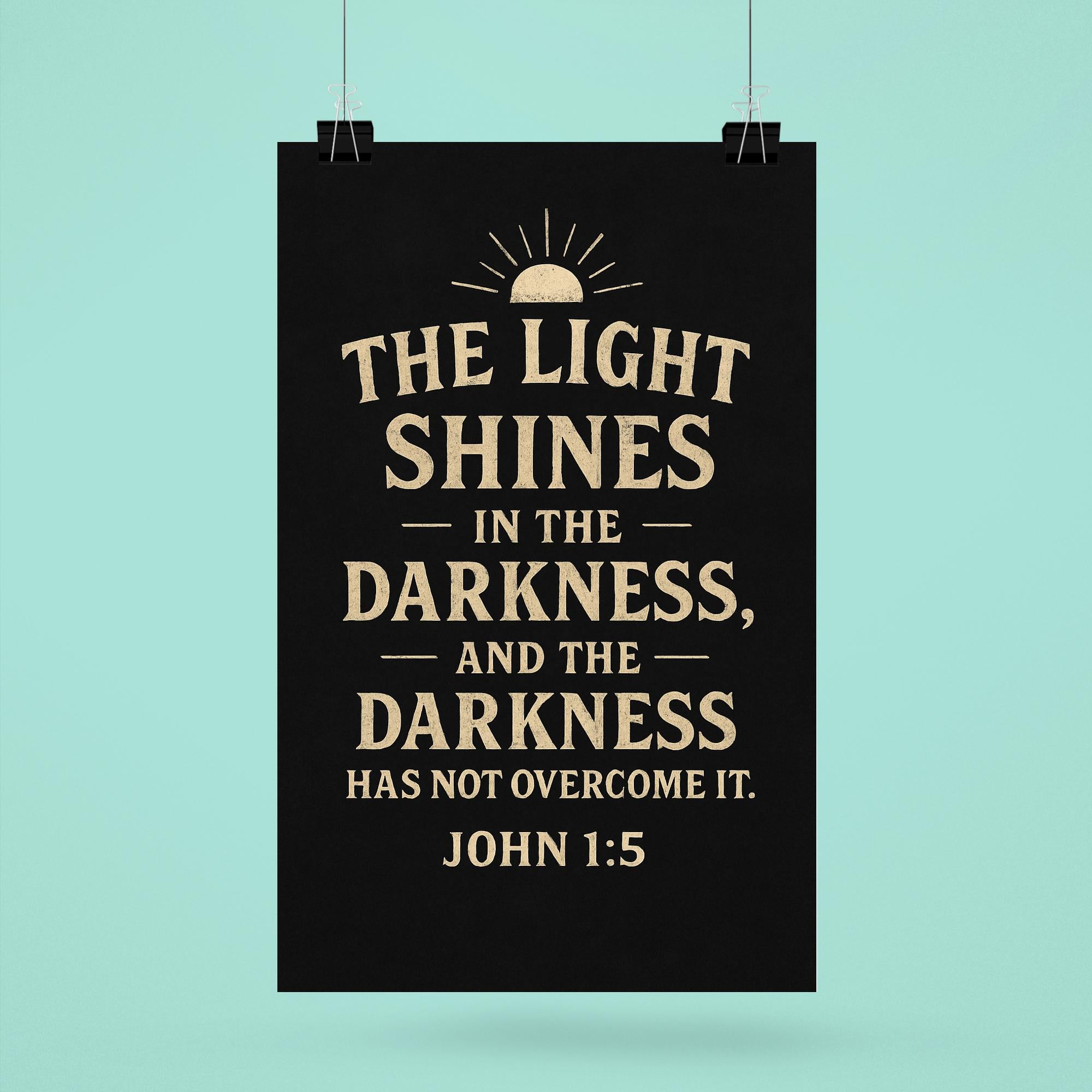 Illuminate your space with the powerful message of John 15: "The light shines in the darkness, and the darkness has not overcome it." This inspiring poster serves as a daily reminder of hope, faith, and resilience, bringing warmth and encouragement to any room. Let this timeless truth brighten your surroundings and uplift your spirit every day.