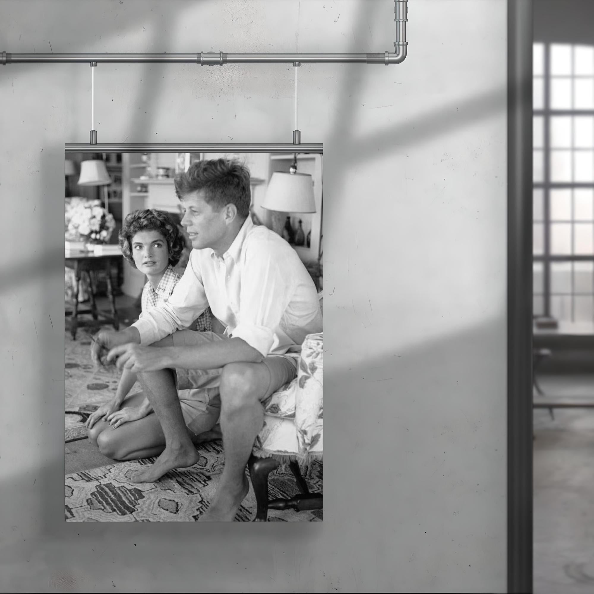 Capture a timeless moment of grace and charisma with this stunning poster featuring John F. Kennedy alongside Jacqueline Bouvier. This elegant piece pays tribute to an iconic couple whose style and spirit left an indelible mark on history. Perfect for any space seeking a touch of classic American legacy, this poster invites admiration and reflection every time you see it.