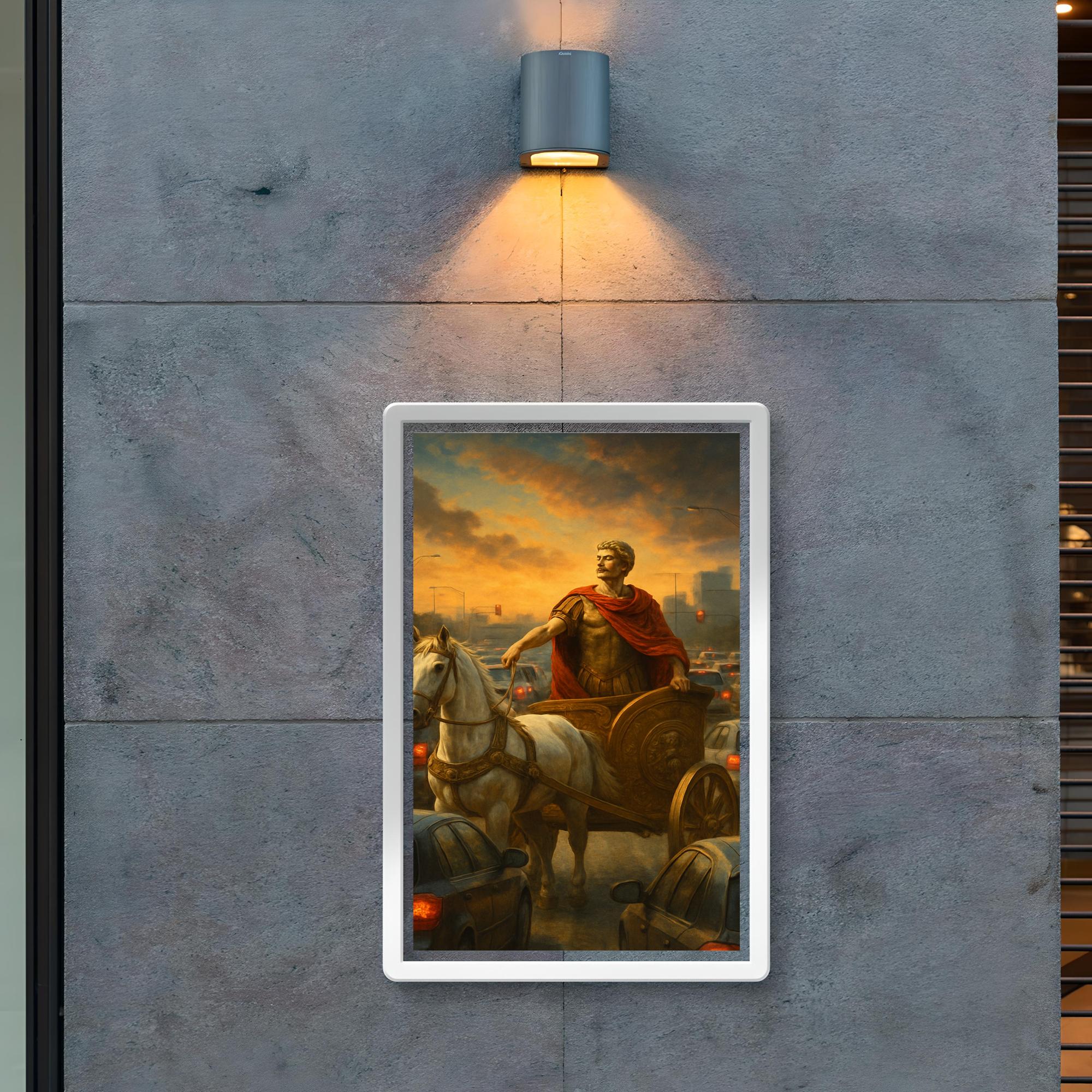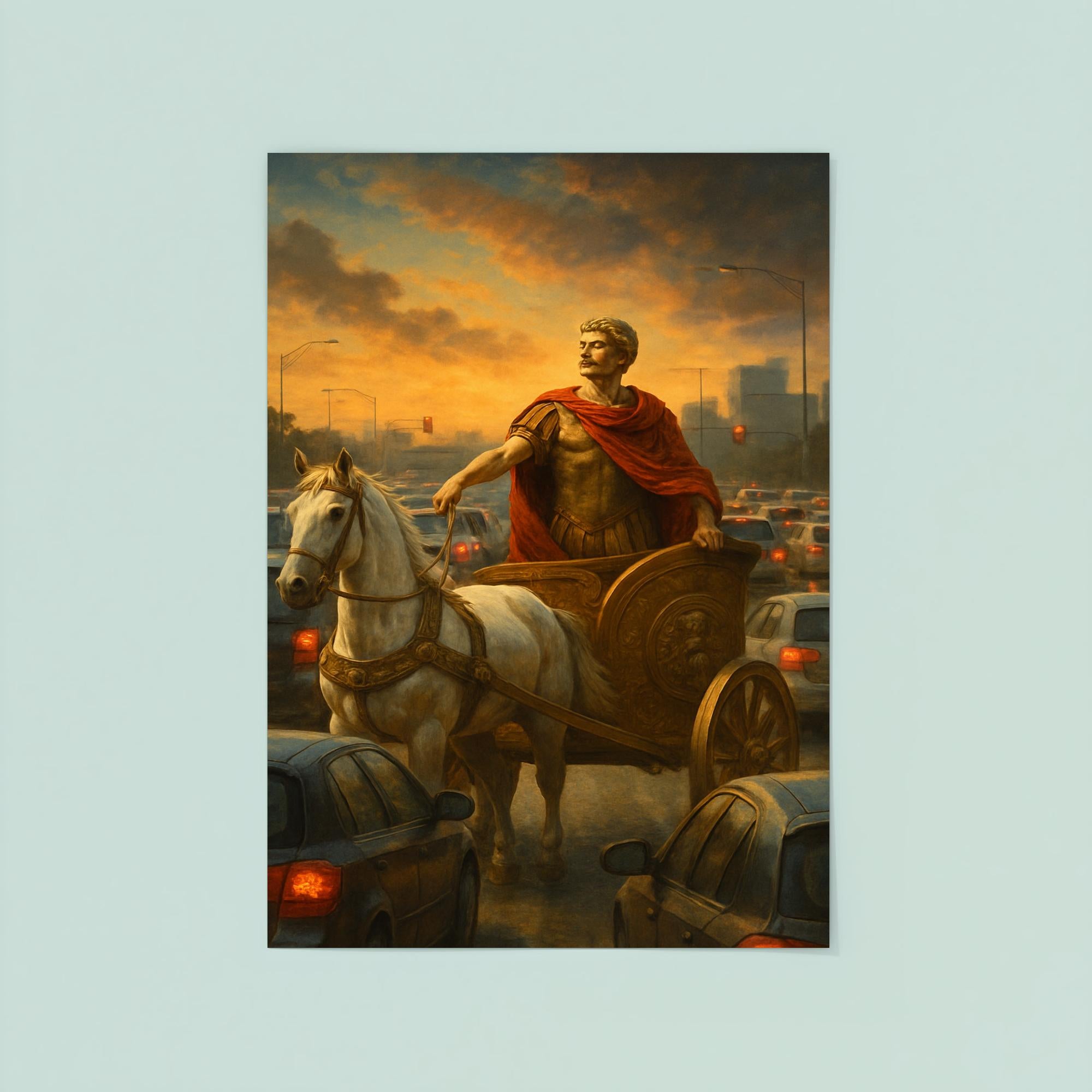 Experience history colliding with the present in this striking poster featuring Julius Caesar caught in a modern-day traffic jam, chariot and all. This clever, thought-provoking artwork blends ancient power with today’s everyday chaos, making it a perfect statement piece for any space craving a touch of wit and timeless intrigue.