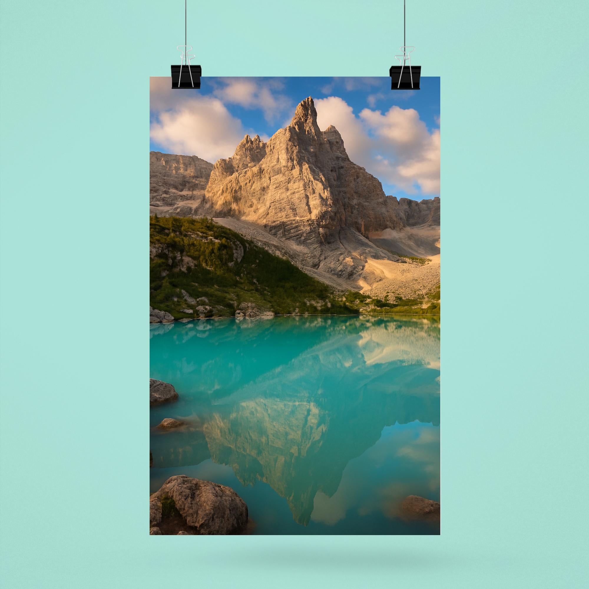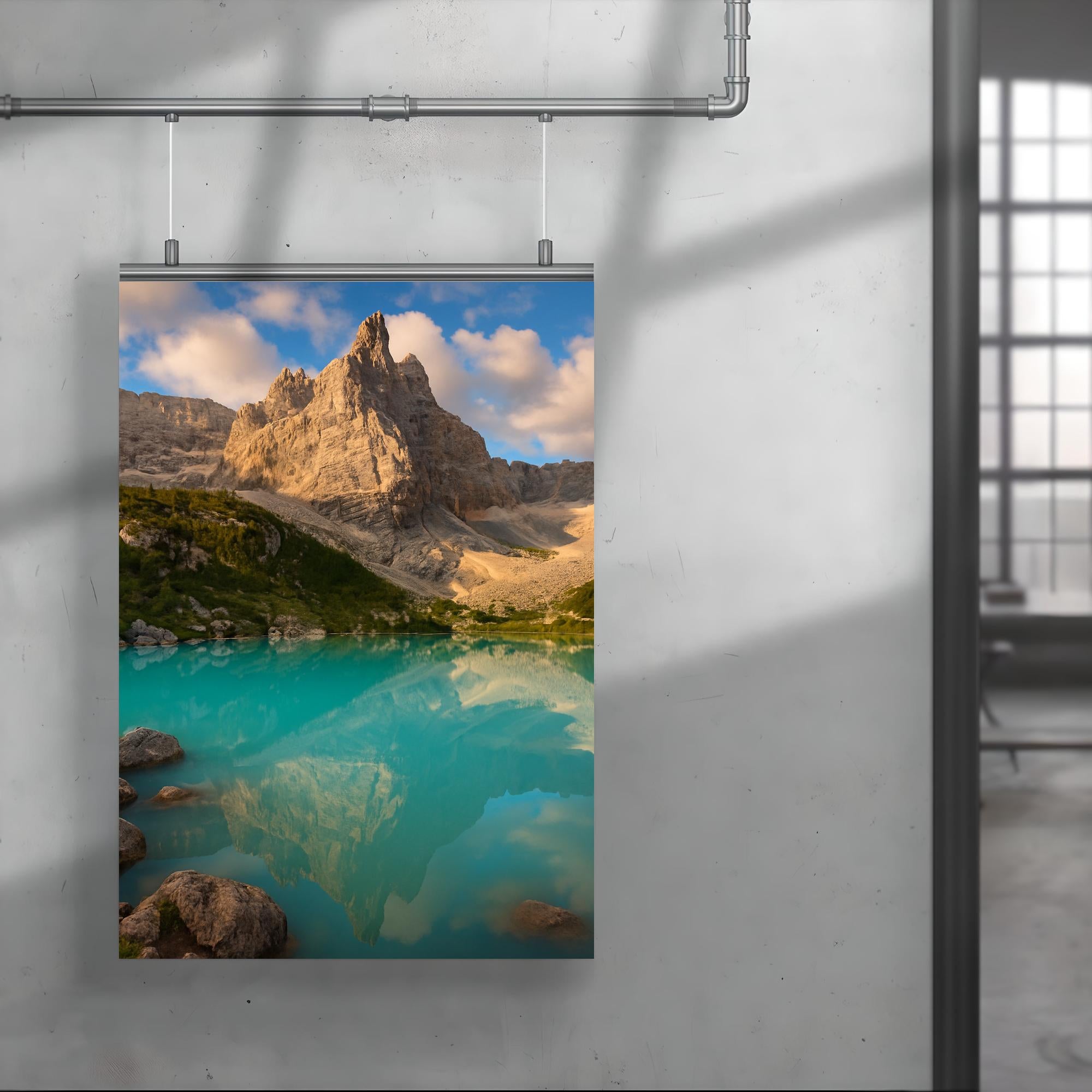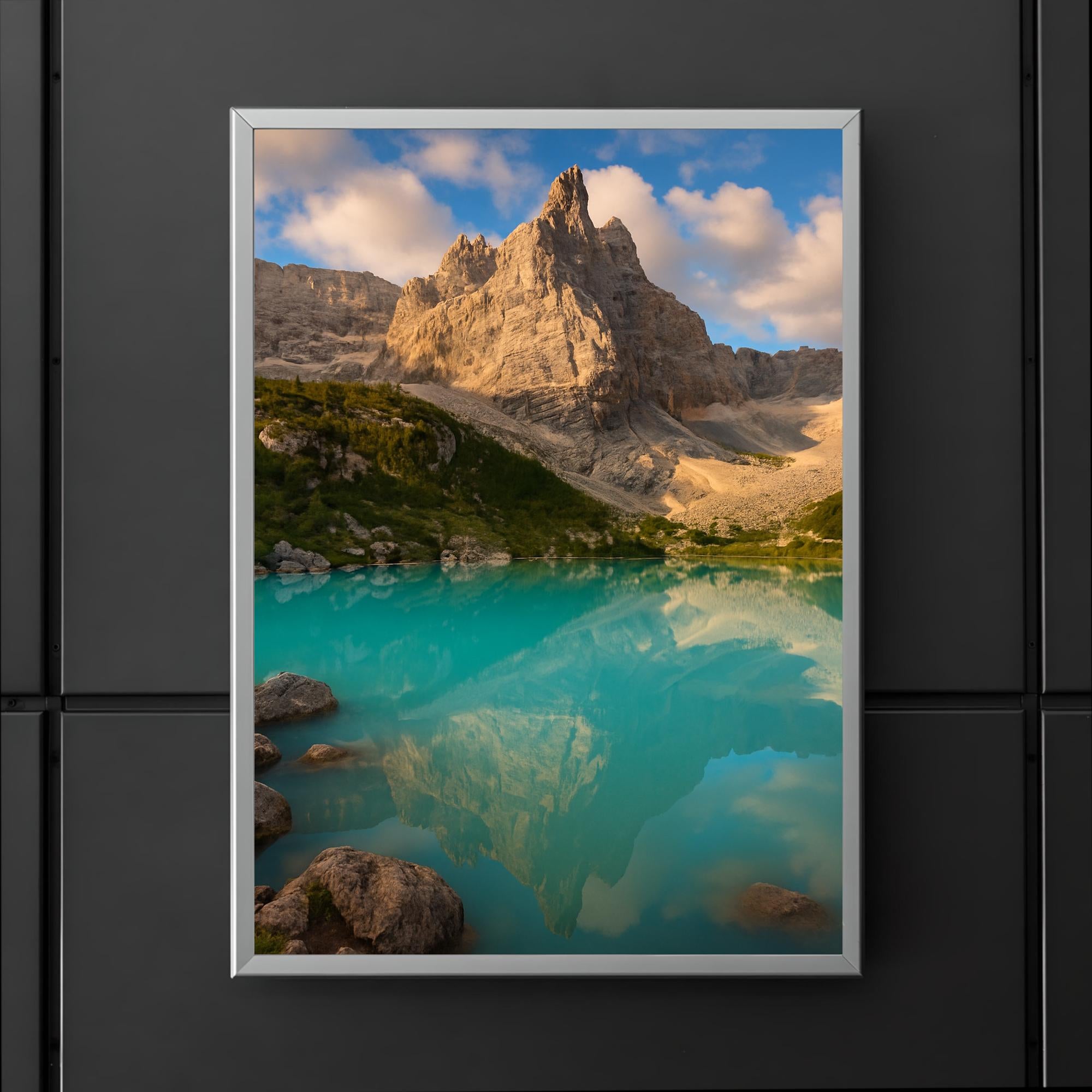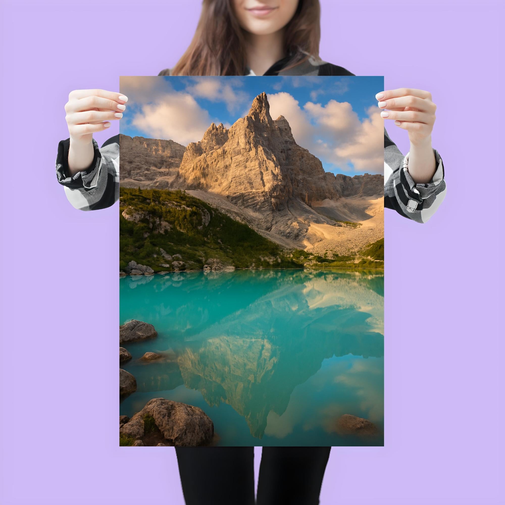 Bring the breathtaking beauty of the Dolomites into your living space with this stunning poster of Lago di Sorapis. Showcasing the serene, turquoise waters nestled among rugged mountain peaks, this artwork captures nature’s tranquility and grandeur in perfect harmony. Ideal for those who dream of alpine adventures or seek a peaceful escape, it transforms any room into a window to Italy’s majestic wilderness.