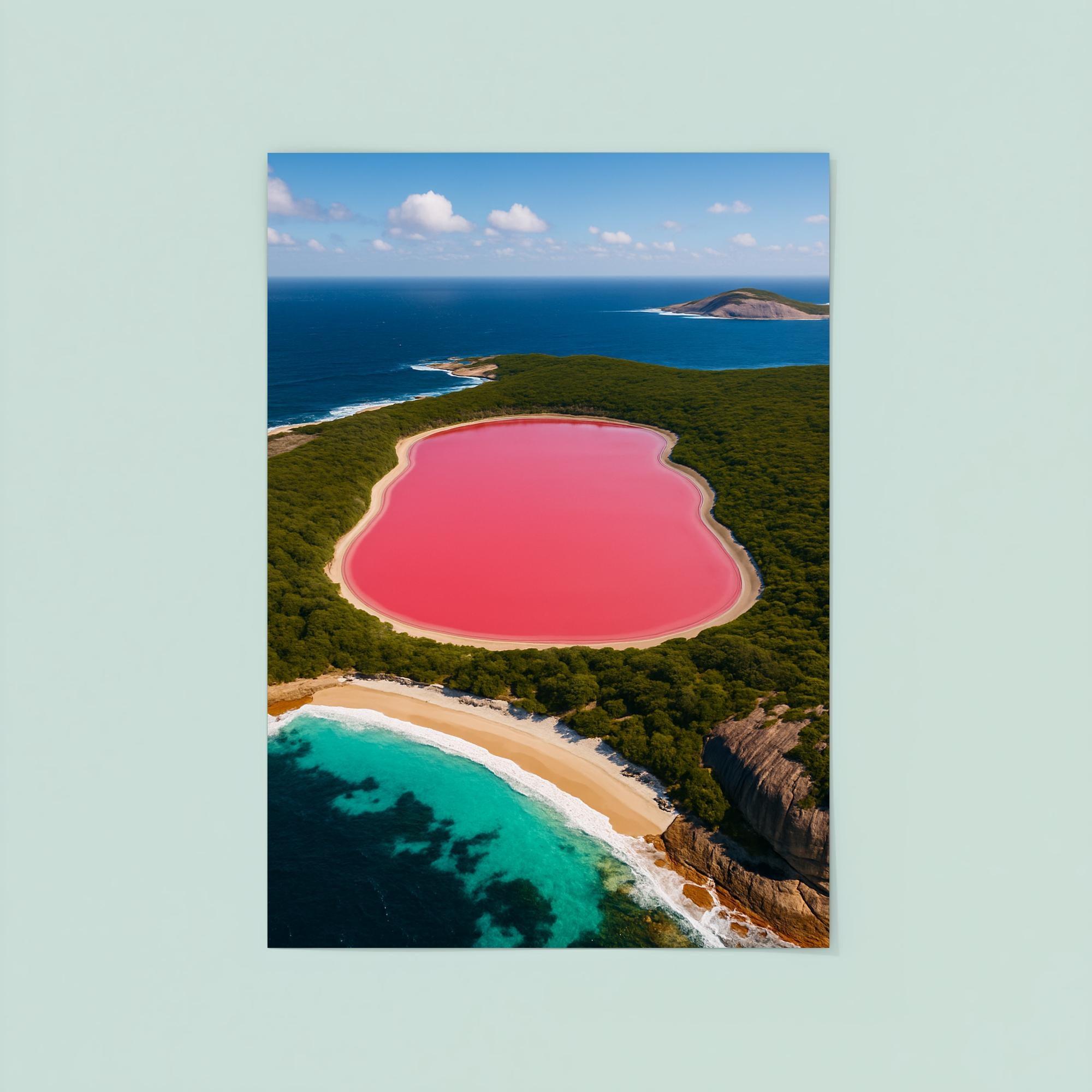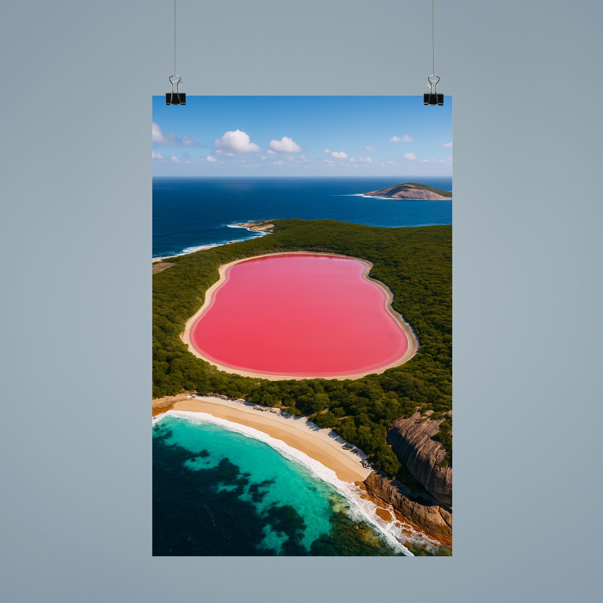 Transform your space with this stunning poster of Lake Hillier, Western Australia—a natural wonder known for its striking pink waters. Capturing the lake’s unique charm in vibrant detail, this artwork brings a touch of extraordinary beauty and intrigue to any room. Perfect for lovers of nature and adventure, it’s more than décor—it’s a conversation starter.