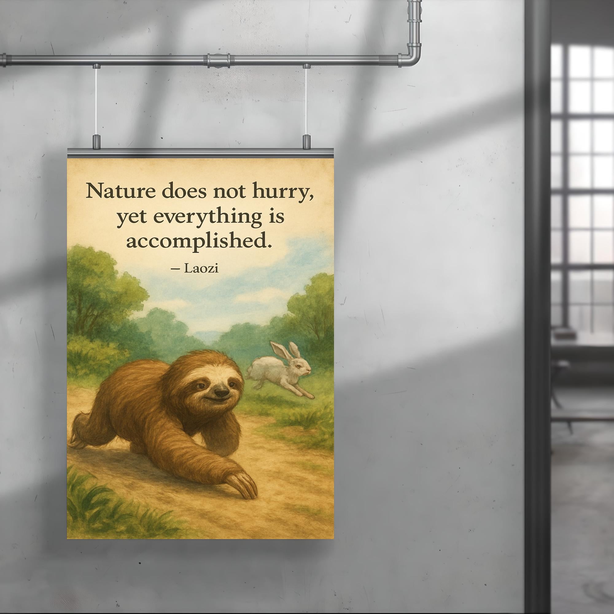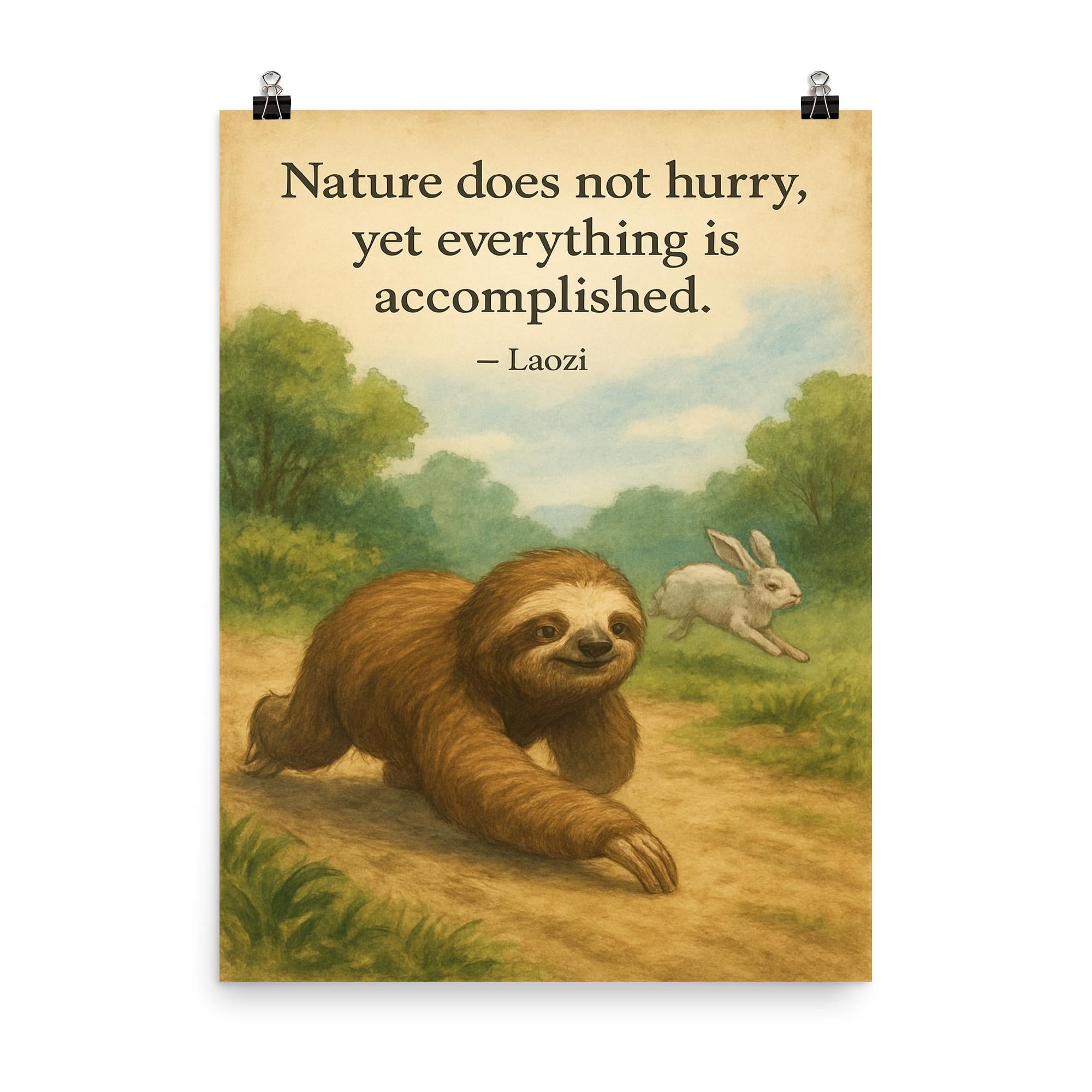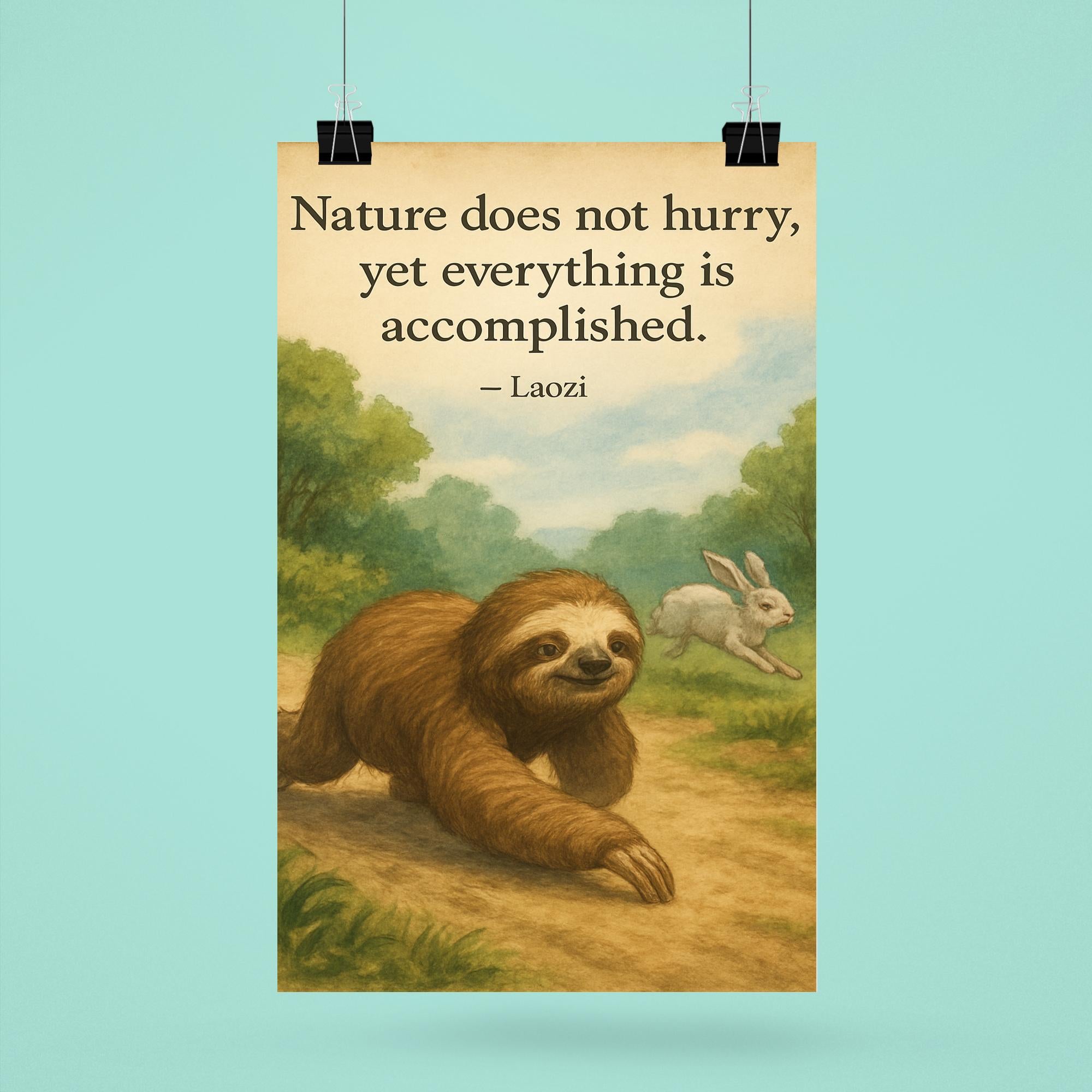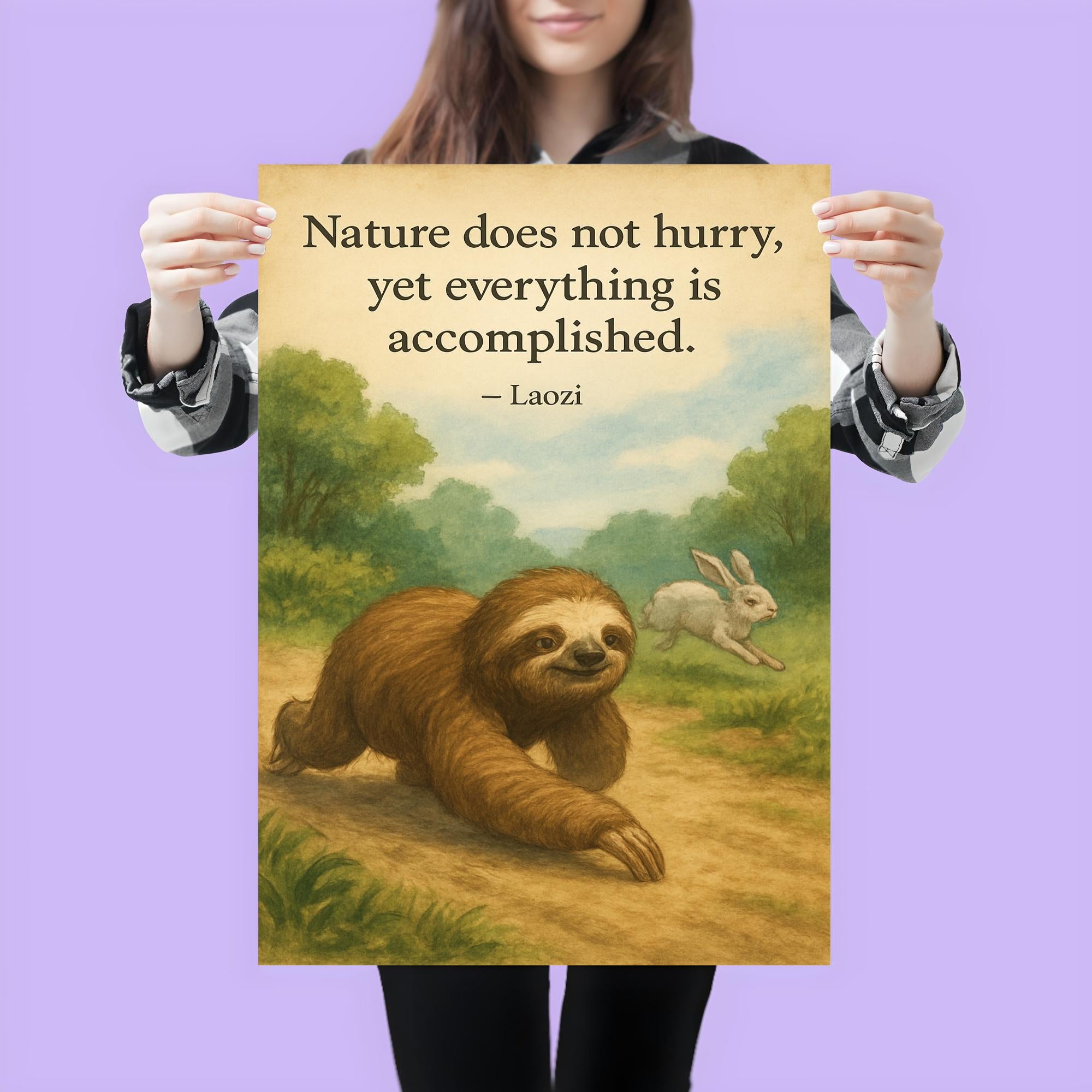 Embrace the timeless wisdom of Laozi with this inspiring poster, featuring the profound reminder that "Nature does not hurry, yet everything is accomplished." Perfect for your home or workspace, it encourages calm, patience, and steady progress in a fast-paced world. Let this message guide you to find balance and trust in the natural flow of life.