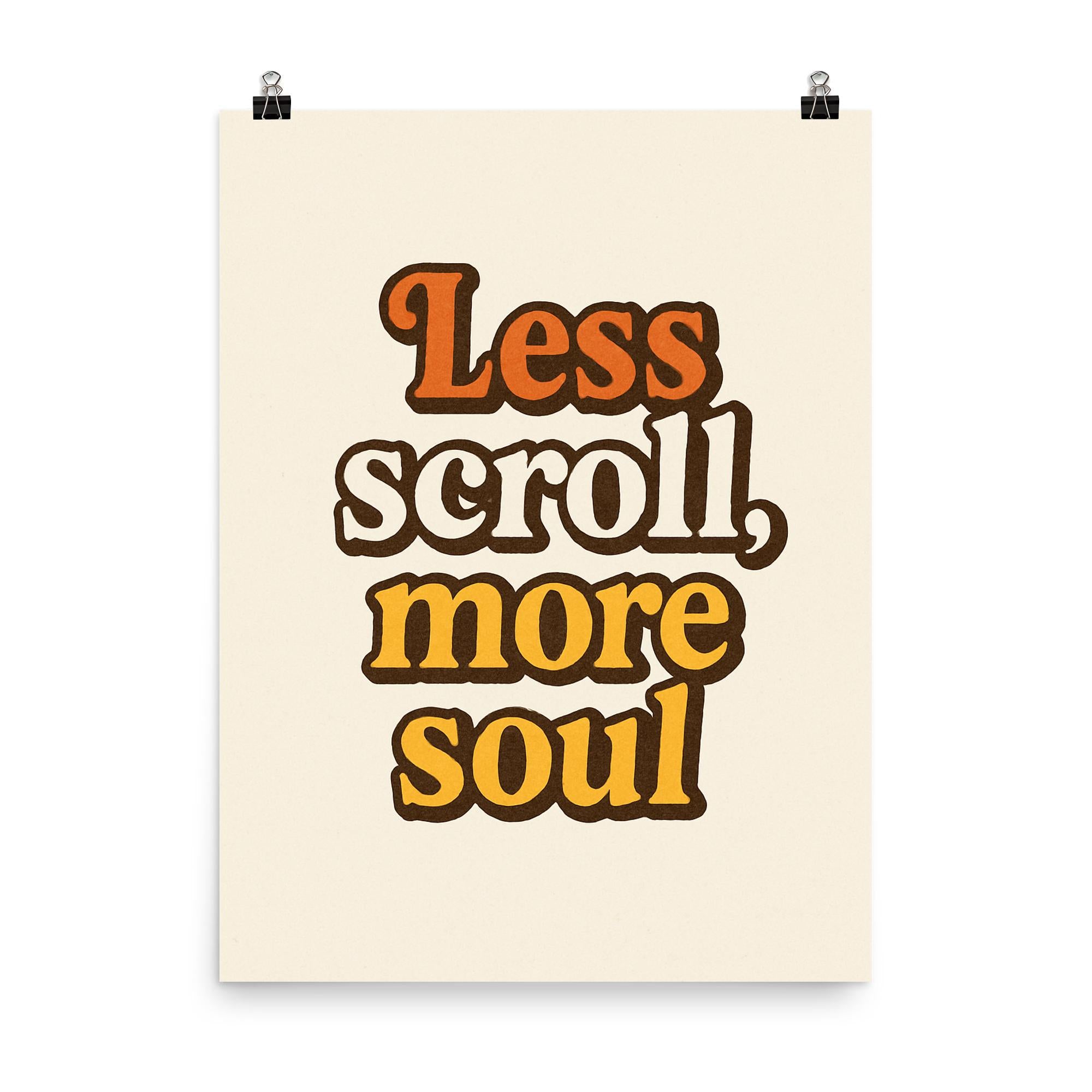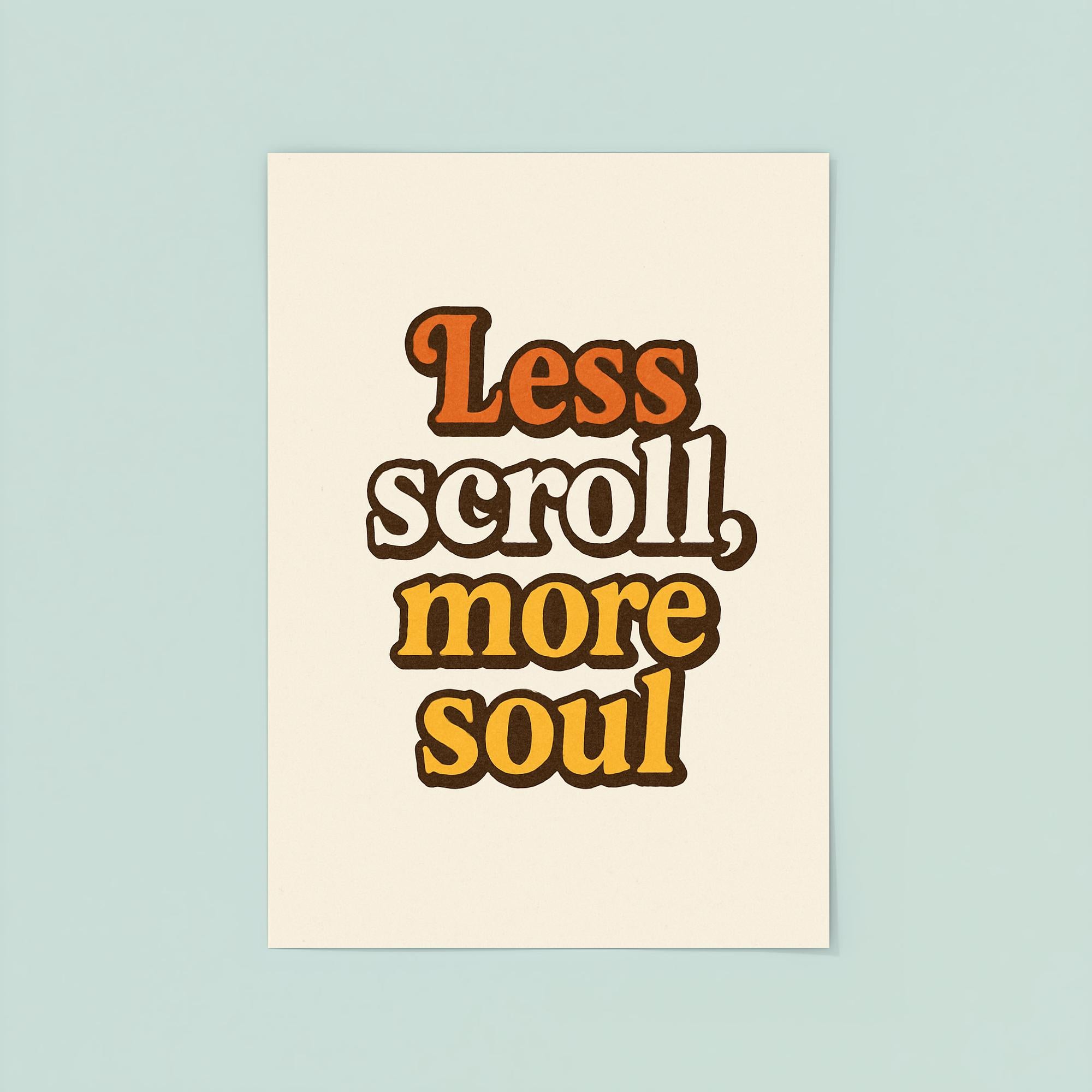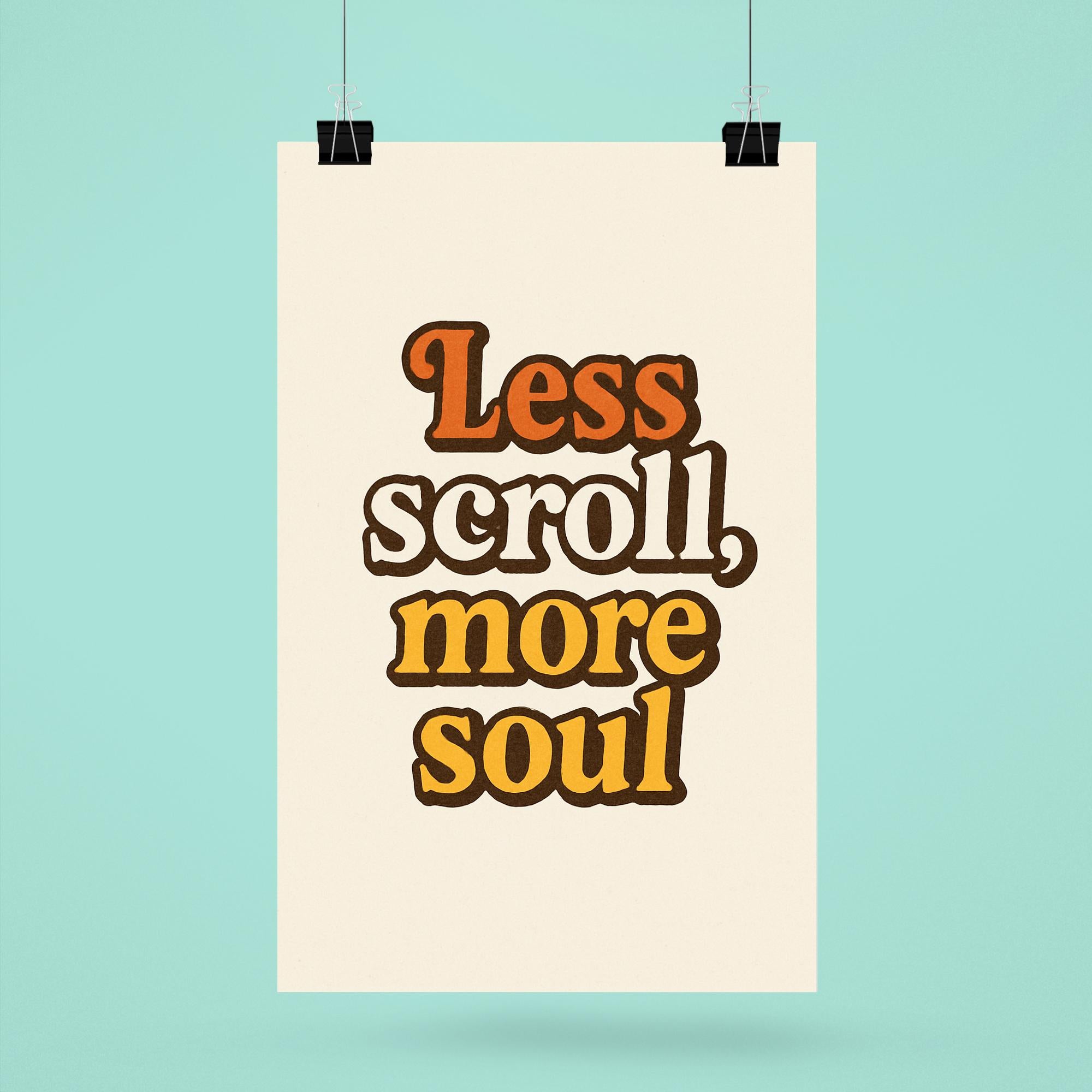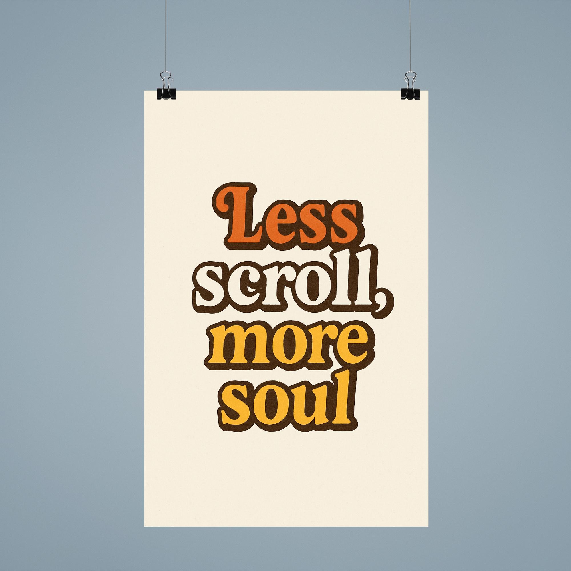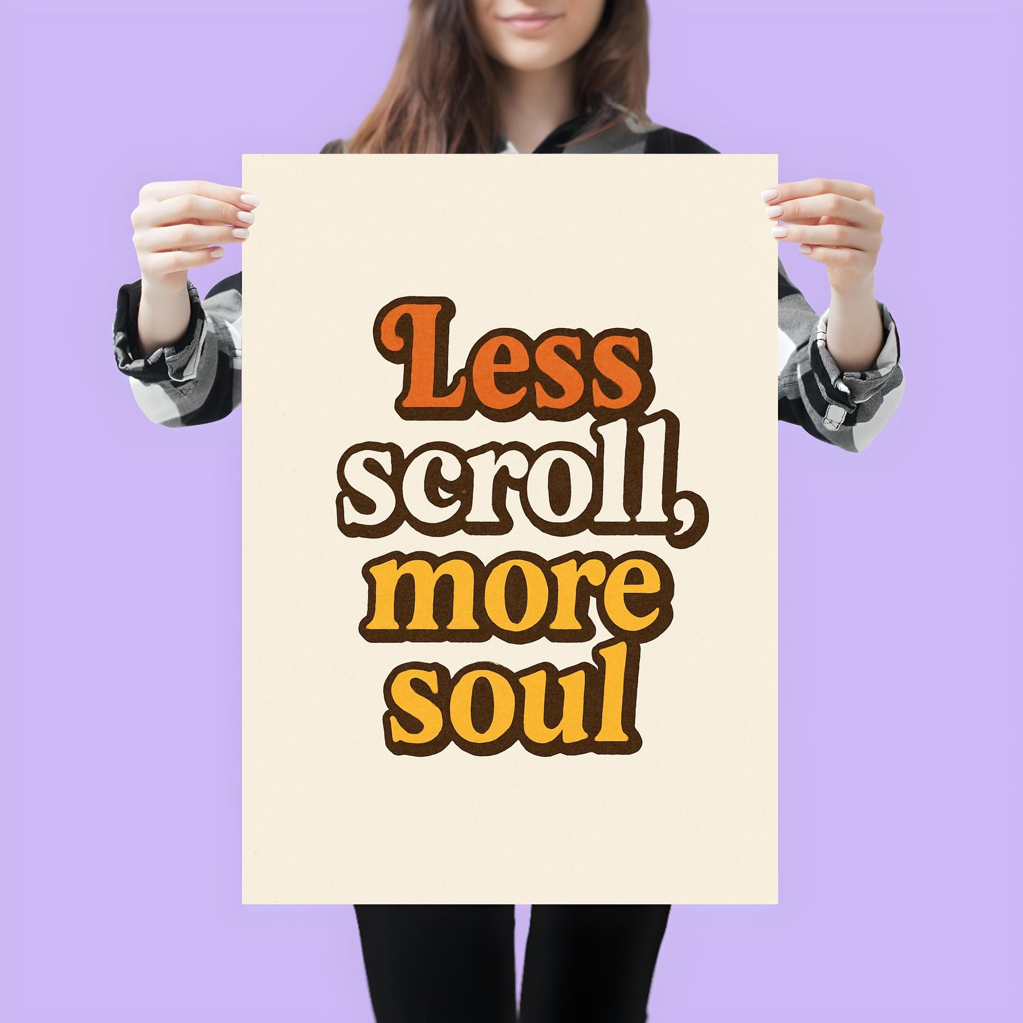 Let your space inspire mindful living with the bold reminder: Less scroll, more soul. This poster turns a wise mantra into daily motivation—encouraging deeper connections, present moments, and a richer life beyond the screen. Hang it where you need it most and let every glance nudge you closer to what truly matters.