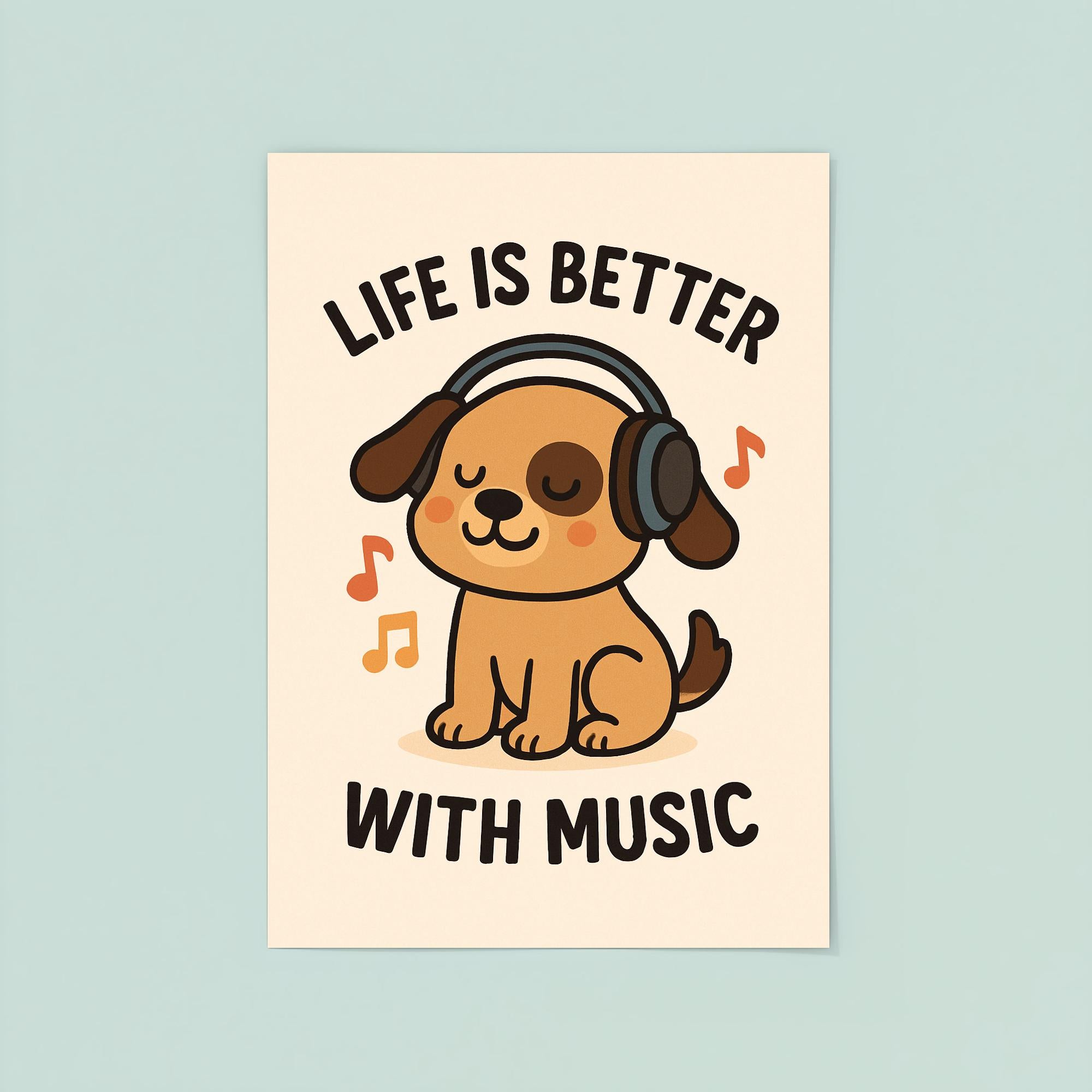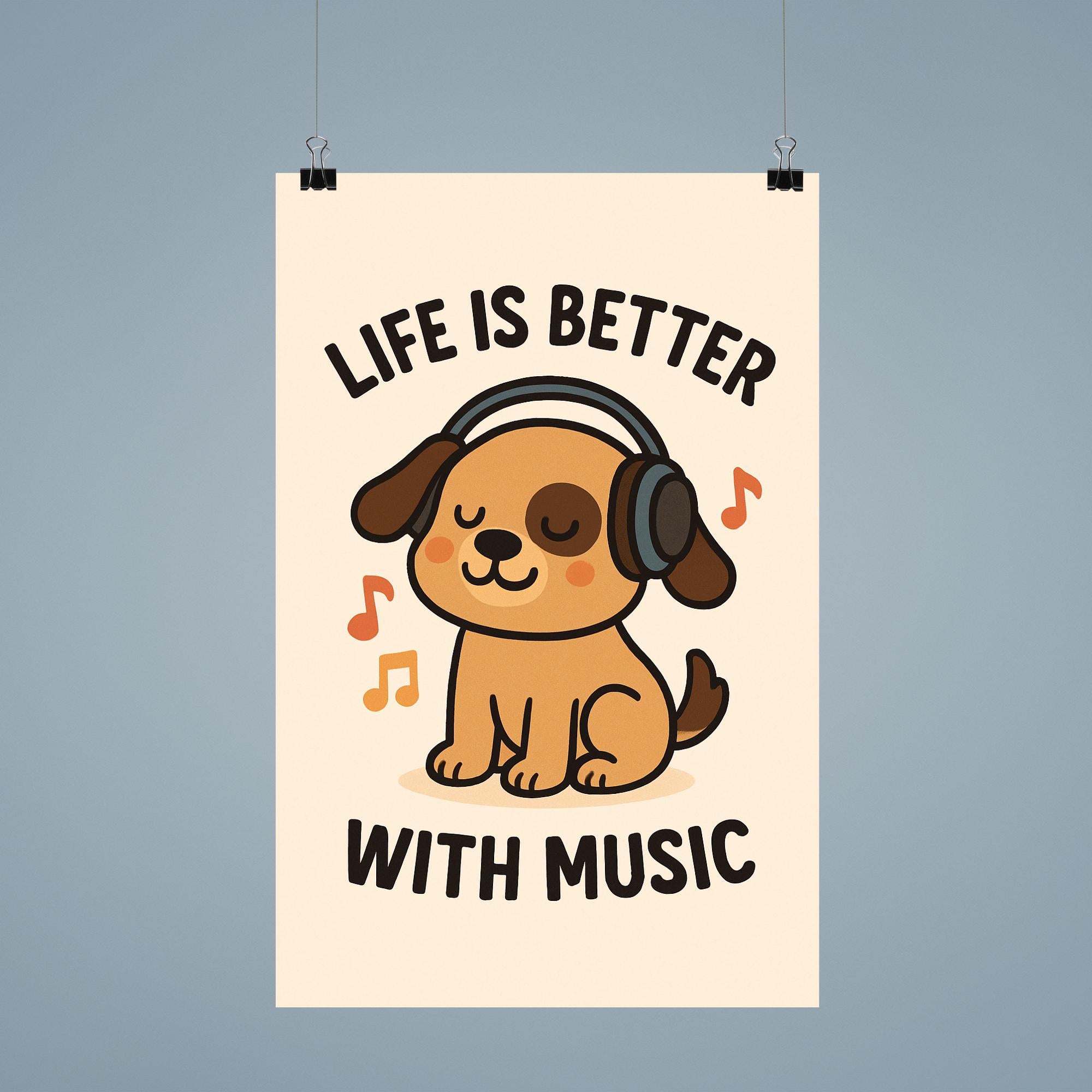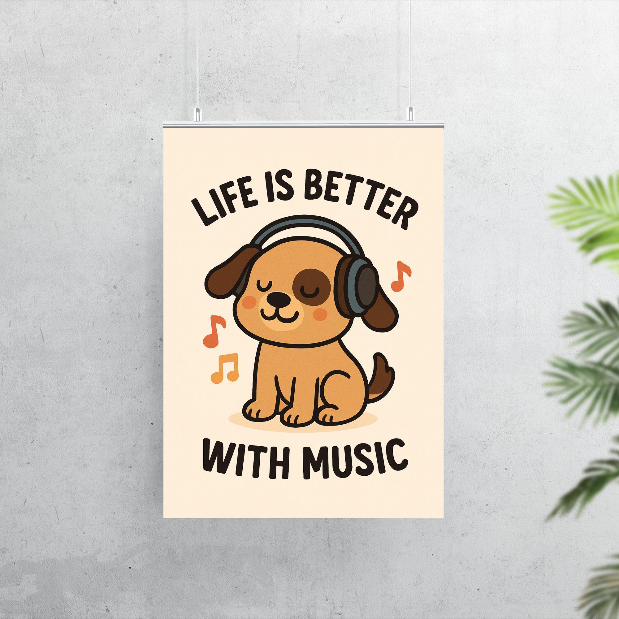 Brighten any room with this charming poster featuring the heartwarming message, "Life is better with music," paired with an adorable cartoon dog. Perfect for music lovers and dog enthusiasts alike, it brings a joyful, uplifting vibe that celebrates the simple pleasures of life. Whether for your home or office, this playful design inspires happiness every day.