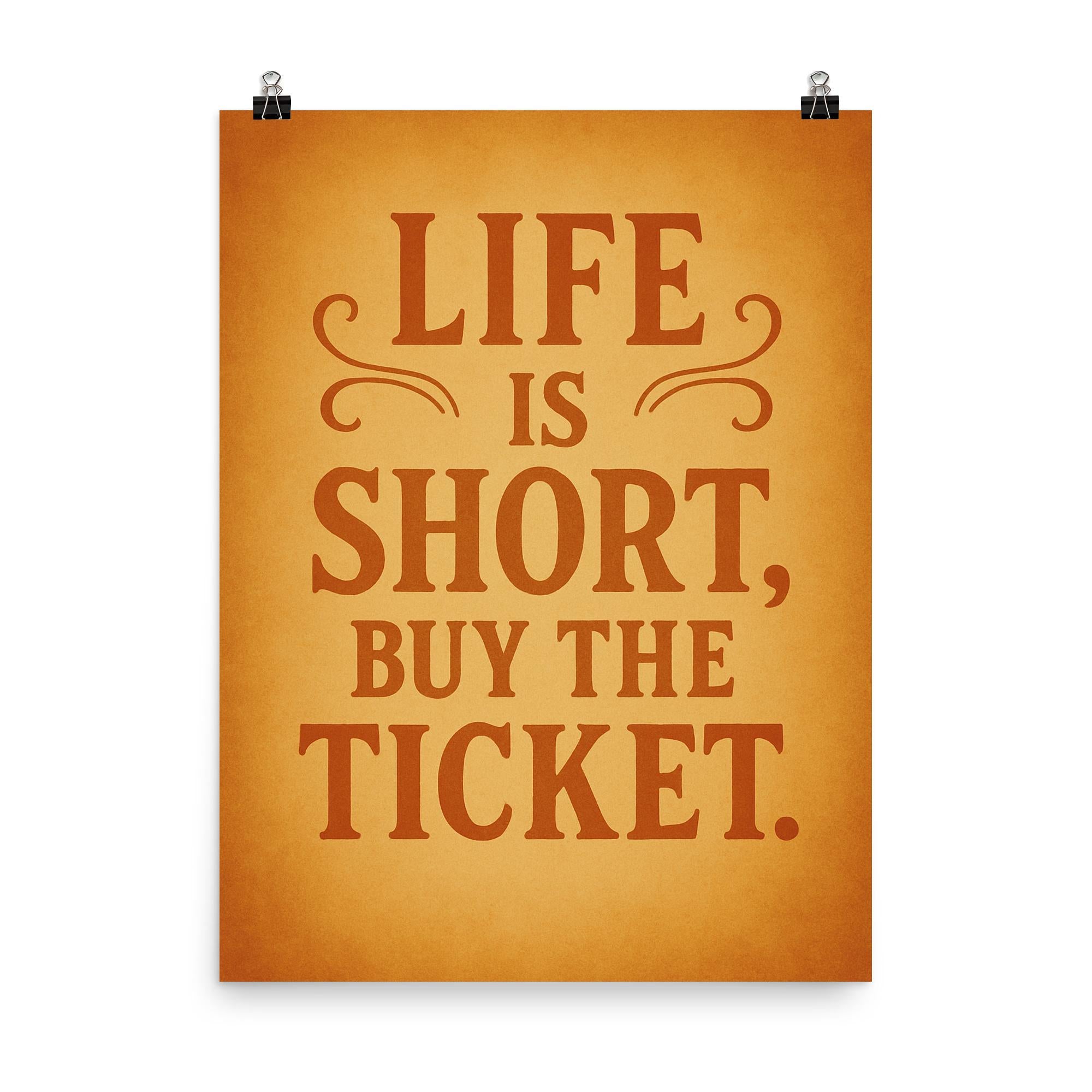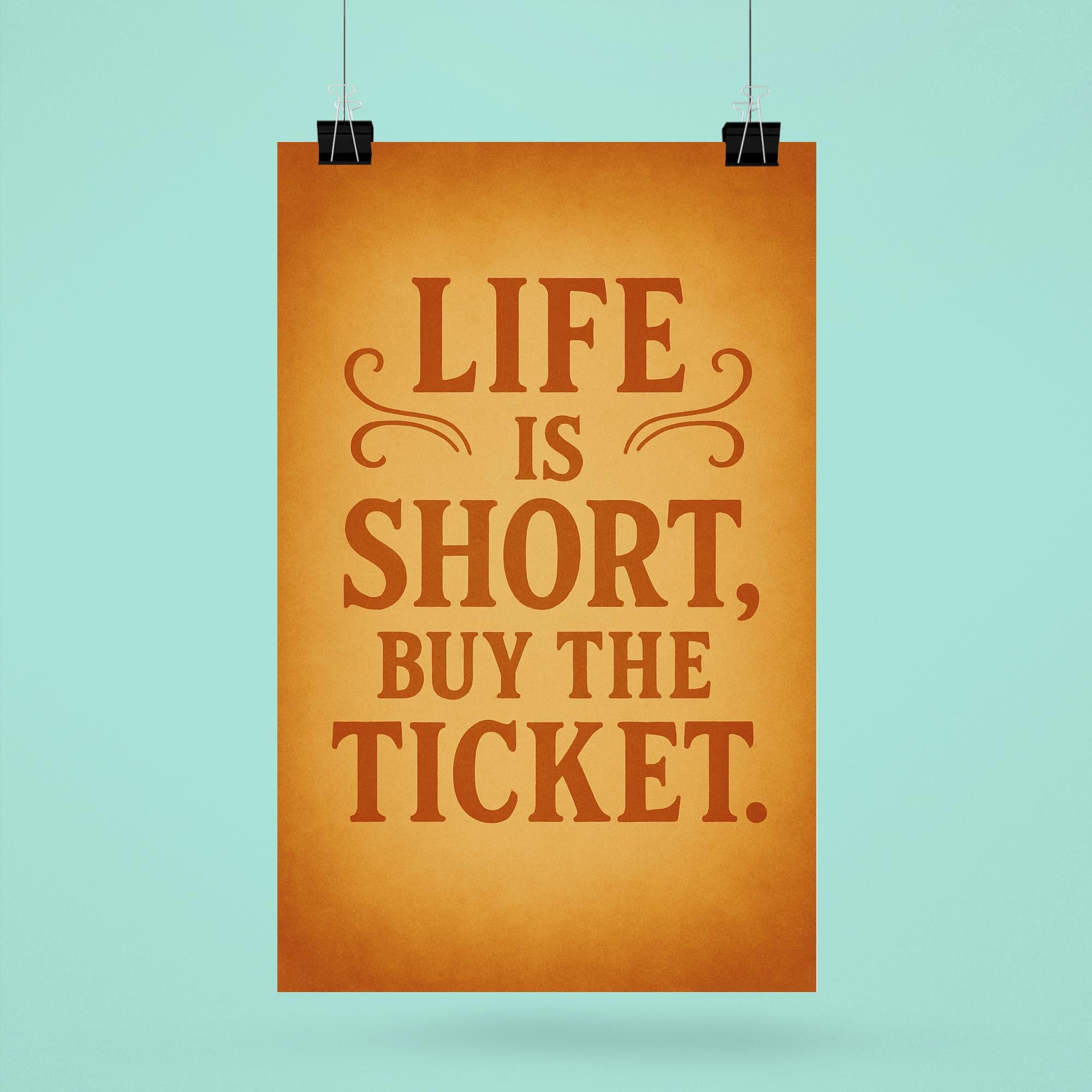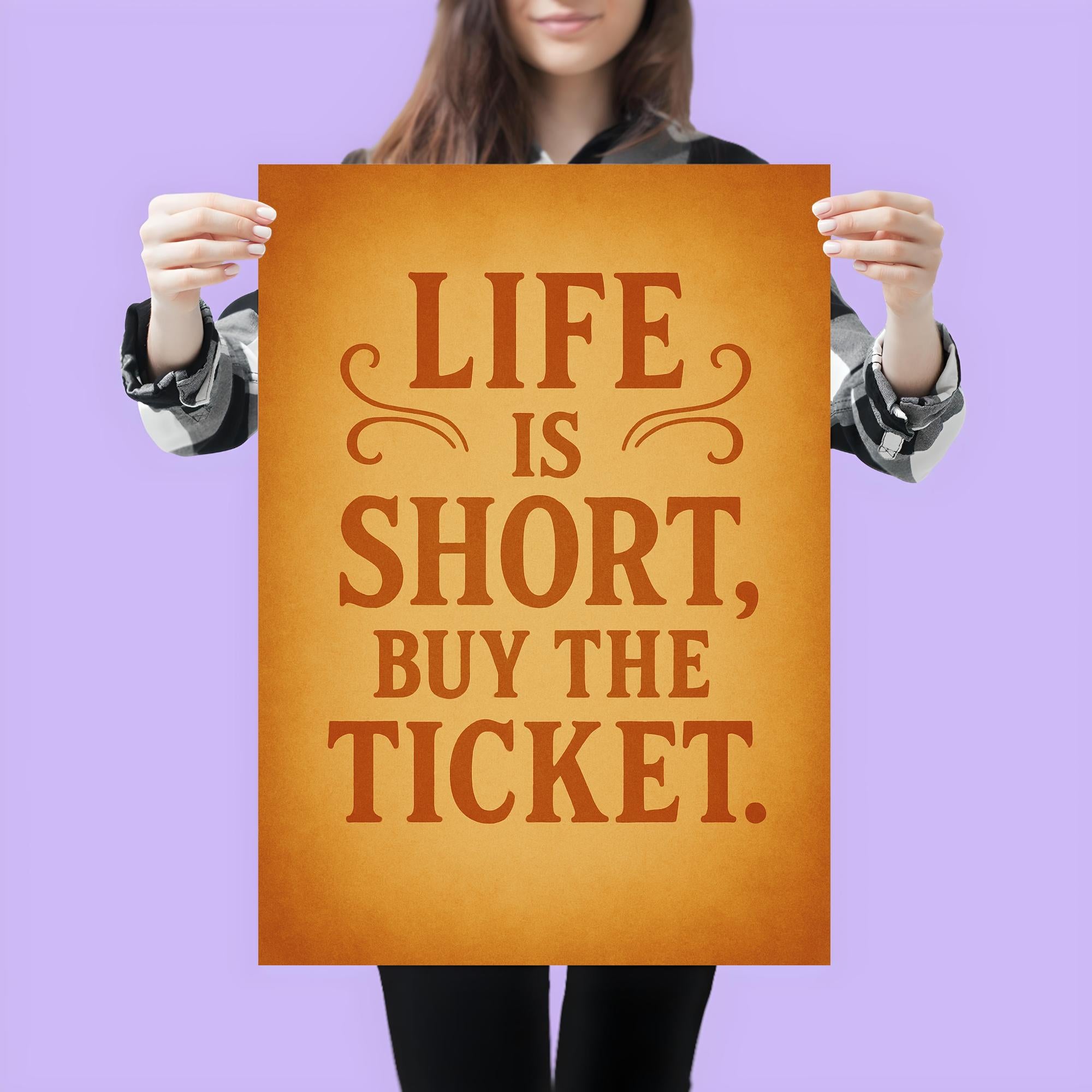 Embrace spontaneity and let your walls inspire bold decisions with the “Life is short, buy the ticket” poster. This motivational piece serves as a daily reminder to seize the moment, chase adventure, and say yes to new experiences. Perfect for anyone who needs a nod to courage and a push to make every day count.