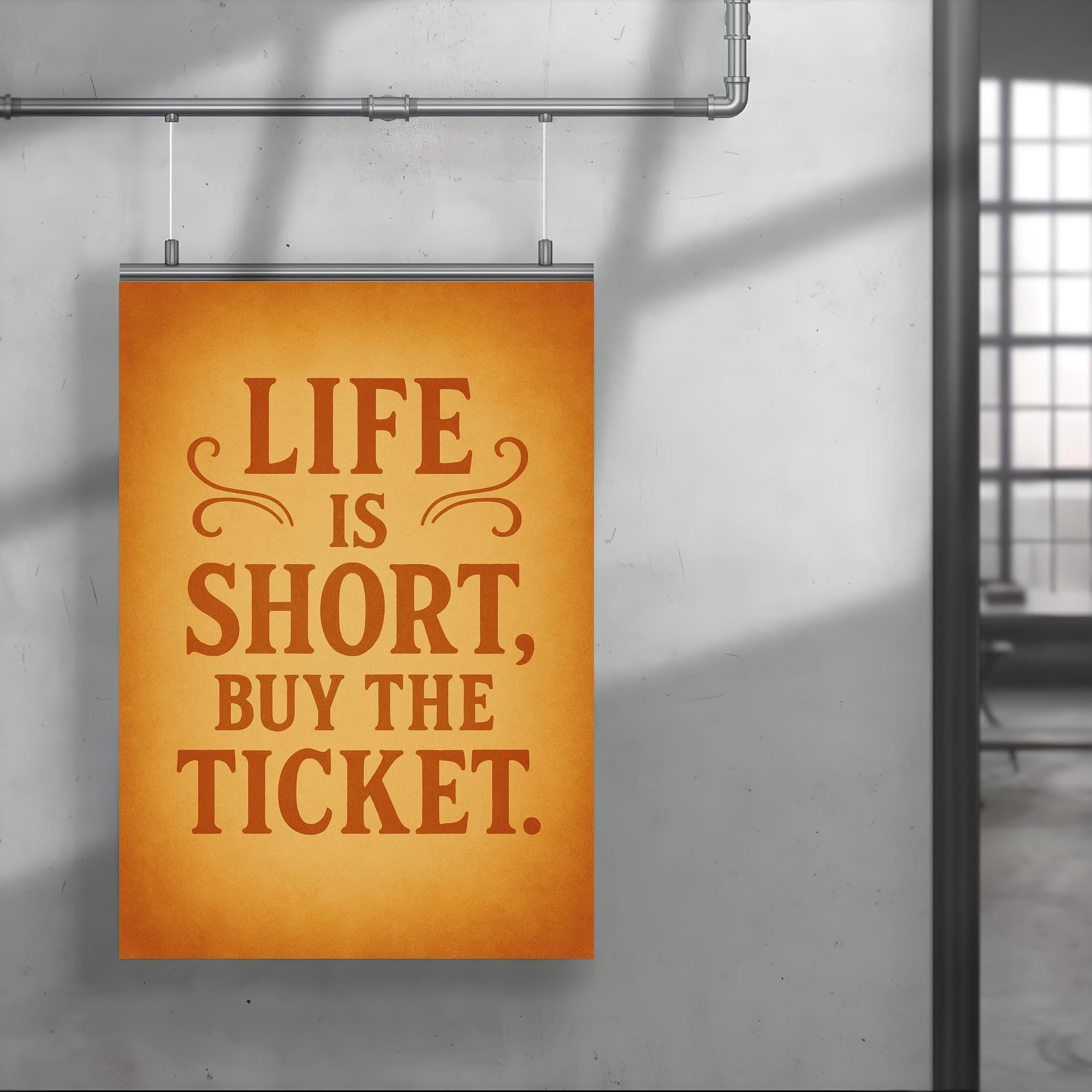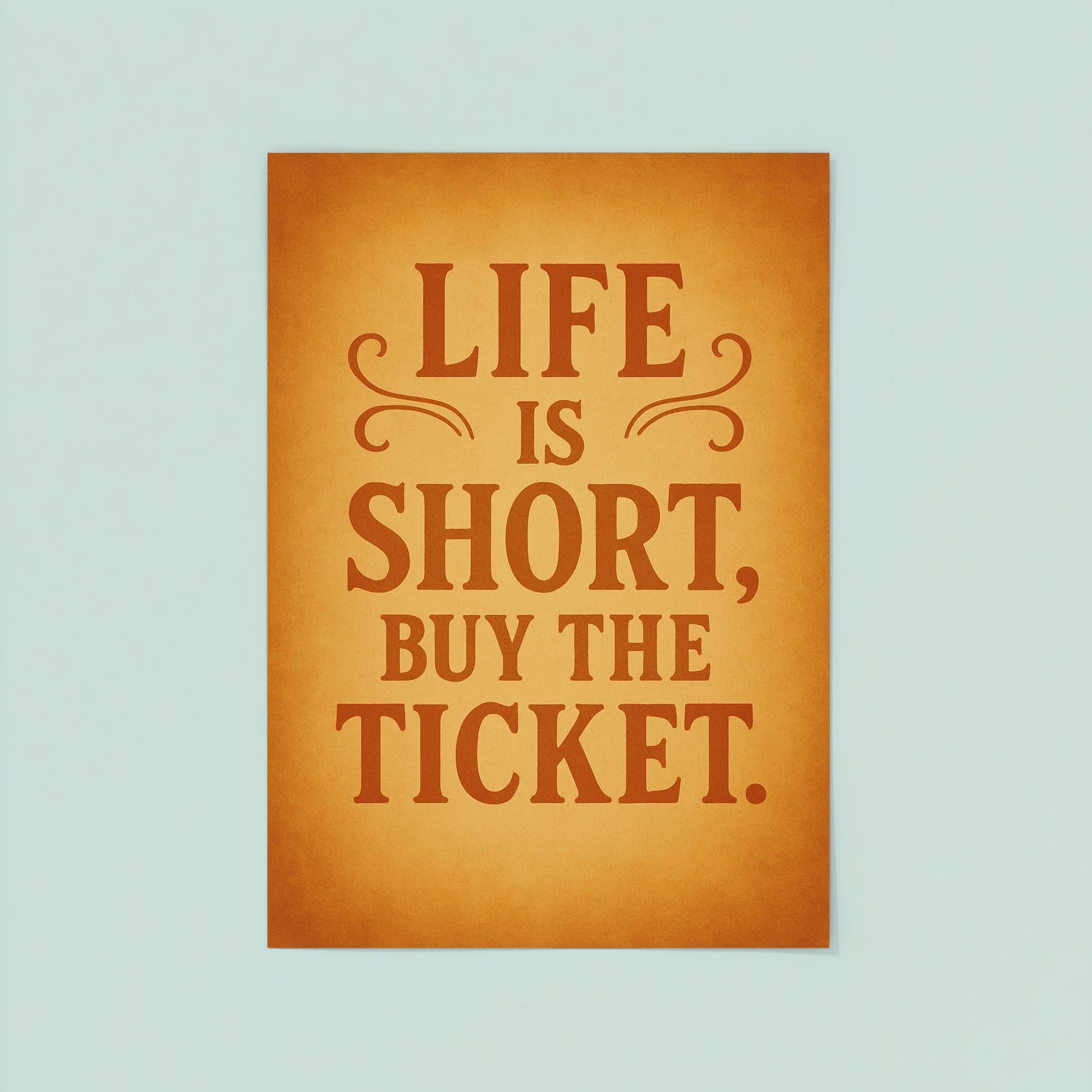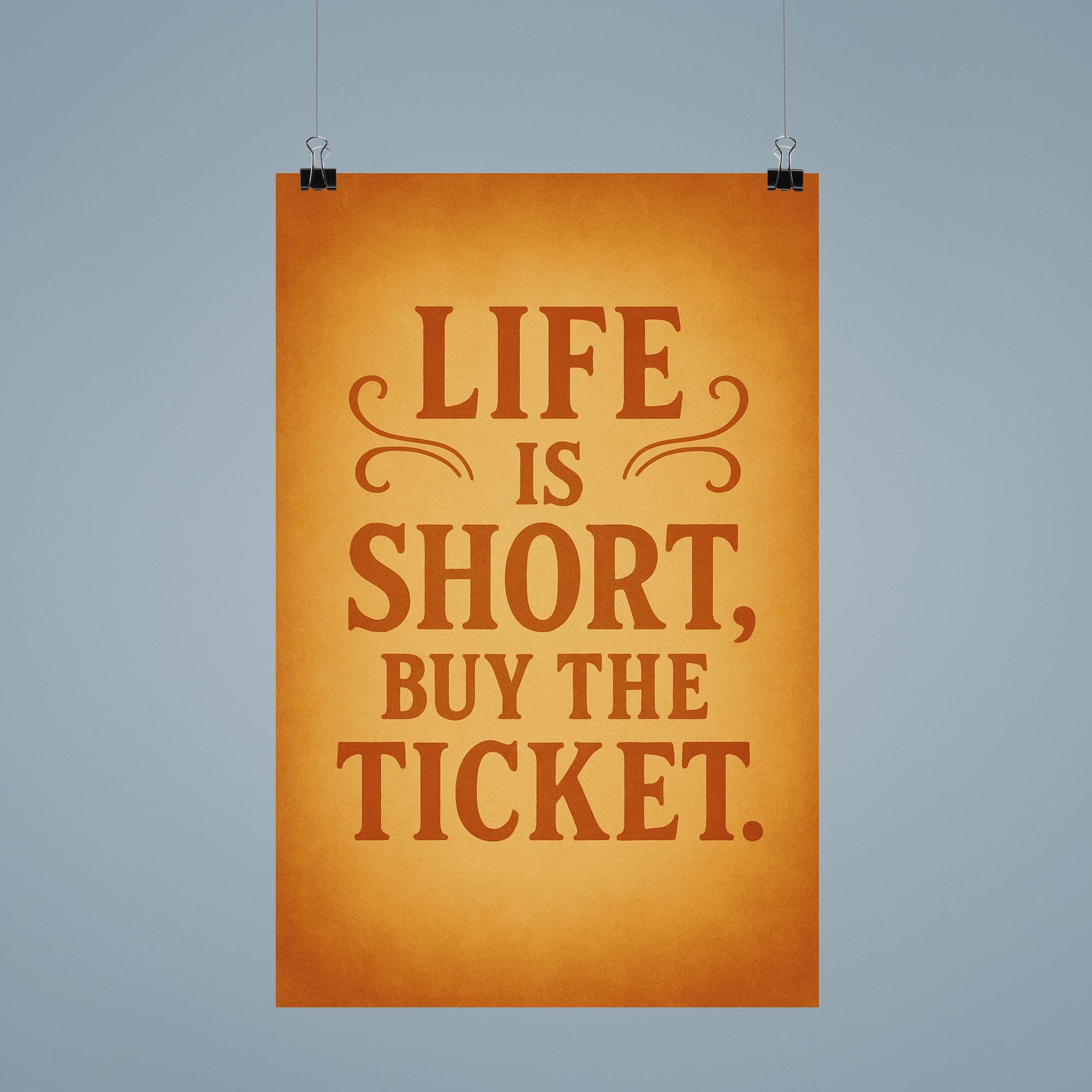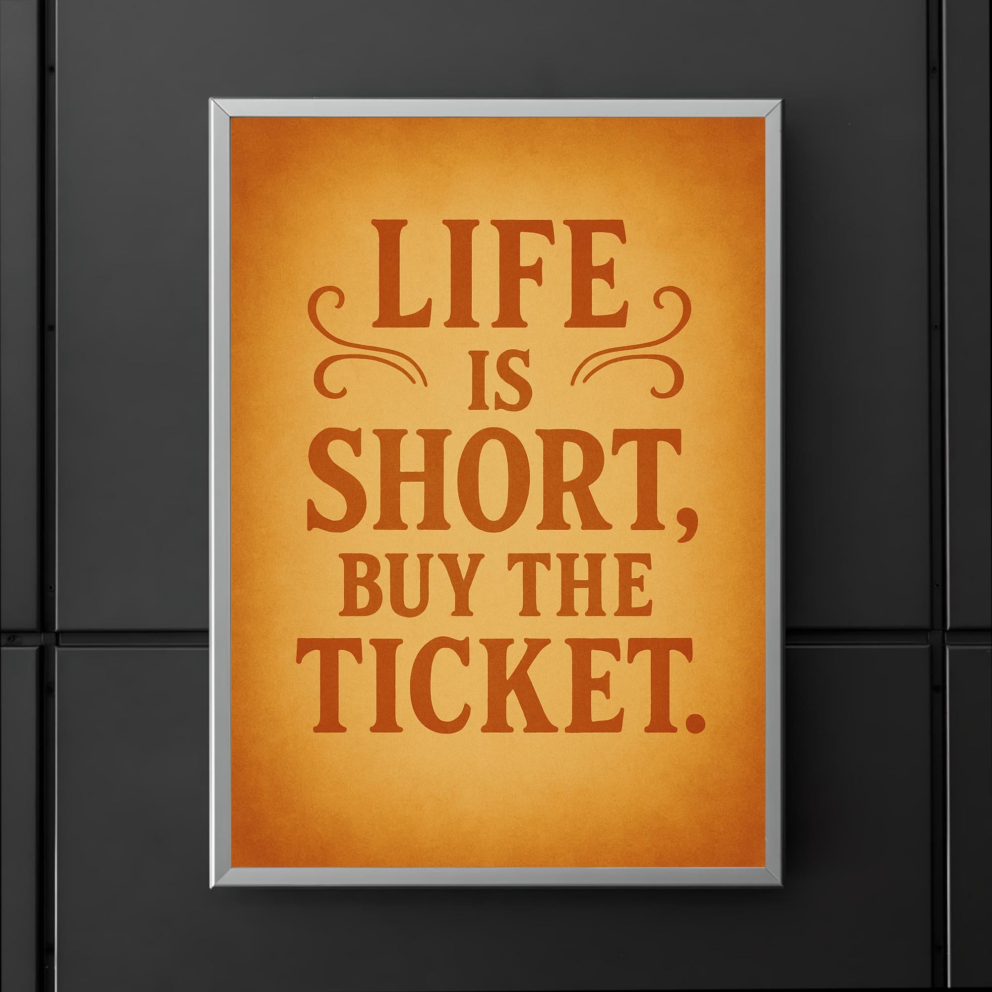 Embrace spontaneity and let your walls inspire bold decisions with the “Life is short, buy the ticket” poster. This motivational piece serves as a daily reminder to seize the moment, chase adventure, and say yes to new experiences. Perfect for anyone who needs a nod to courage and a push to make every day count.