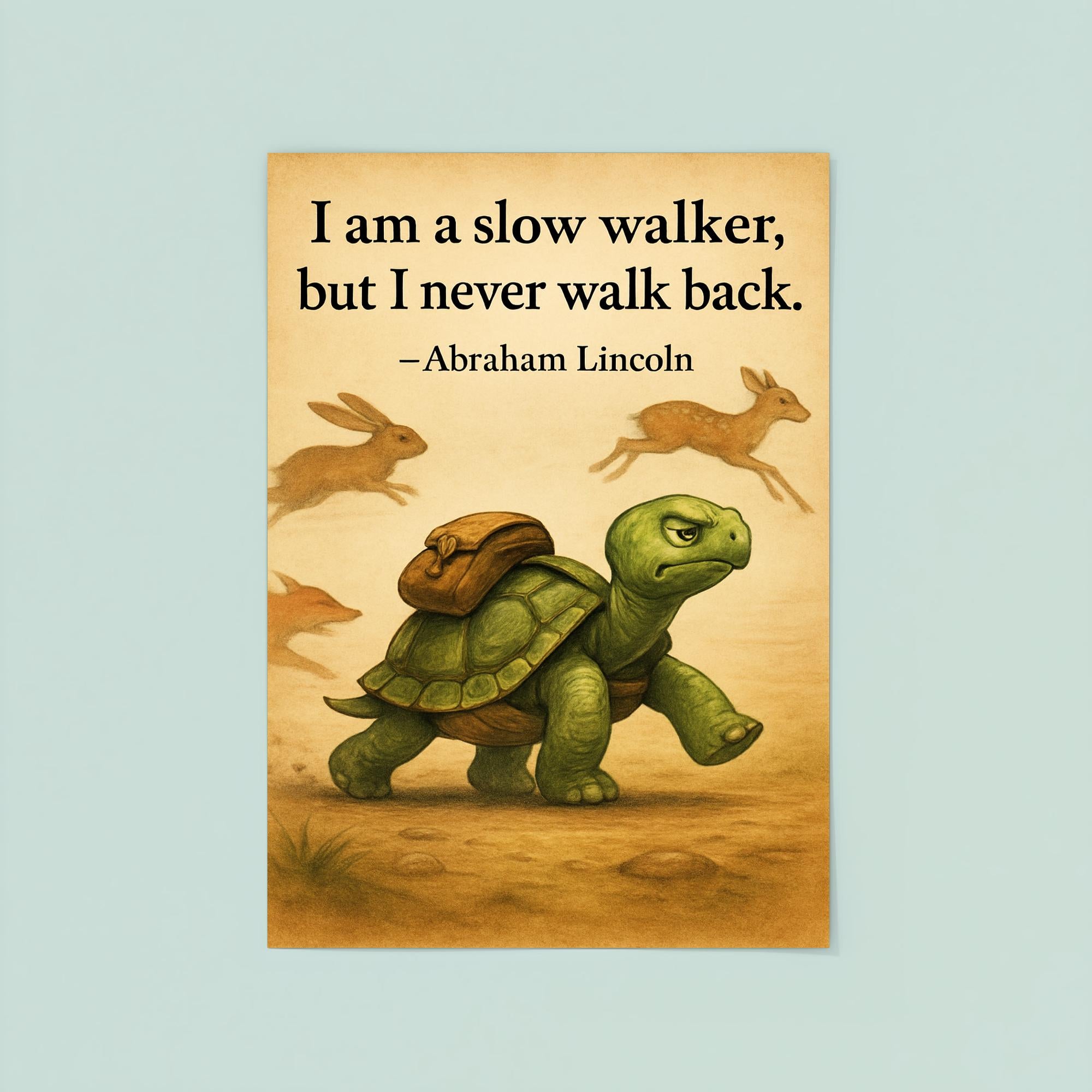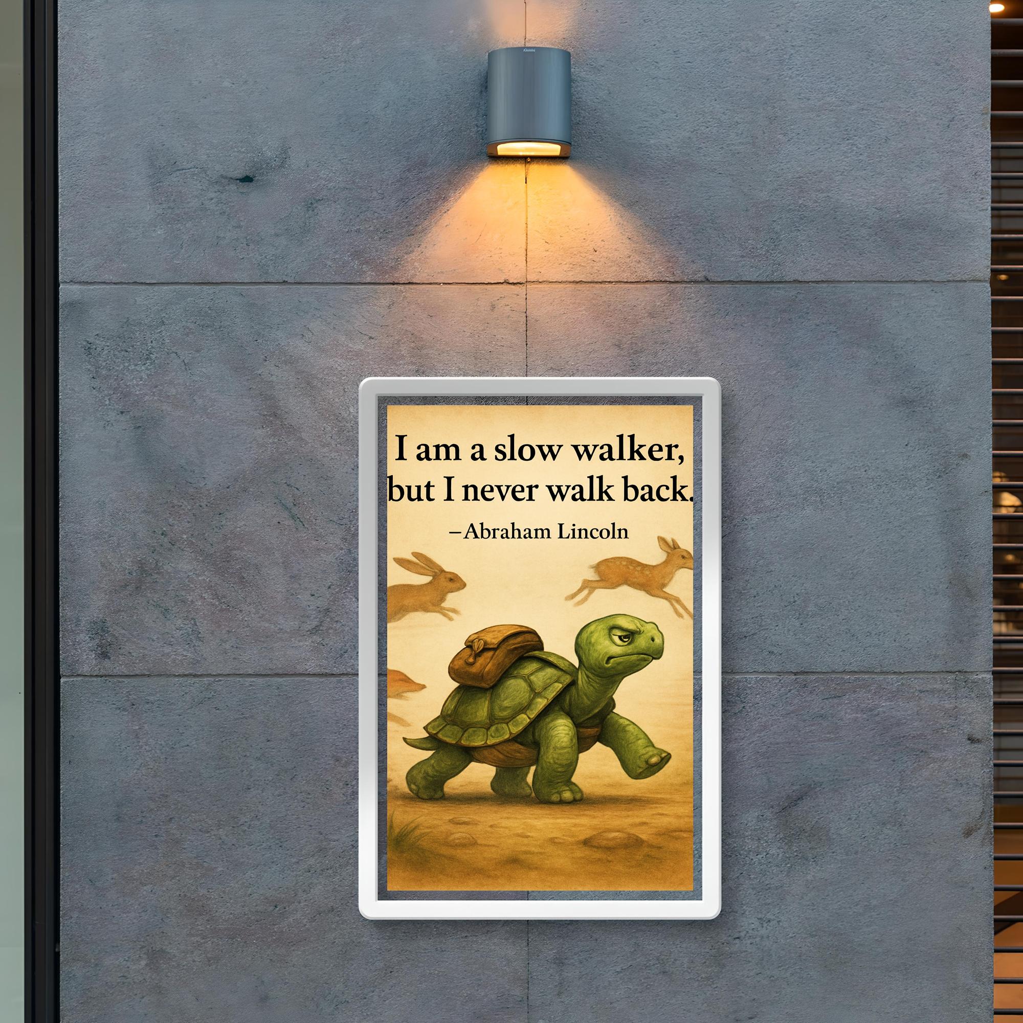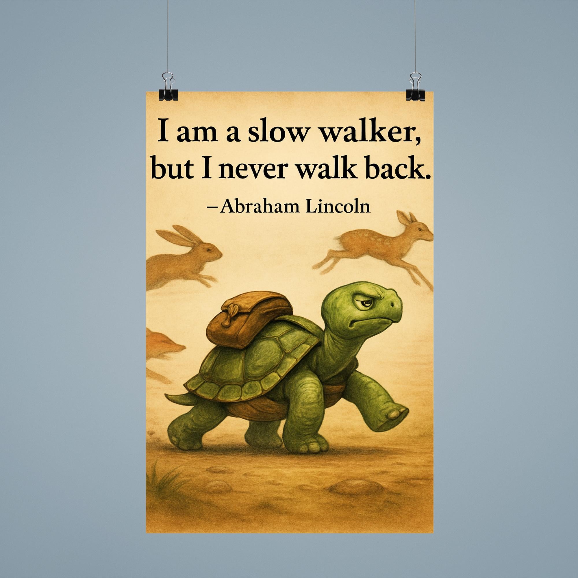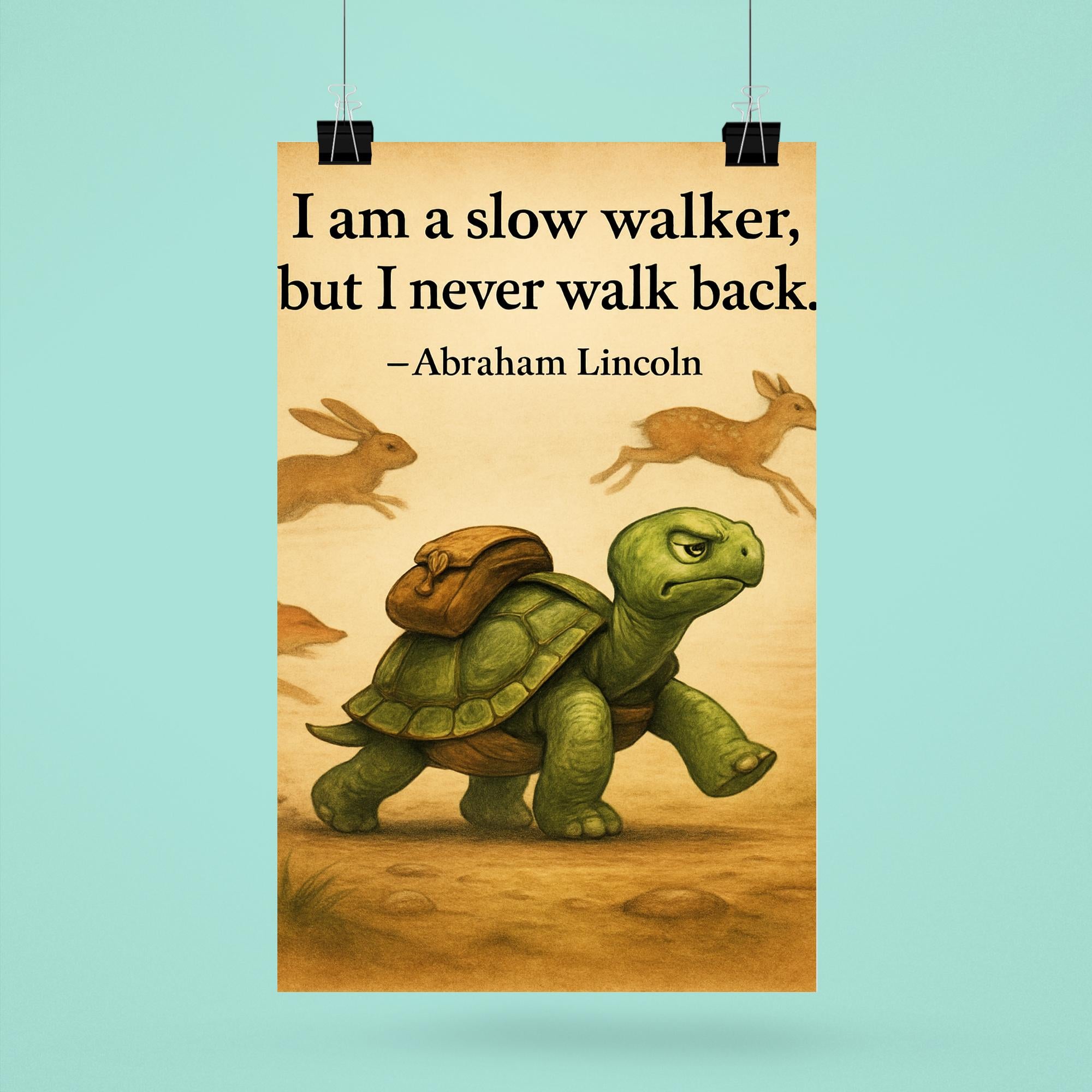 Inspire perseverance every day with this striking poster featuring Abraham Lincoln’s timeless quote, “The slow walker is only beaten by the one who stops.” A charming turtle carries a backpack, symbolizing steady progress and unshakable determination. Perfect for your office, study, or creative space, it’s a powerful reminder that slow and steady truly wins the race.